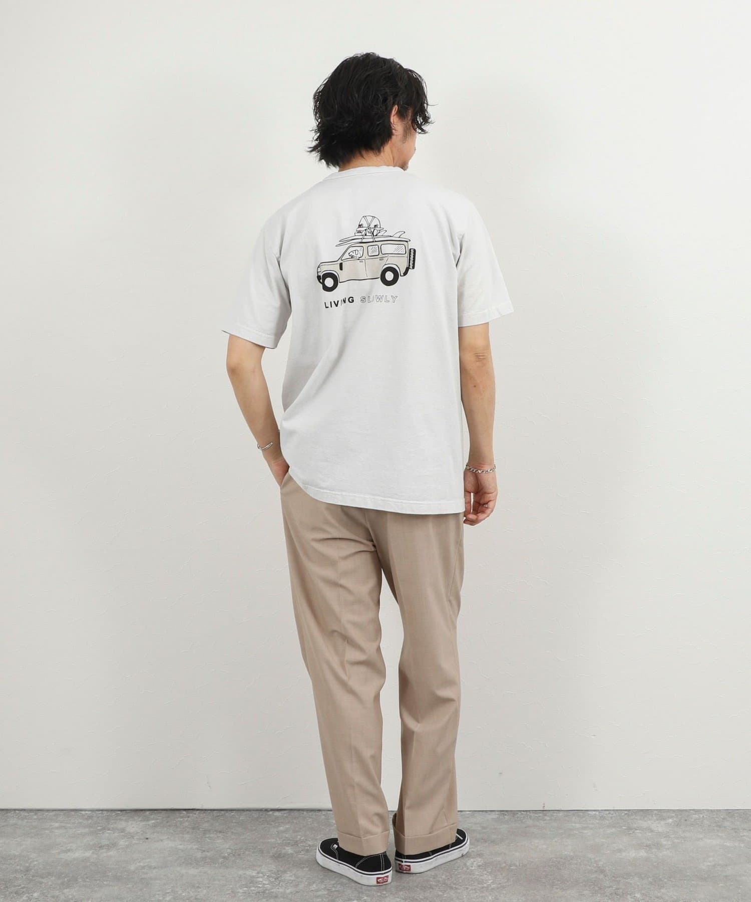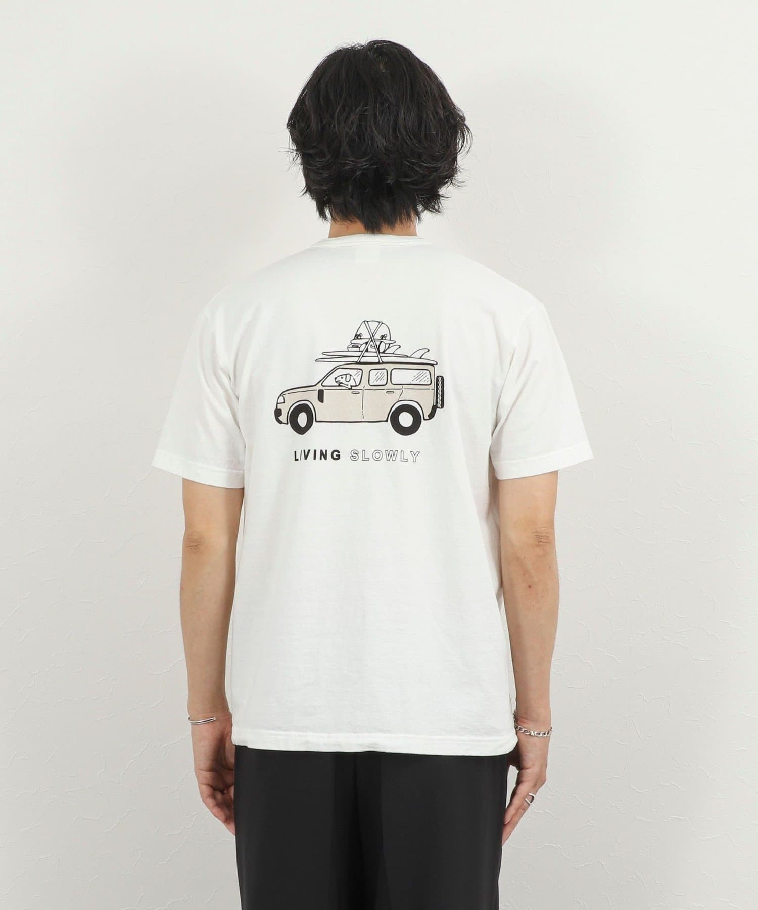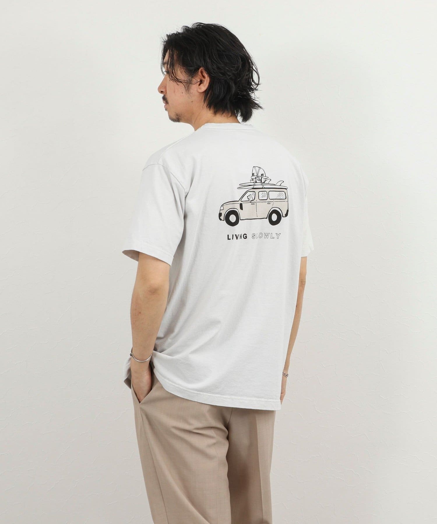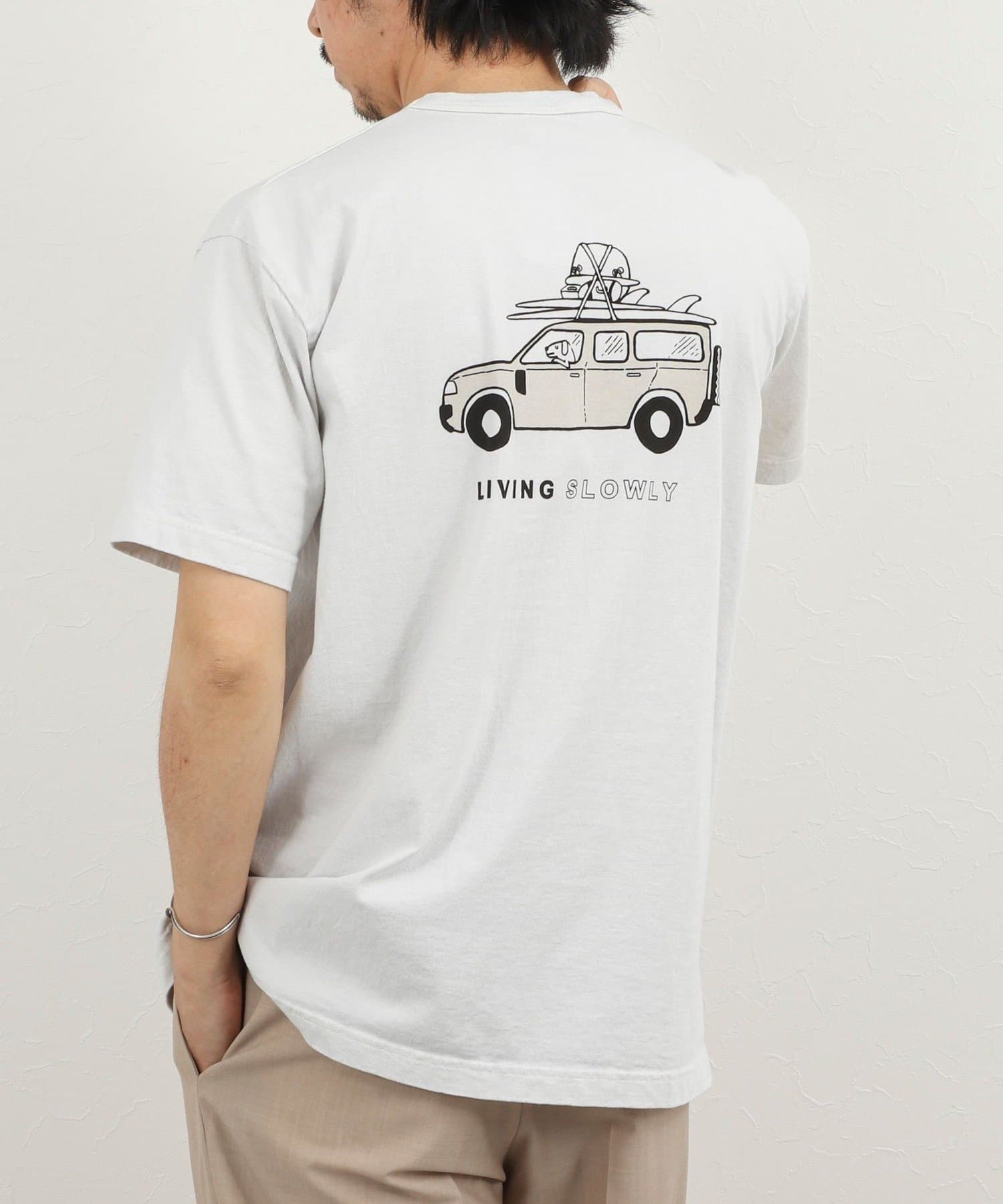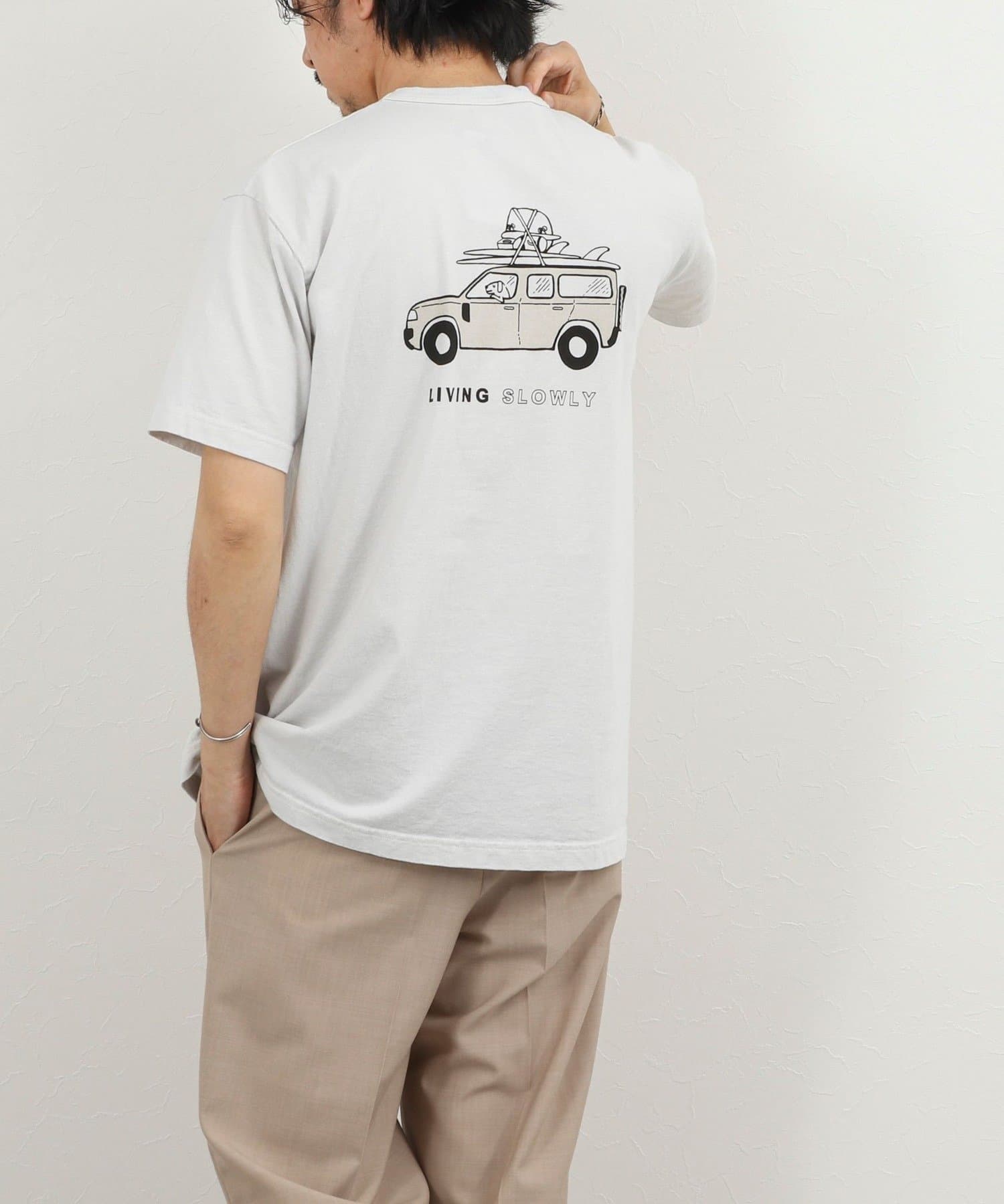 ・犬と車と「LIVING SLOWLY」のバックプリント