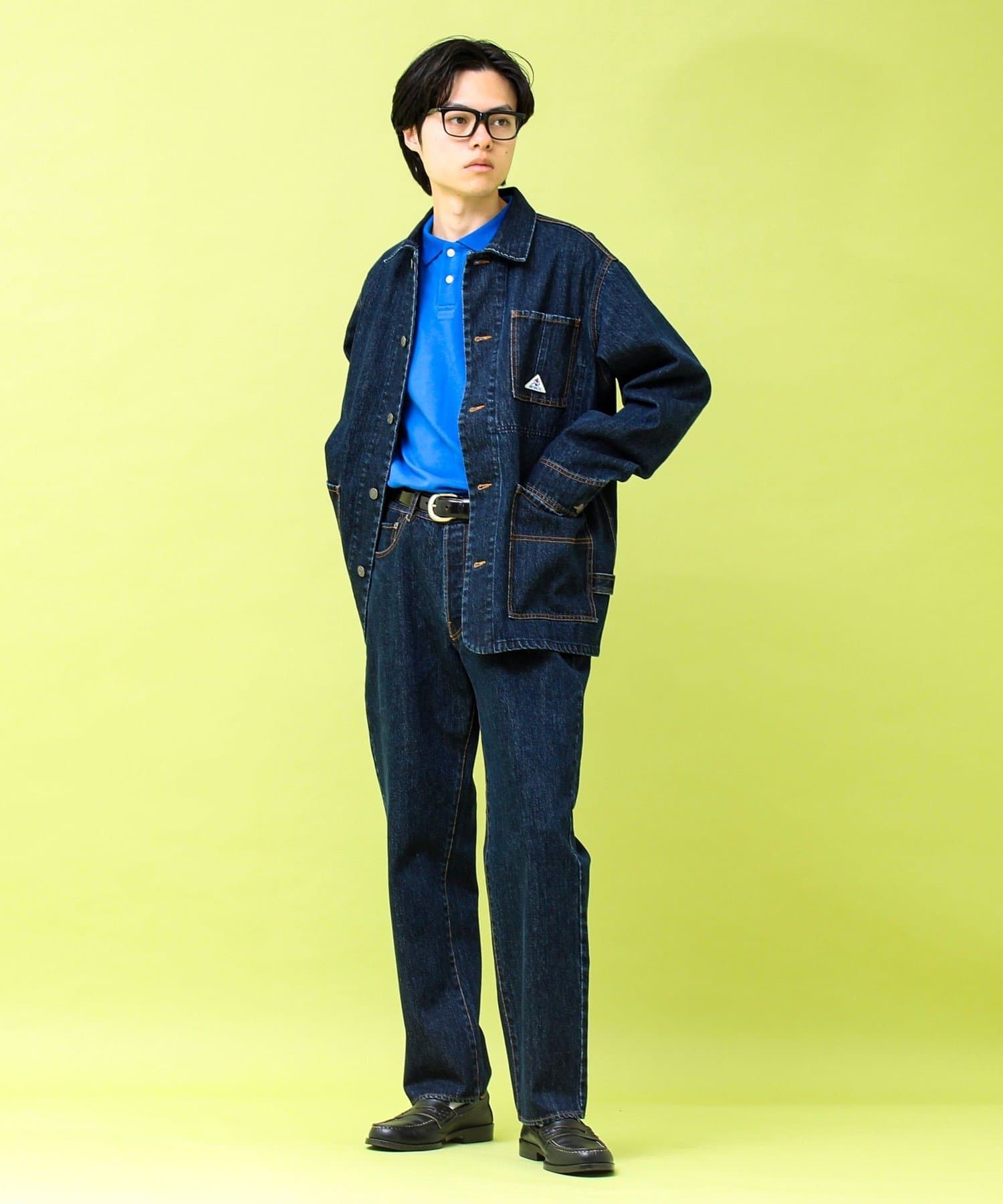 同素材のストレートデニムと合わせて、インナーは白Tやブルーのポロでクリーンに。足元はローファー or レザースニーカーが相性◎。