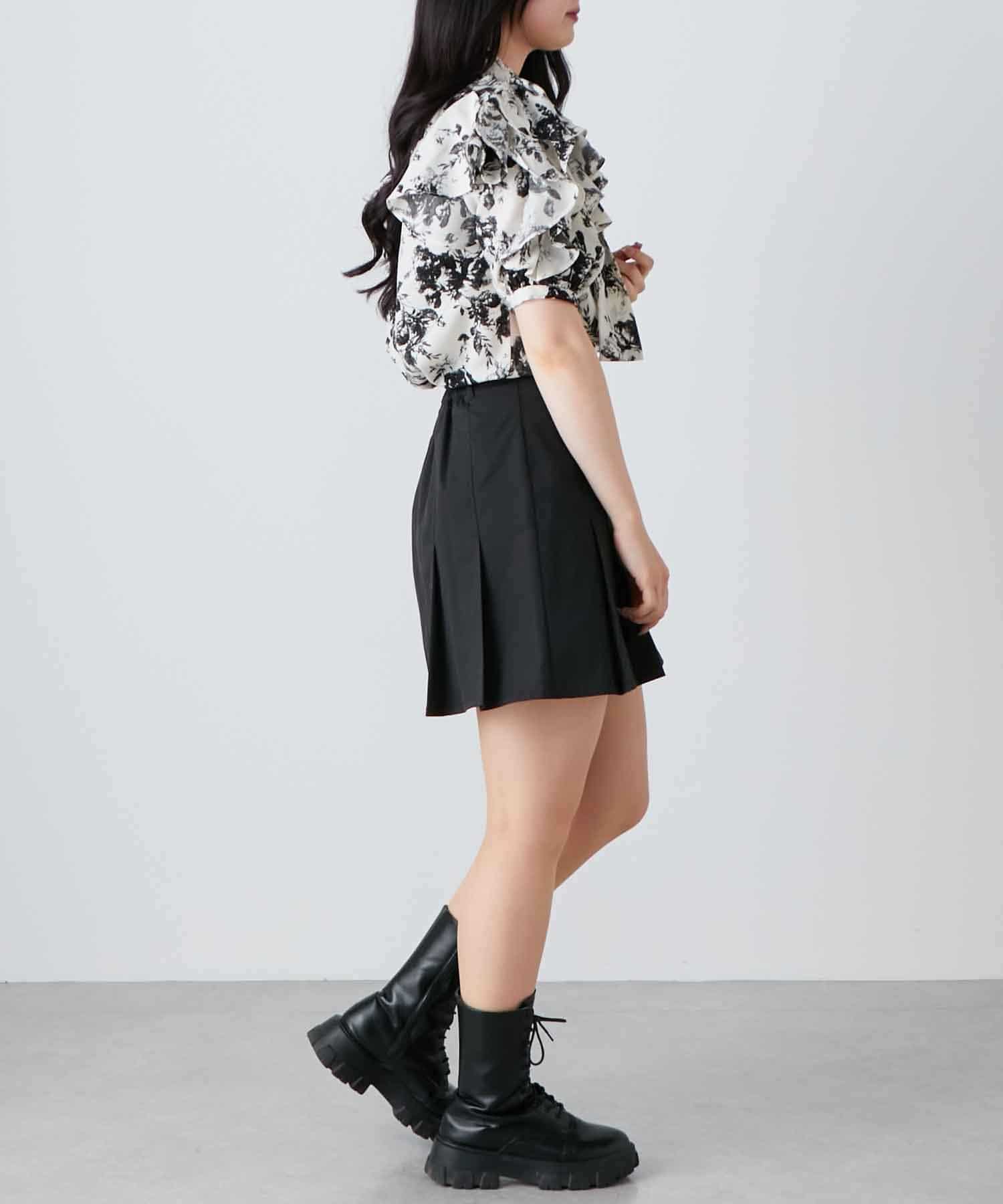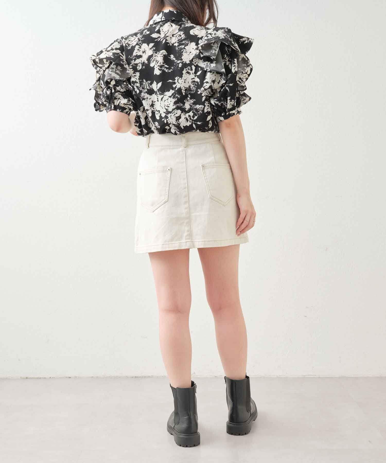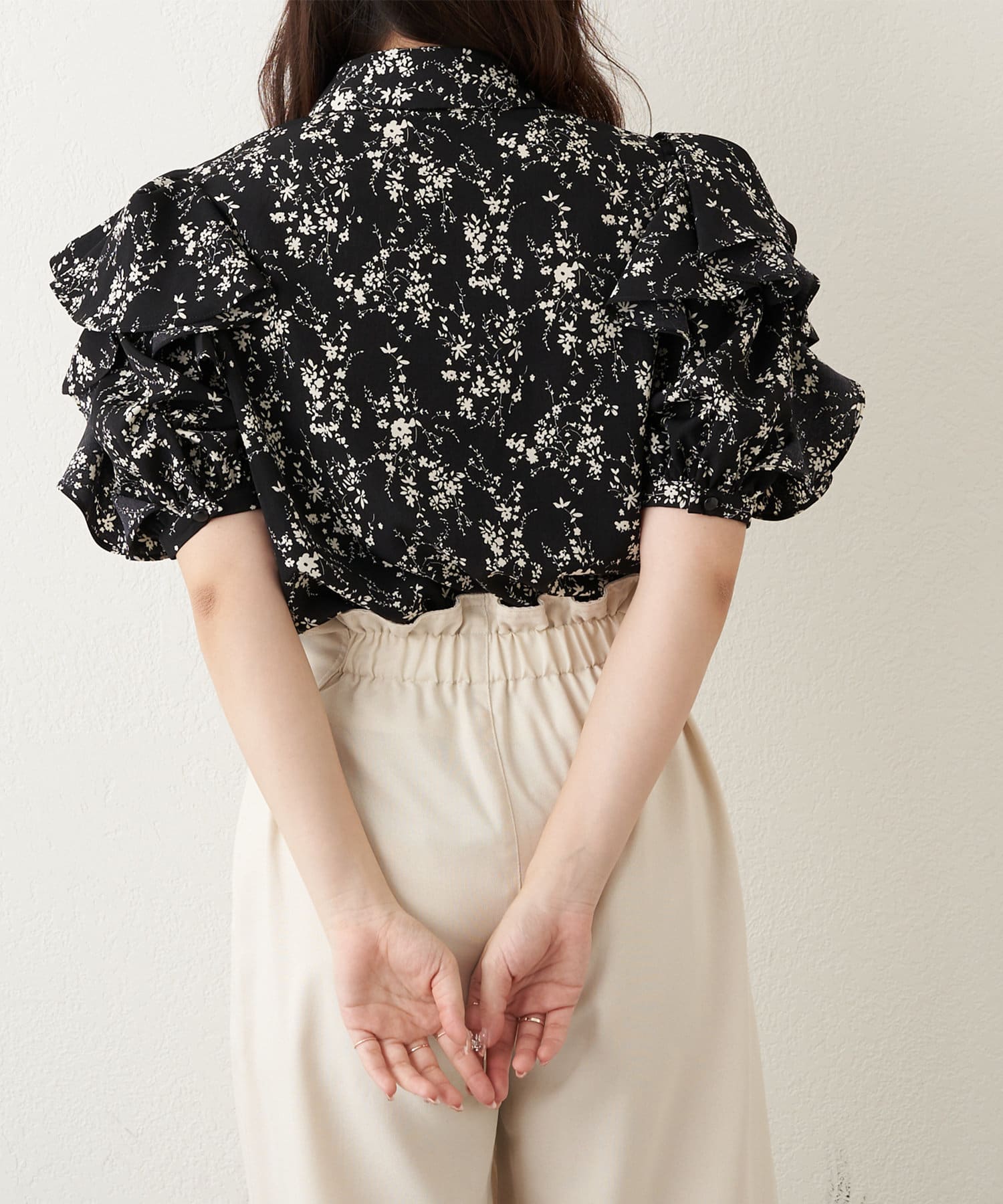 肩開きデザインでさりげない肌見せができる花柄ブラウス