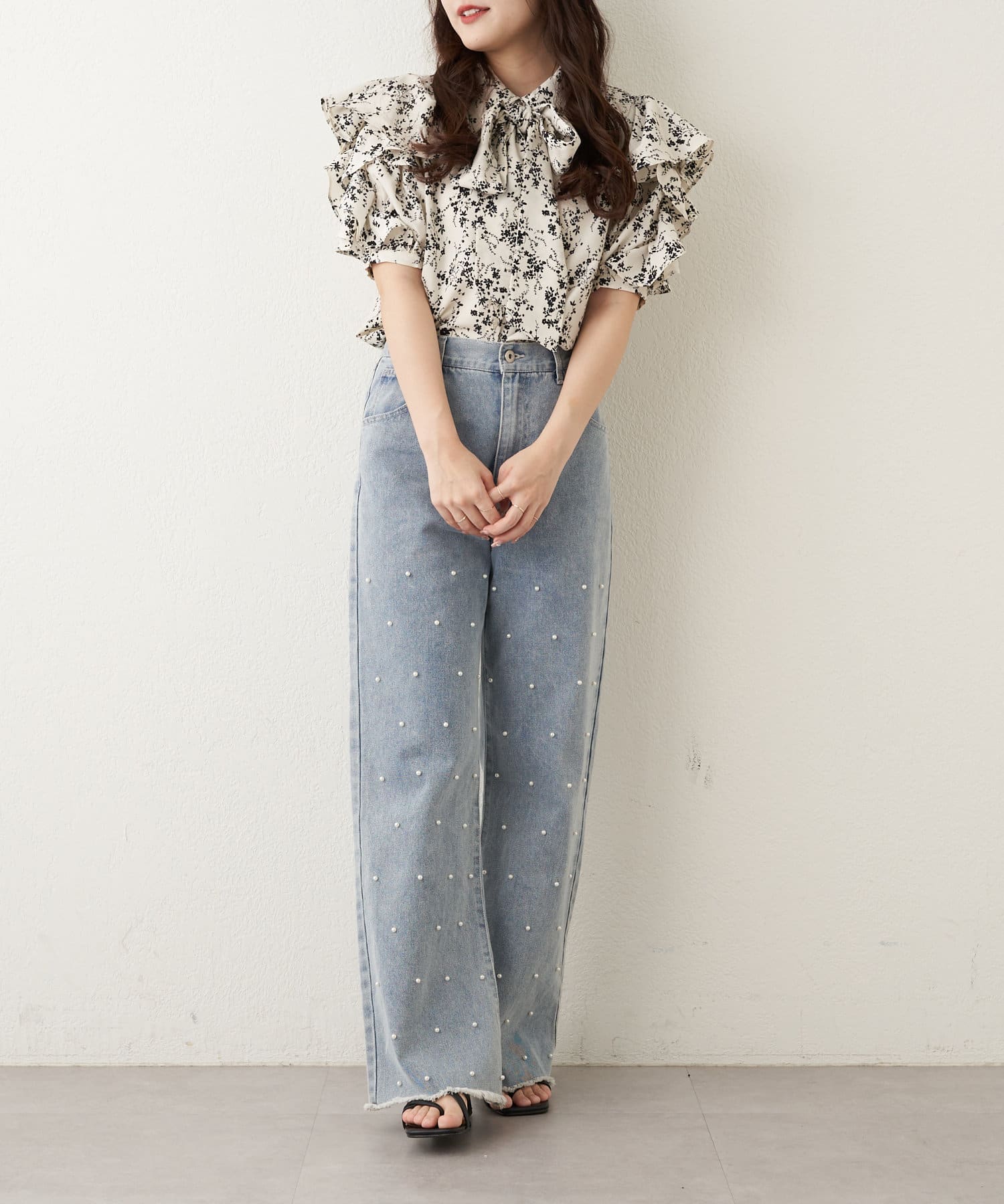 ・華やかなトップスなのでデニムで王道カジュアルコーデがおすすめです。