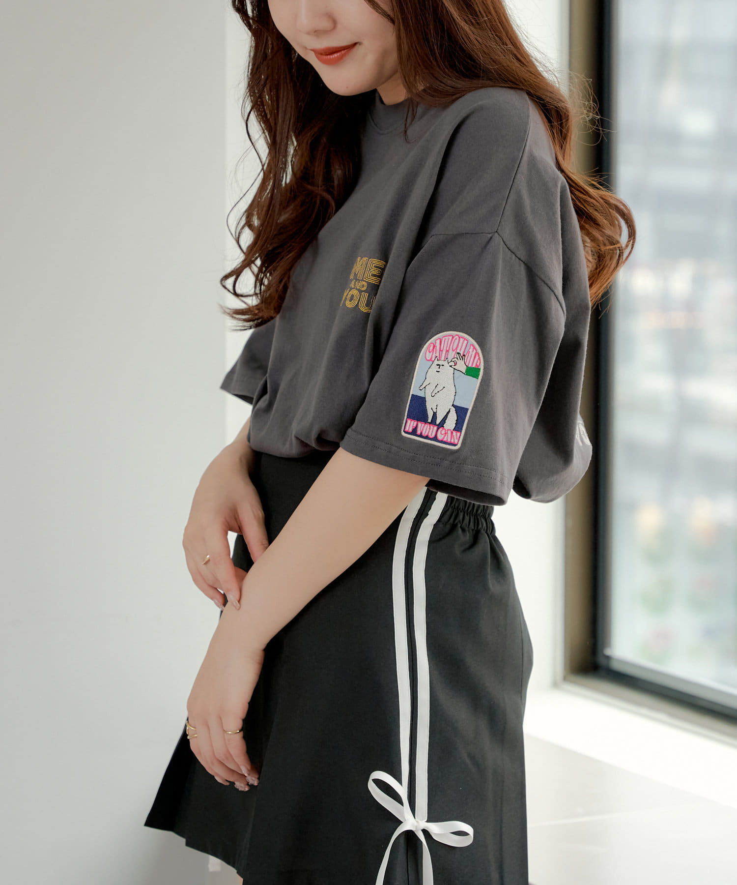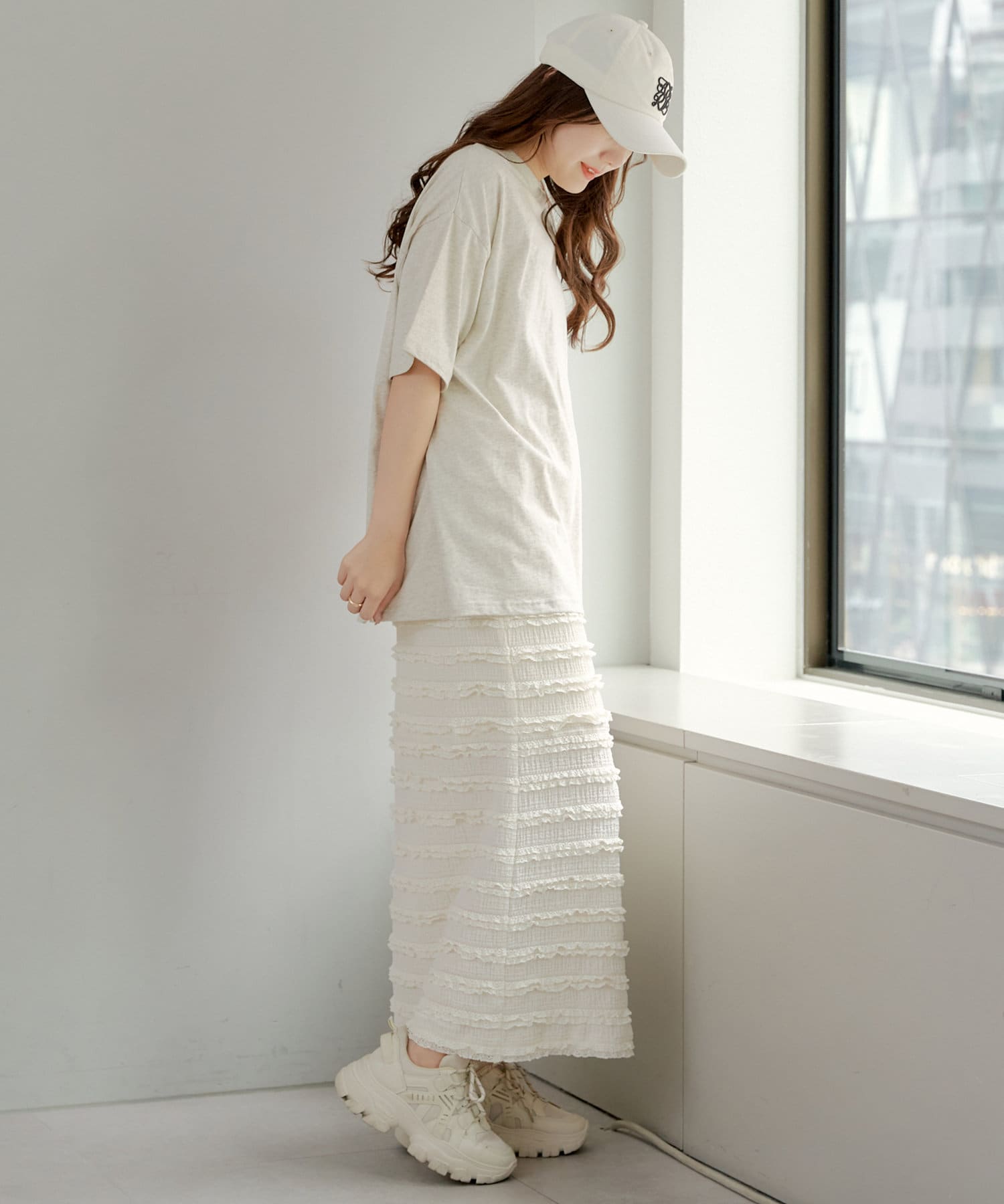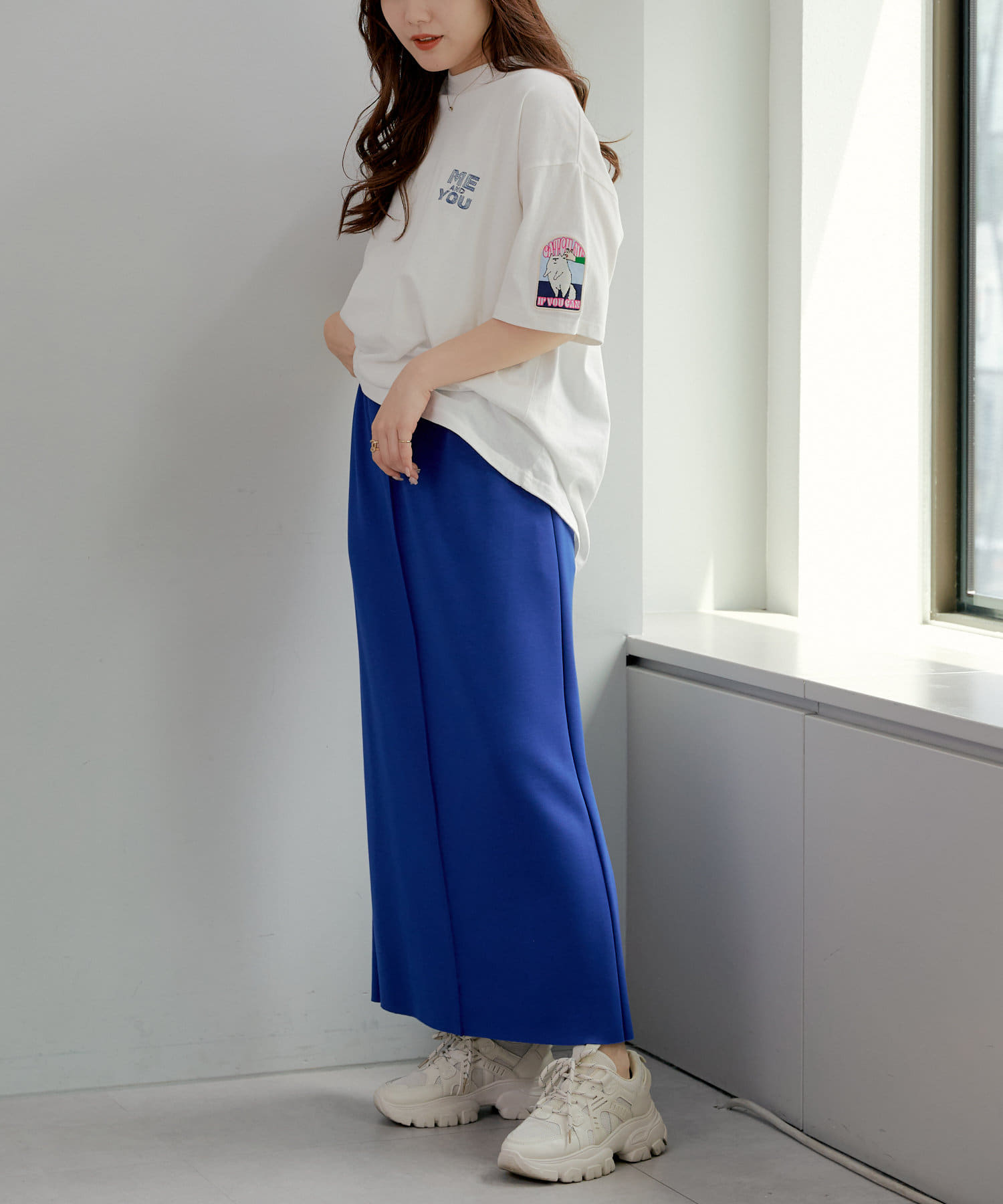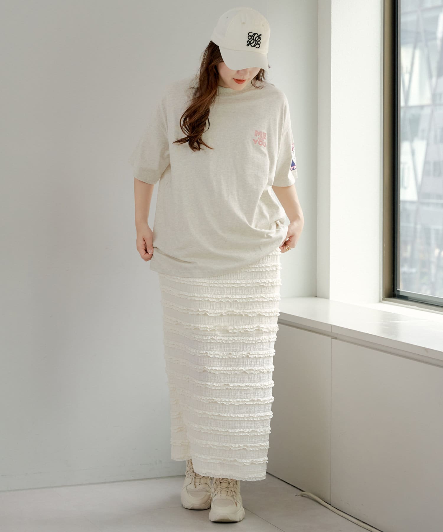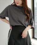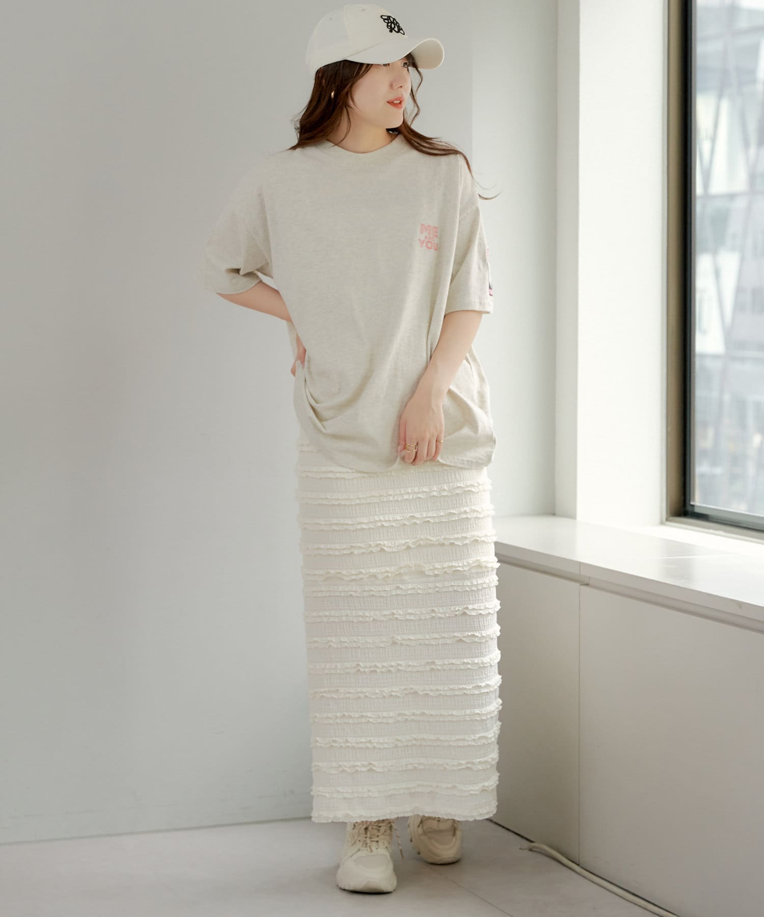 ・大きめなシルエットのTシャツは、ミニスカやタイトなスカートと合わせたり