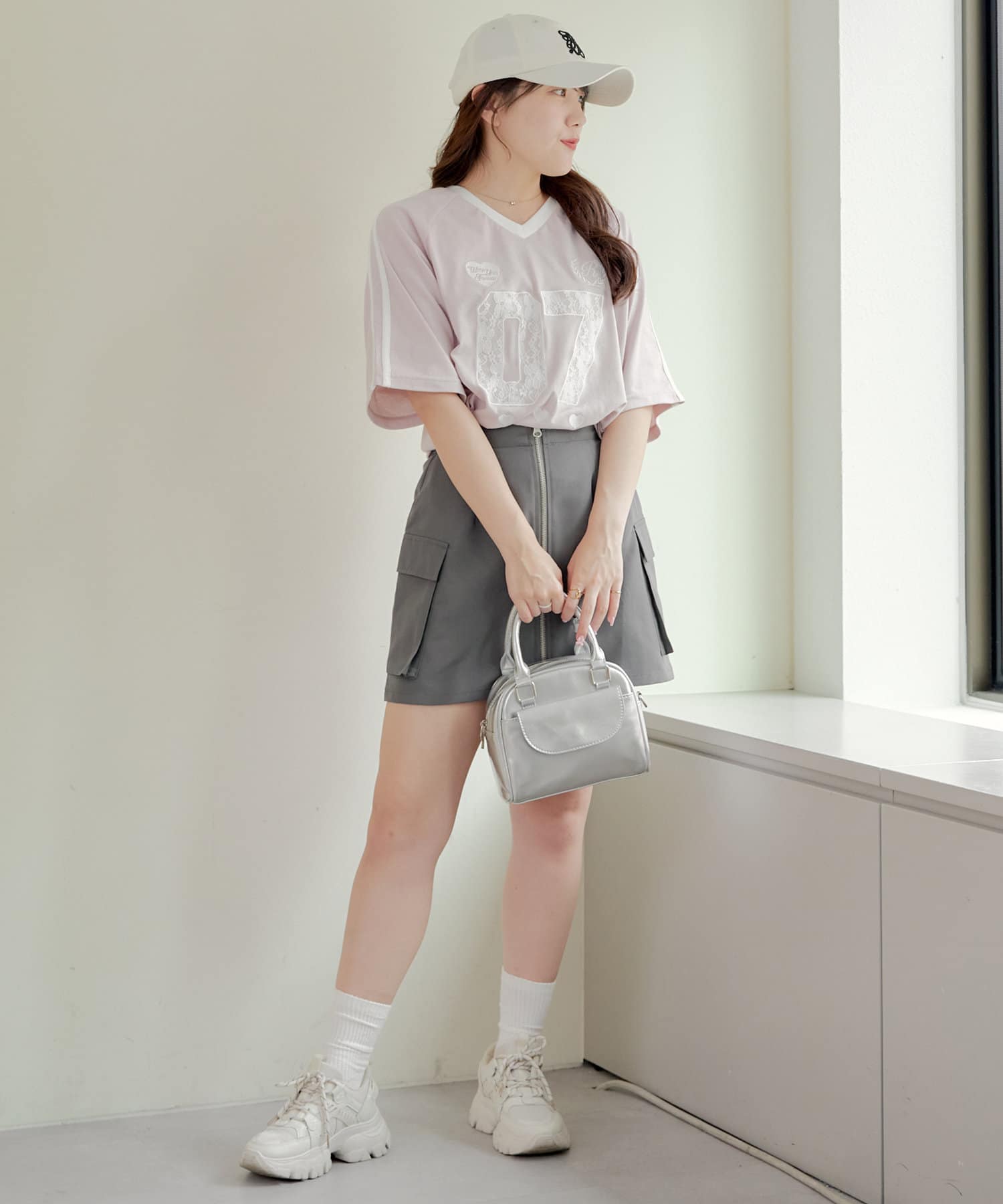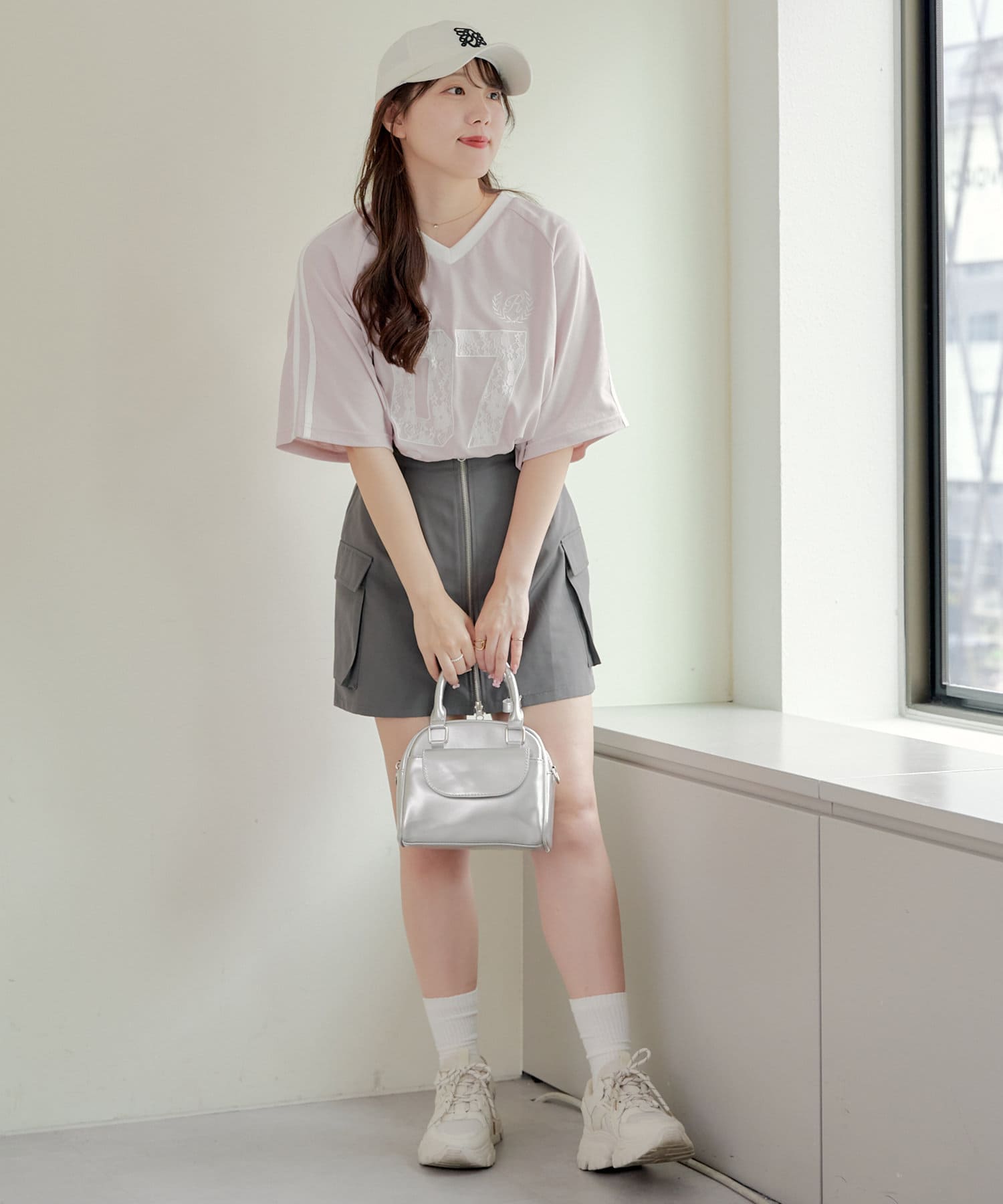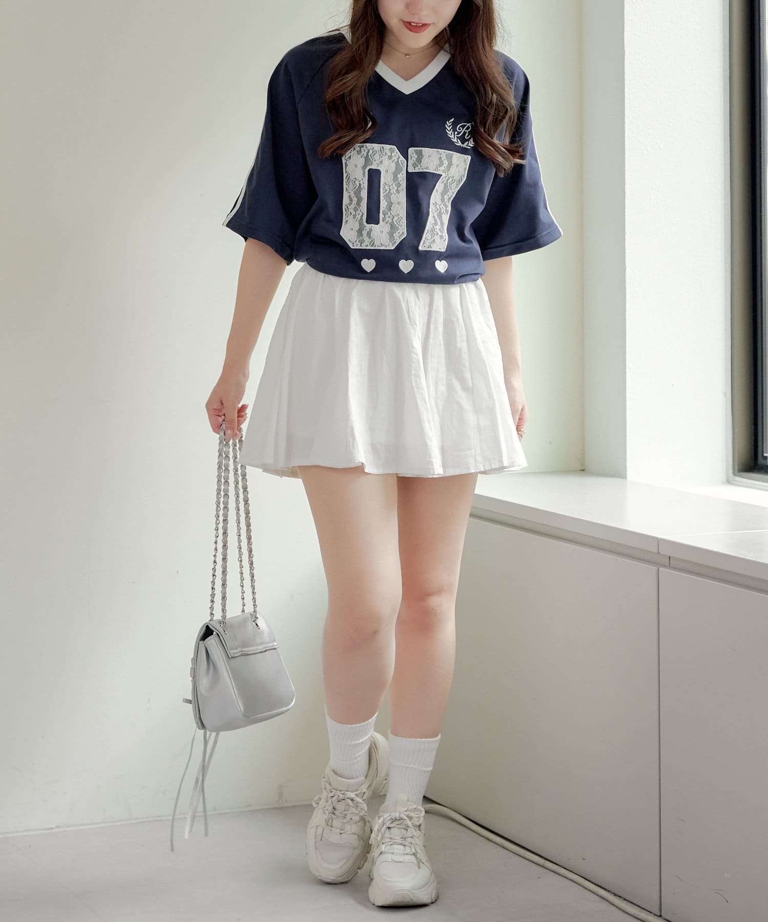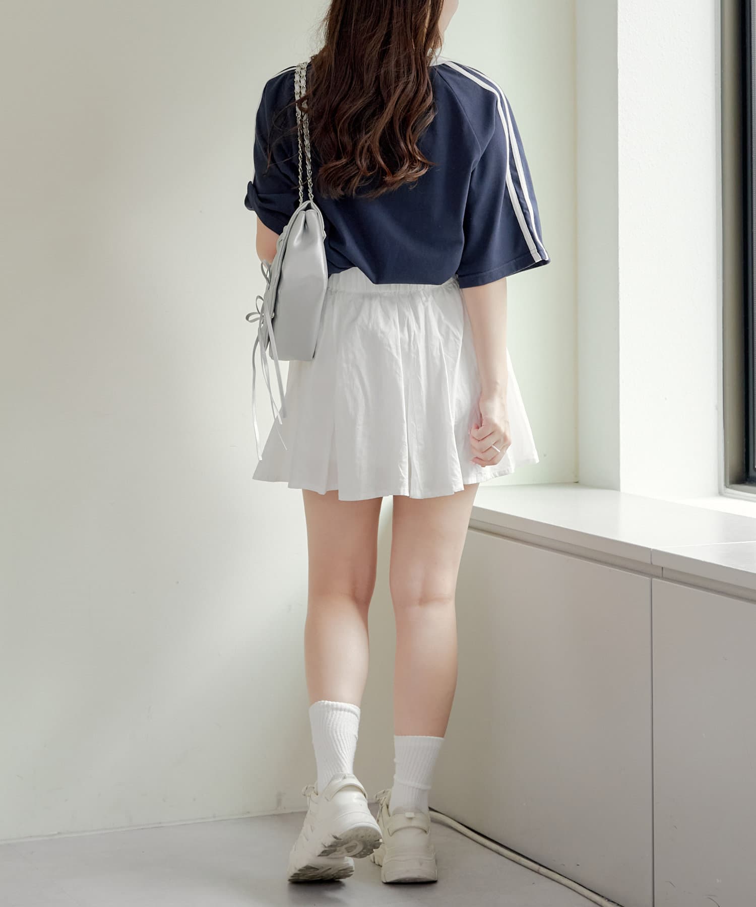 流行りのスポーティなコーディネートはどうしてもカジュアルよりになって合わせ方が難しかったりするものの、レースなのでガーリーさがプラスされて、可愛く着こなせます!