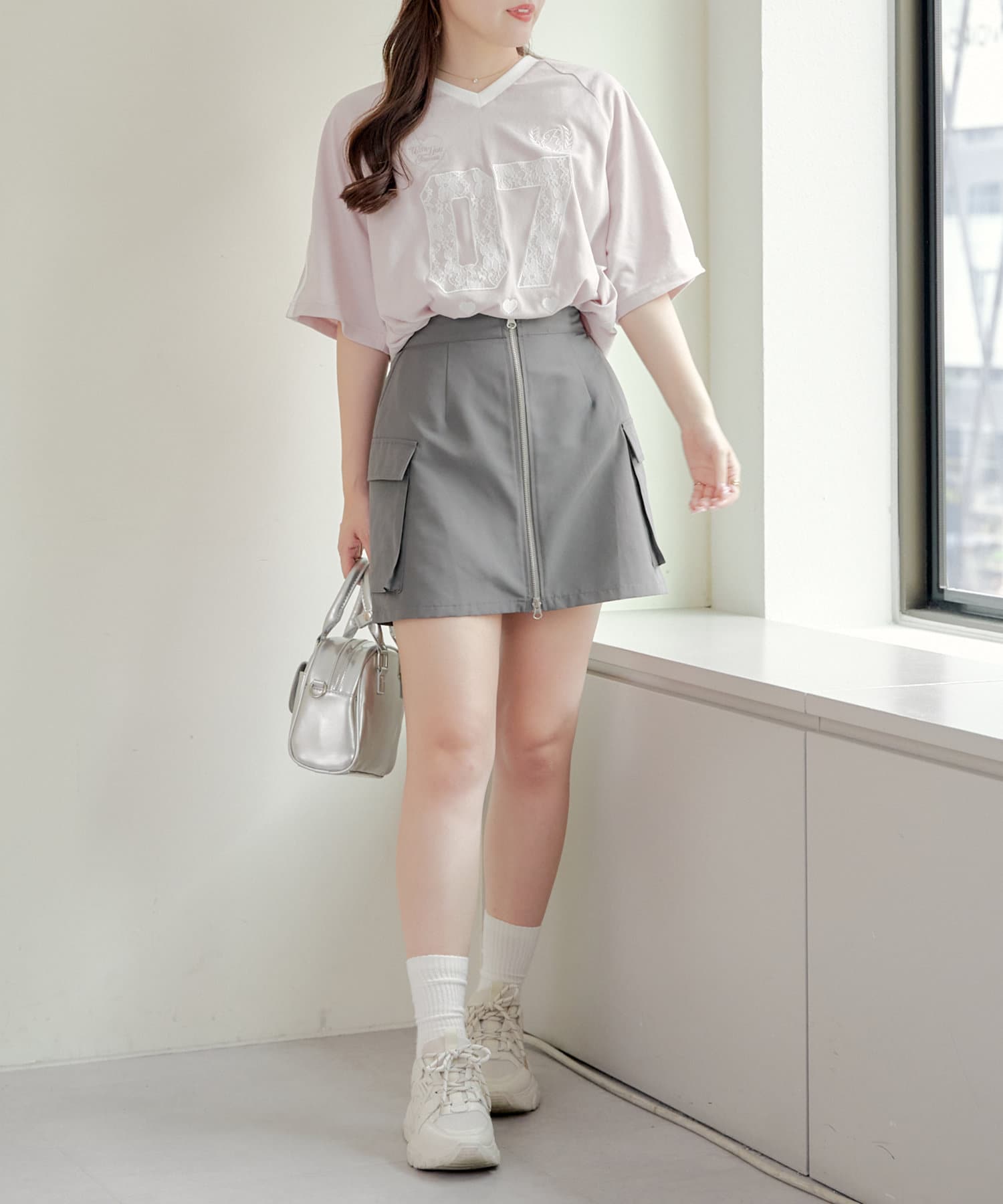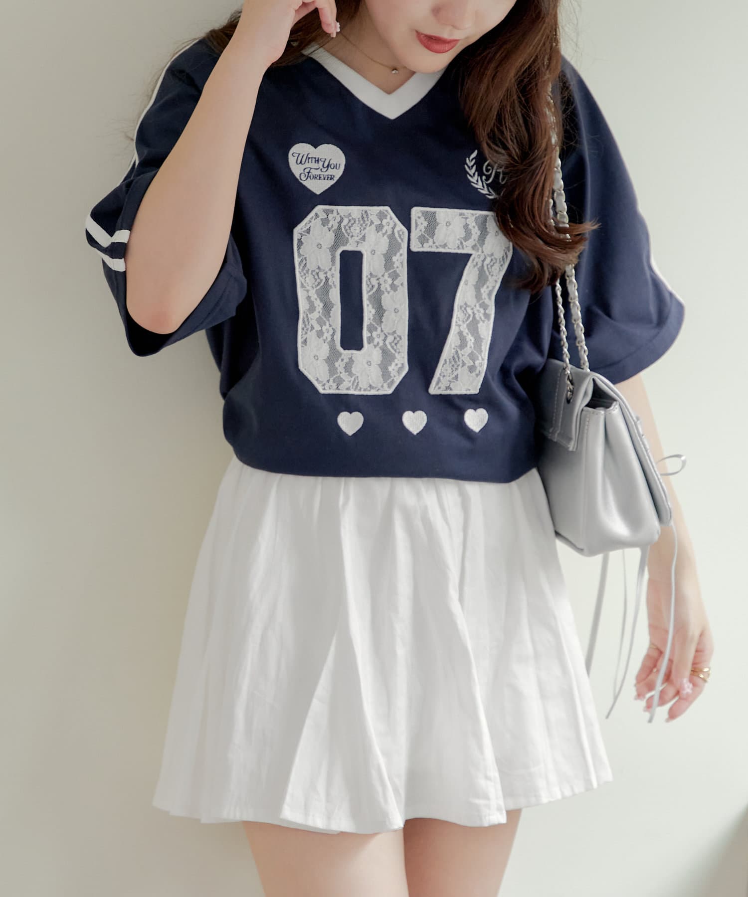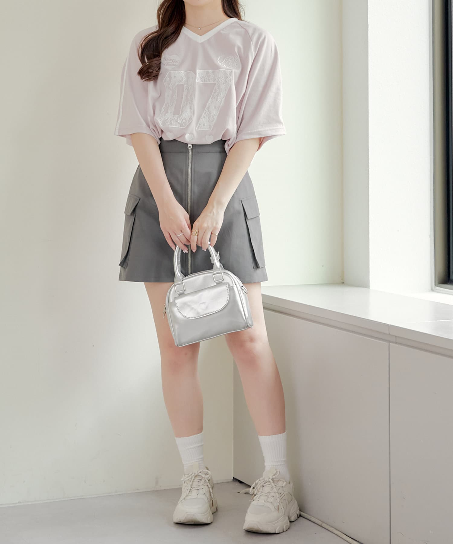 流行りのスポーティなコーディネートはどうしてもカジュアルよりになって合わせ方が難しかったりするものの、レースなのでガーリーさがプラスされて、可愛く着こなせます!