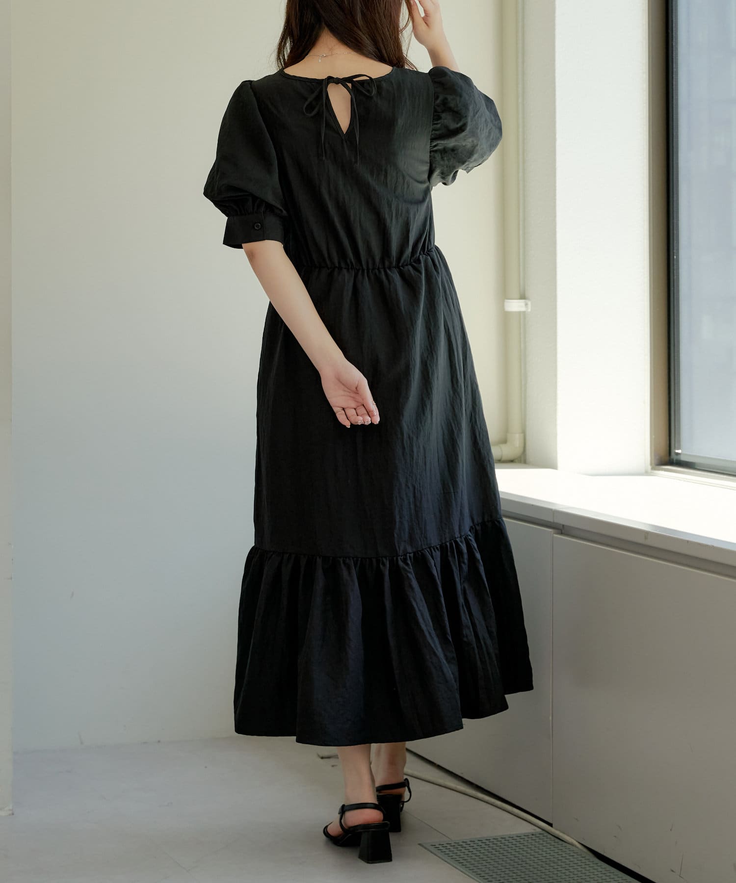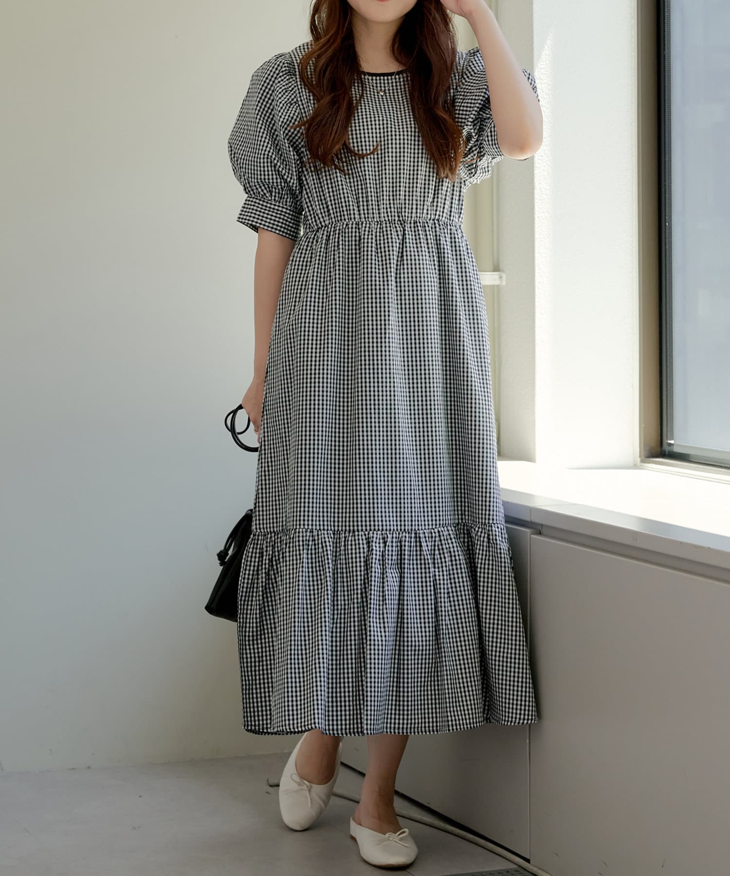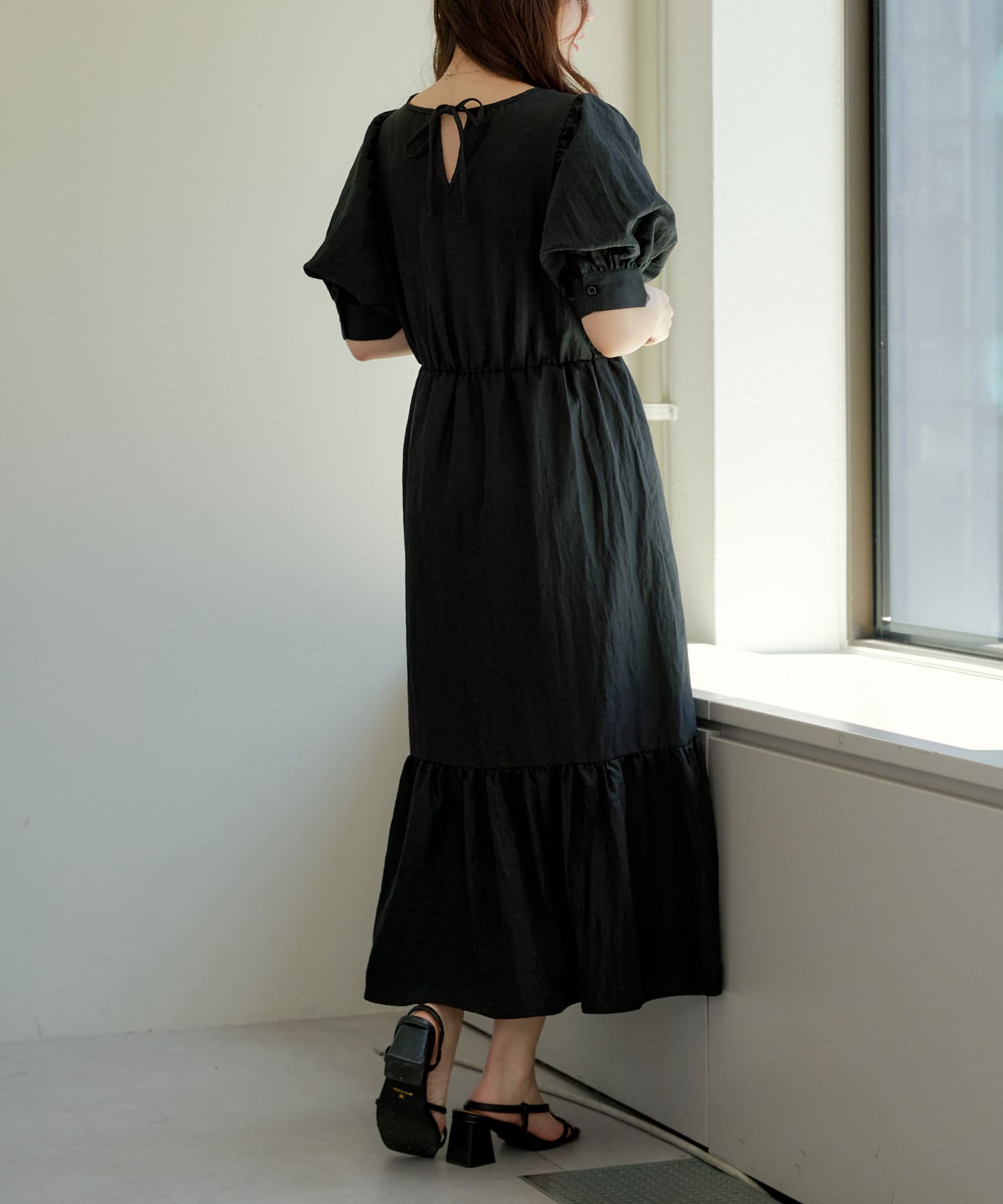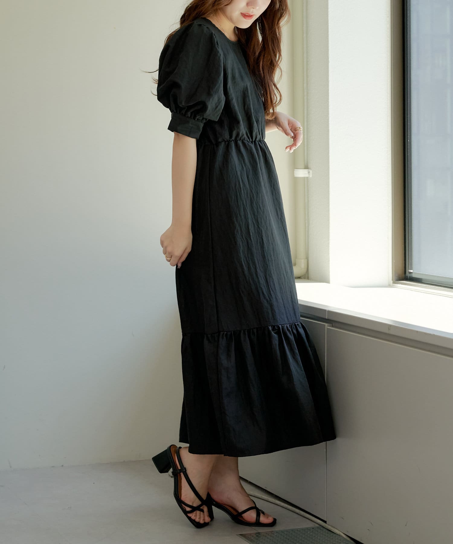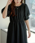 ・丸みのあるパフスリーブやや広めのネックラインが女性らしいムード演出します