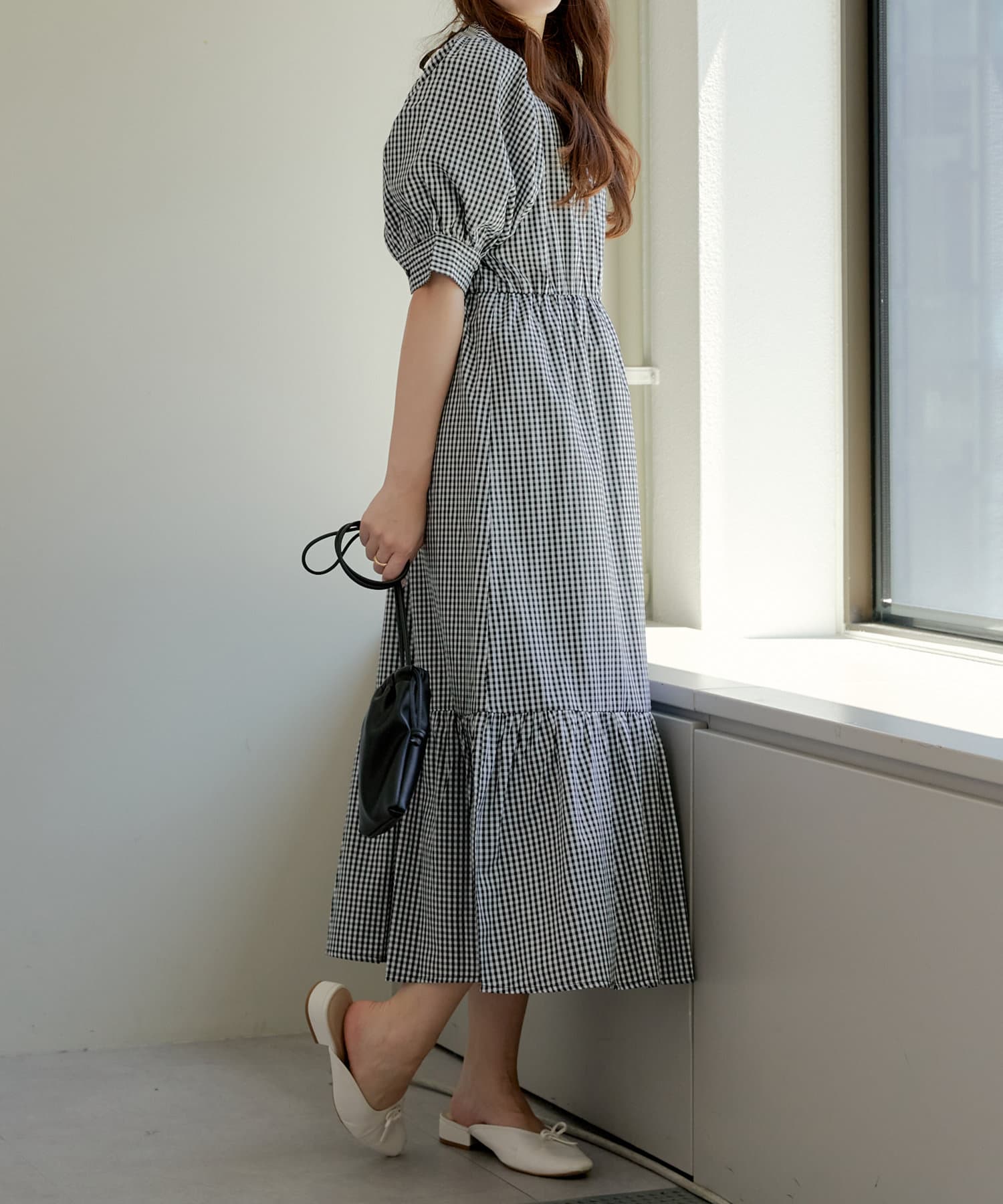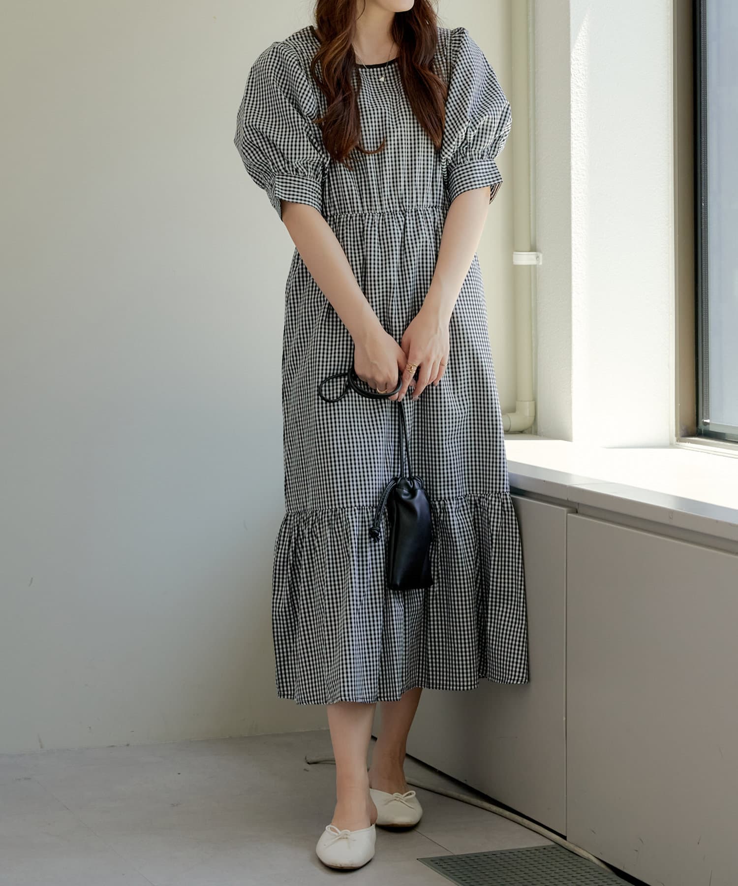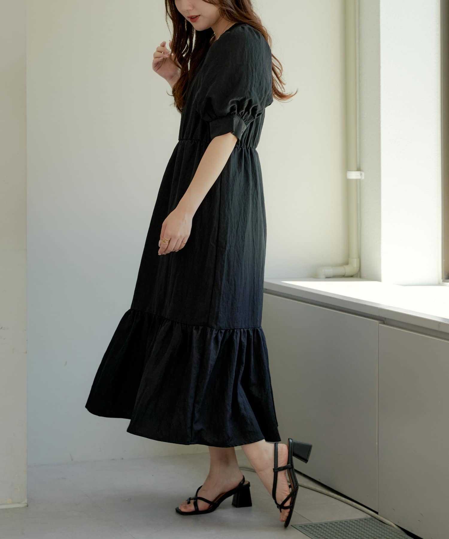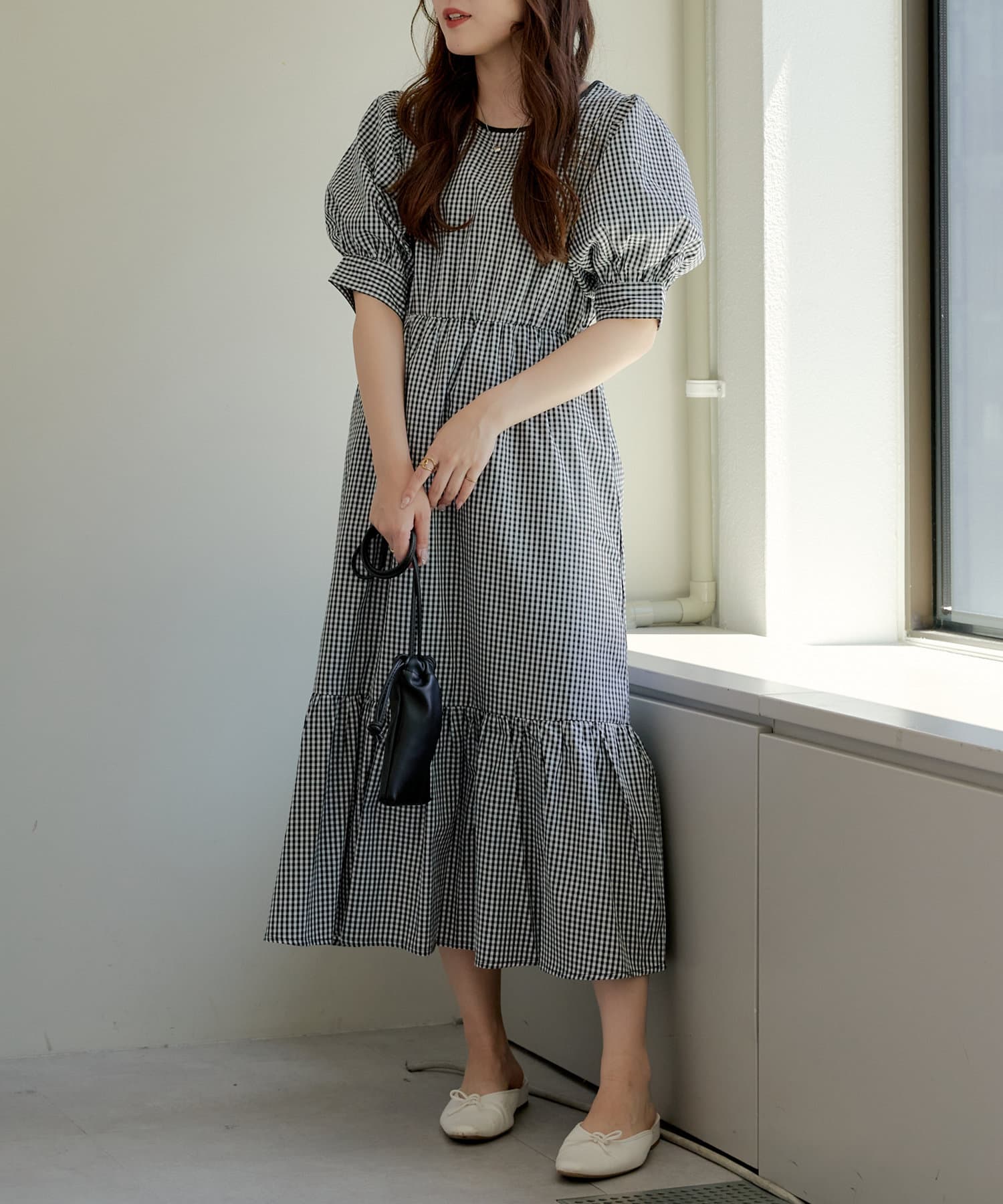 ・丸みのあるパフスリーブやや広めのネックラインが女性らしいムード演出します