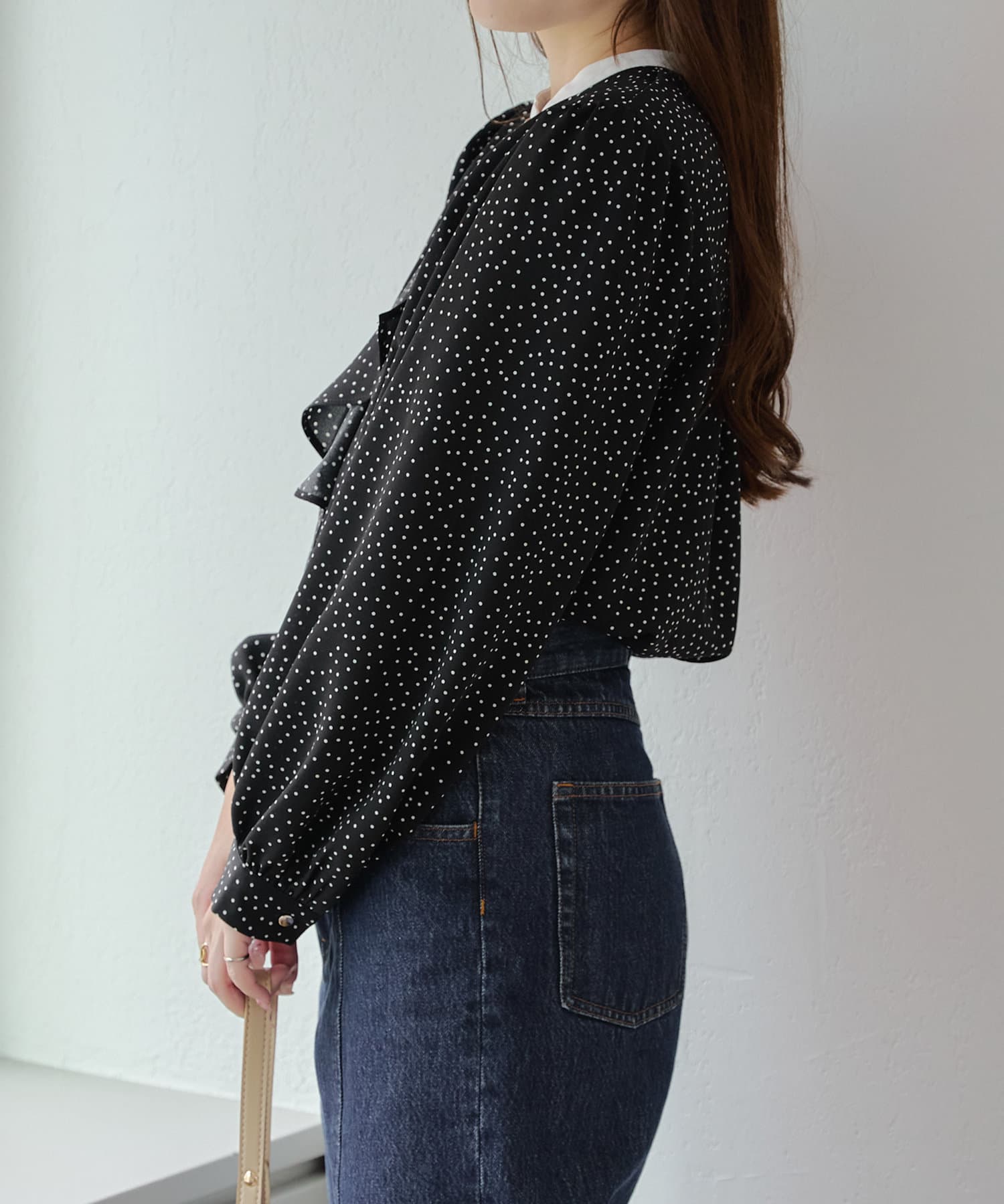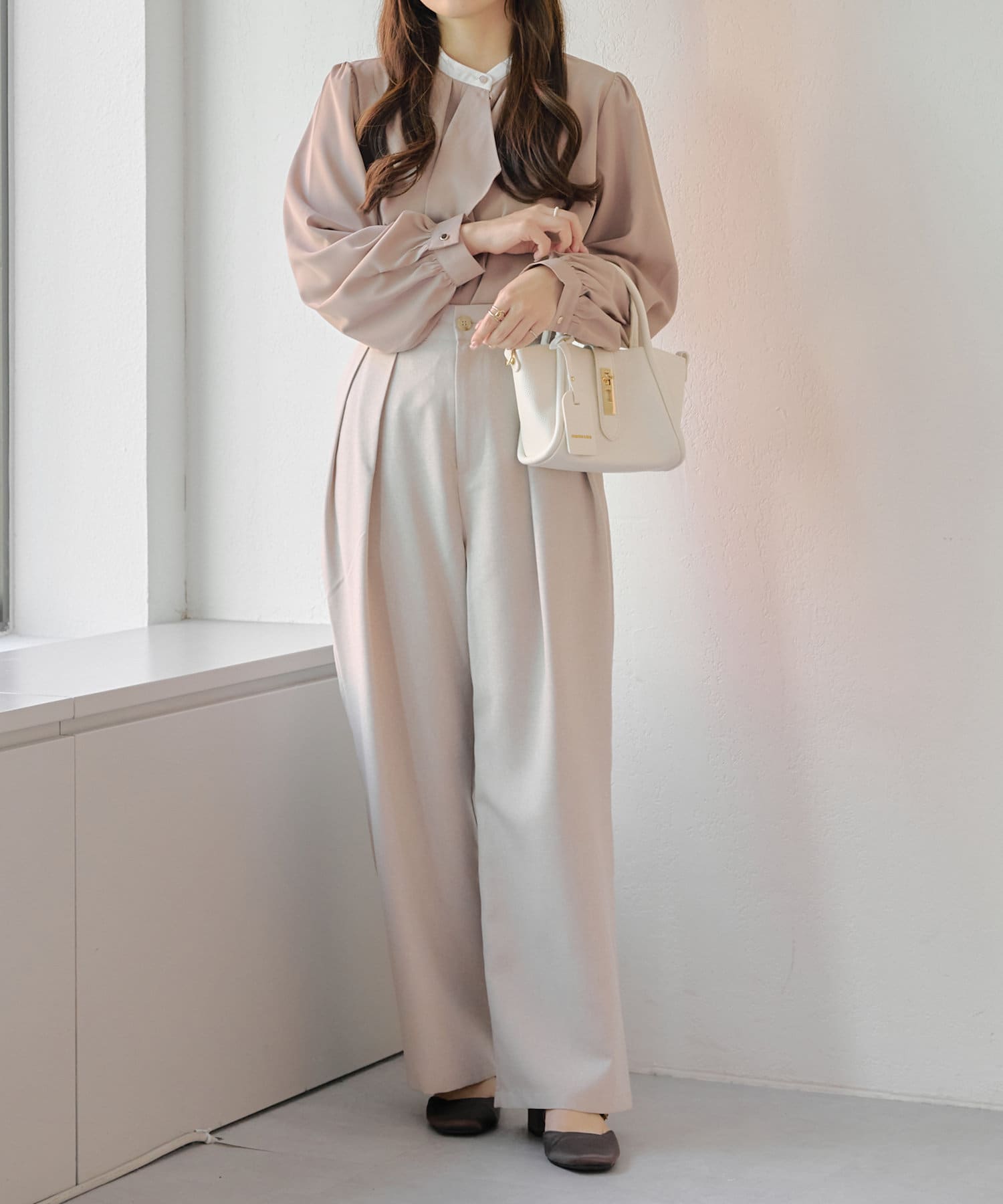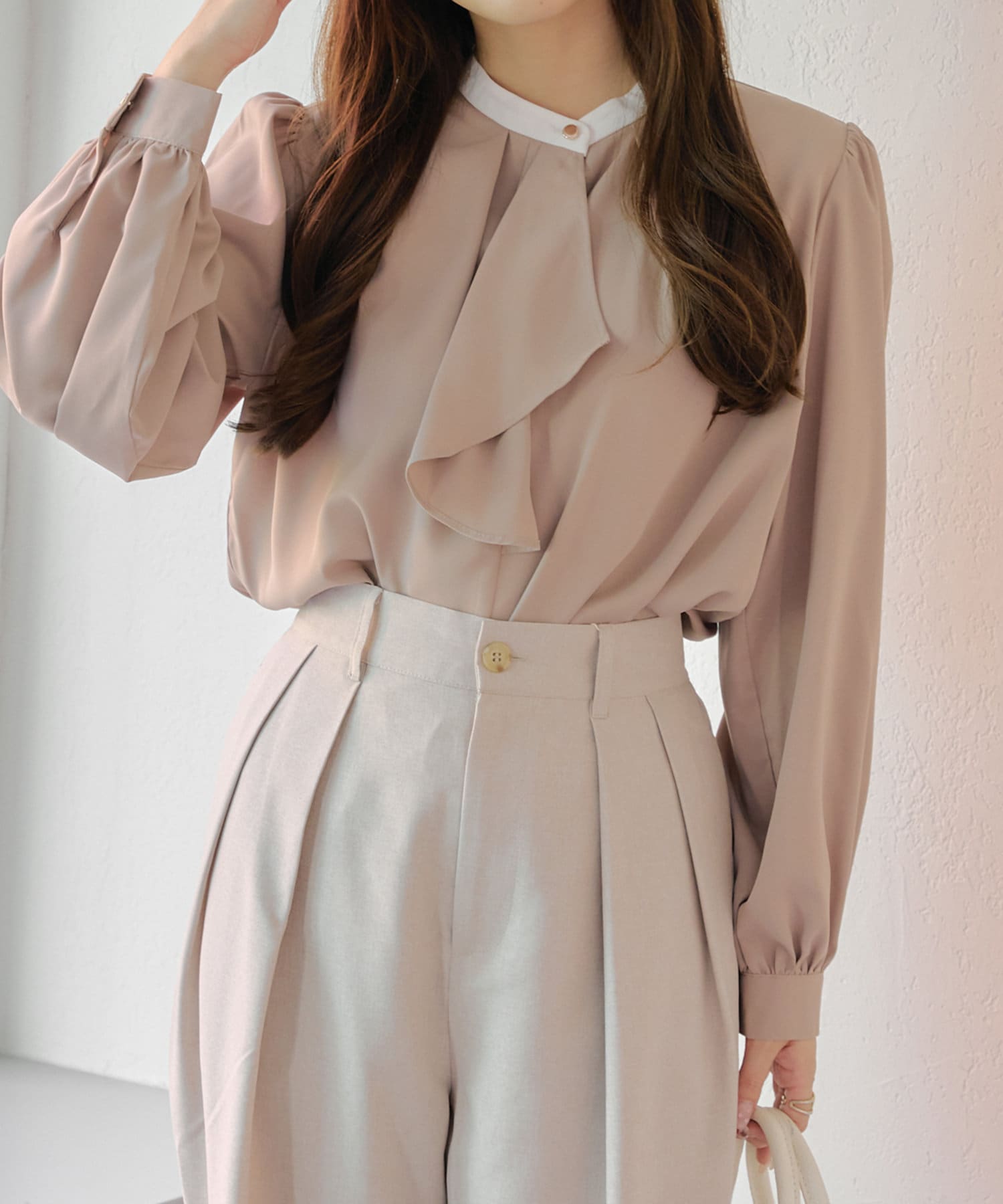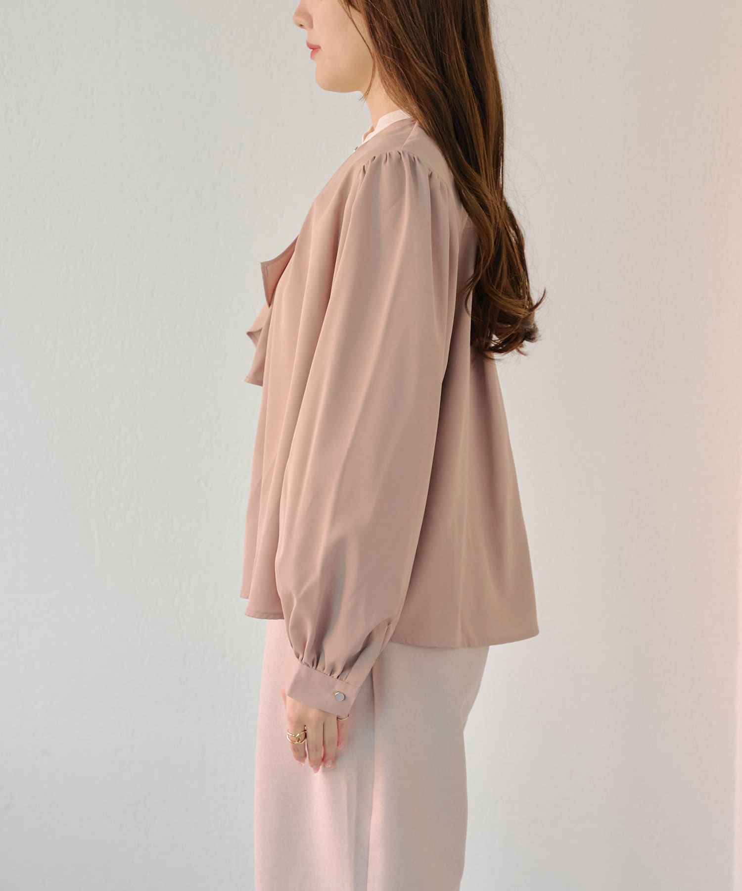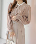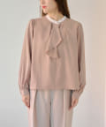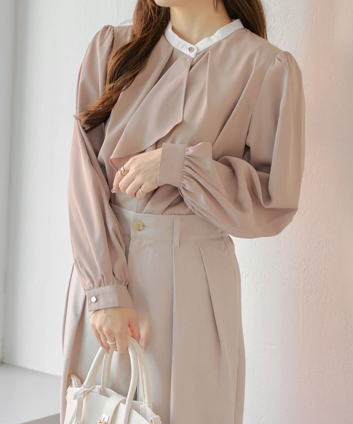 ・胸元のドレープスカーフが品のある女性らしさを演出し、アクセサリーいらずなブラウス