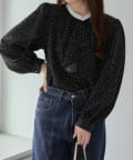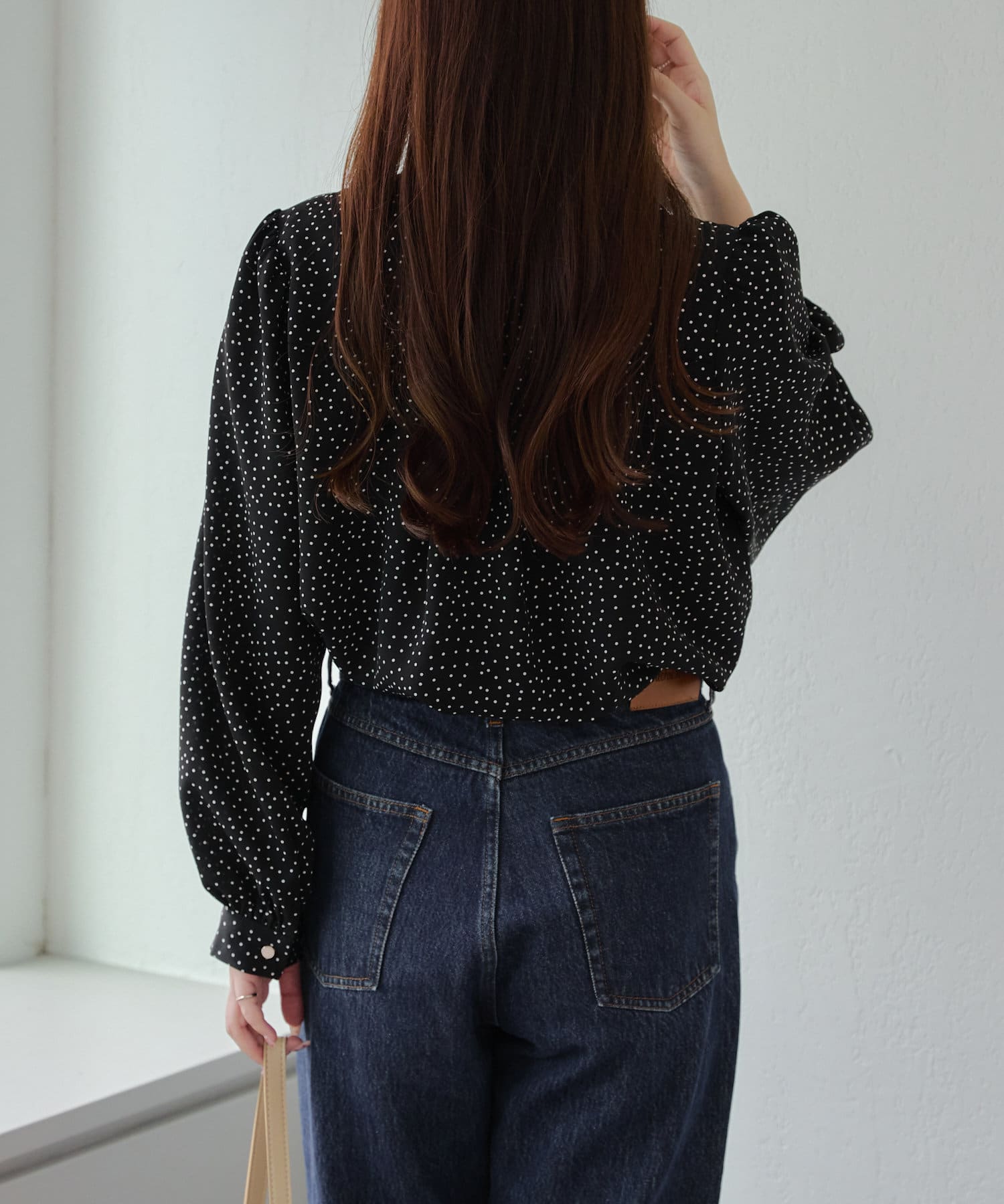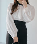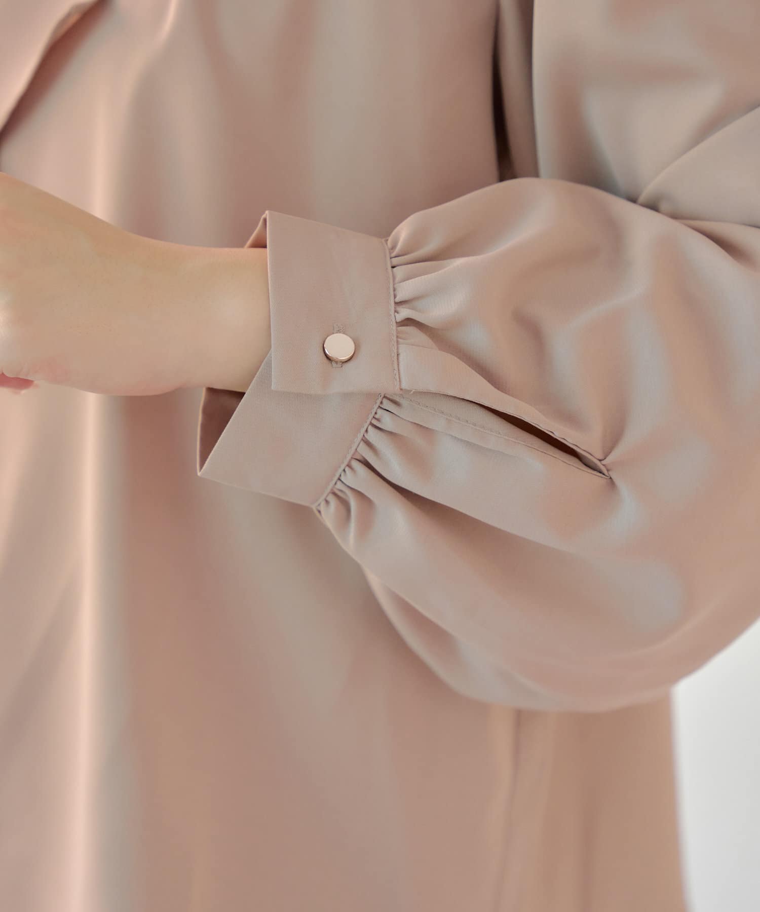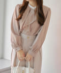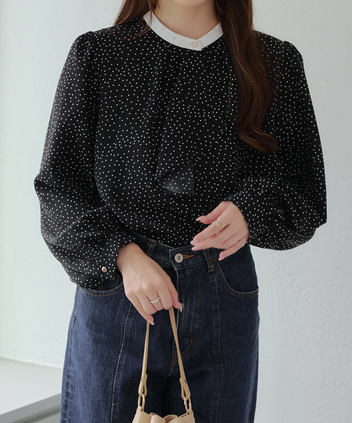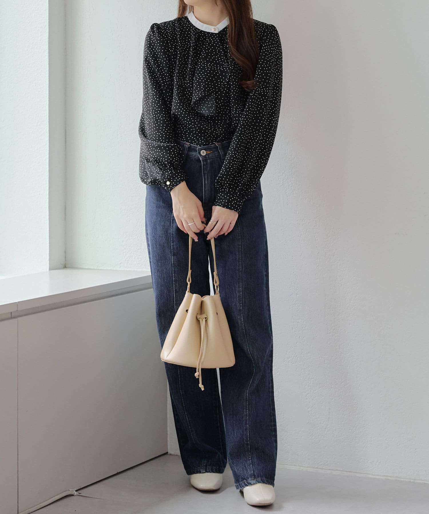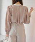 ・胸元のドレープスカーフが品のある女性らしさを演出し、アクセサリーいらずなブラウス