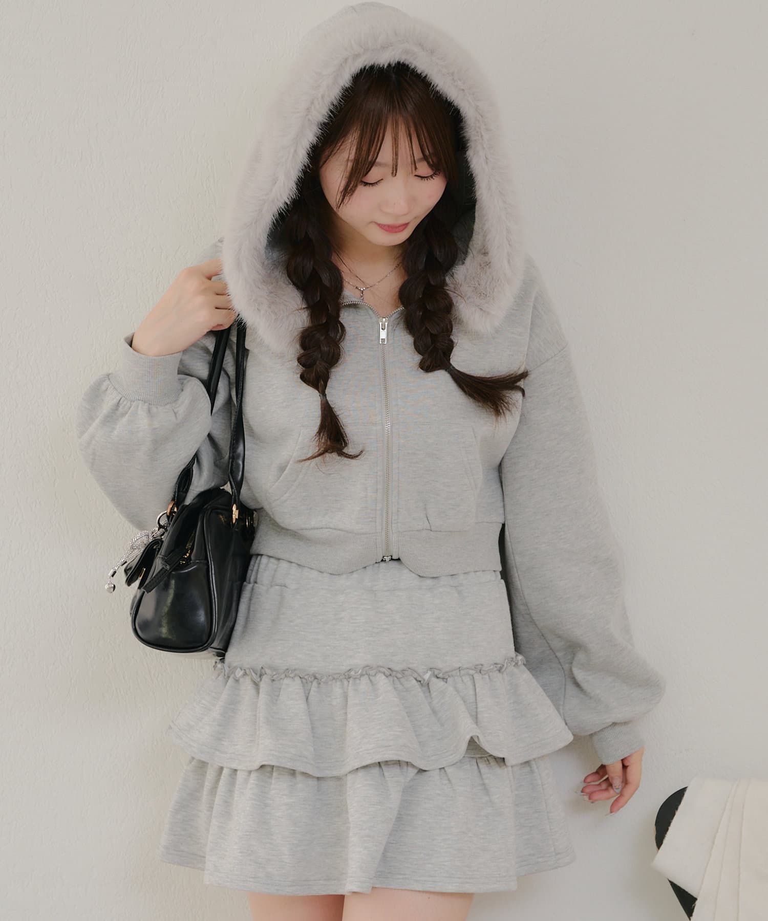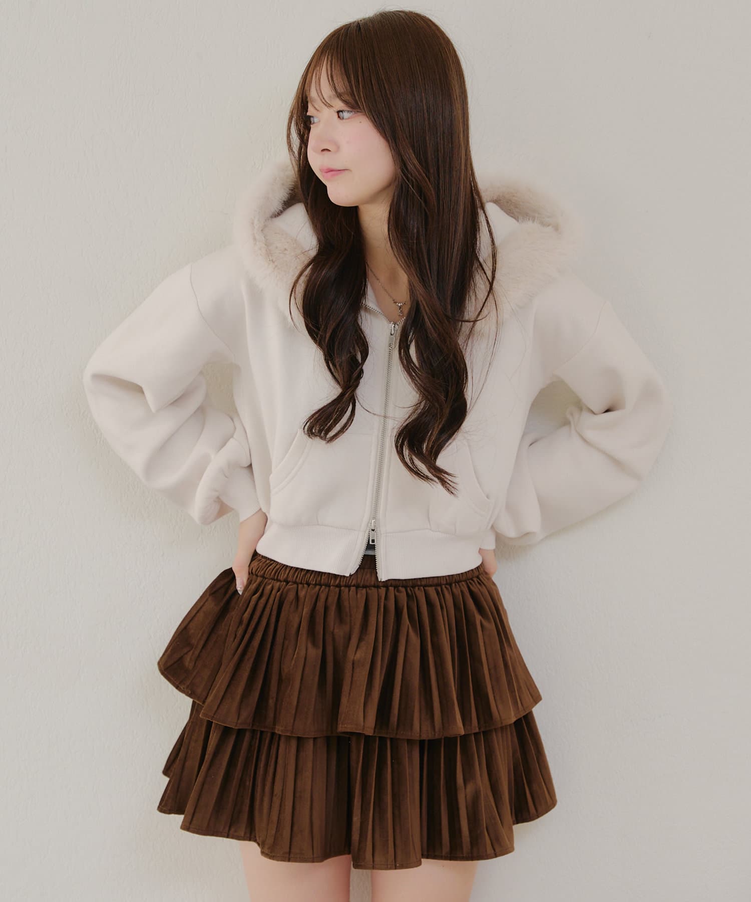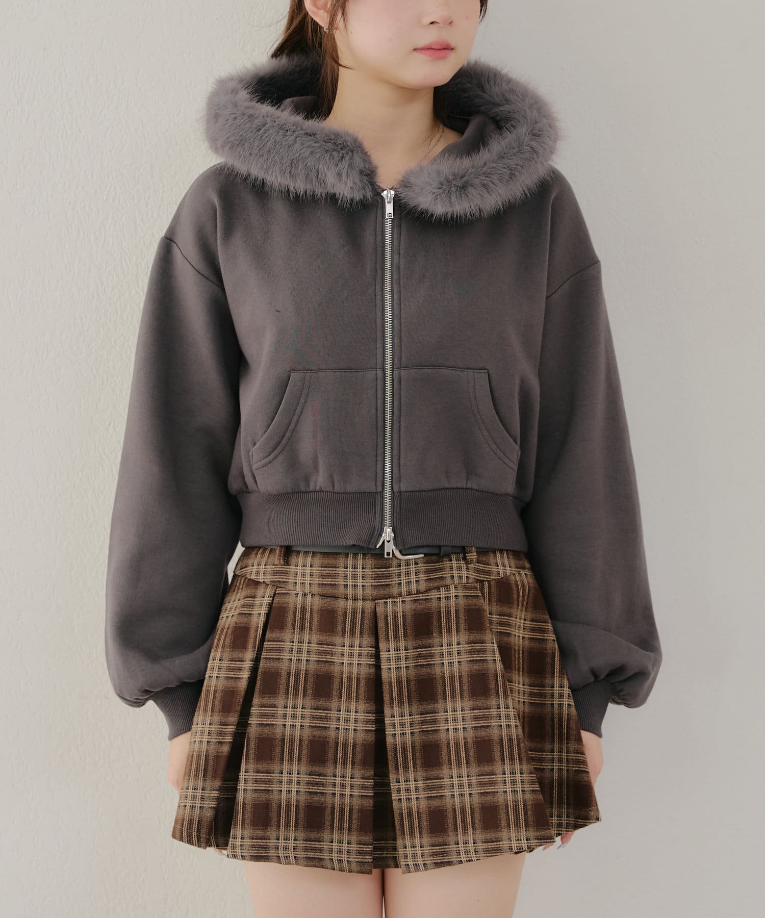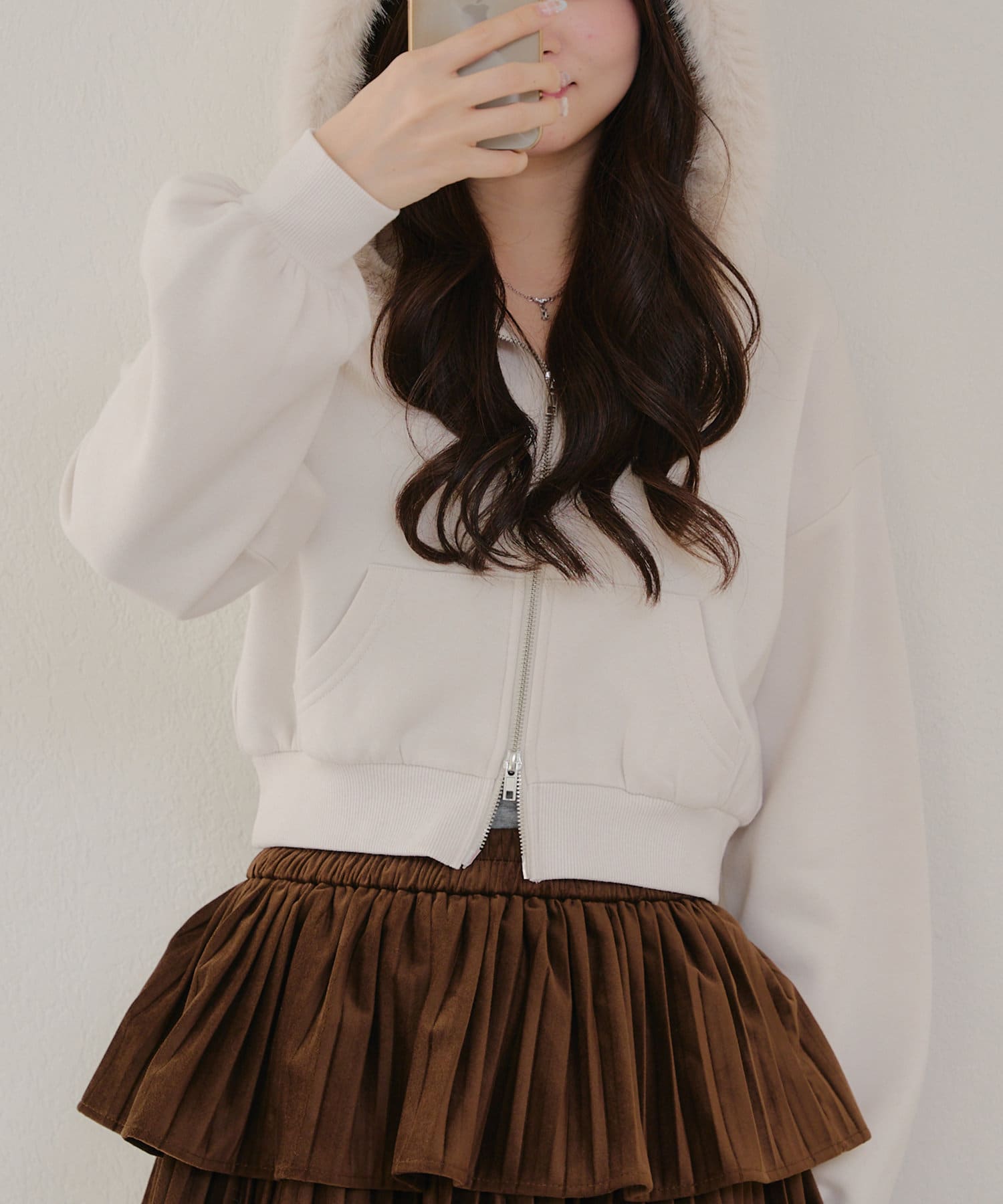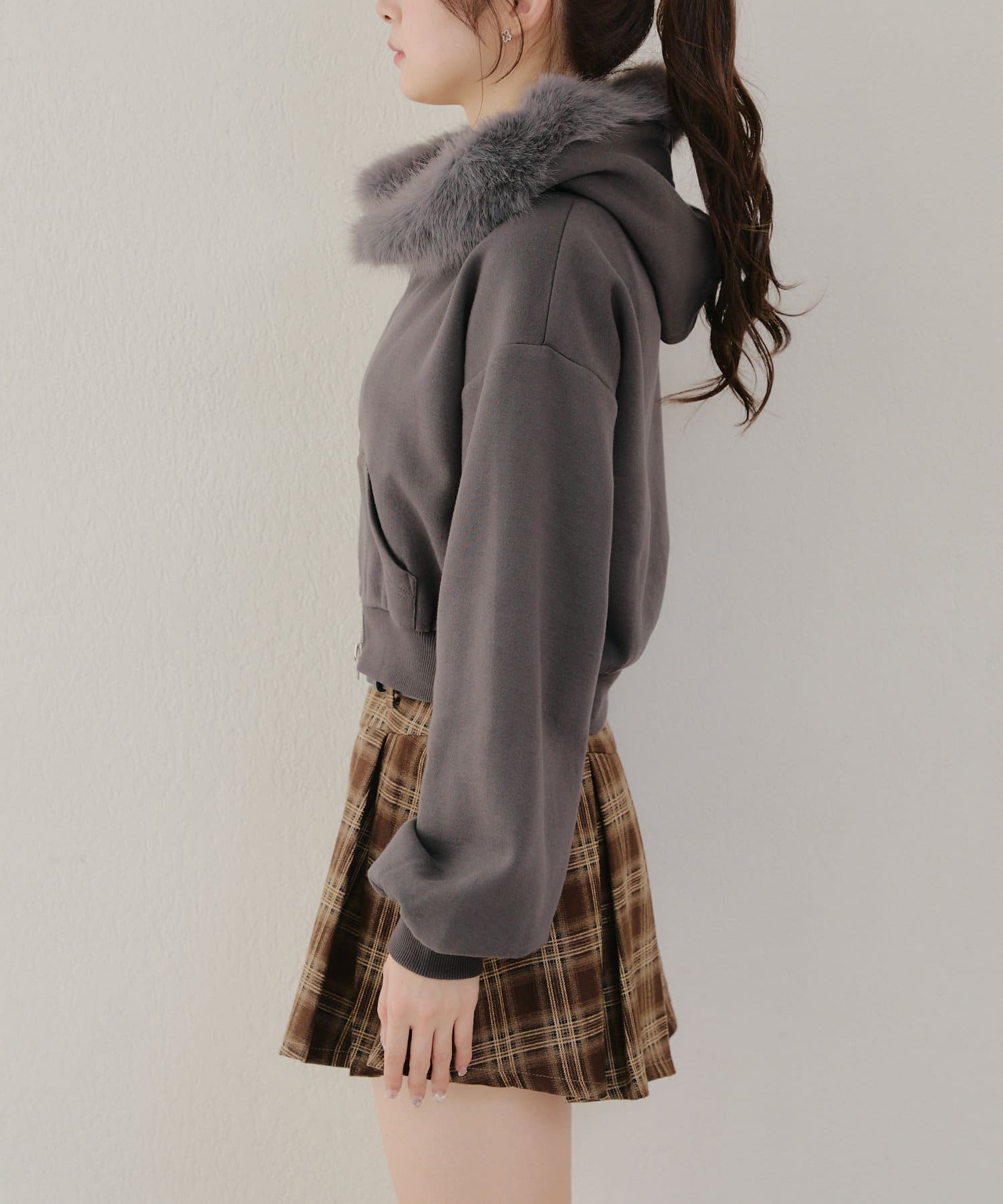 ・ふわふわのファー付きフードが可愛いパーカー。
