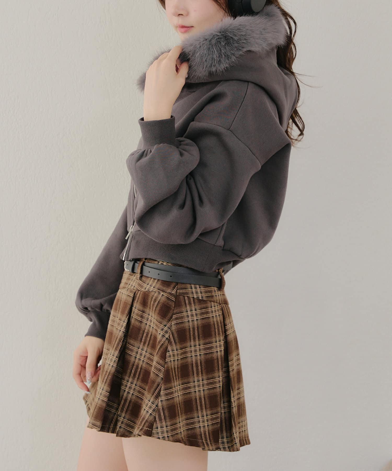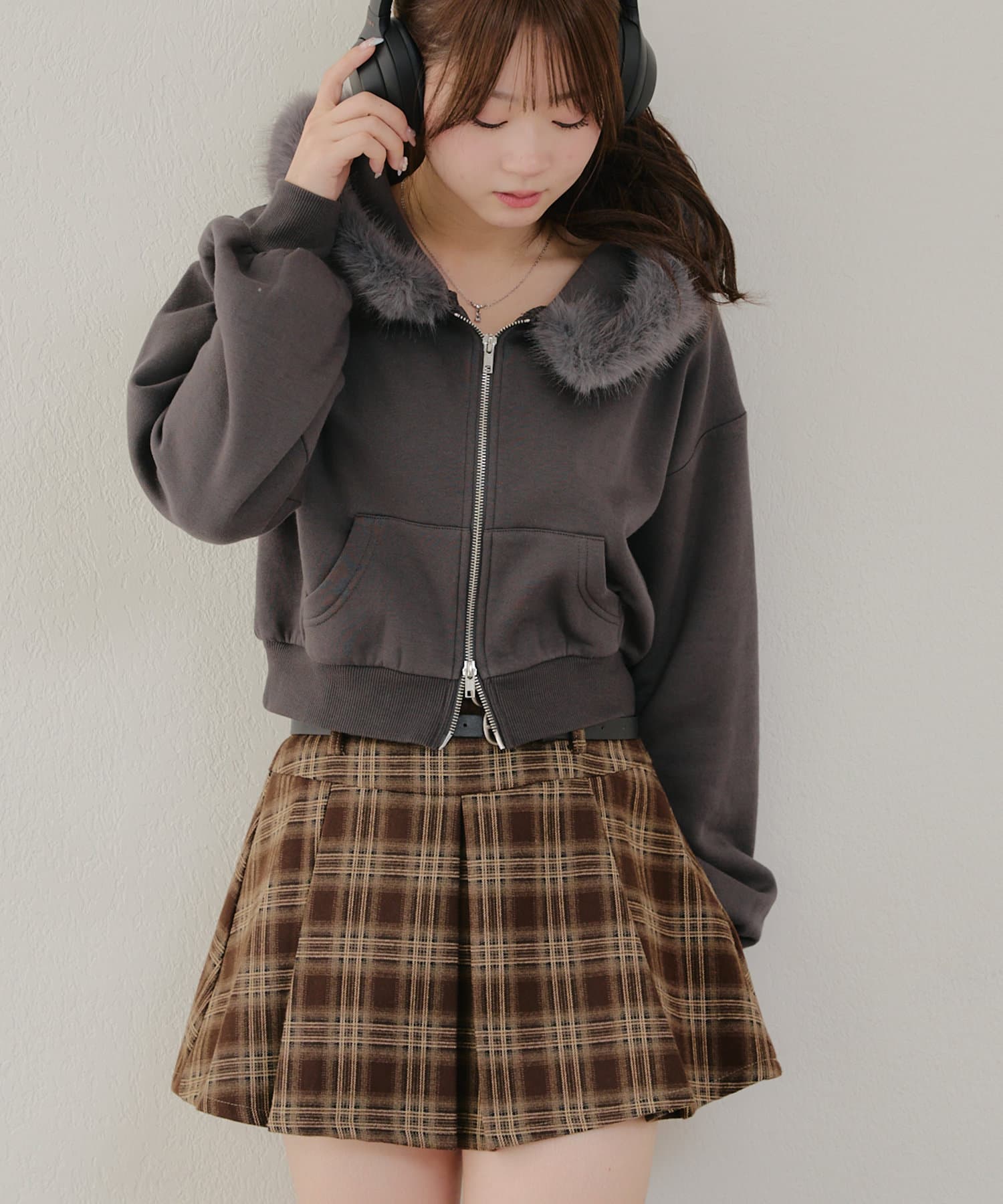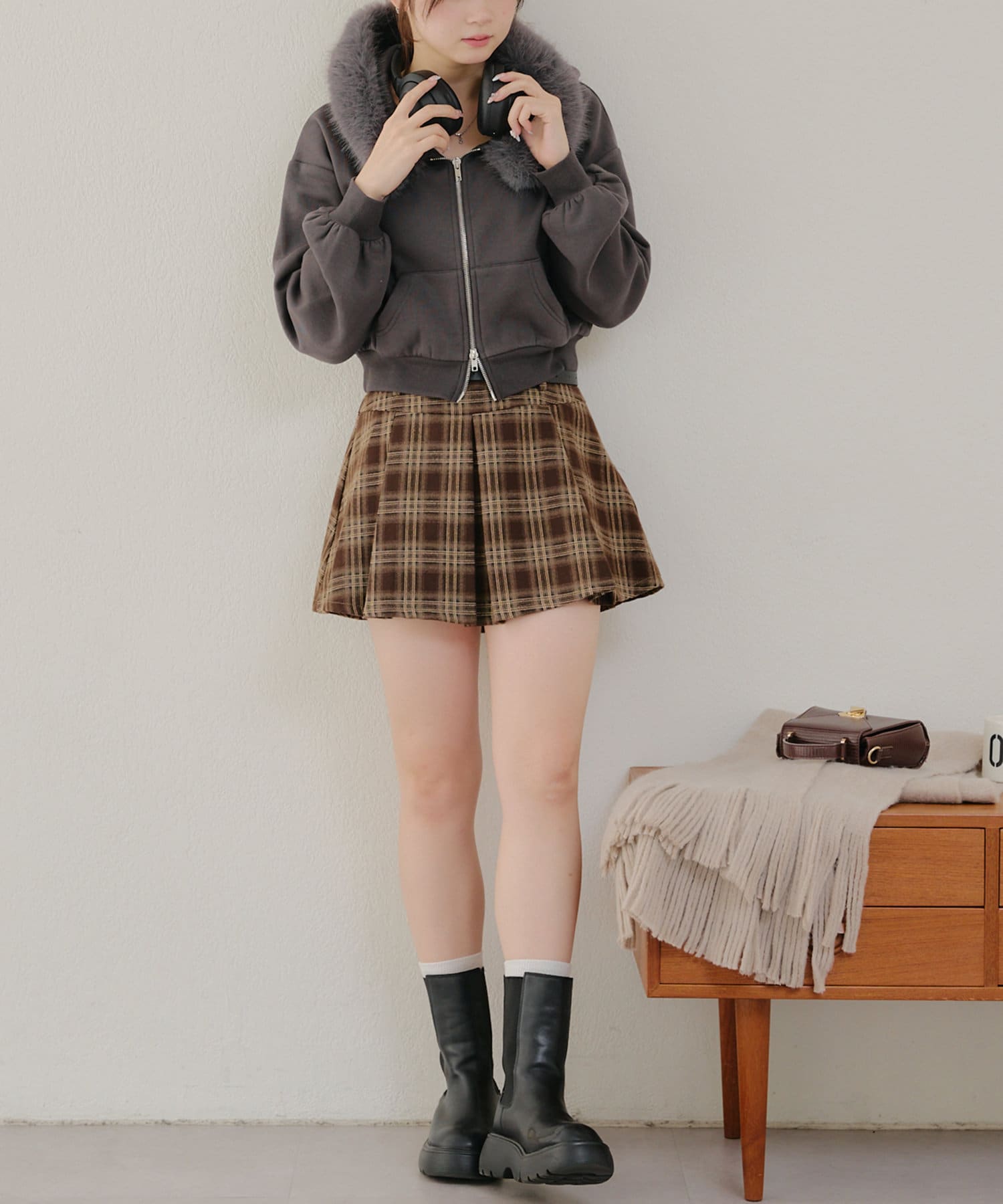 ・チェック柄を取り入れたコーデは秋冬ムードが高まります。