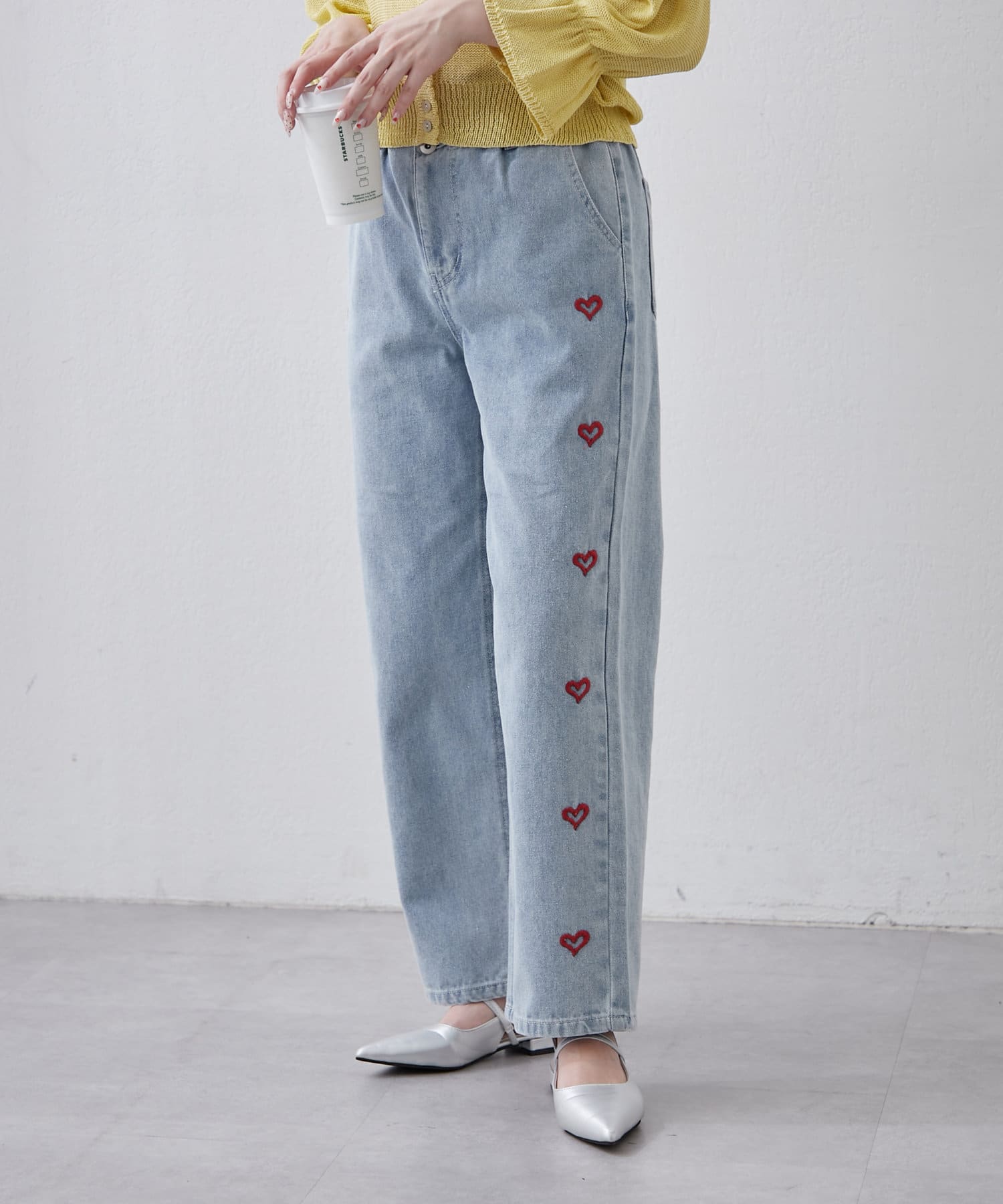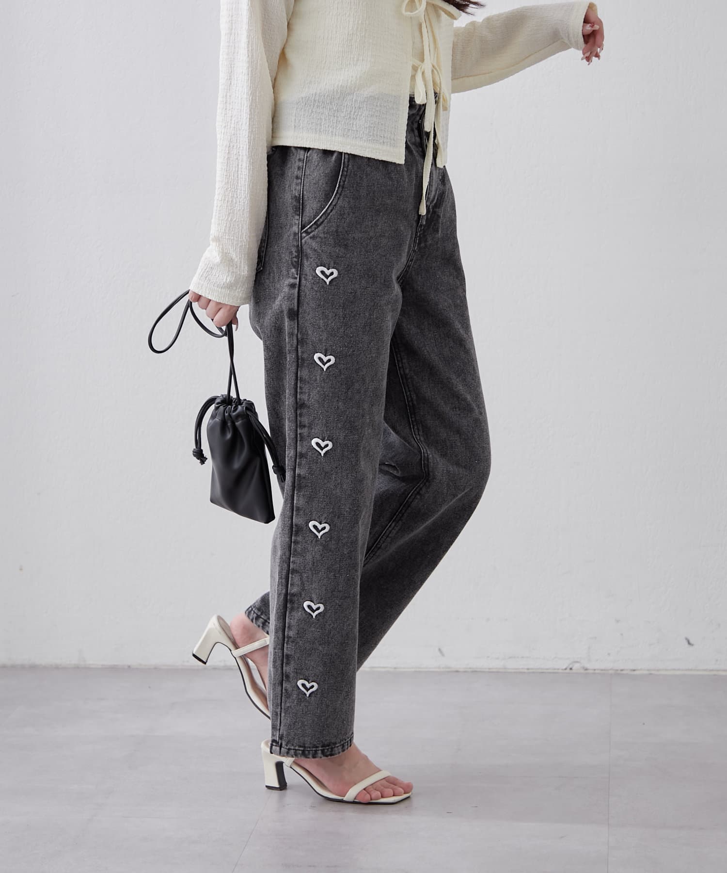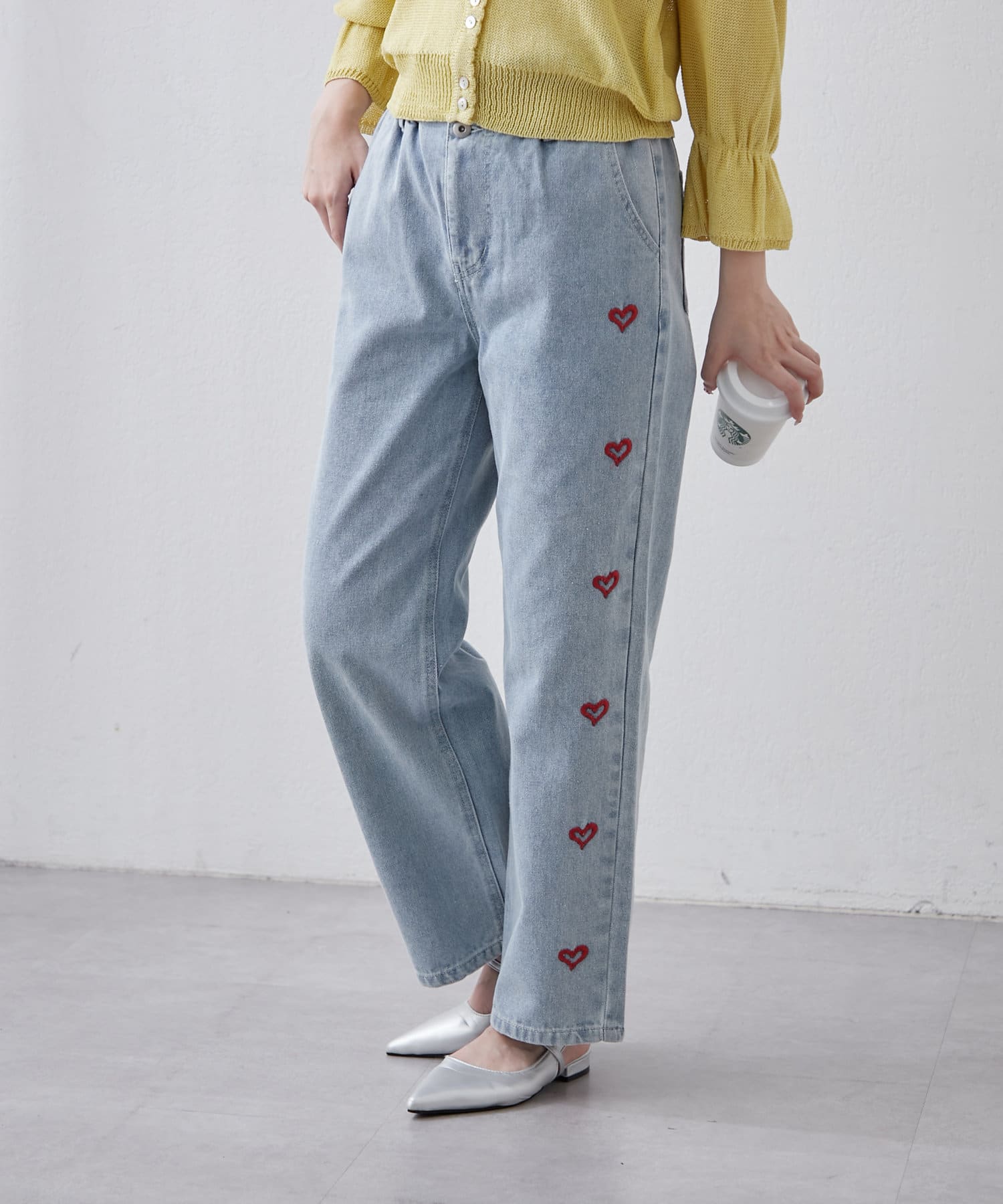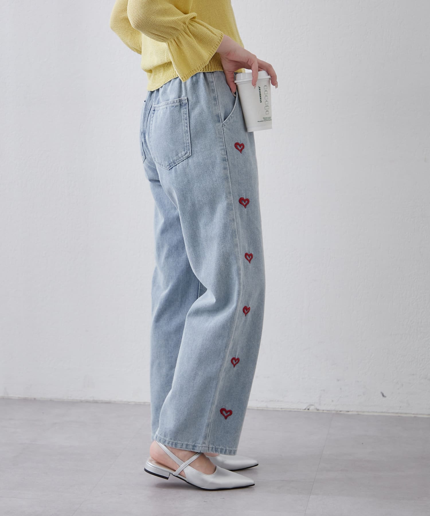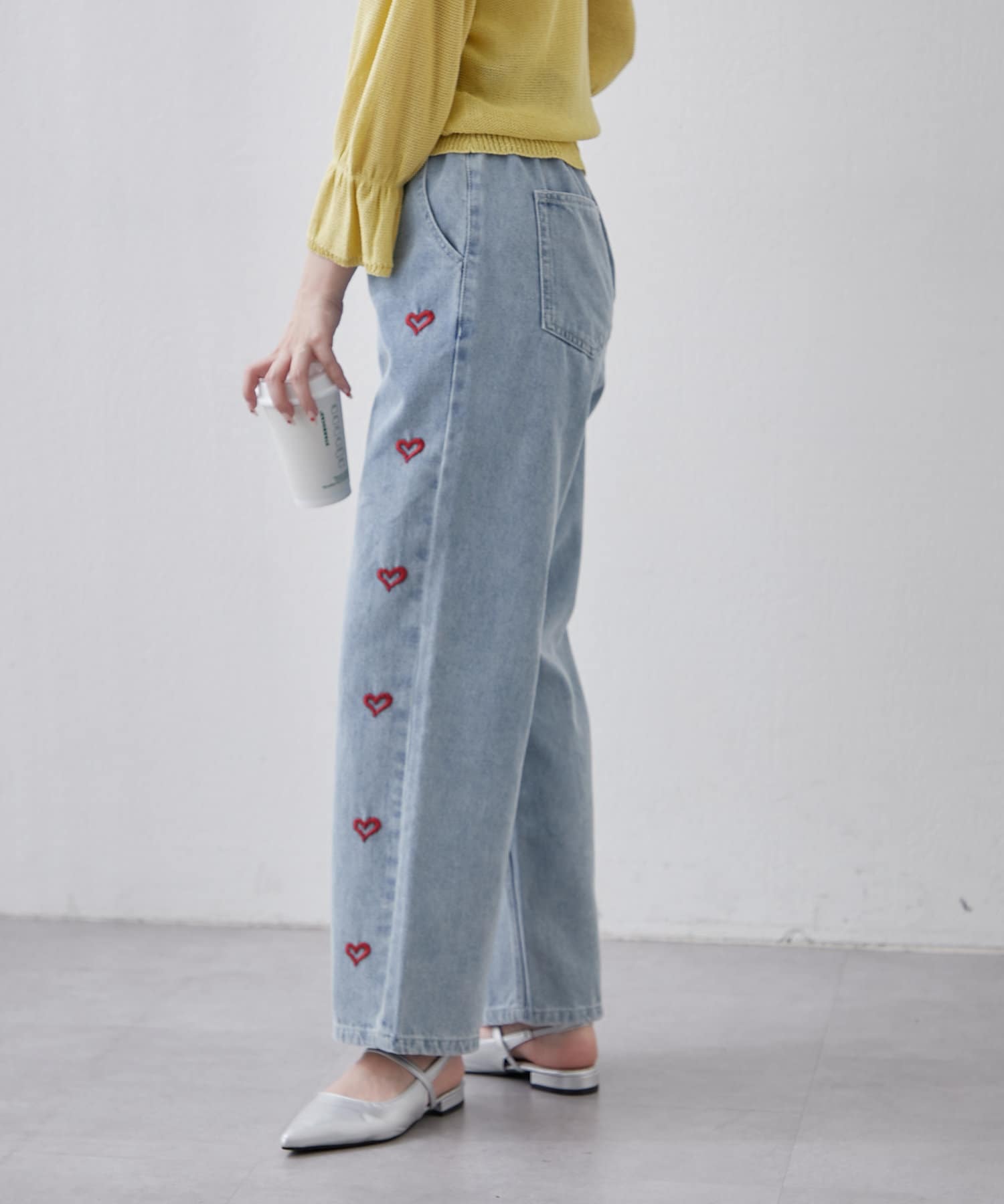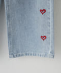 サイドにハートやリボンの刺繍が施されたデザインデニム。
