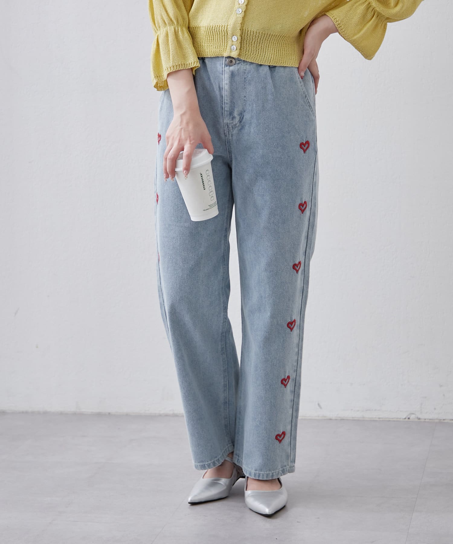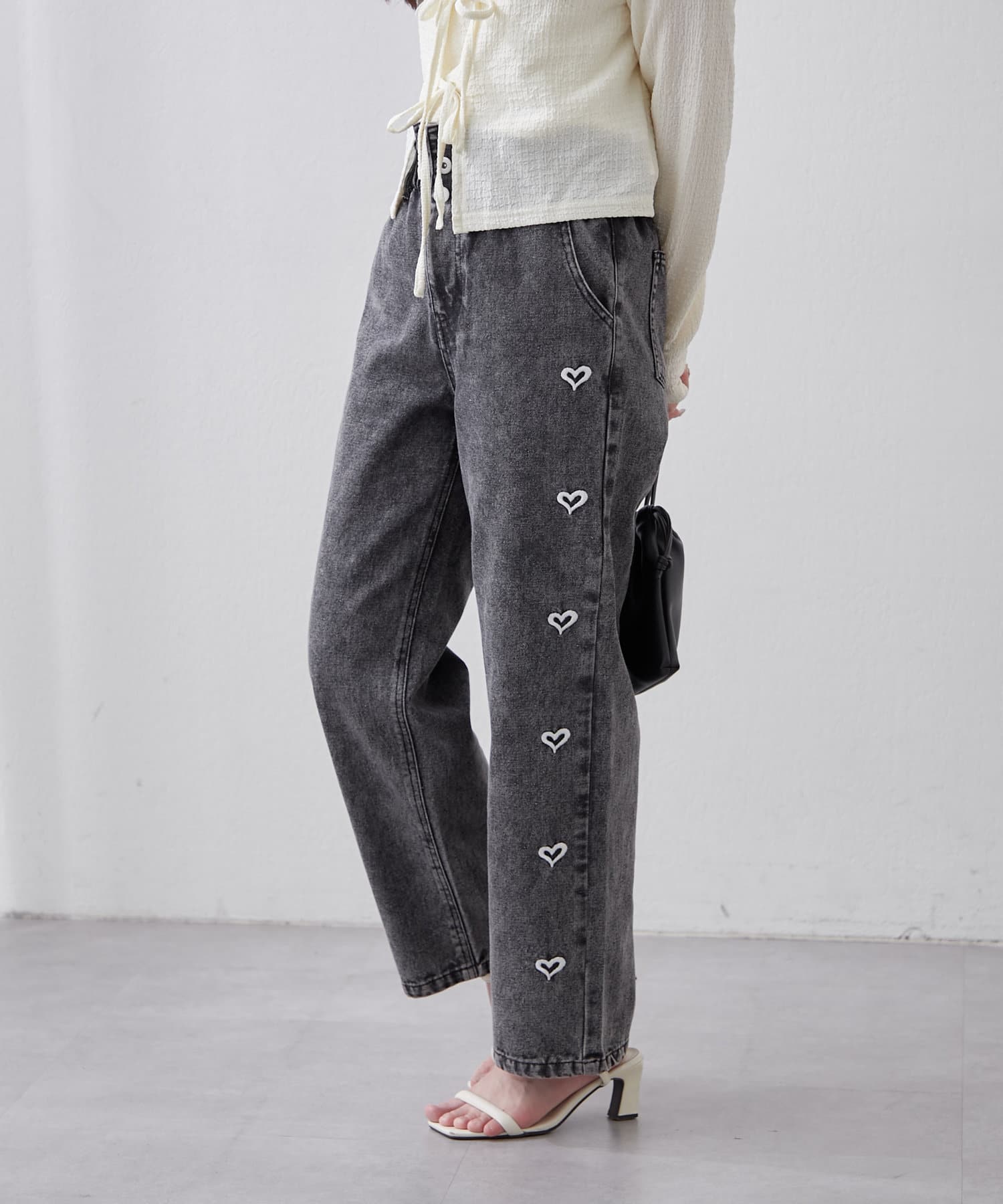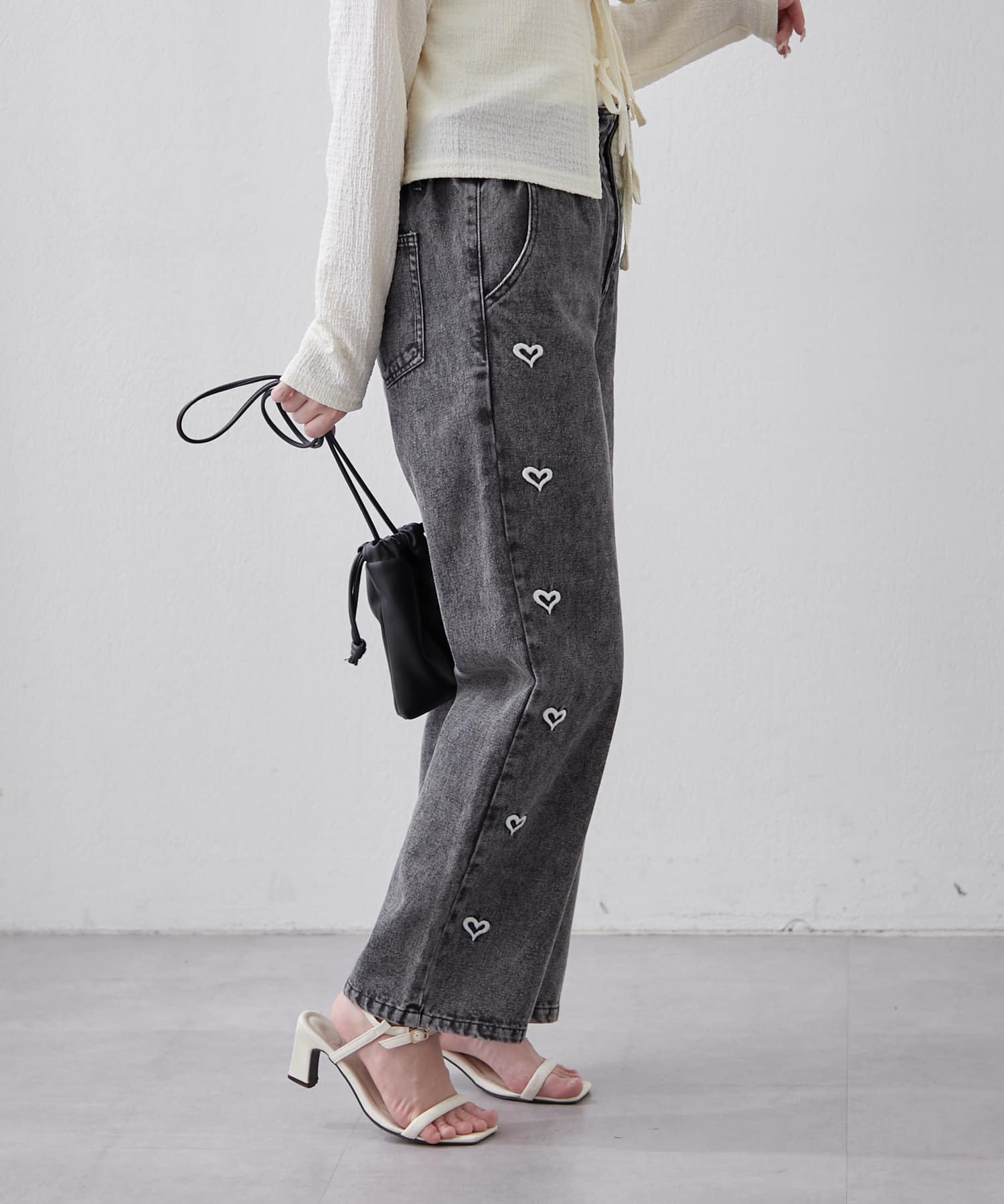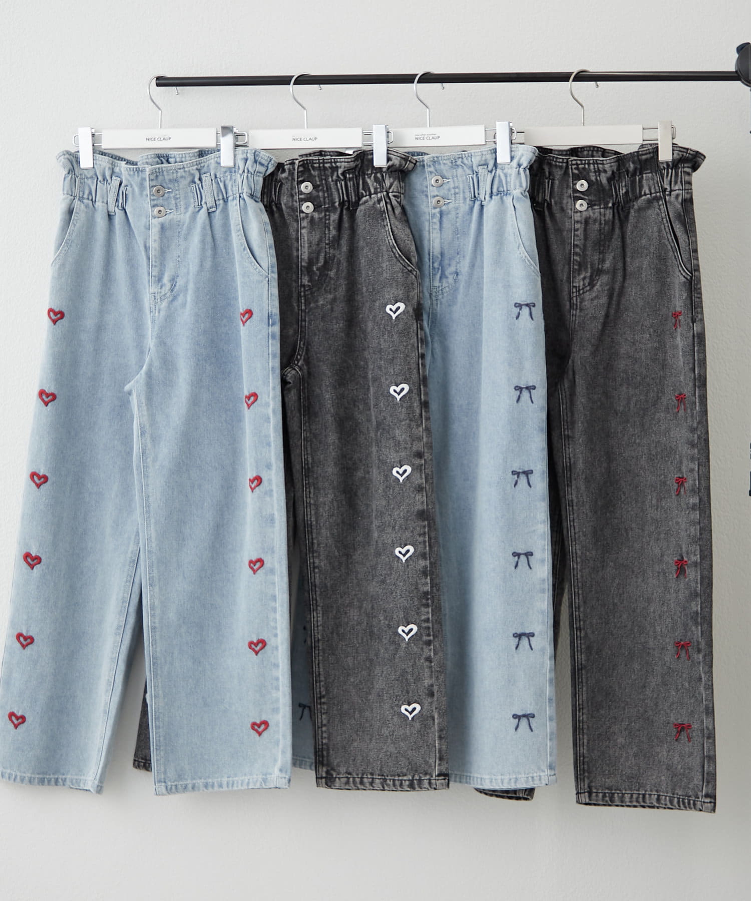 サイドにハートやリボンの刺繍が施されたデザインデニム。