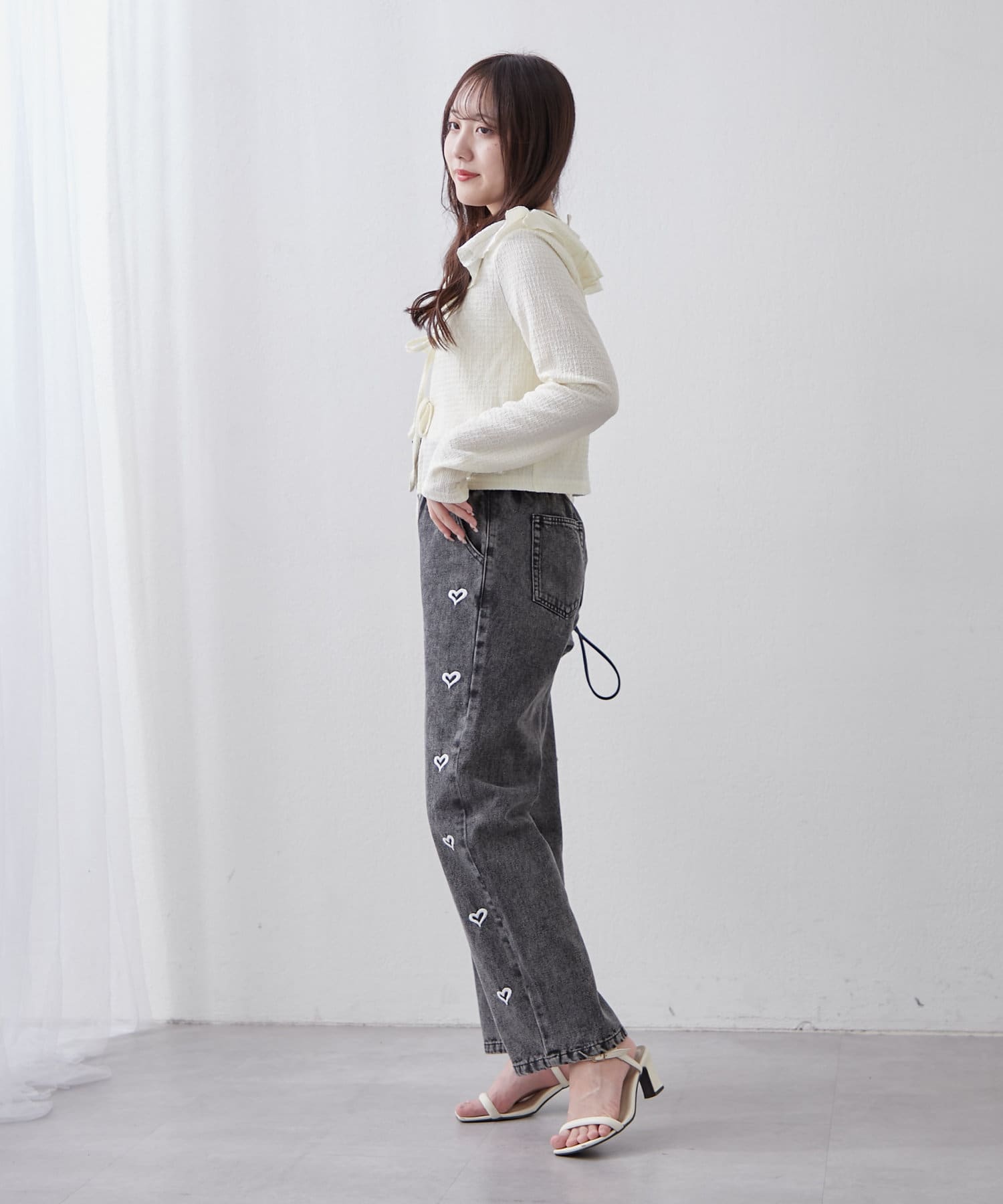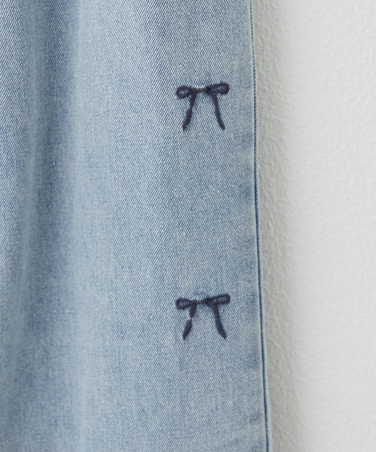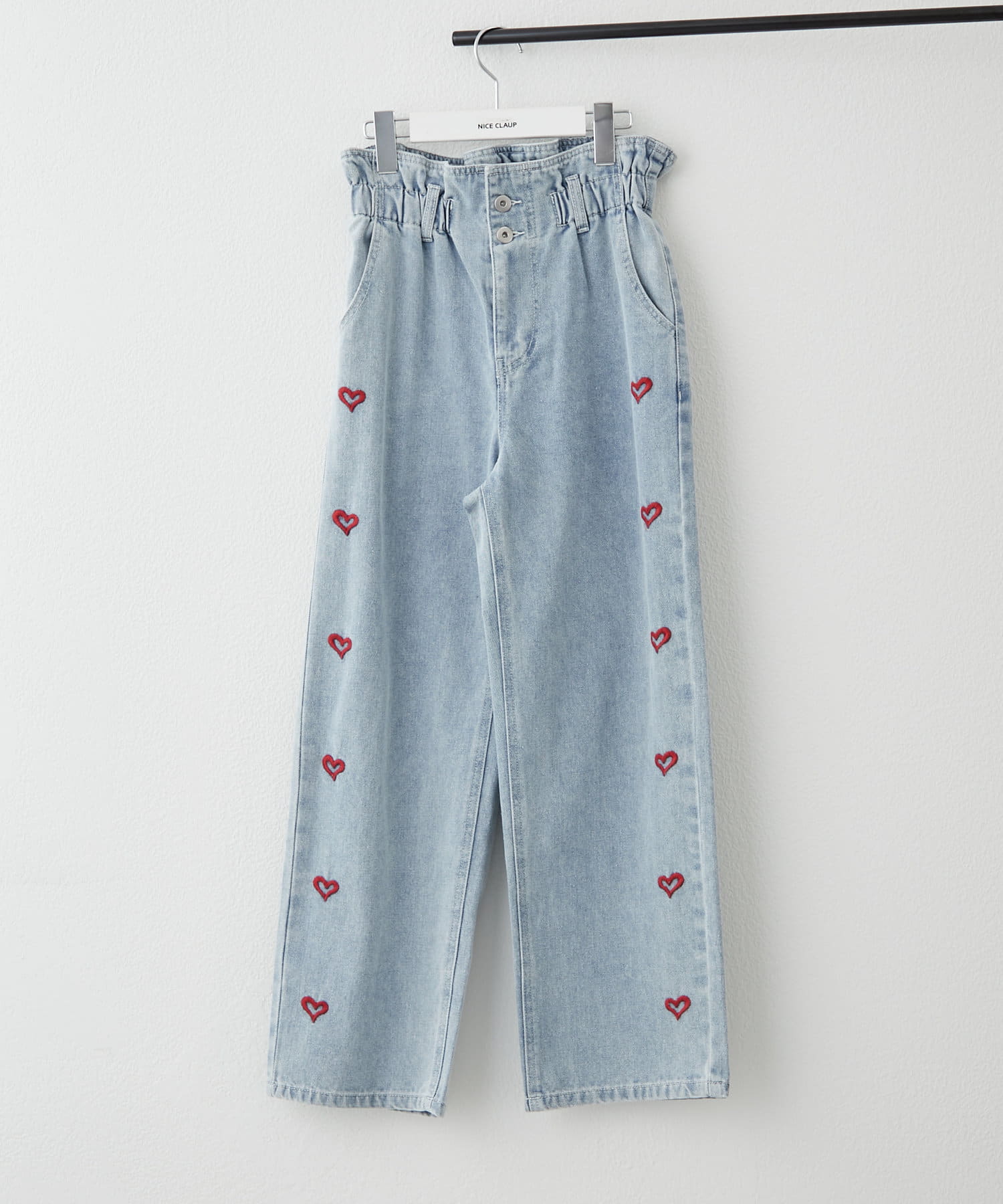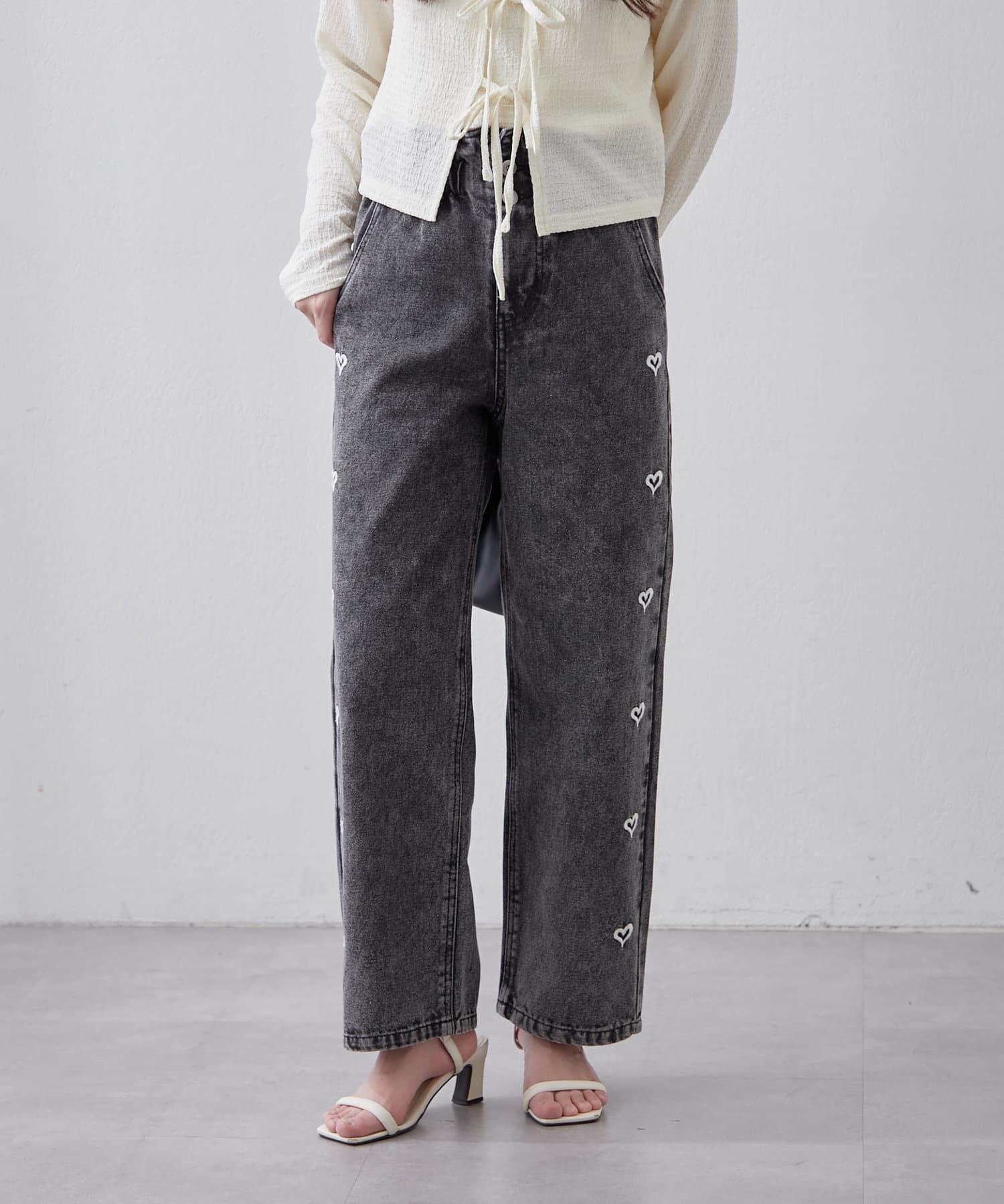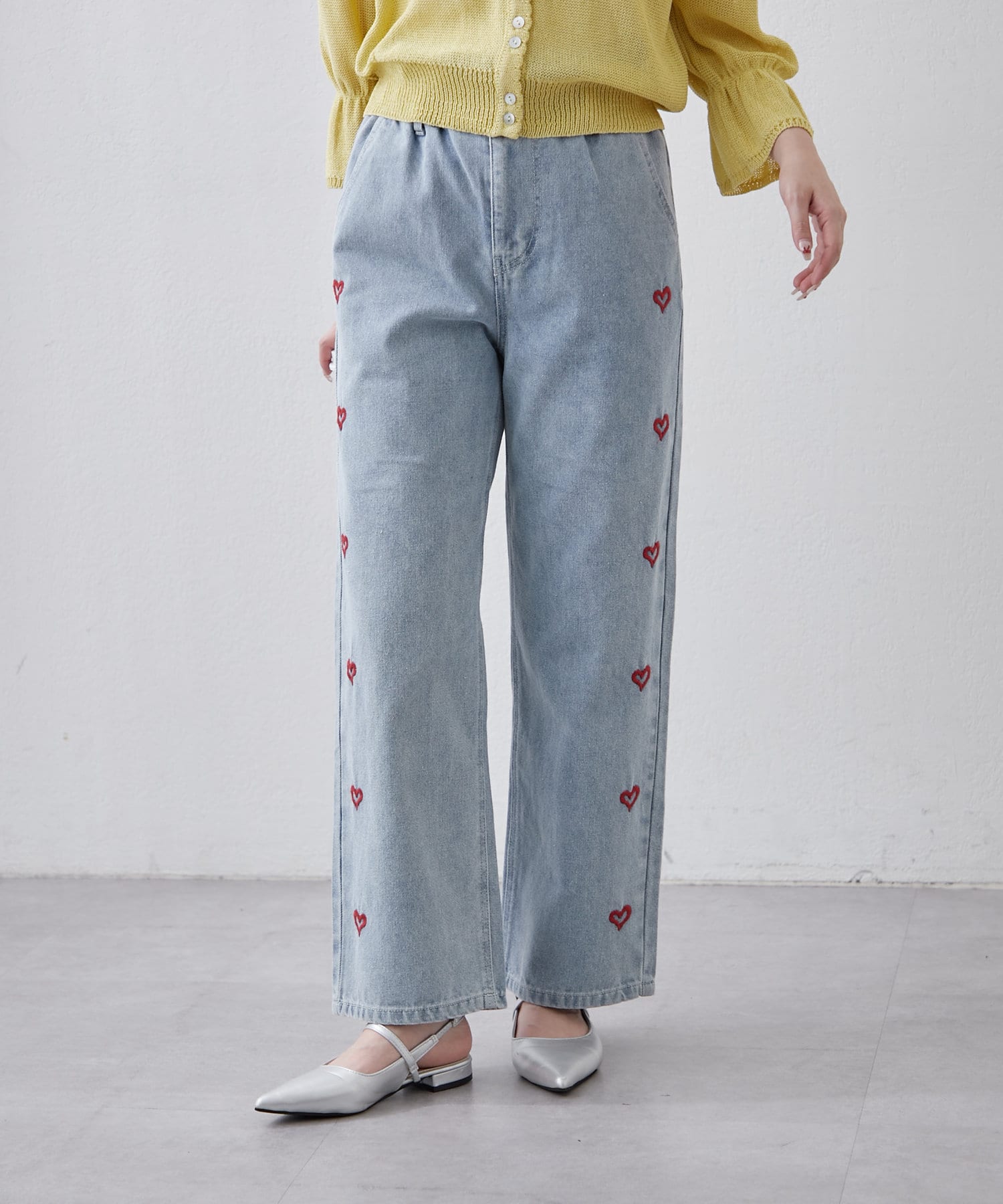 サイドにハートやリボンの刺繍が施されたデザインデニム。