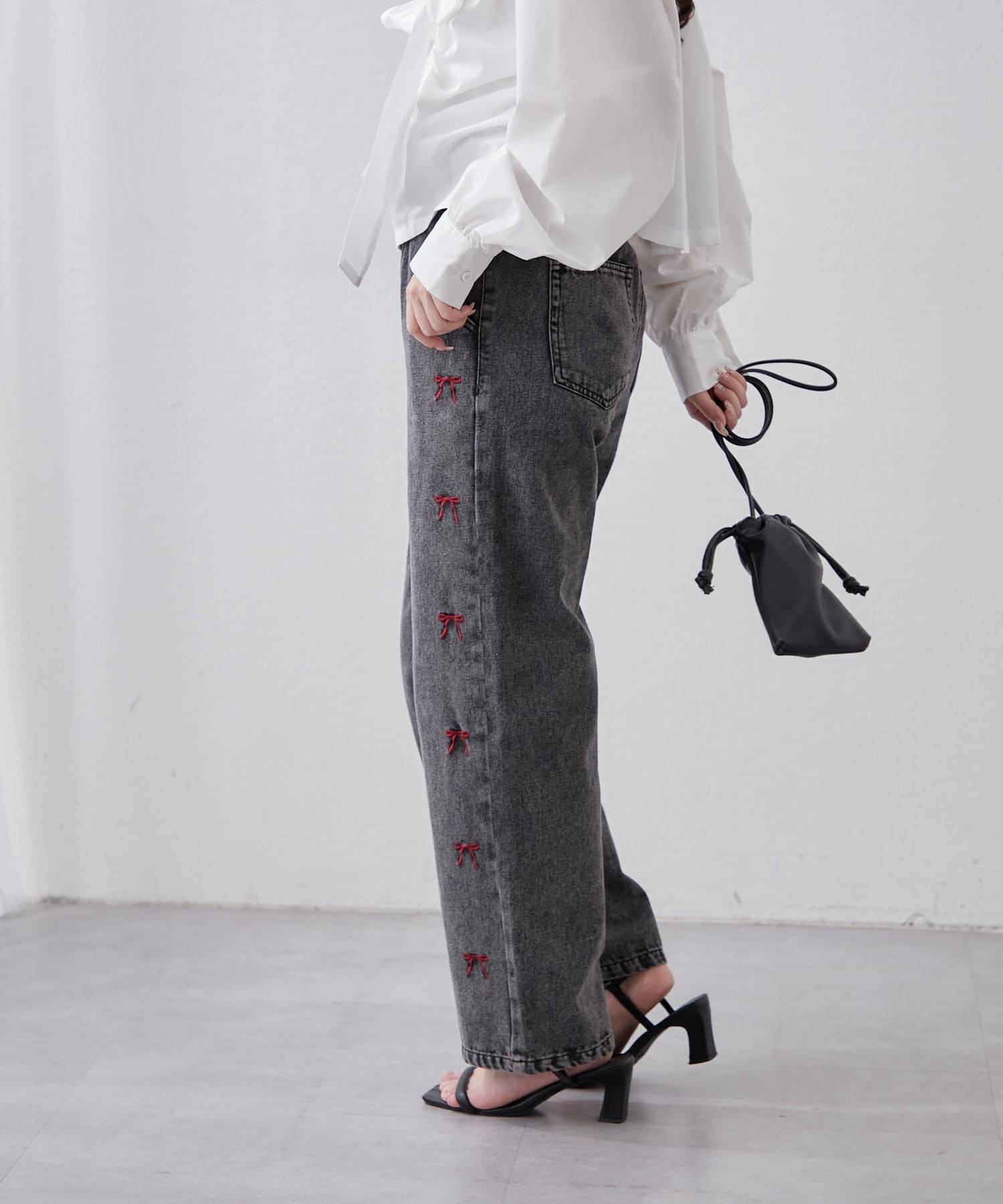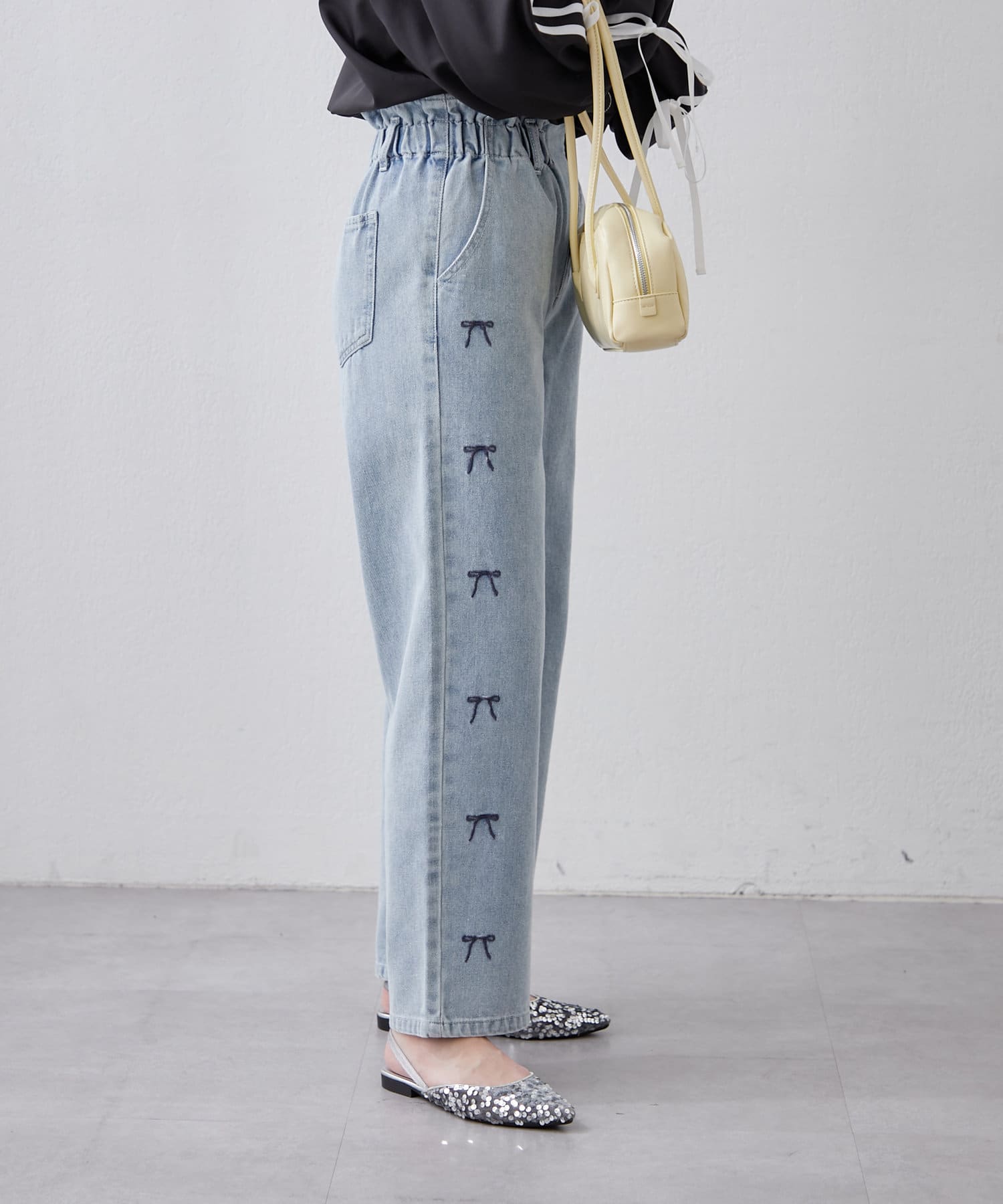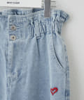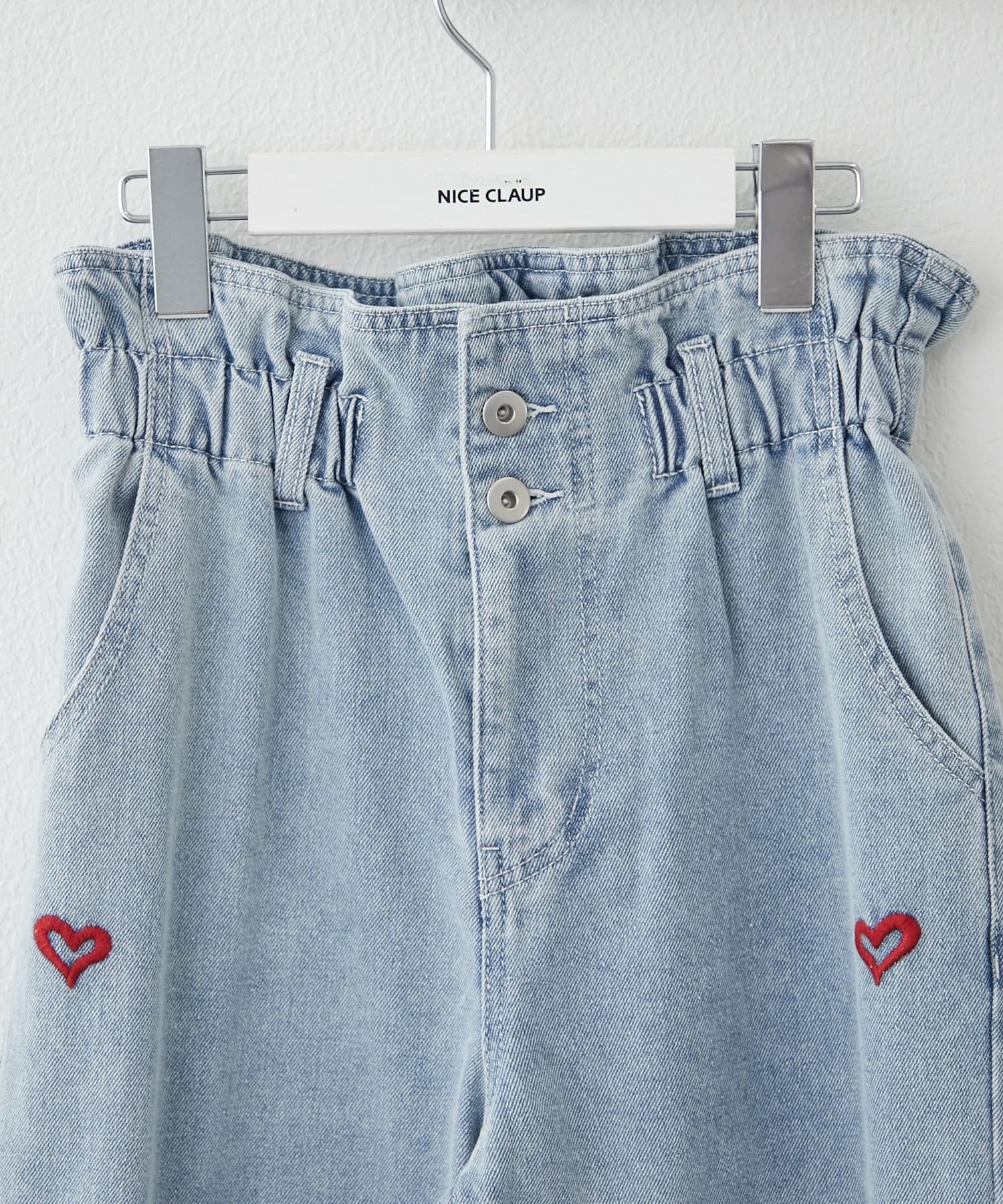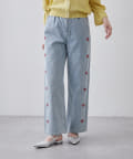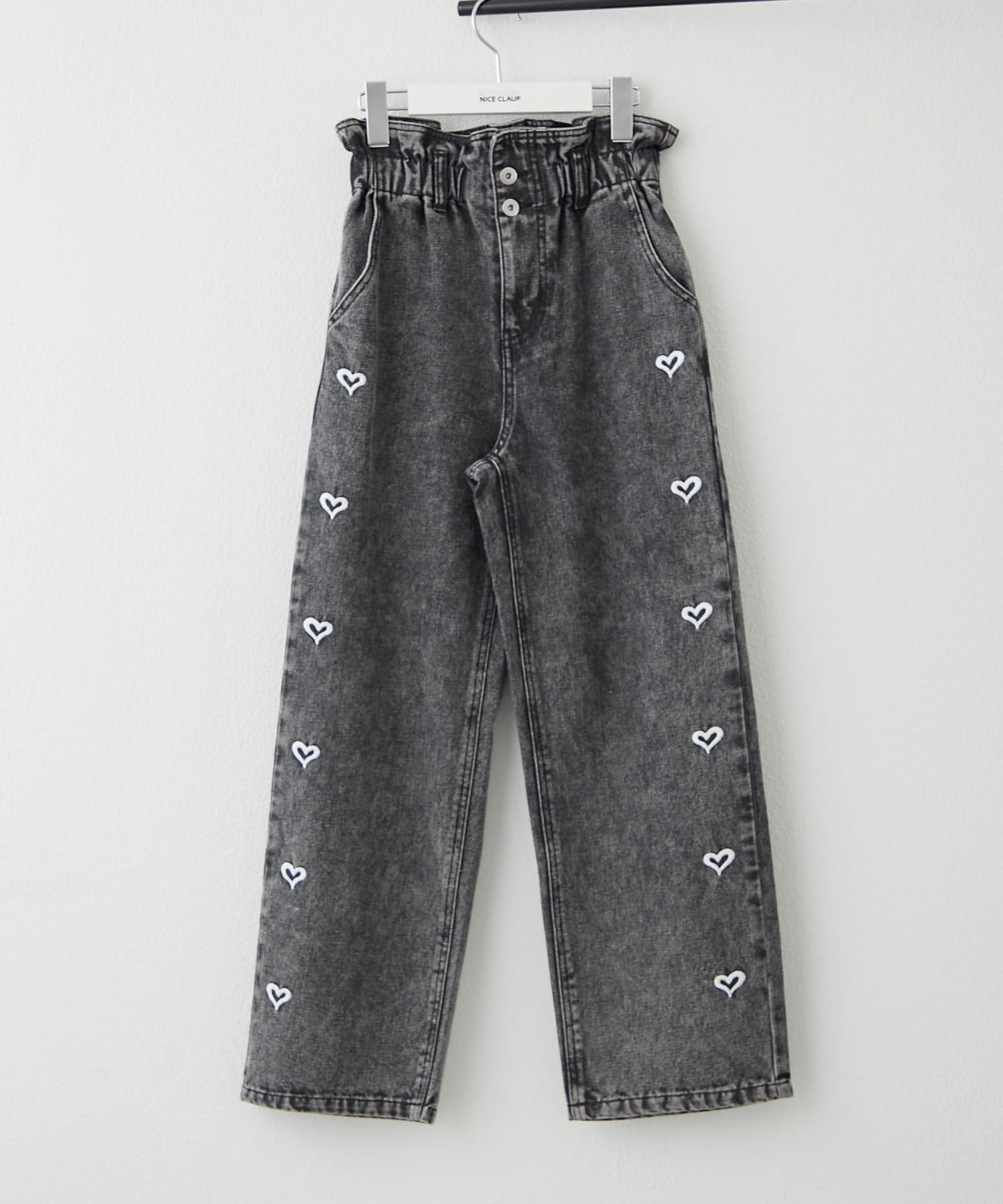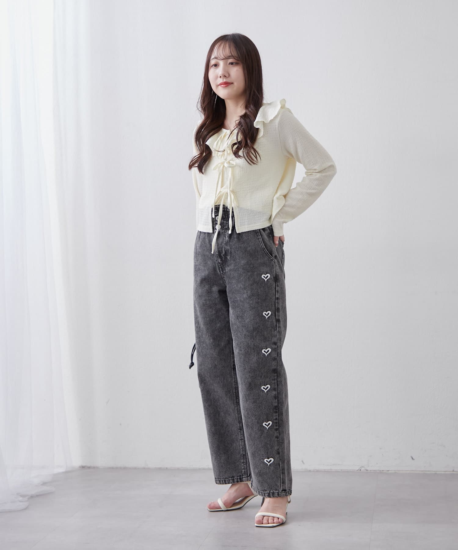 サイドにハートやリボンの刺繍が施されたデザインデニム。