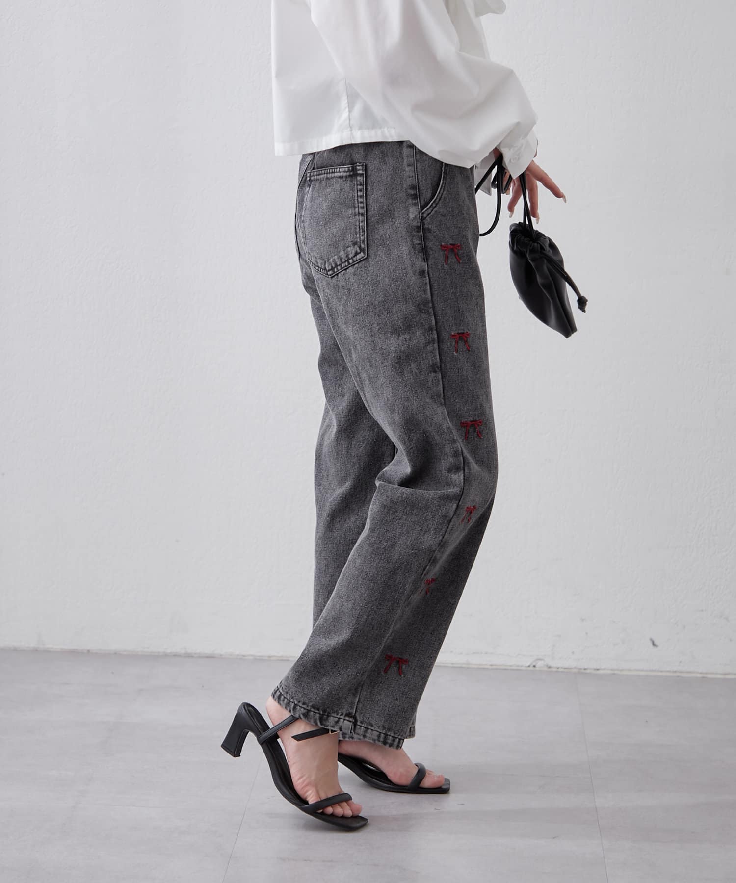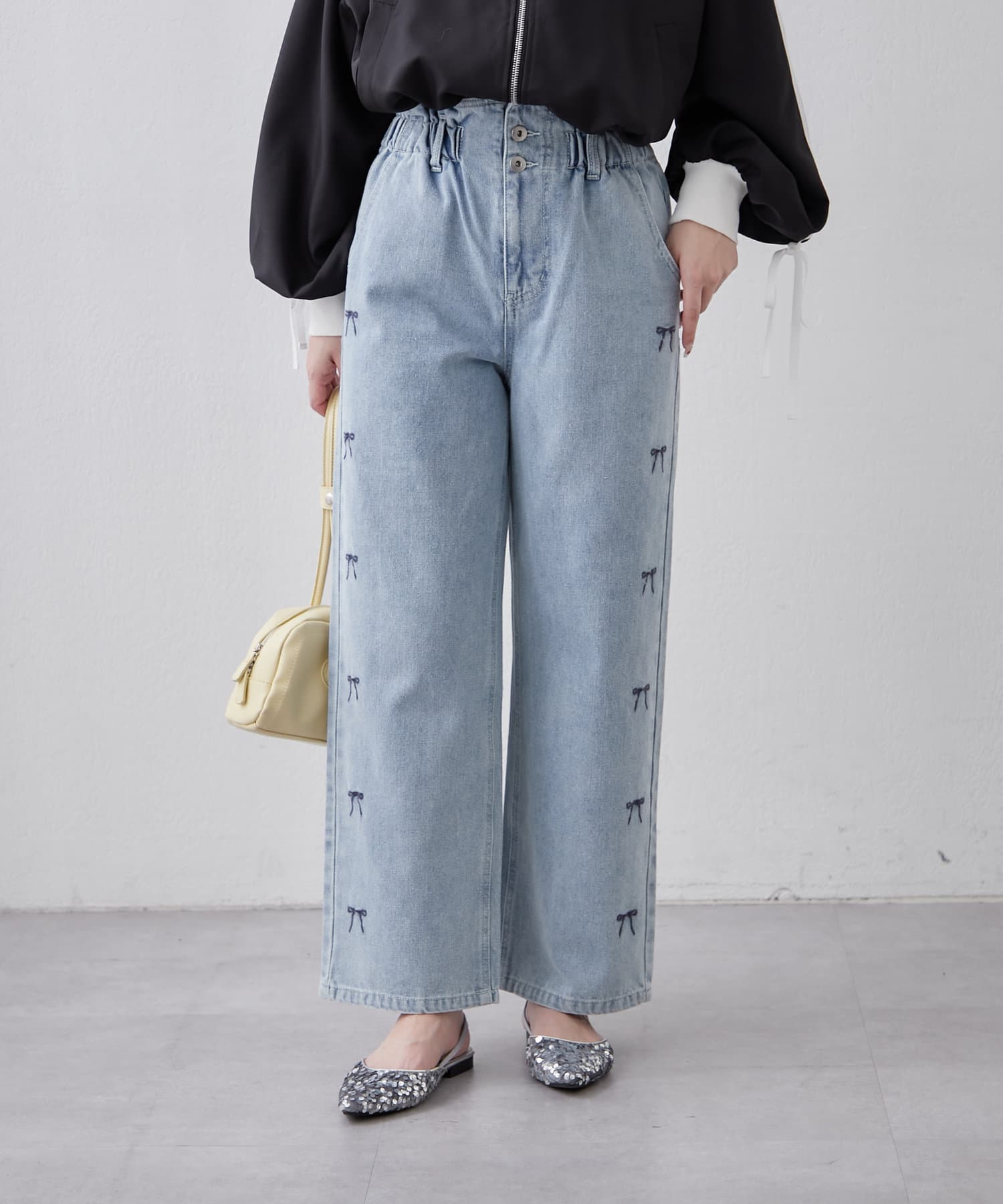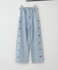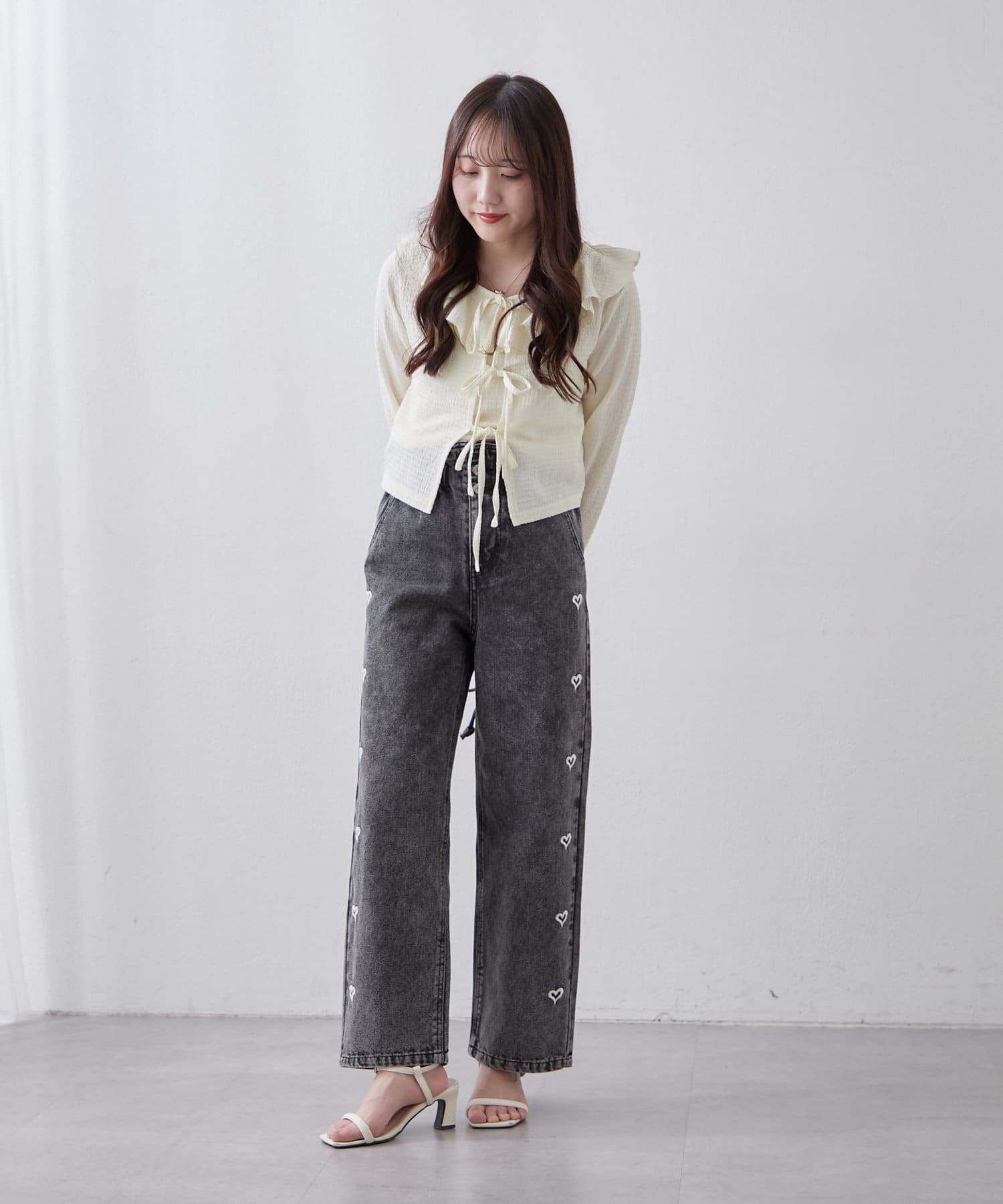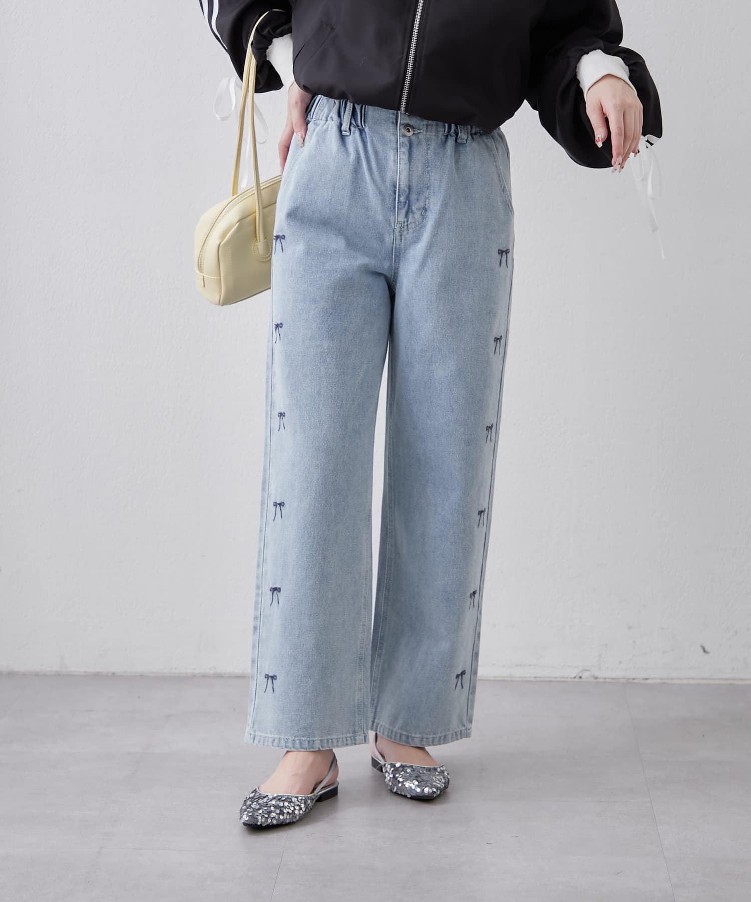 サイドにハートやリボンの刺繍が施されたデザインデニム。