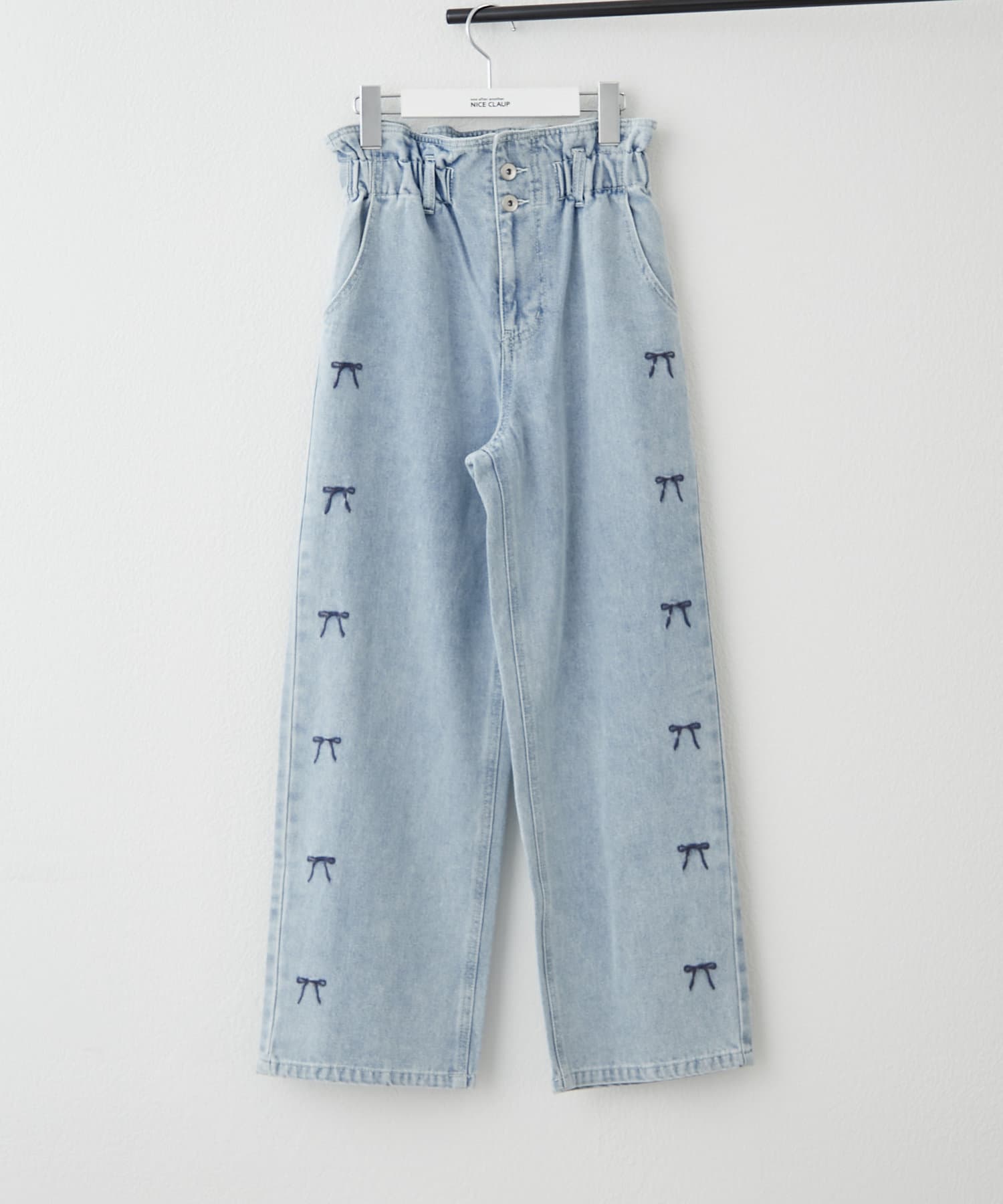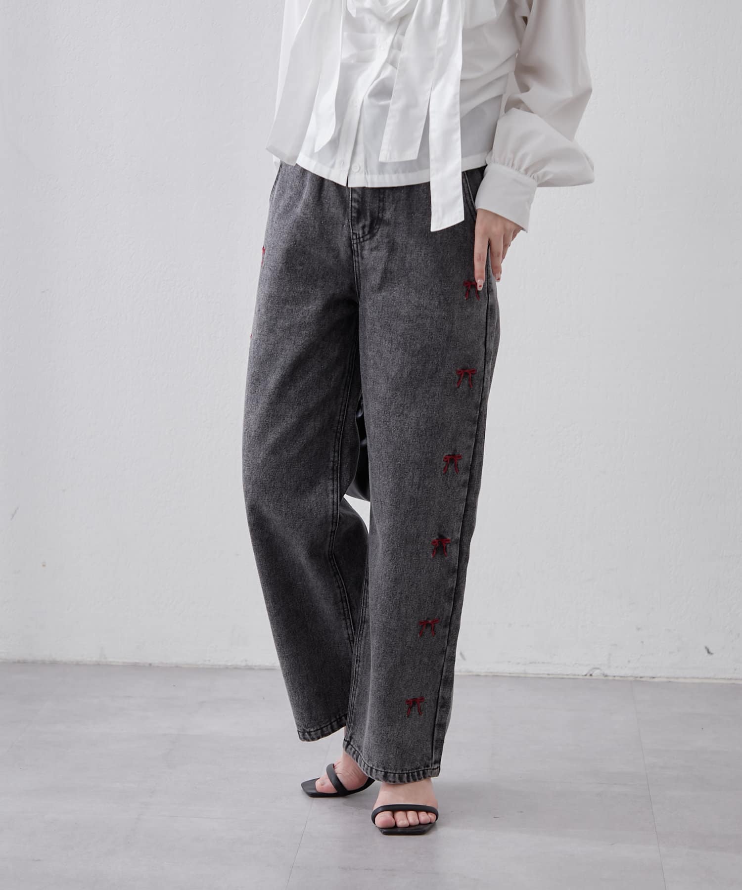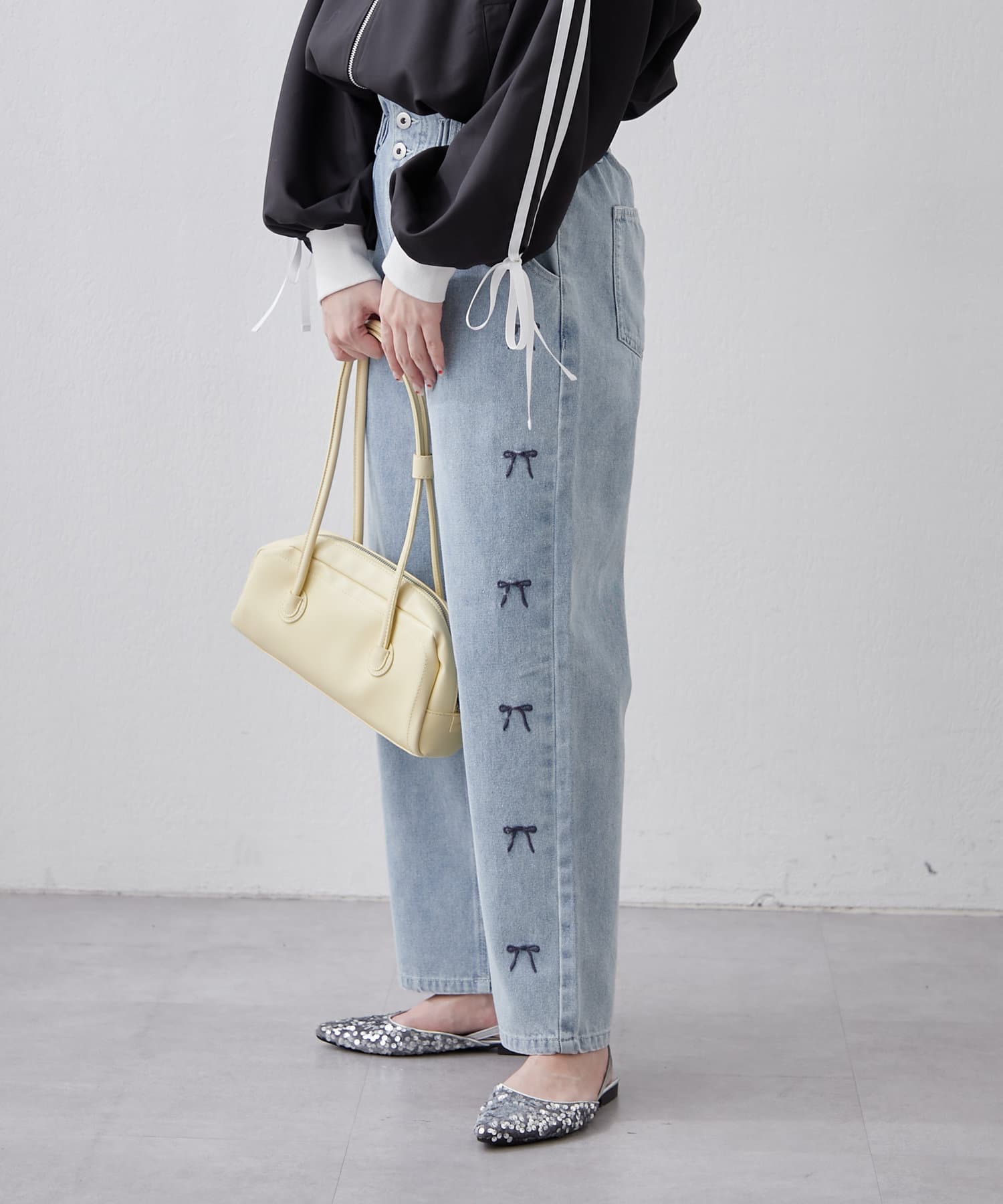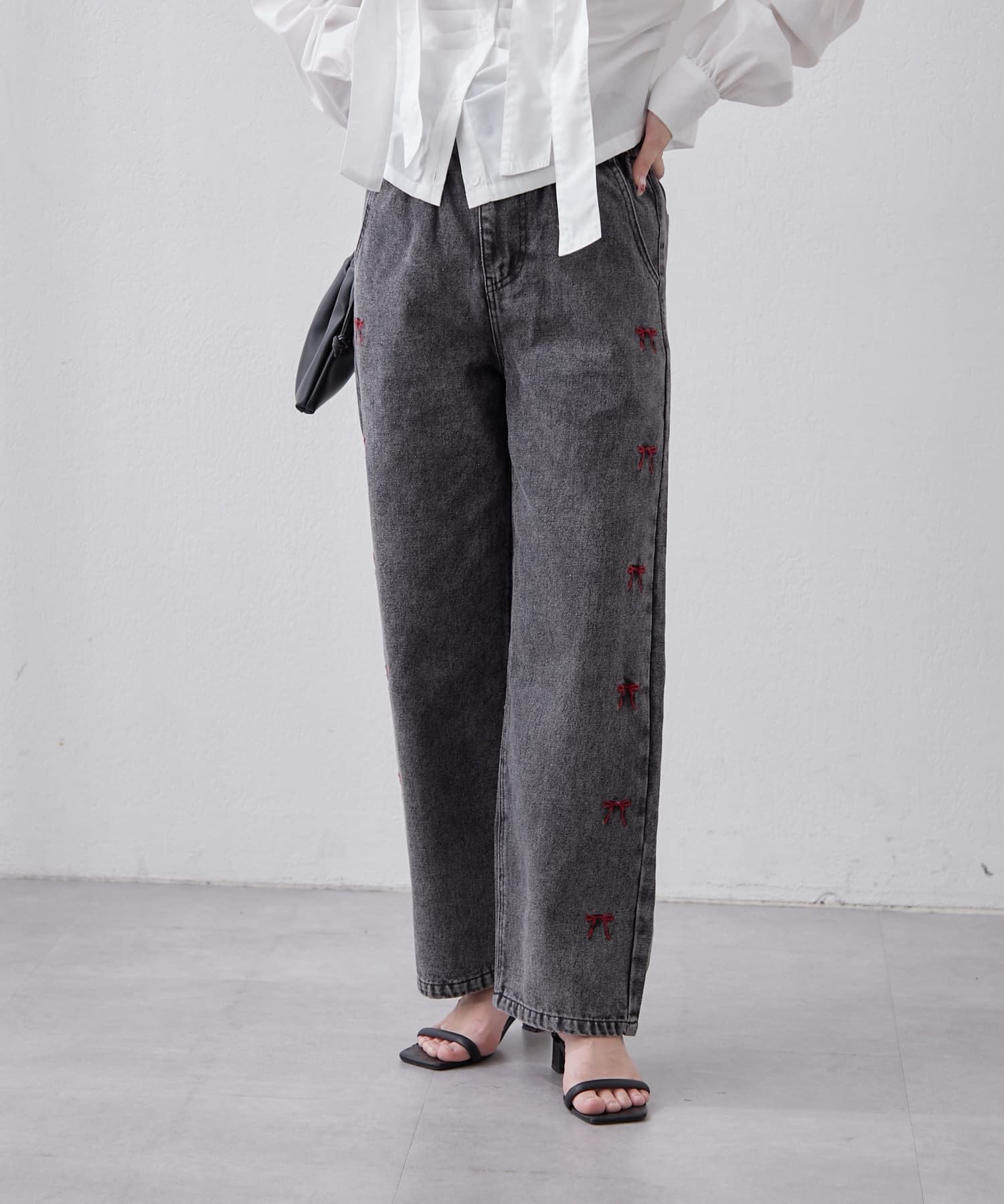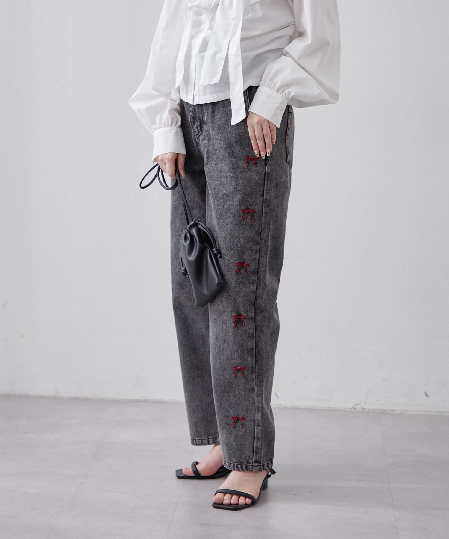 サイドにハートやリボンの刺繍が施されたデザインデニム。