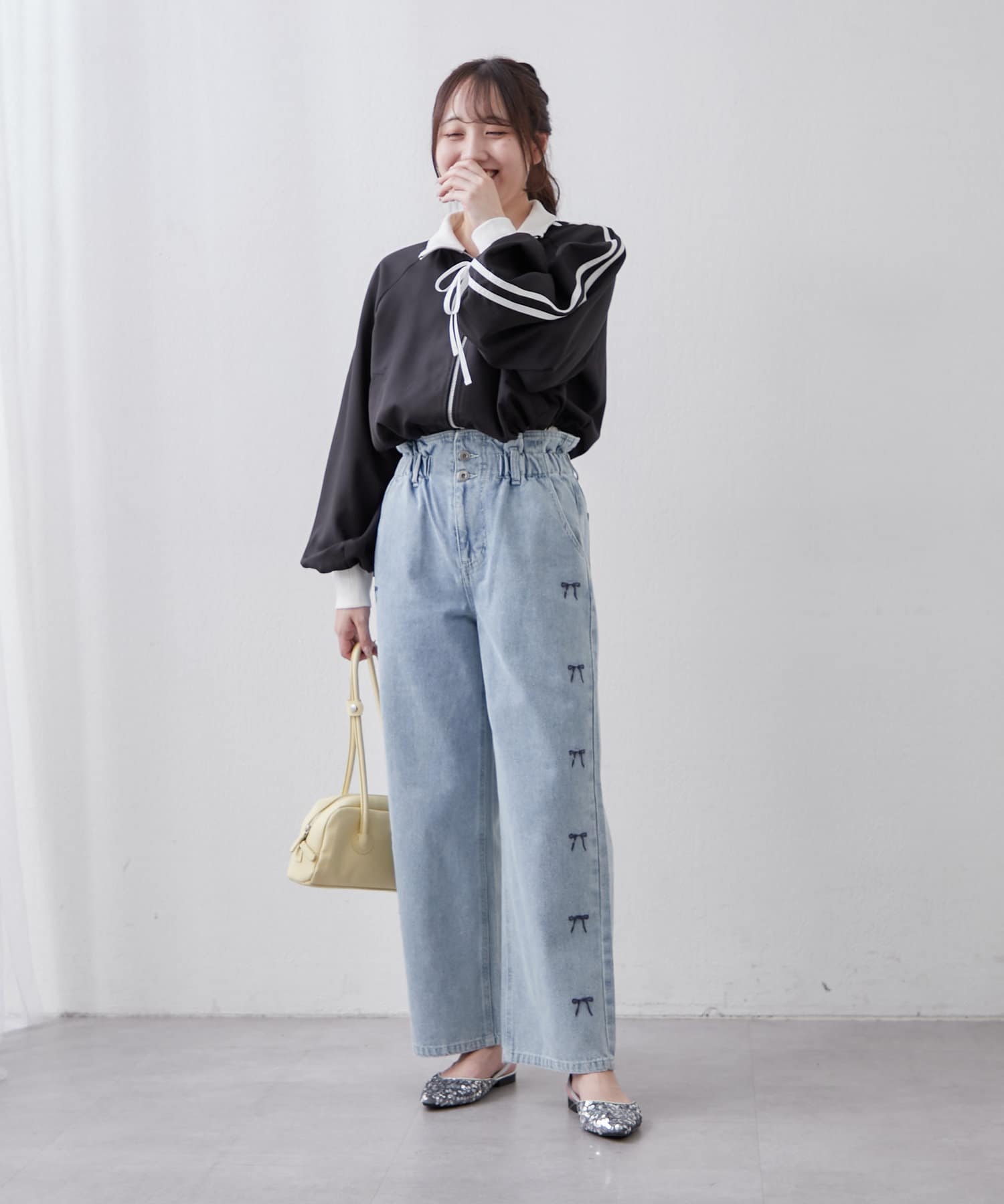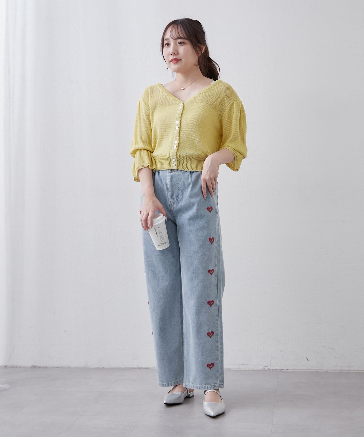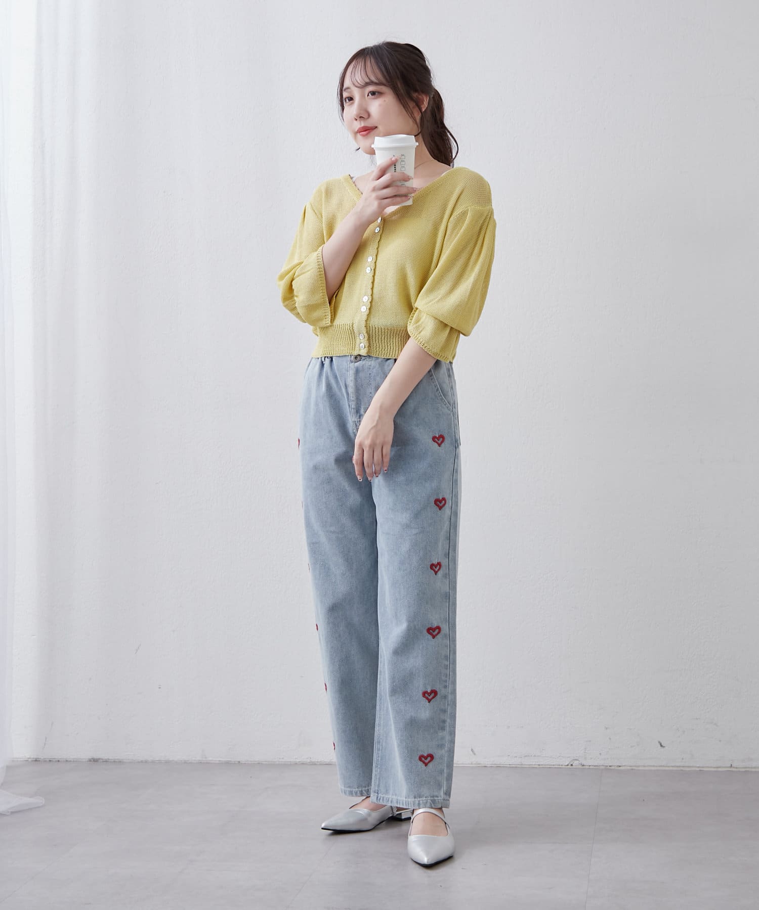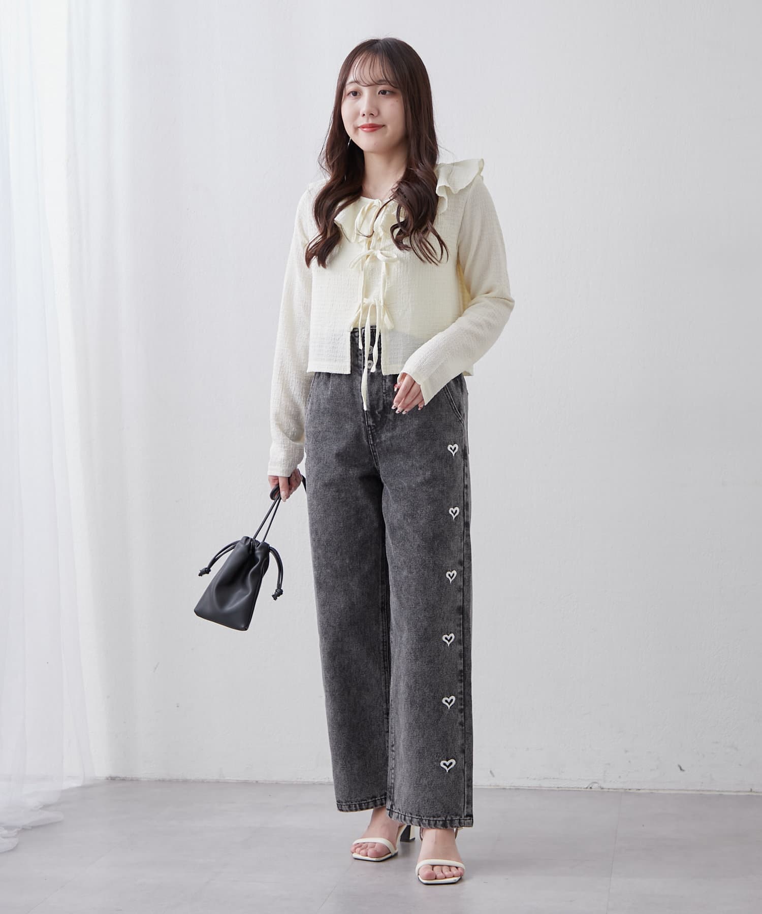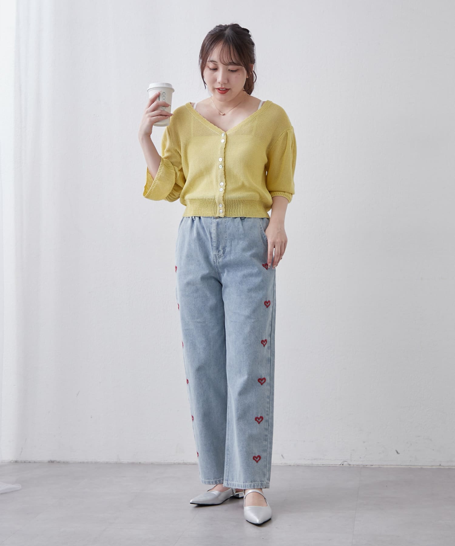 サイドにハートやリボンの刺繍が施されたデザインデニム。