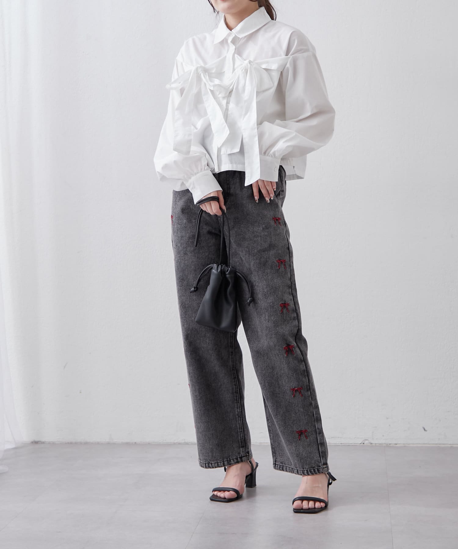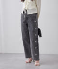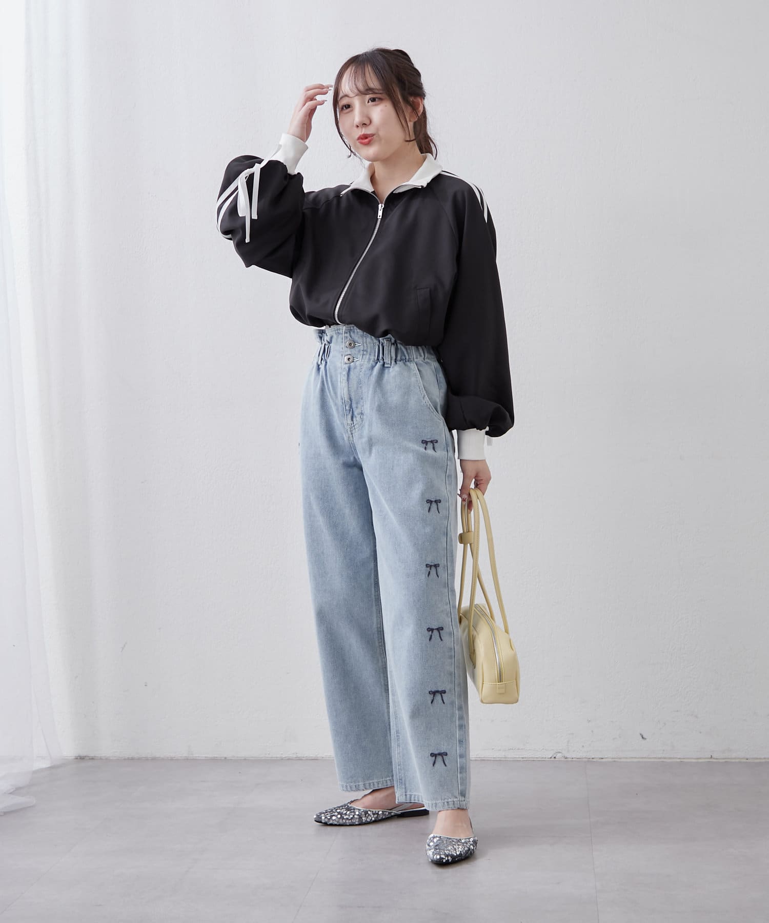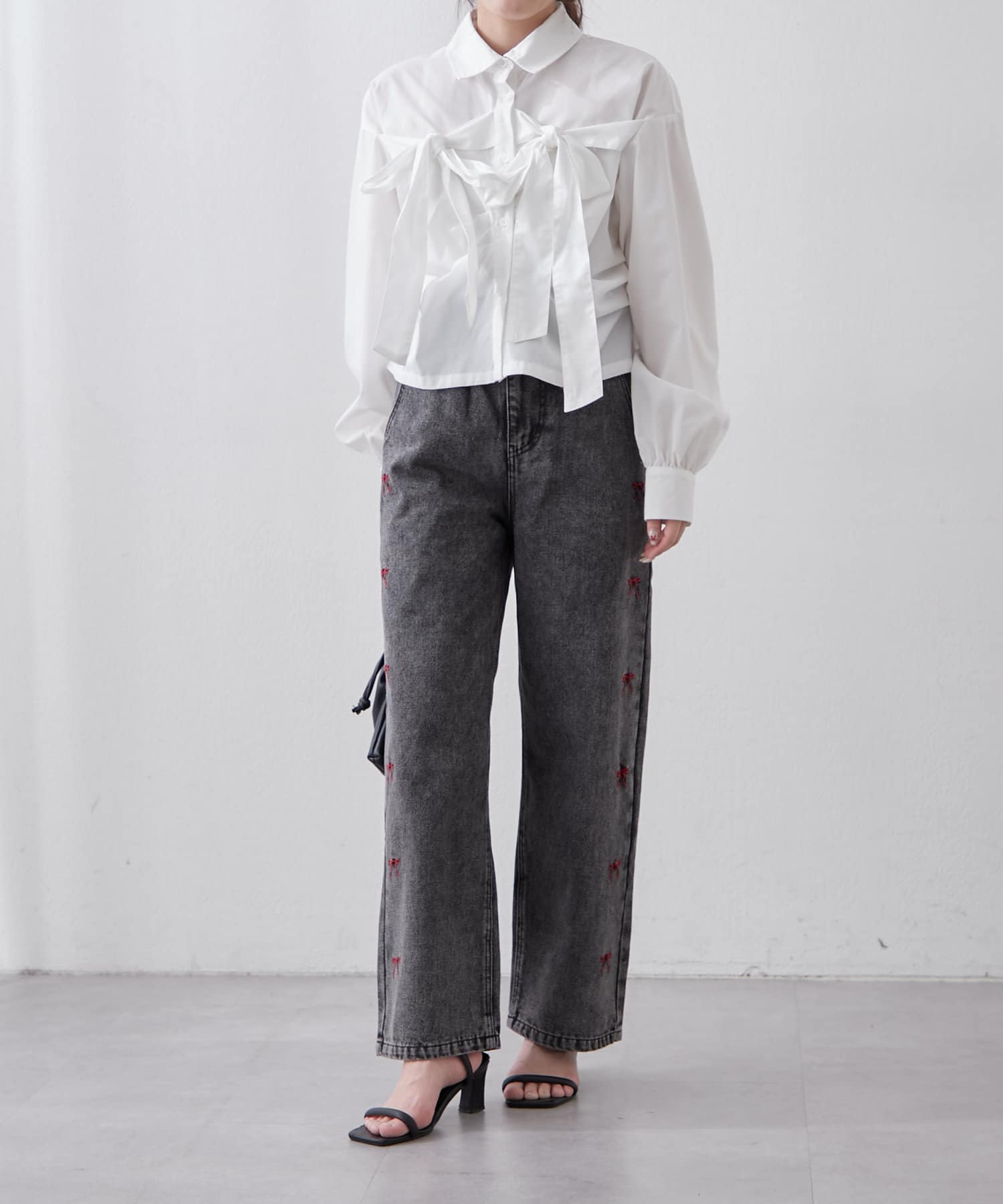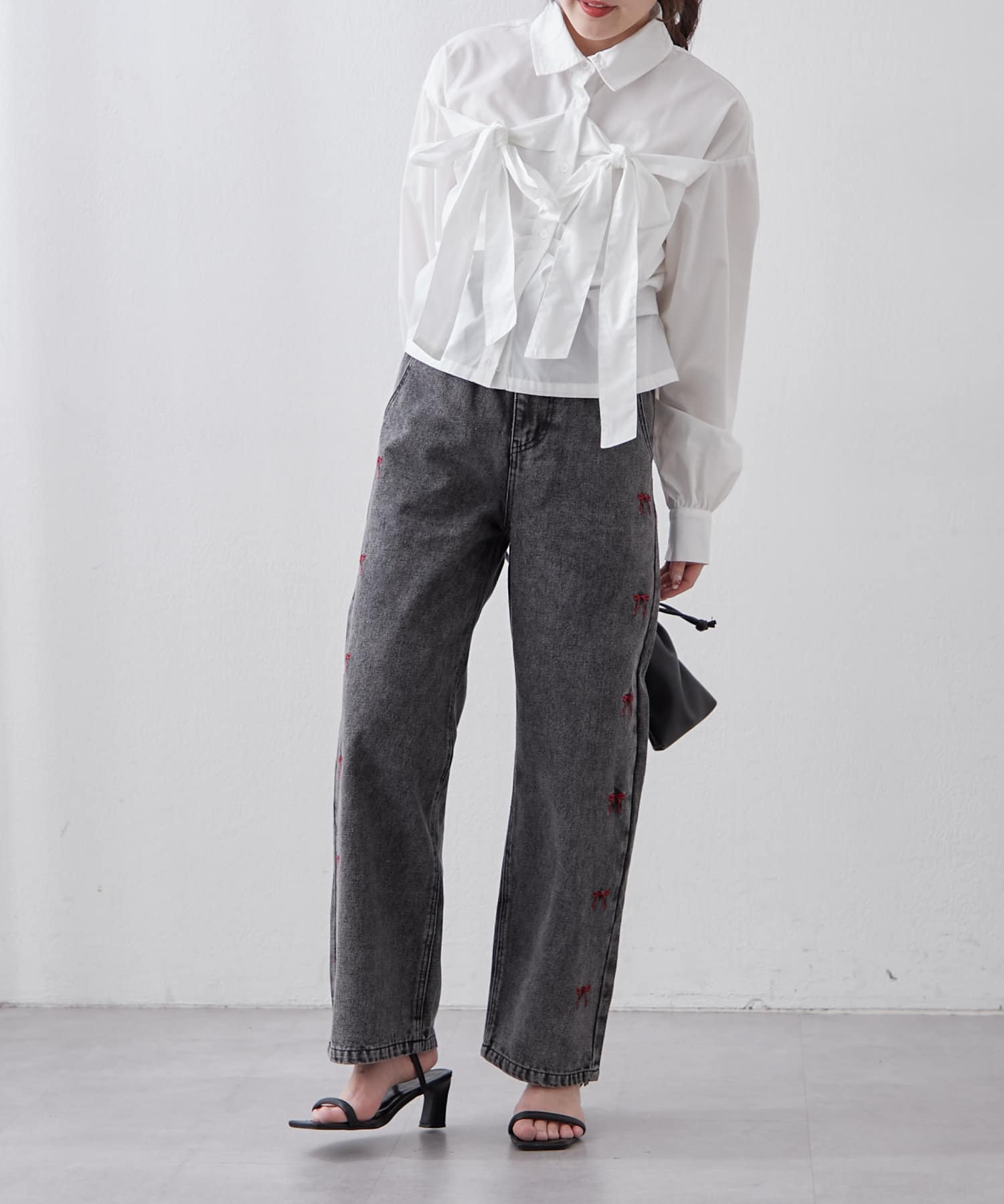 サイドにハートやリボンの刺繍が施されたデザインデニム。