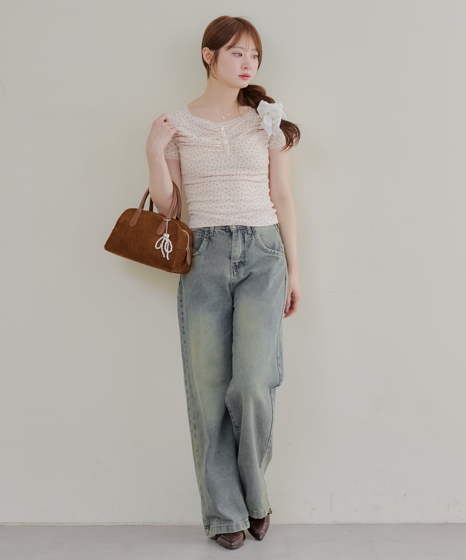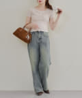 ・ブラウスやシアートップスを合わせるとフェミニンにも着こなせます。
