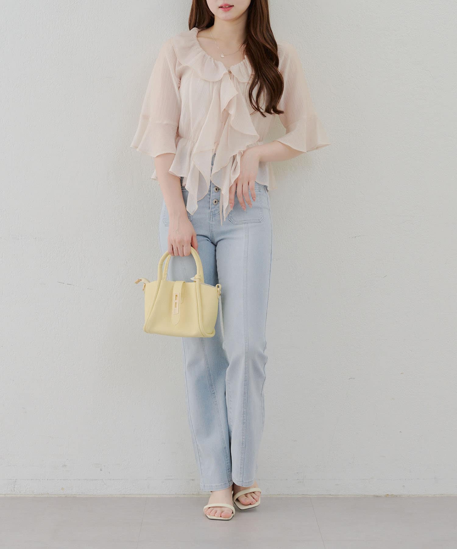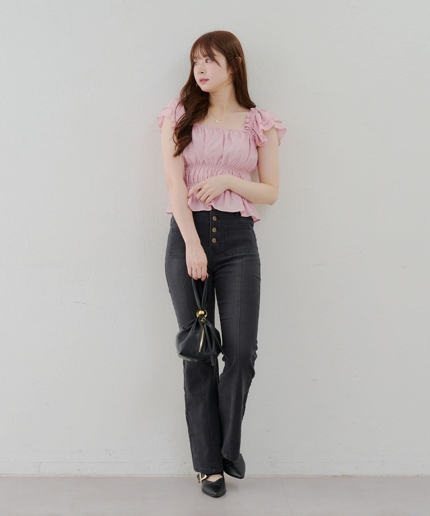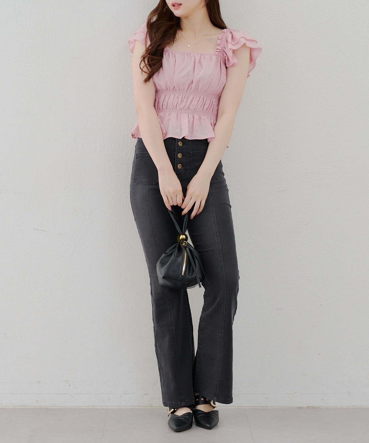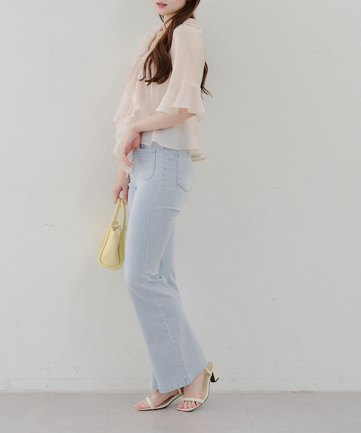 ・脚を長く見せる、ハイウエストデニムパンツ。さらにフレアラインで美脚見え!