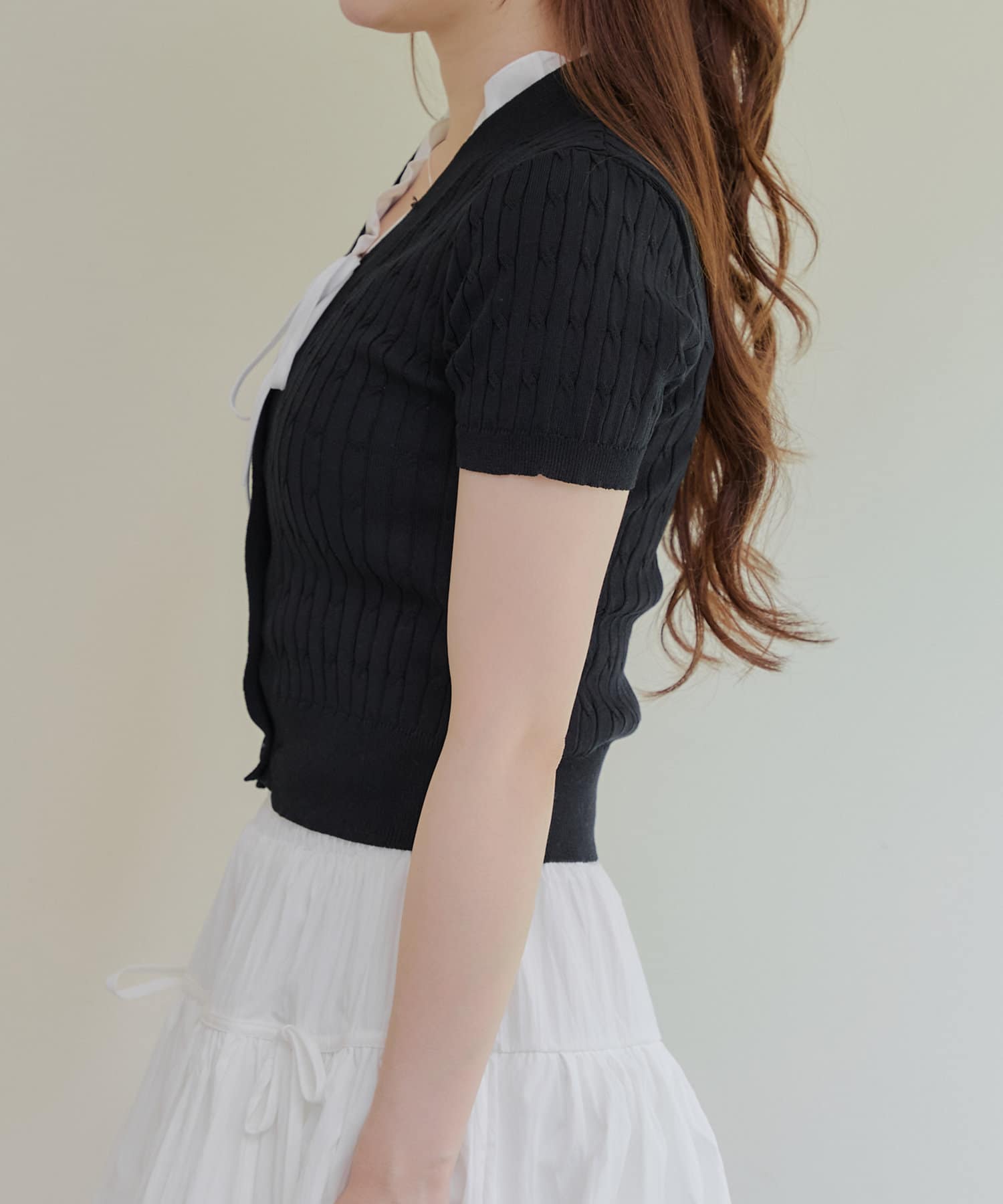・ちらりと覗くレースが可愛いケーブルニットカーディガン