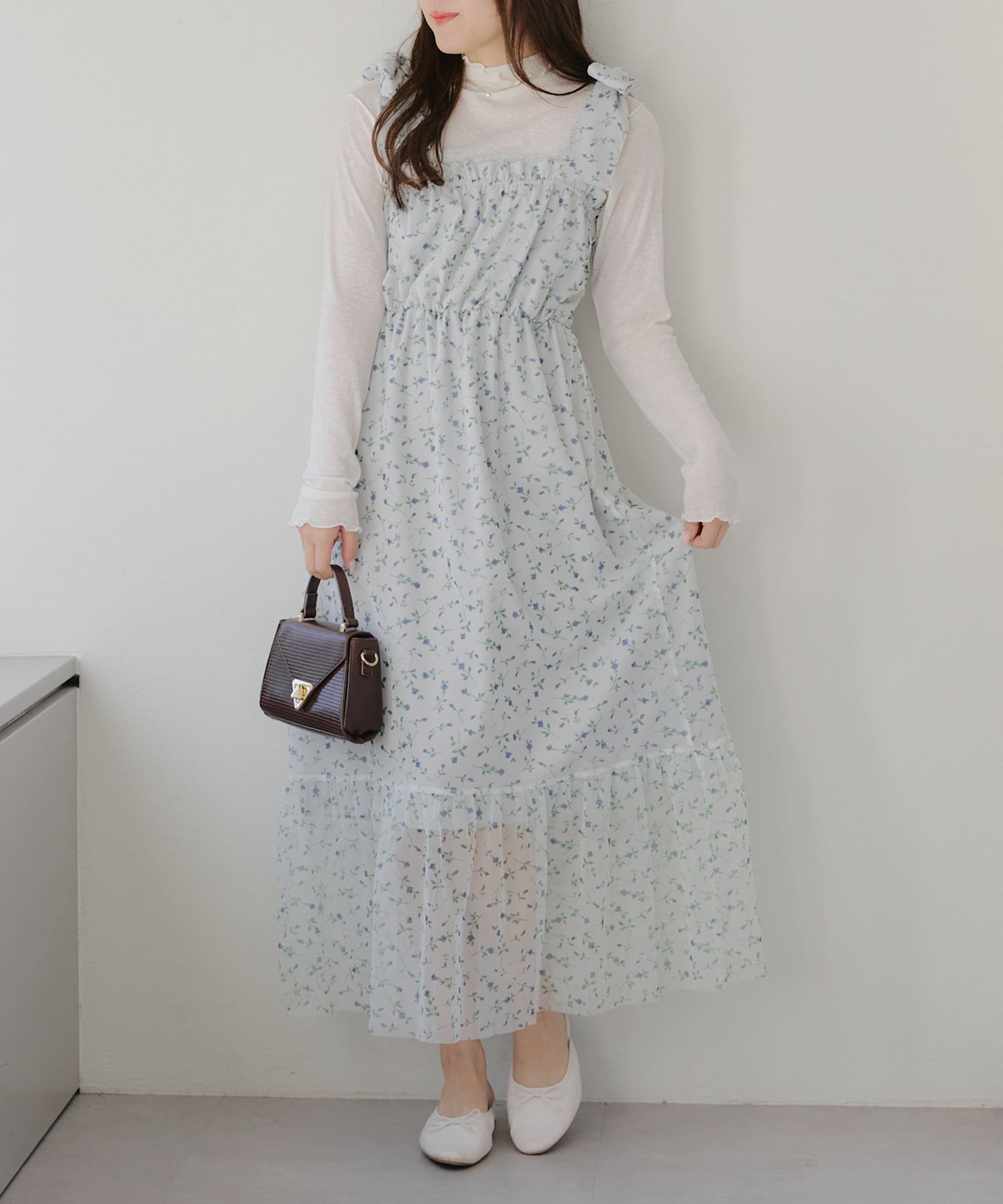 1枚で華やかな主役級ワンピースなので、肌寒い日のインナーはシアー感のあるトップスや