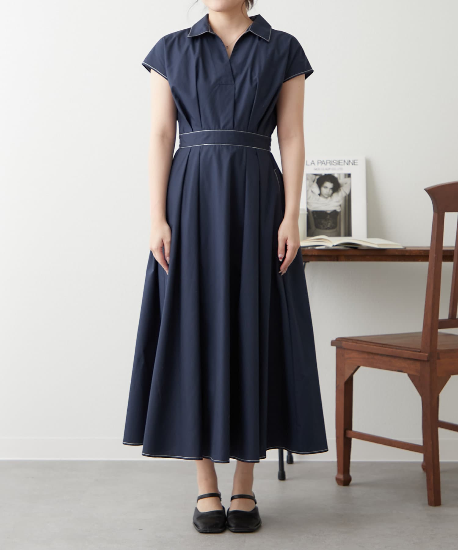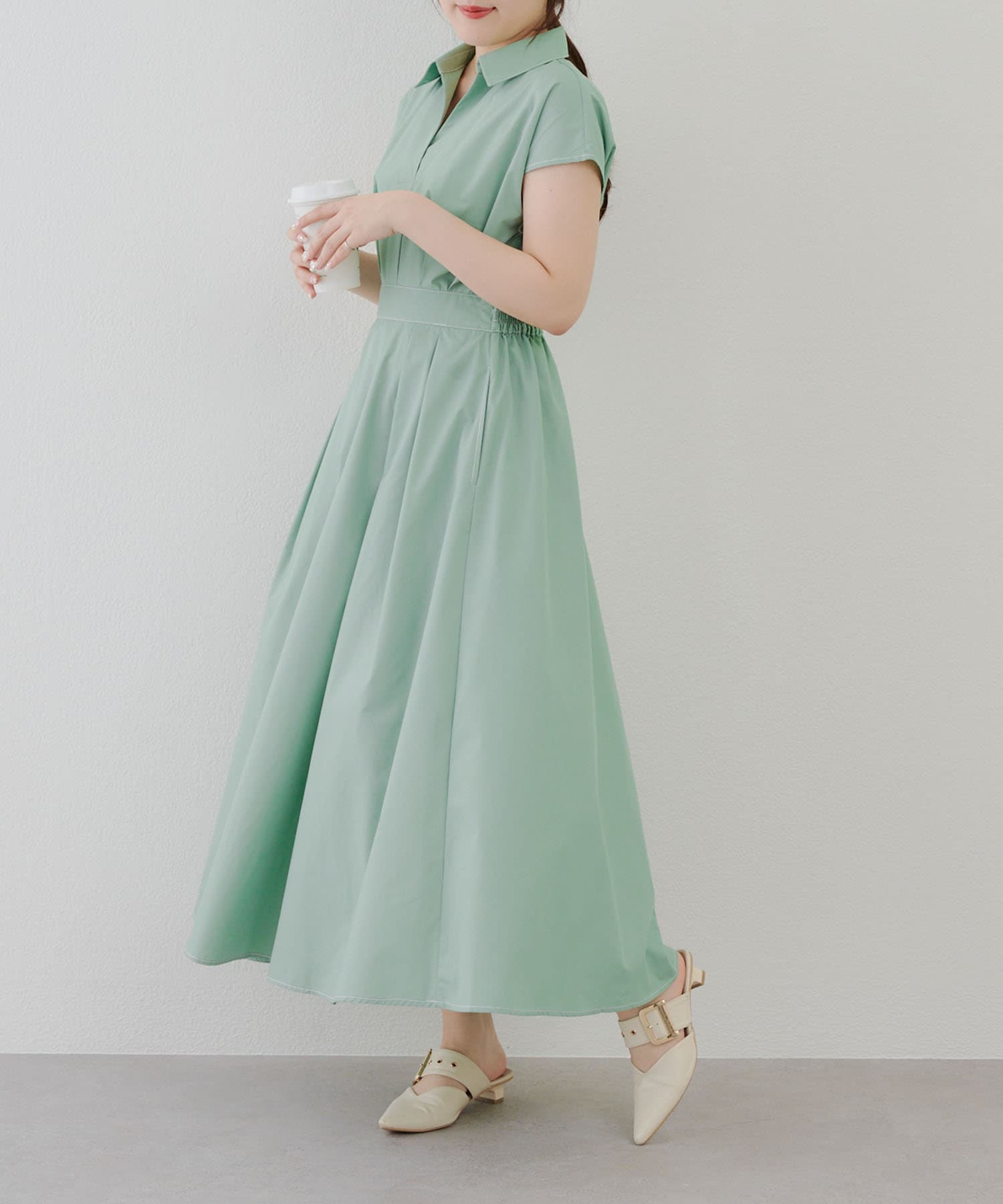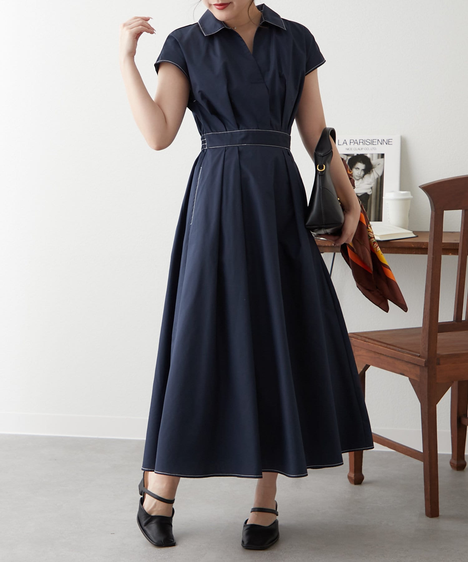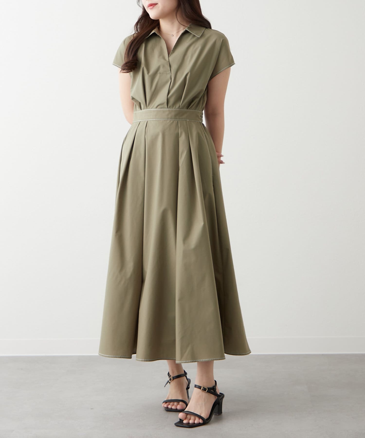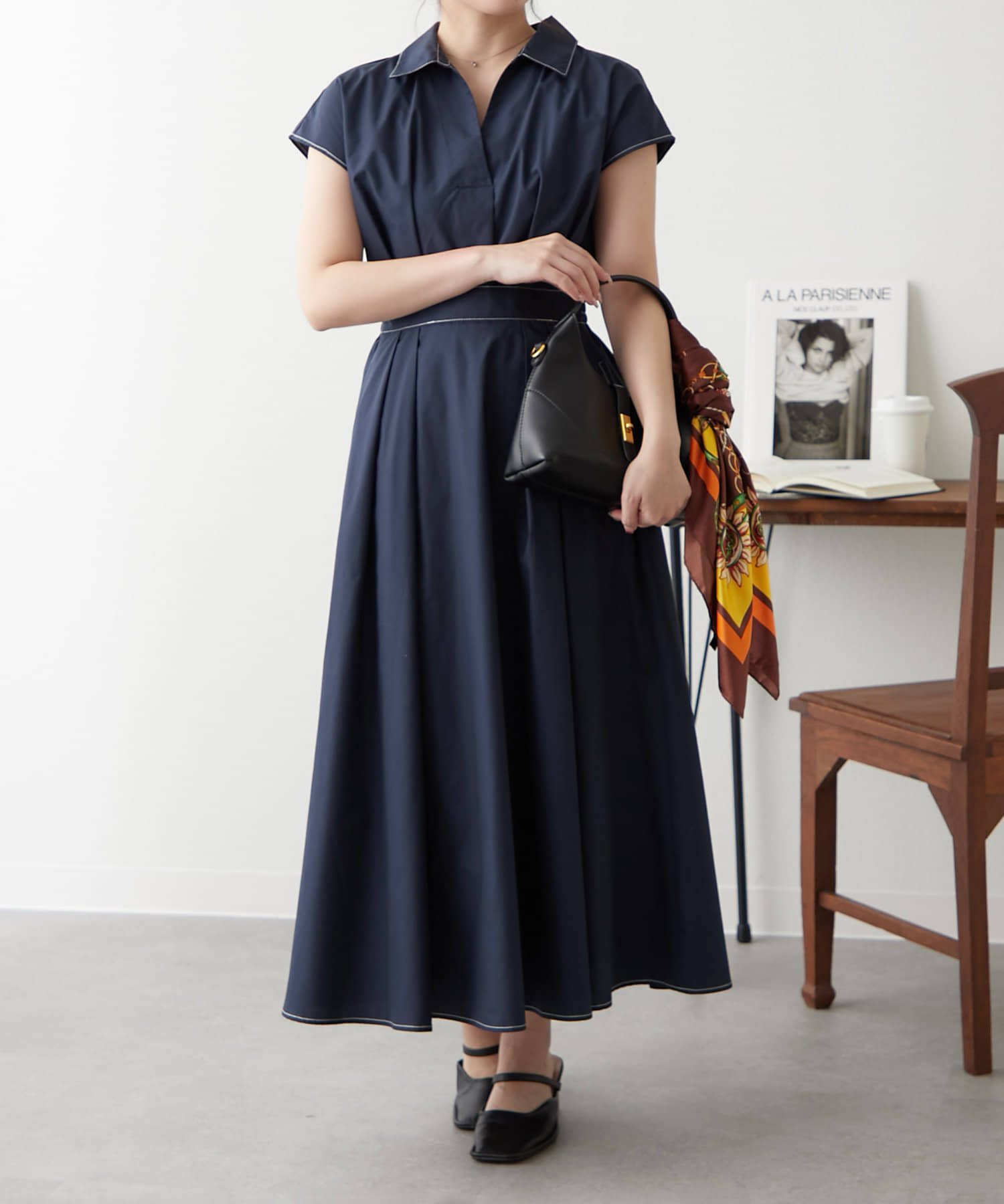・スキッパー襟が大人っぽい印象のロング丈ワンピース
