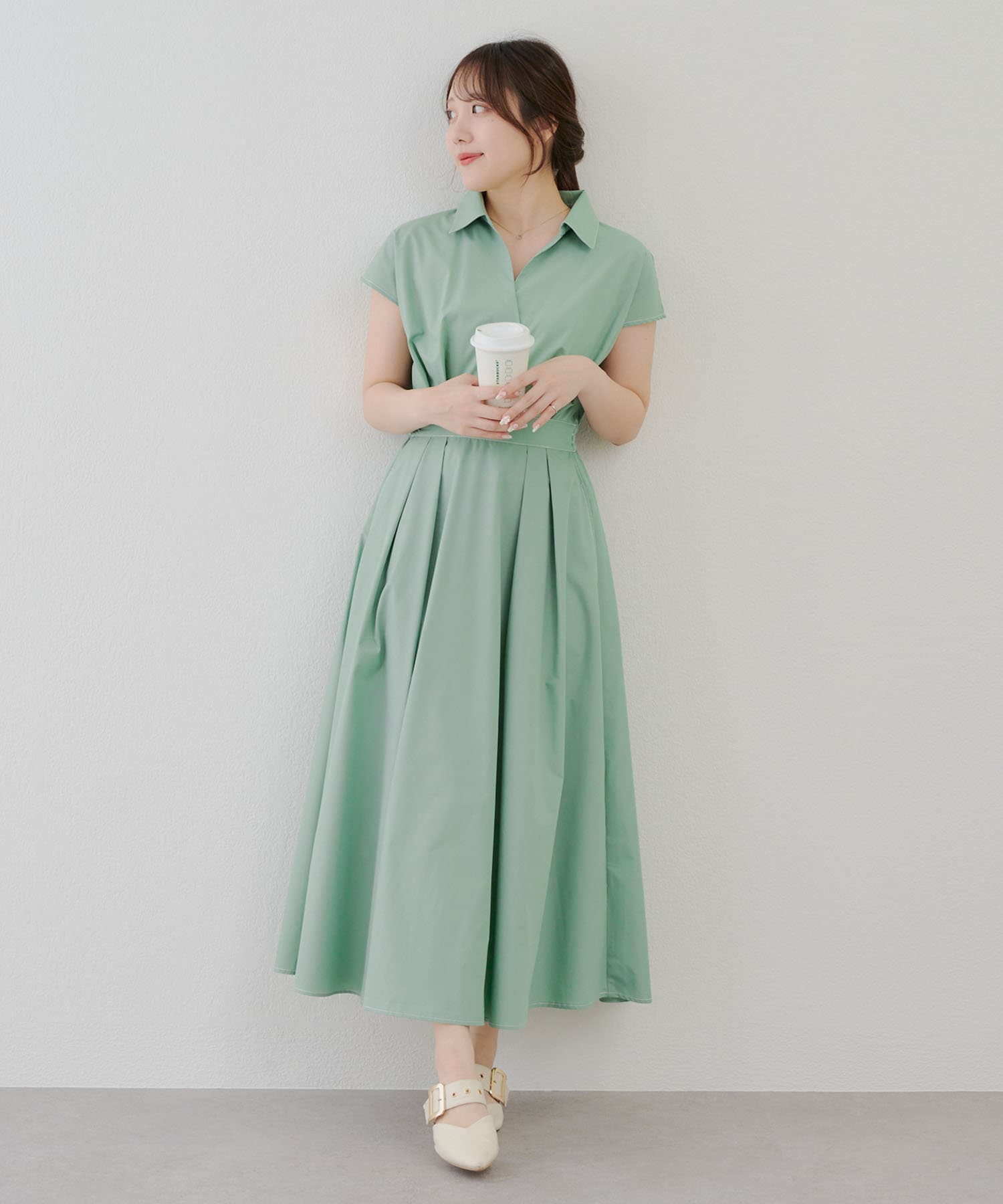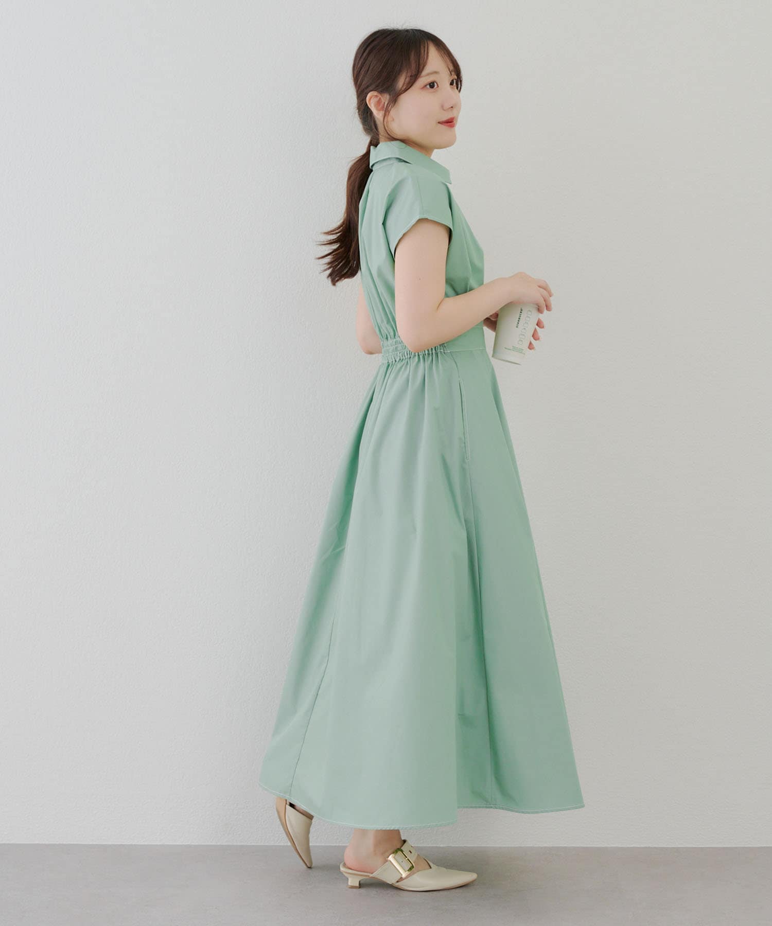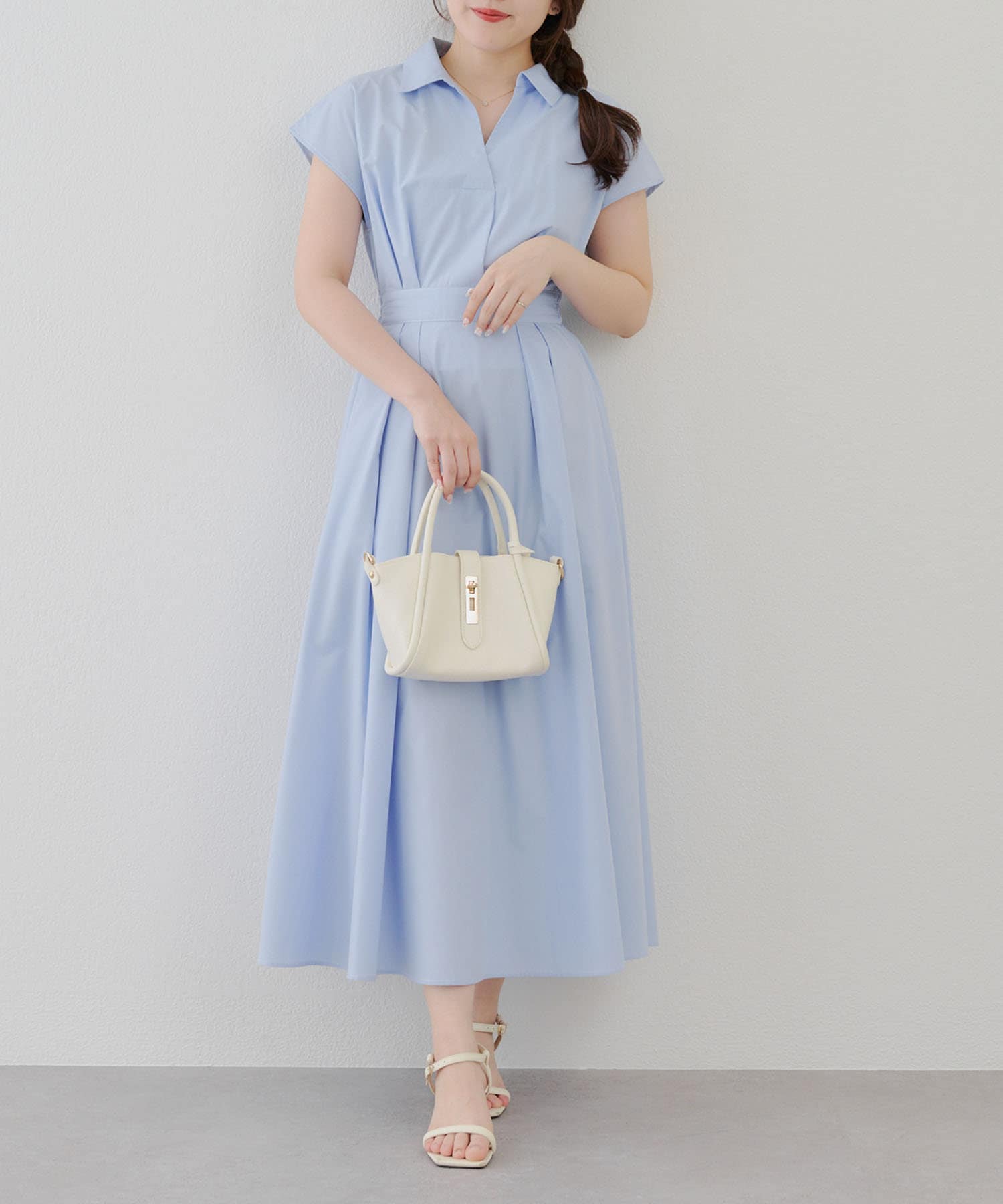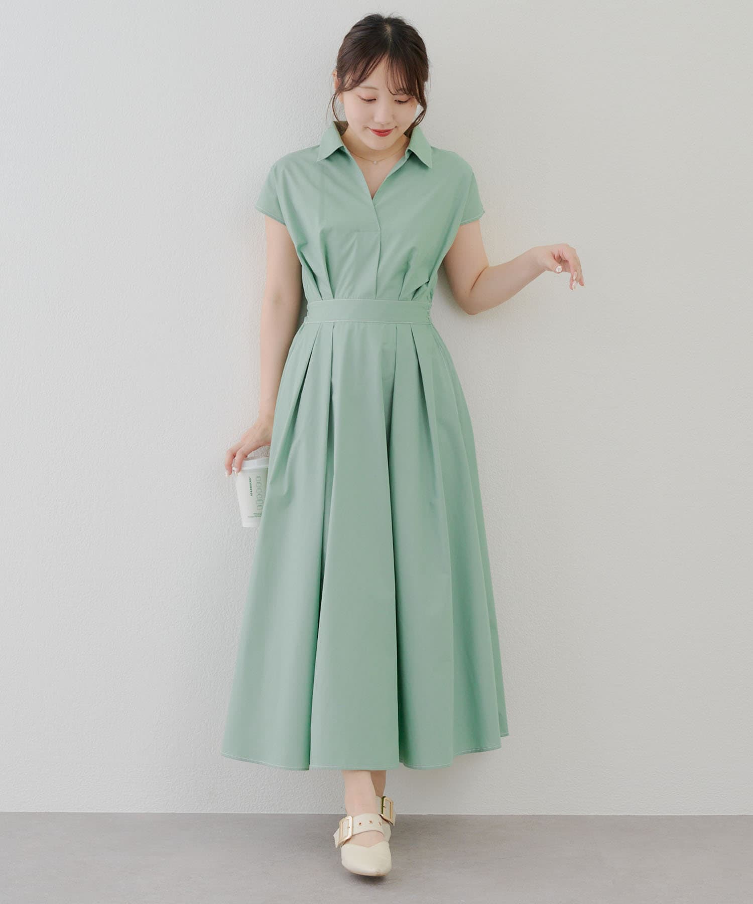 ・スキッパー襟が大人っぽい印象のロング丈ワンピース