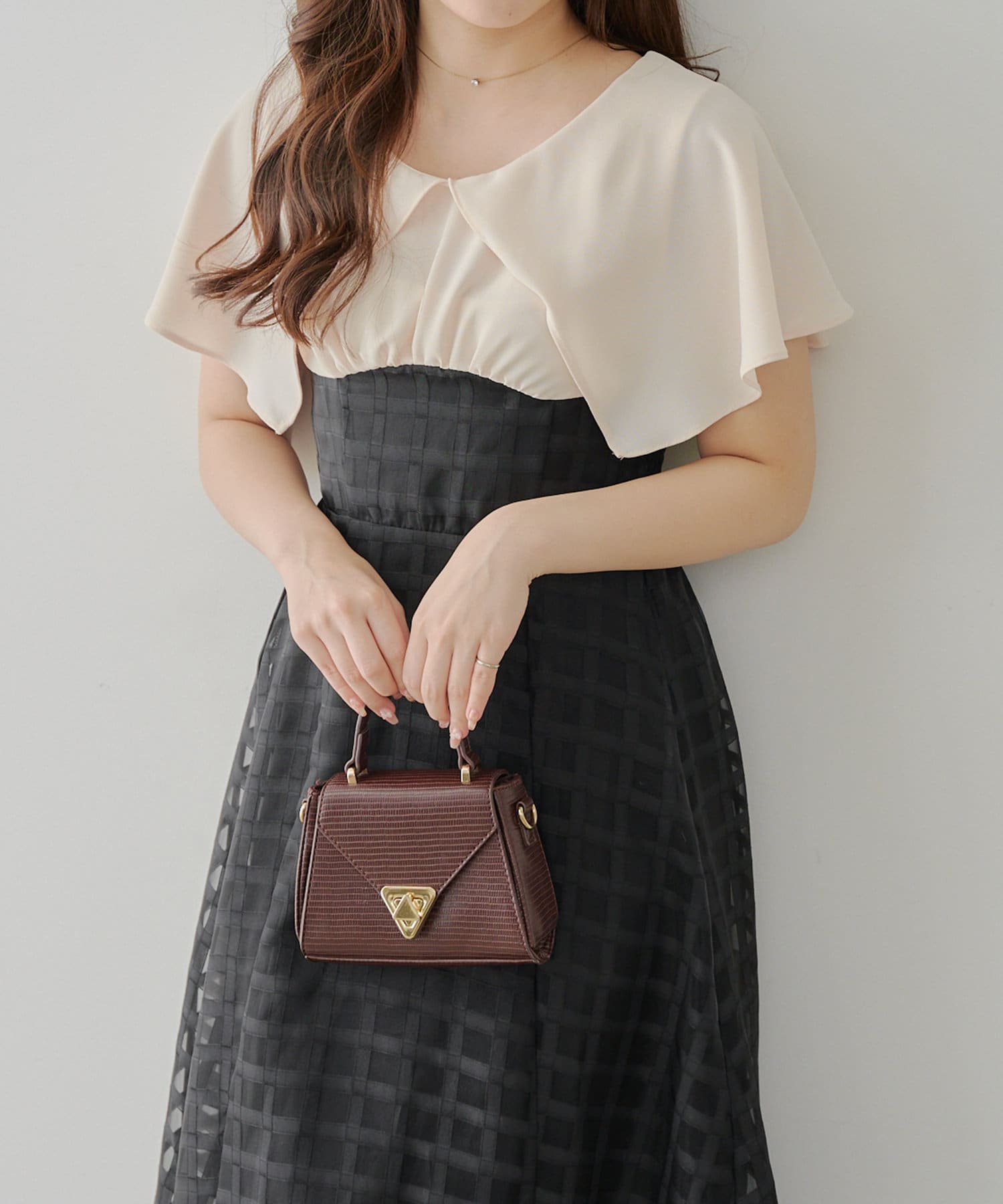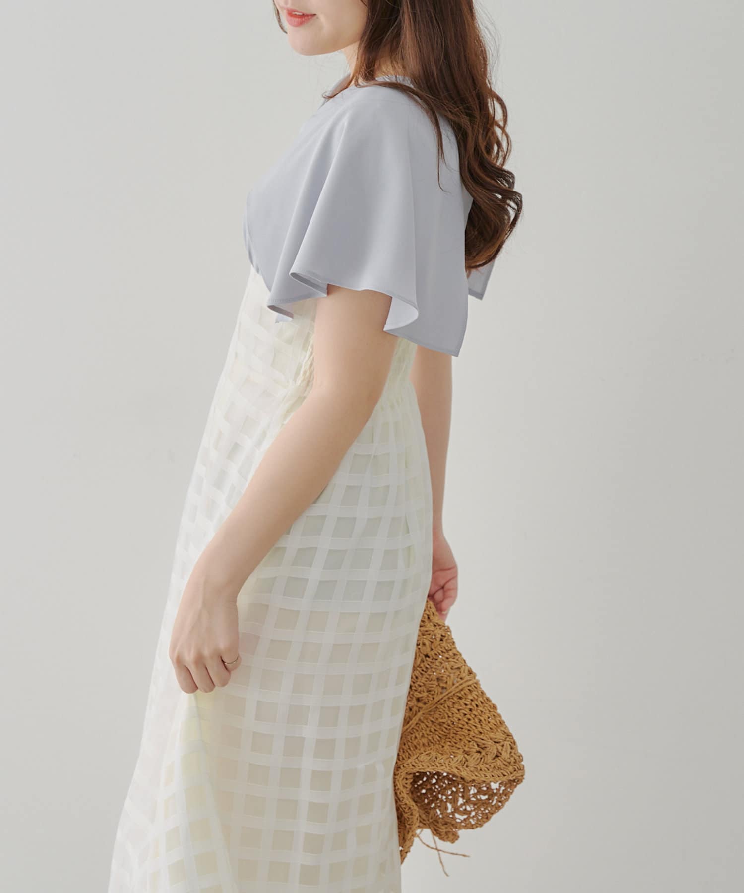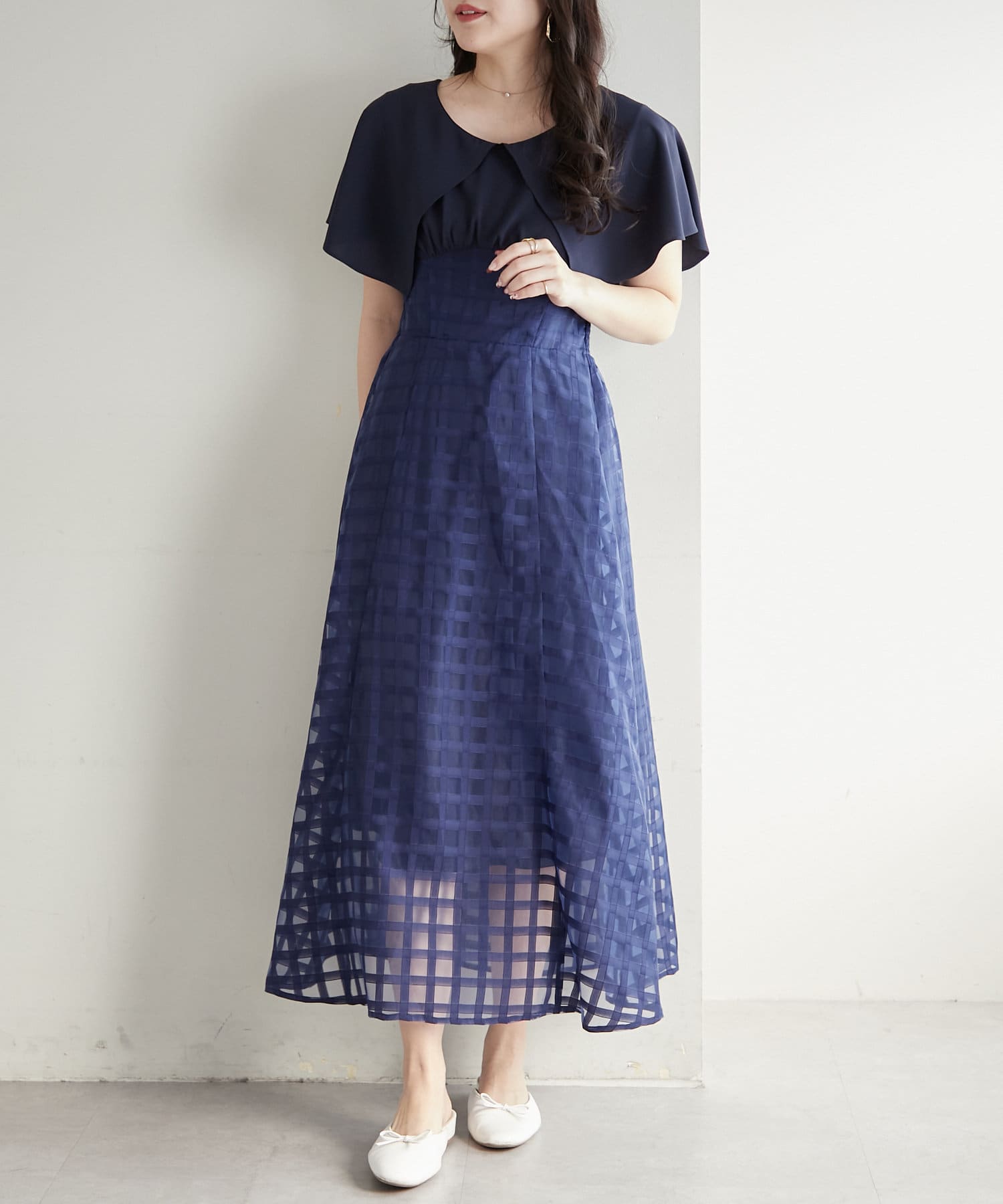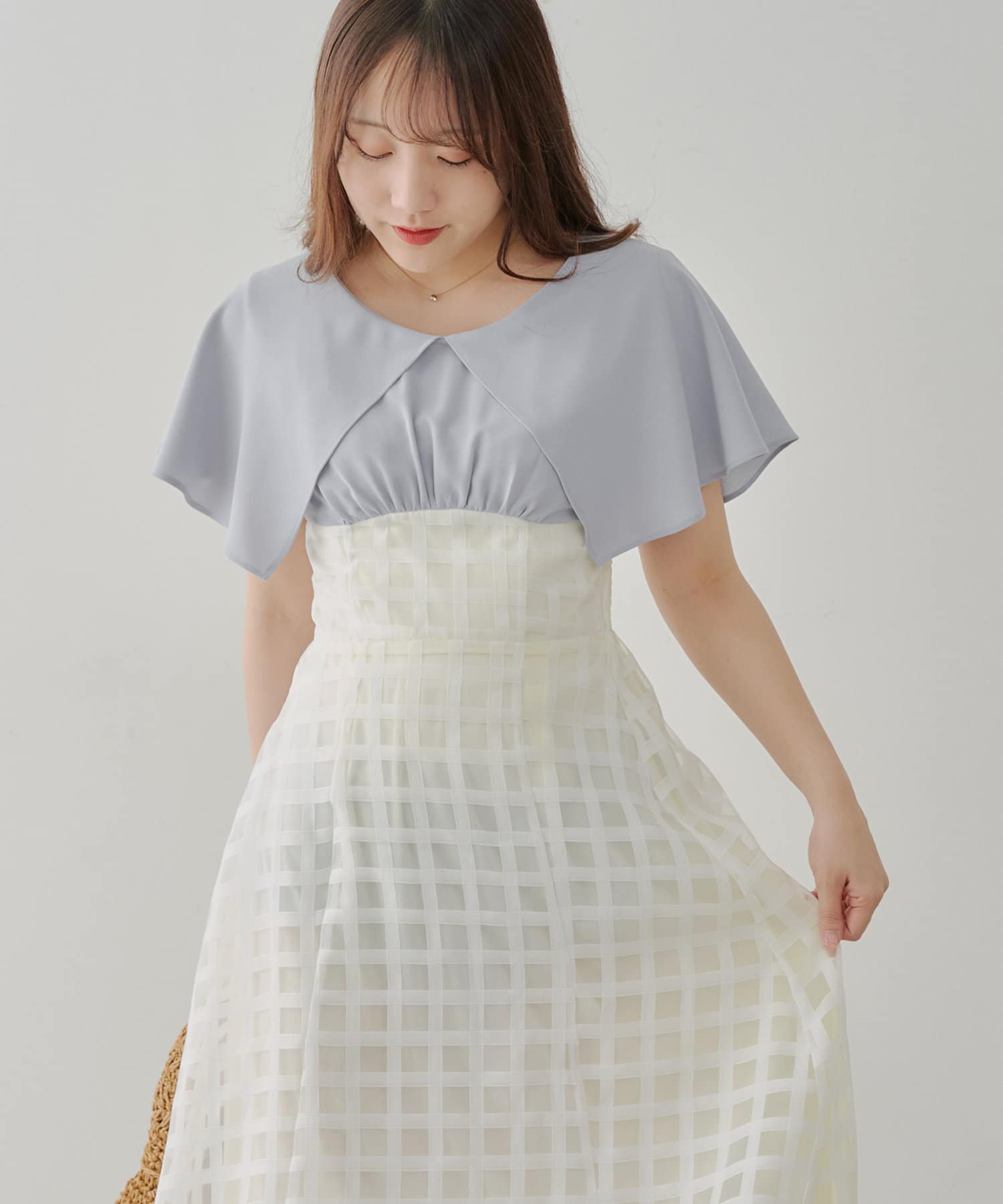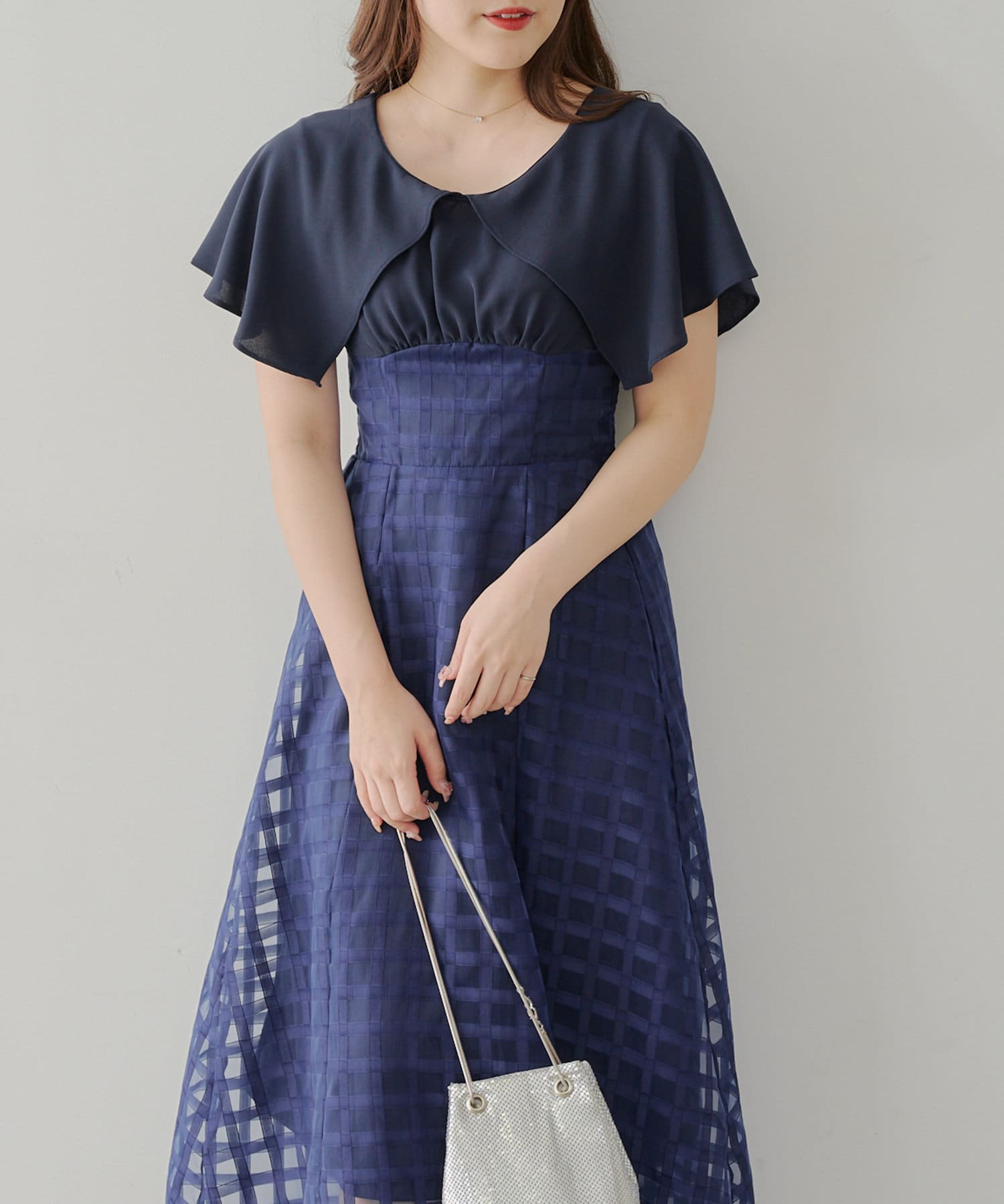 ・肩にかかるケープが気になる二の腕をカバーしてくれて-5キロ見えのスタイルアップ効果も期待できます。