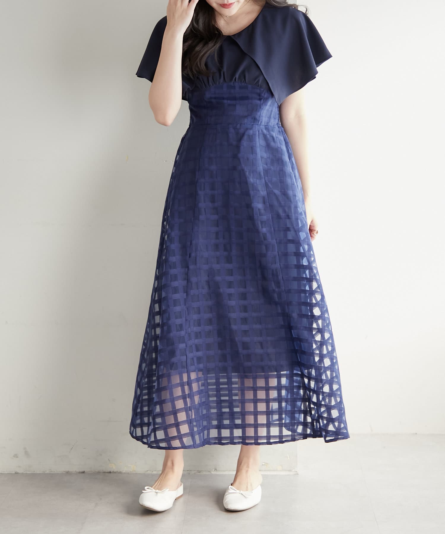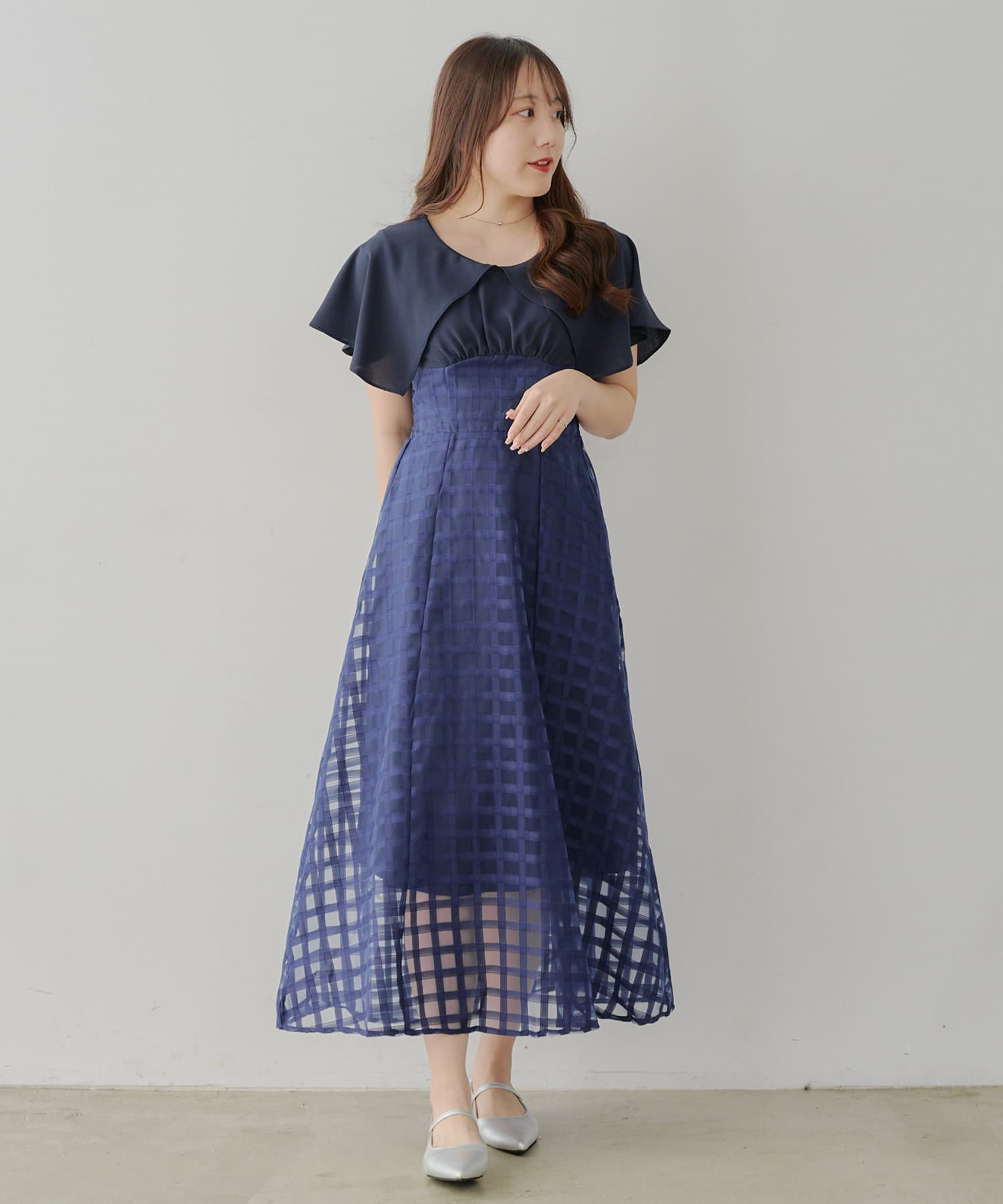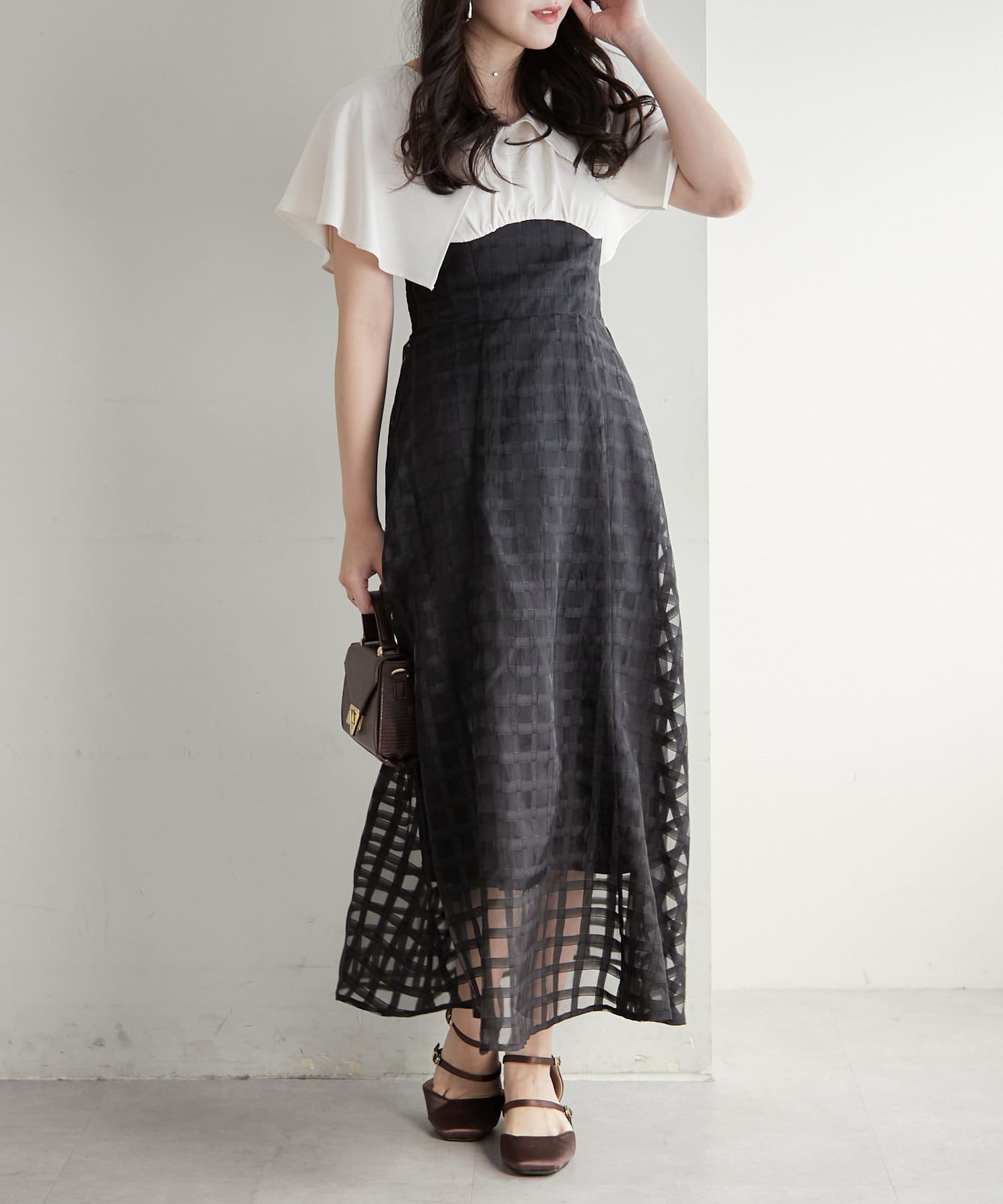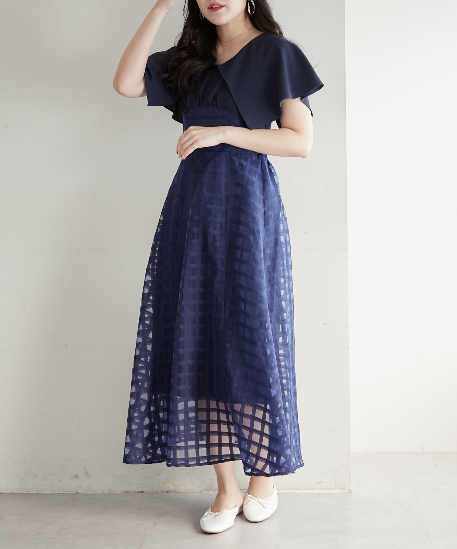 ・肩にかかるケープが気になる二の腕をカバーしてくれて-5キロ見えのスタイルアップ効果も期待できます。