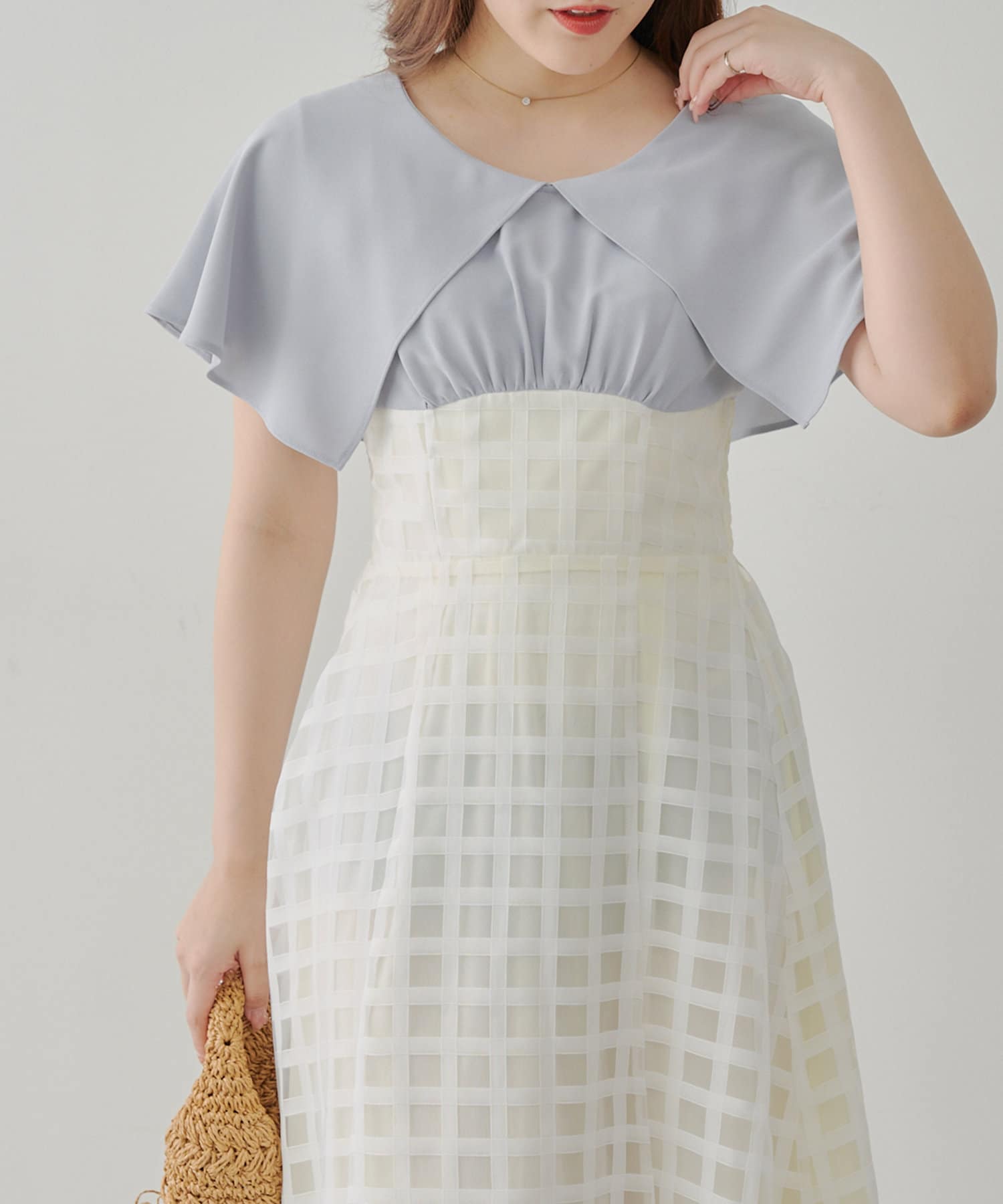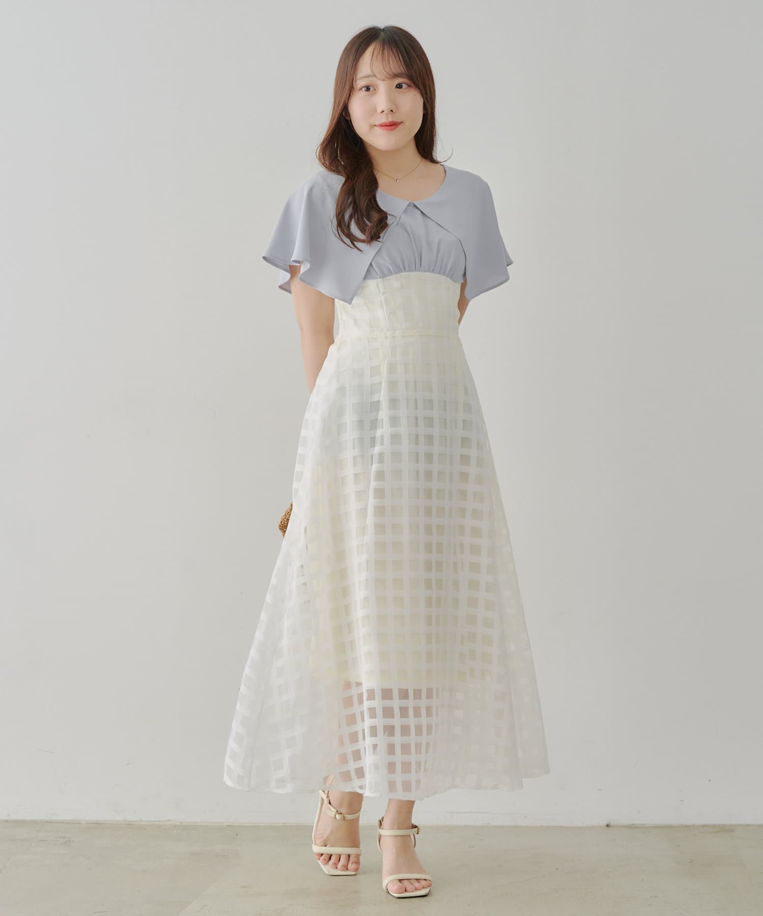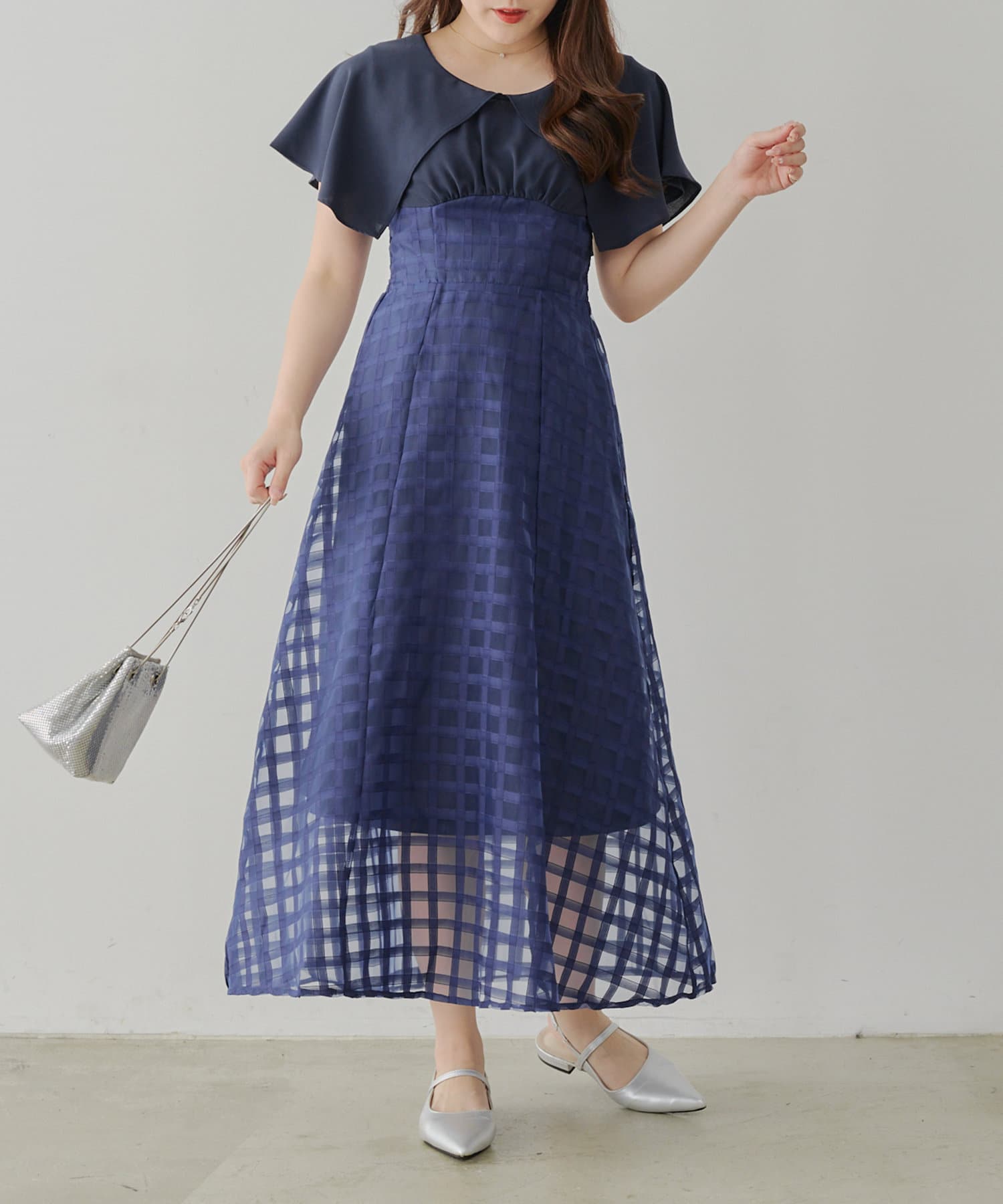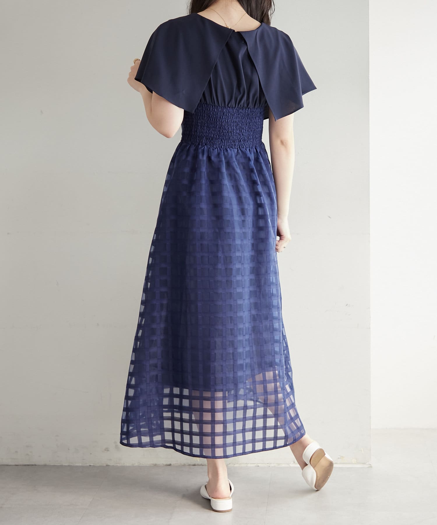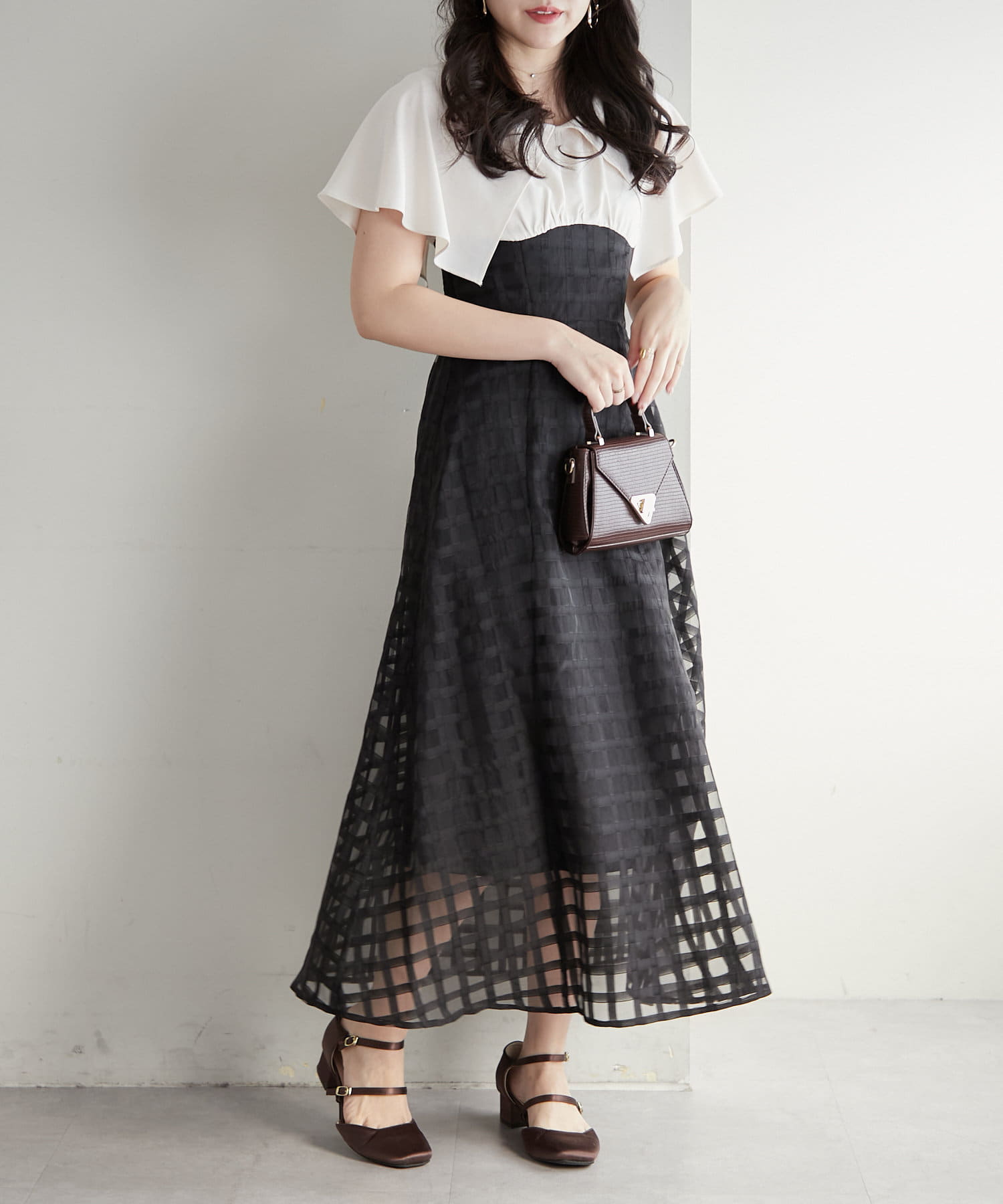 ・肩にかかるケープが気になる二の腕をカバーしてくれて-5キロ見えのスタイルアップ効果も期待できます。