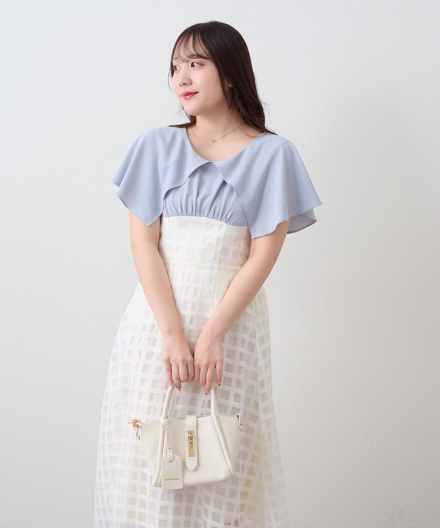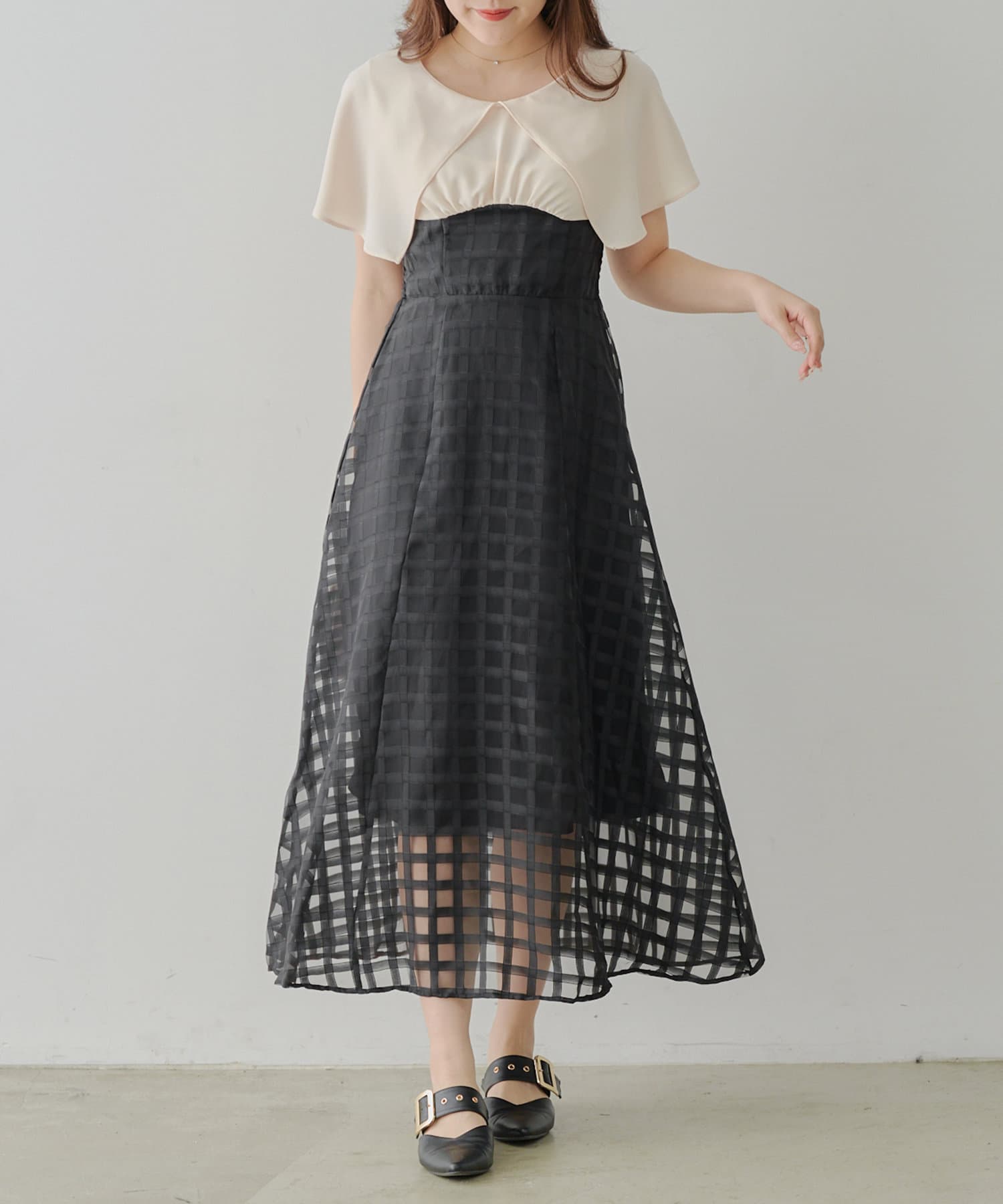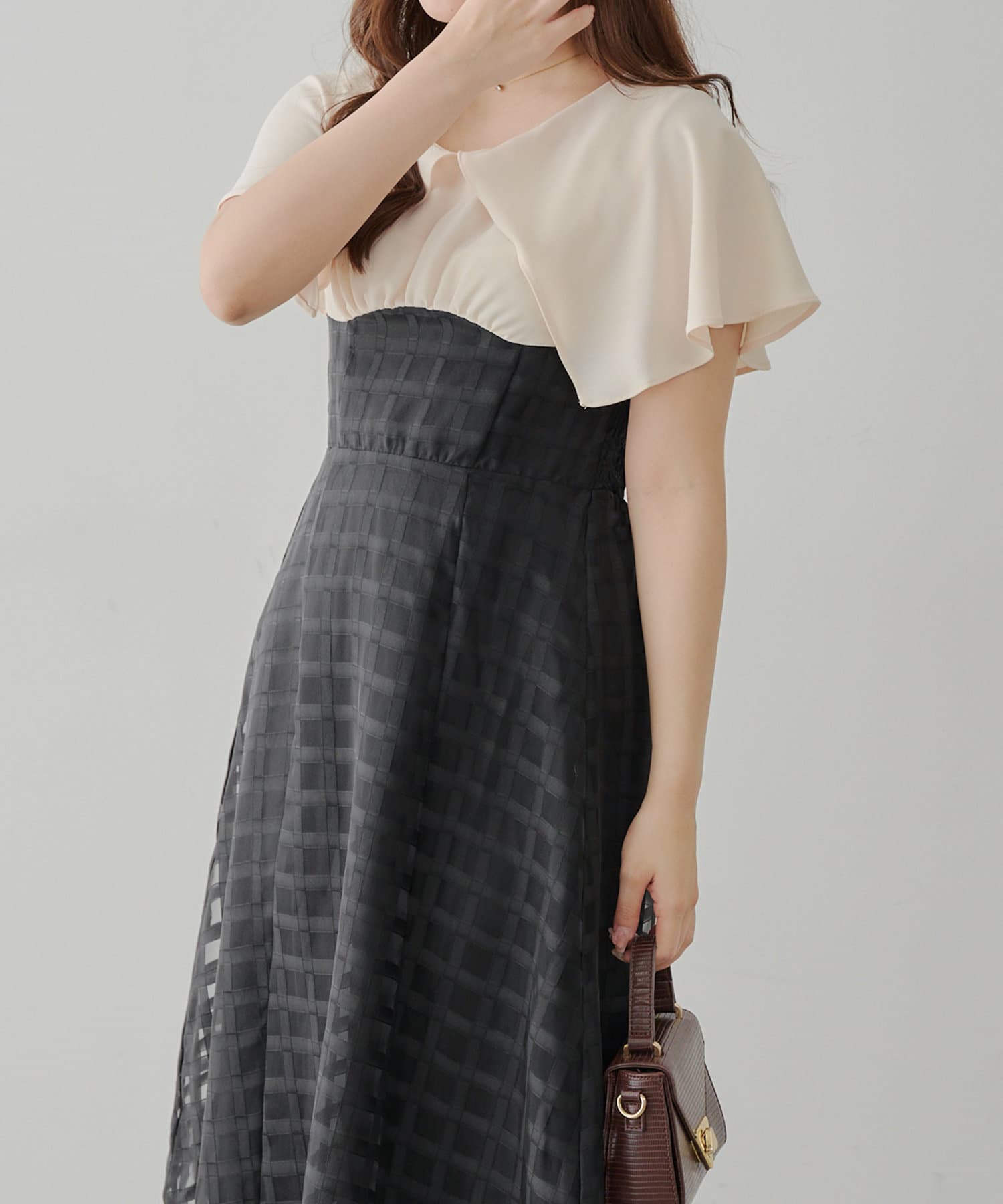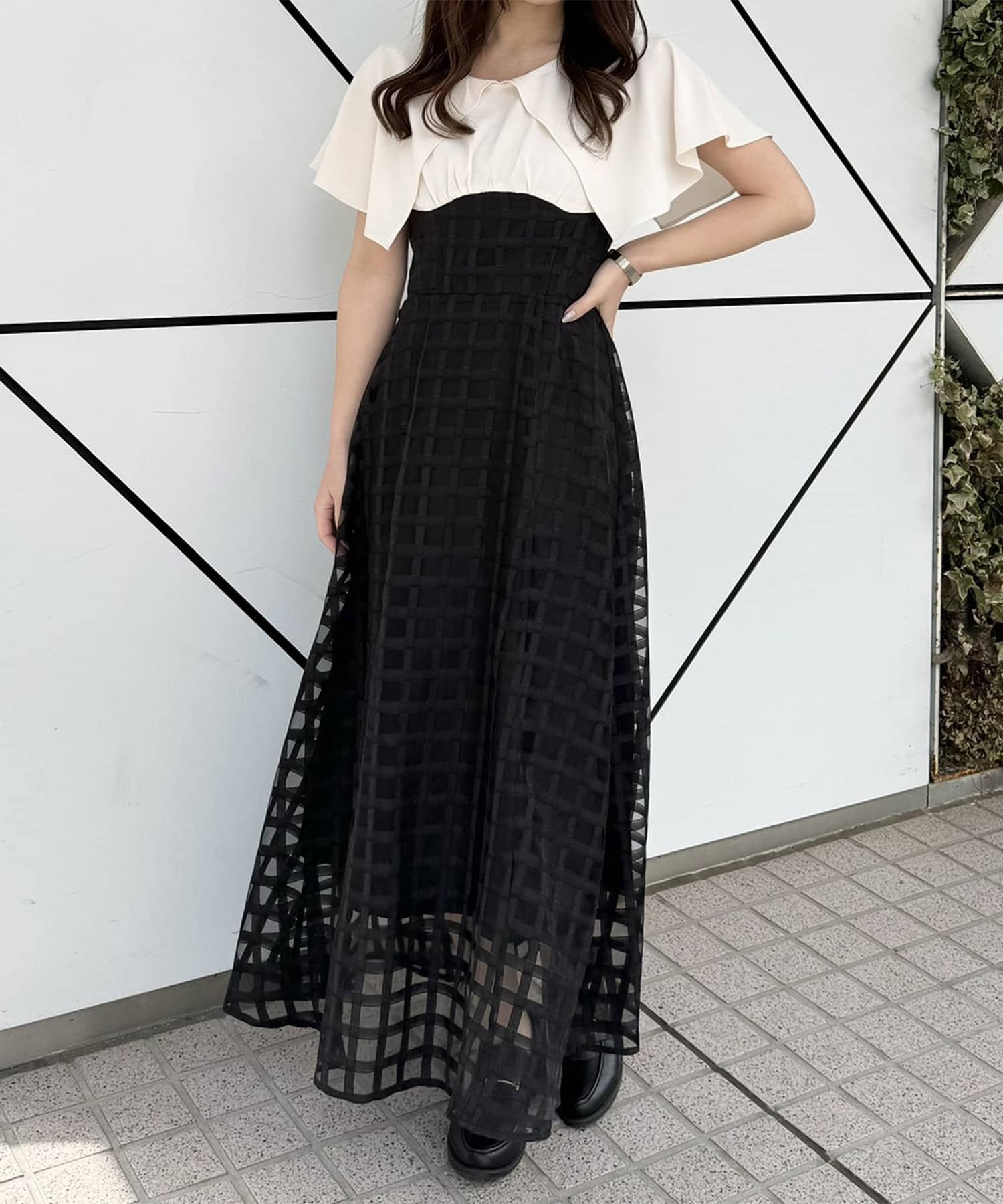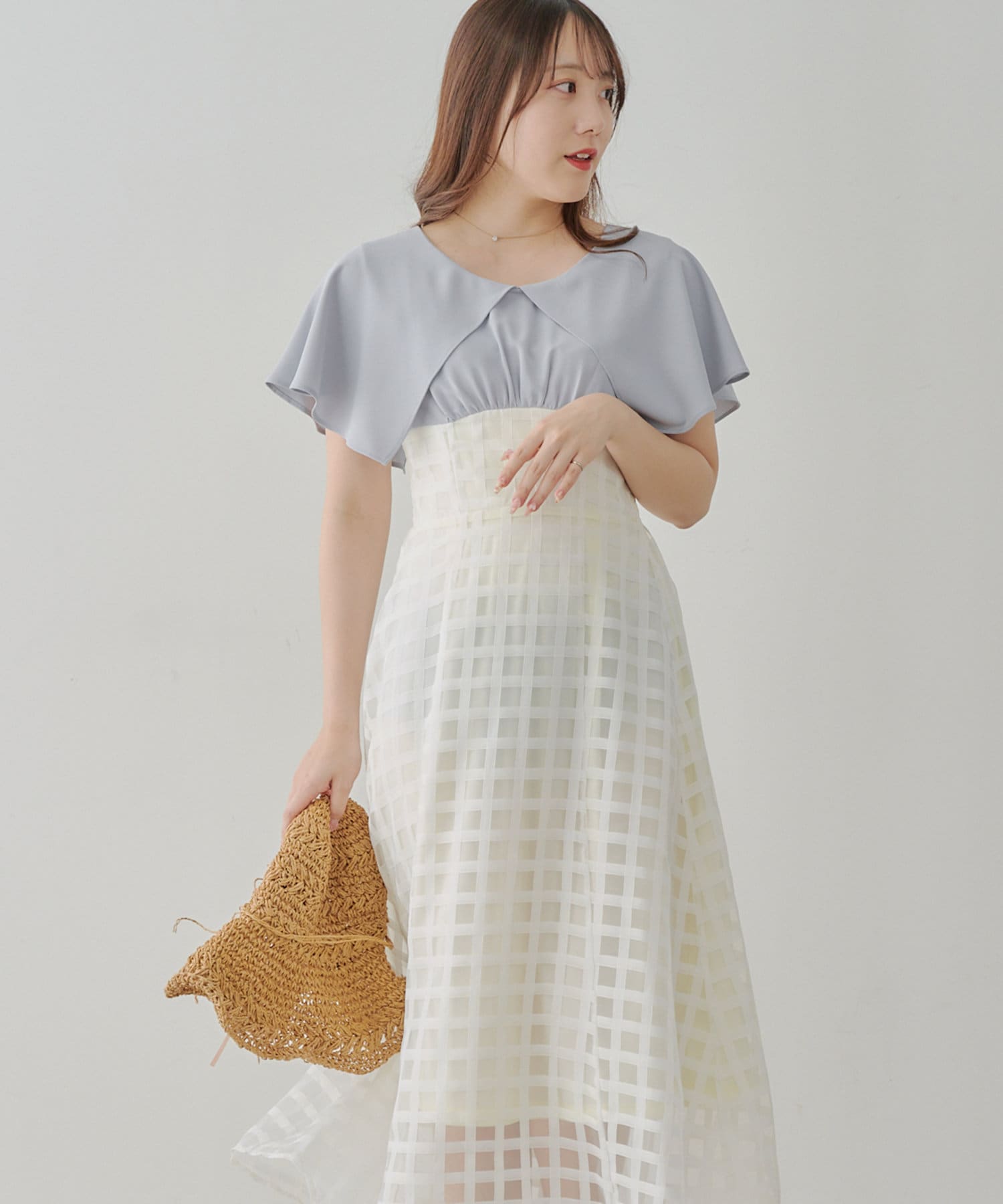 ・肩にかかるケープが気になる二の腕をカバーしてくれて-5キロ見えのスタイルアップ効果も期待できます。
