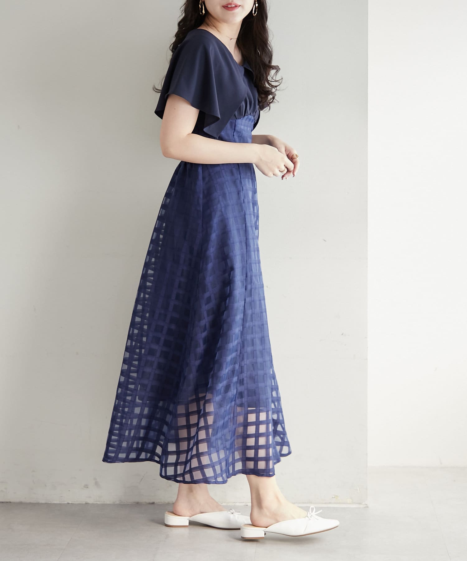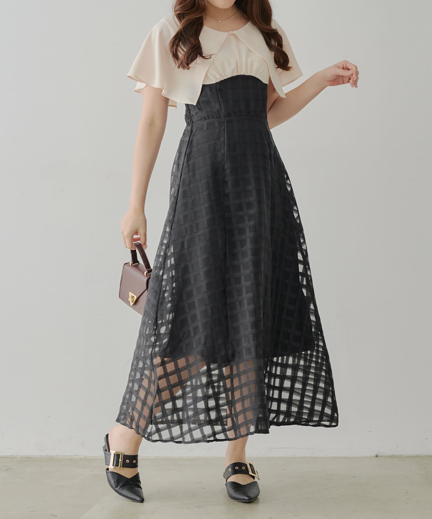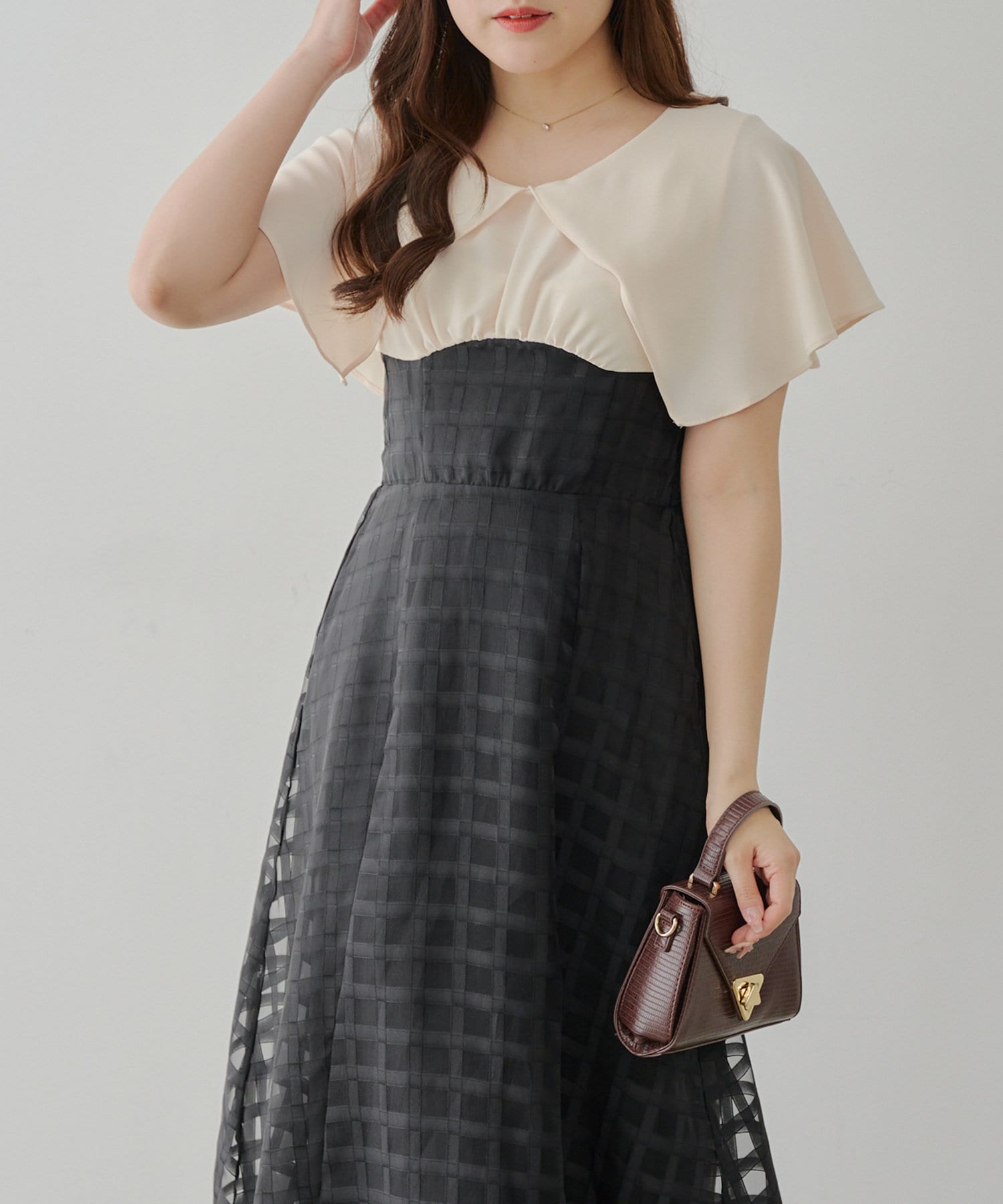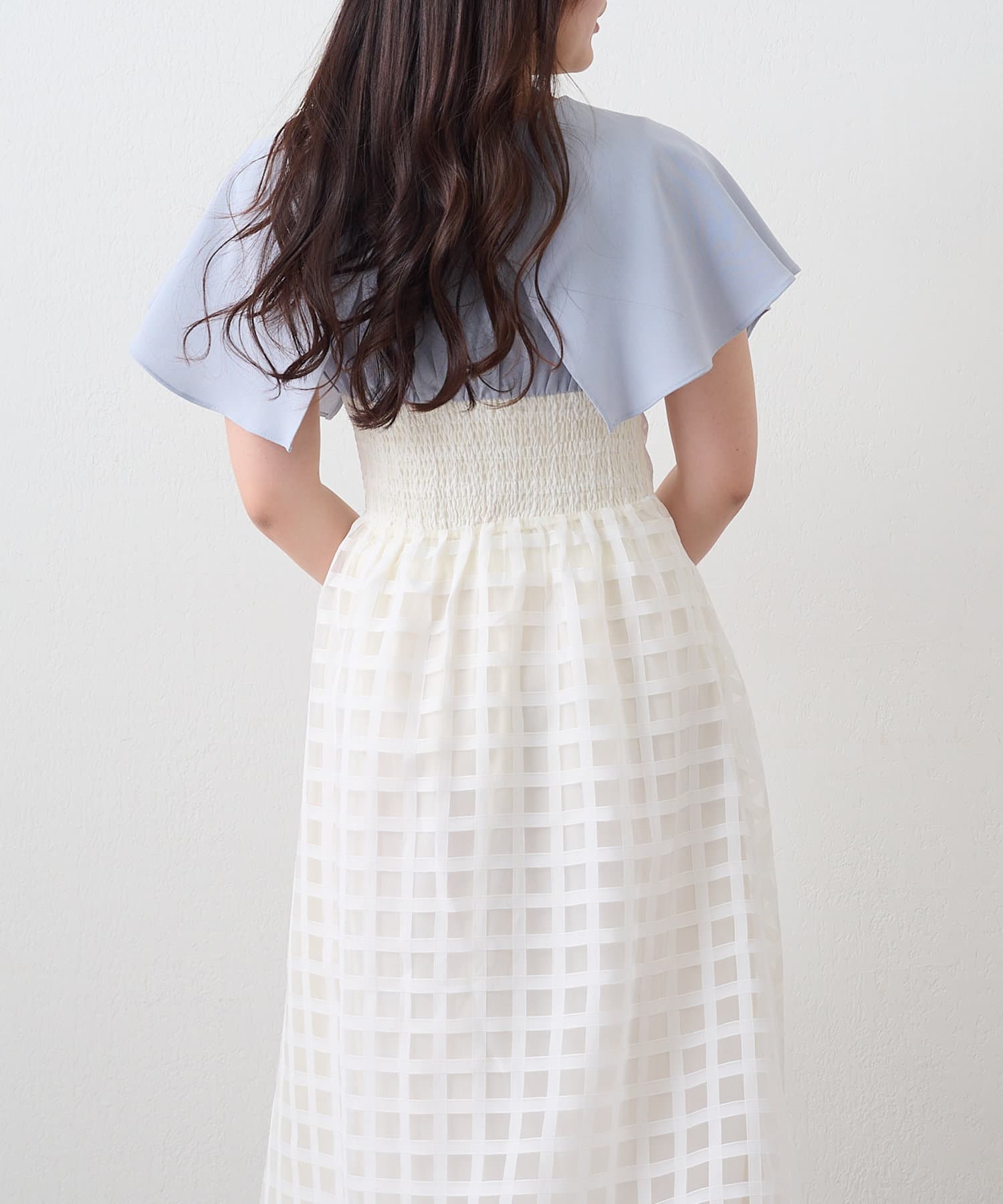・肩にかかるケープが気になる二の腕をカバーしてくれて-5キロ見えのスタイルアップ効果も期待できます。