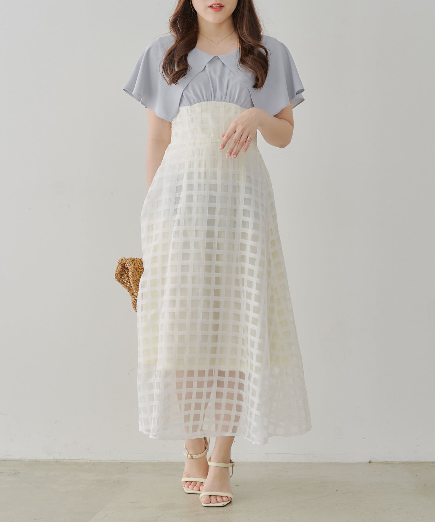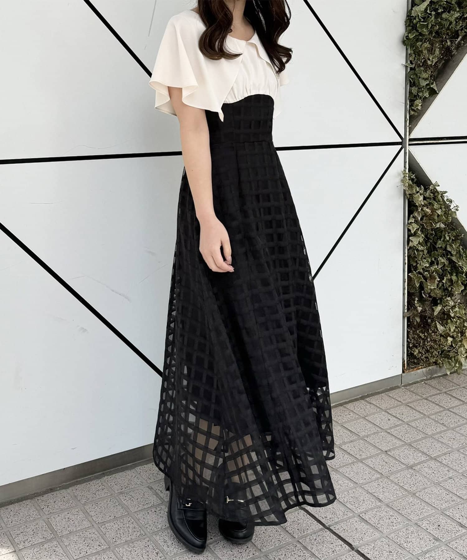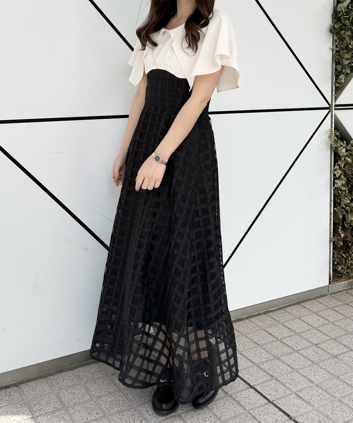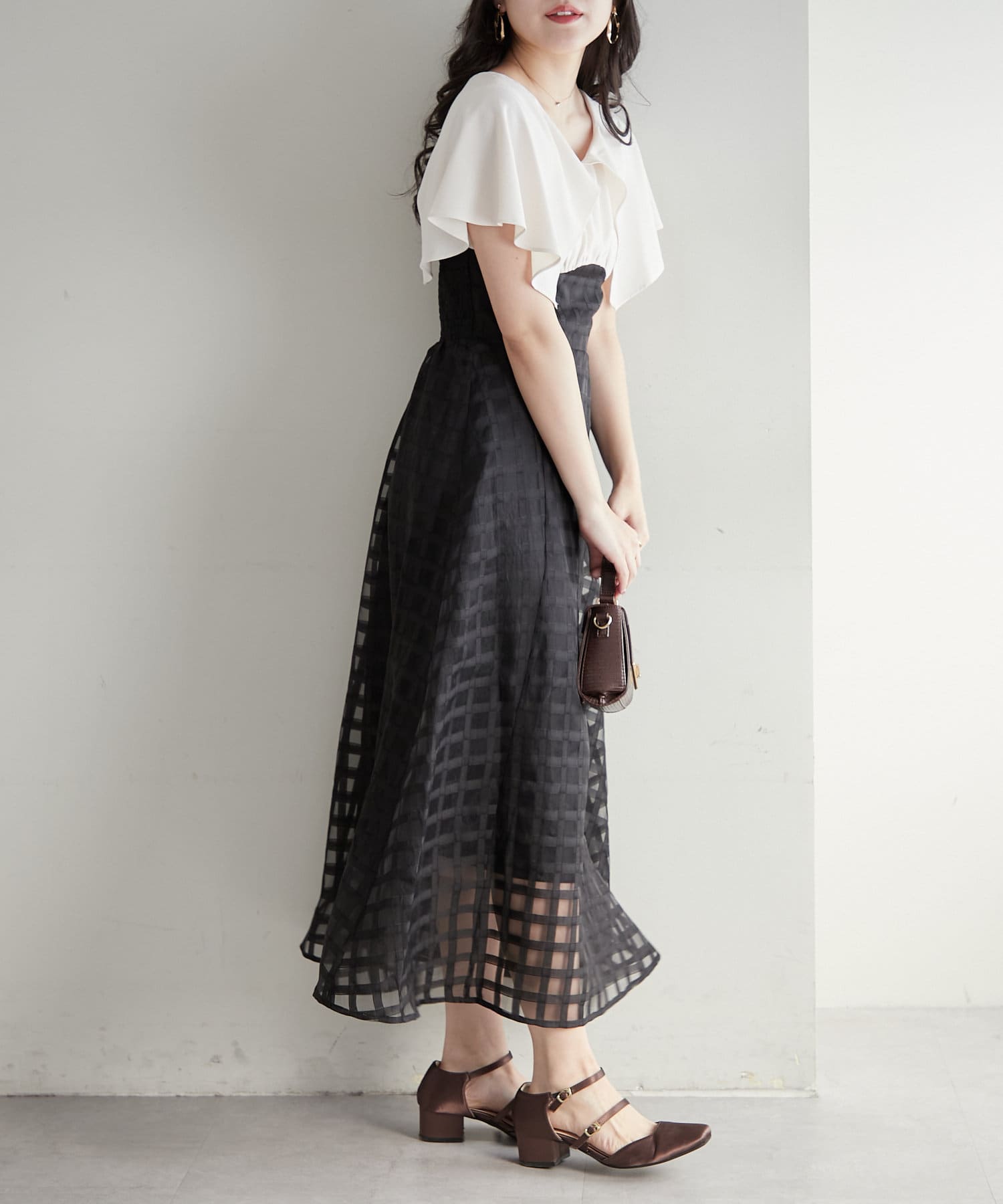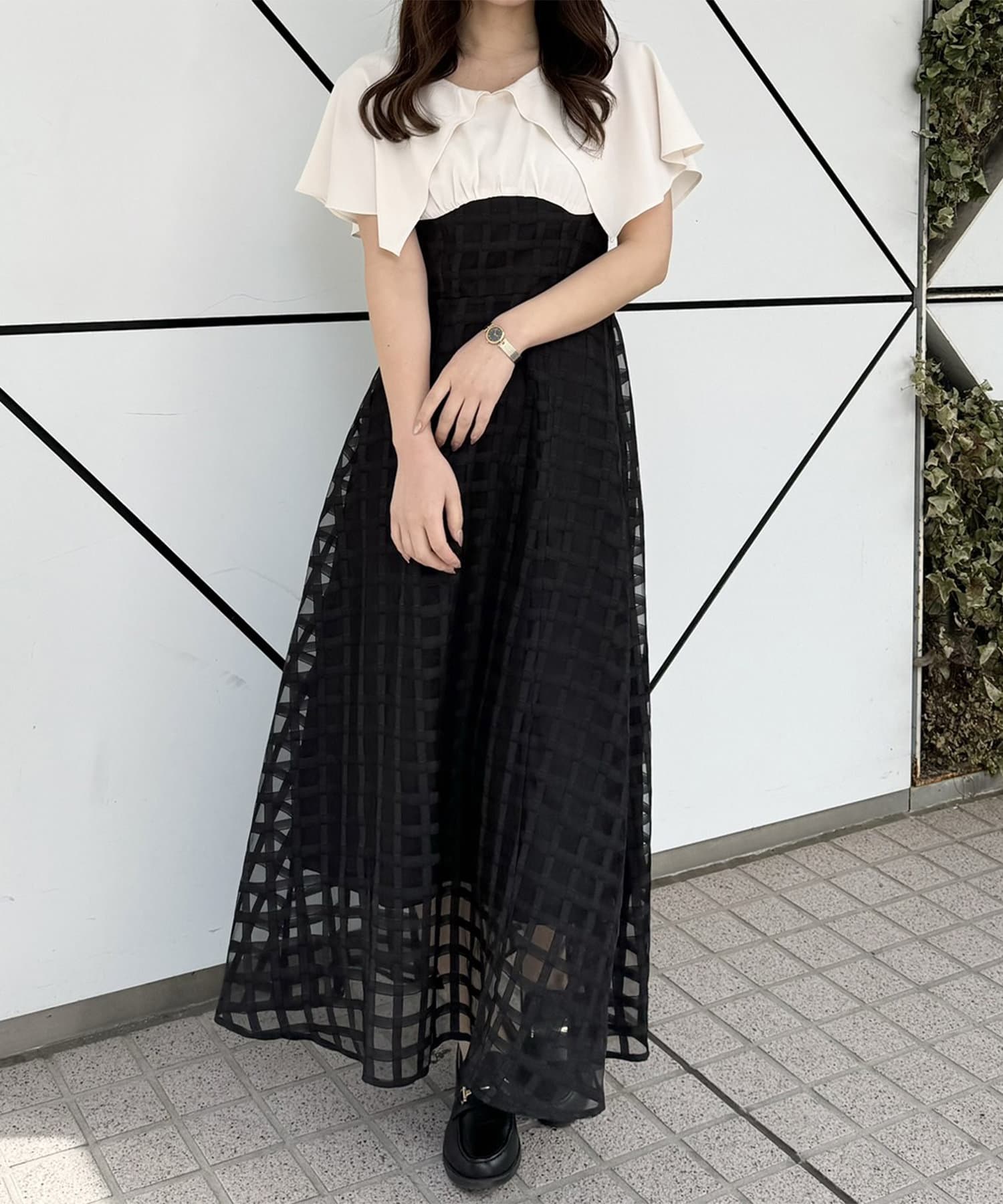 ・肩にかかるケープが気になる二の腕をカバーしてくれて-5キロ見えのスタイルアップ効果も期待できます。