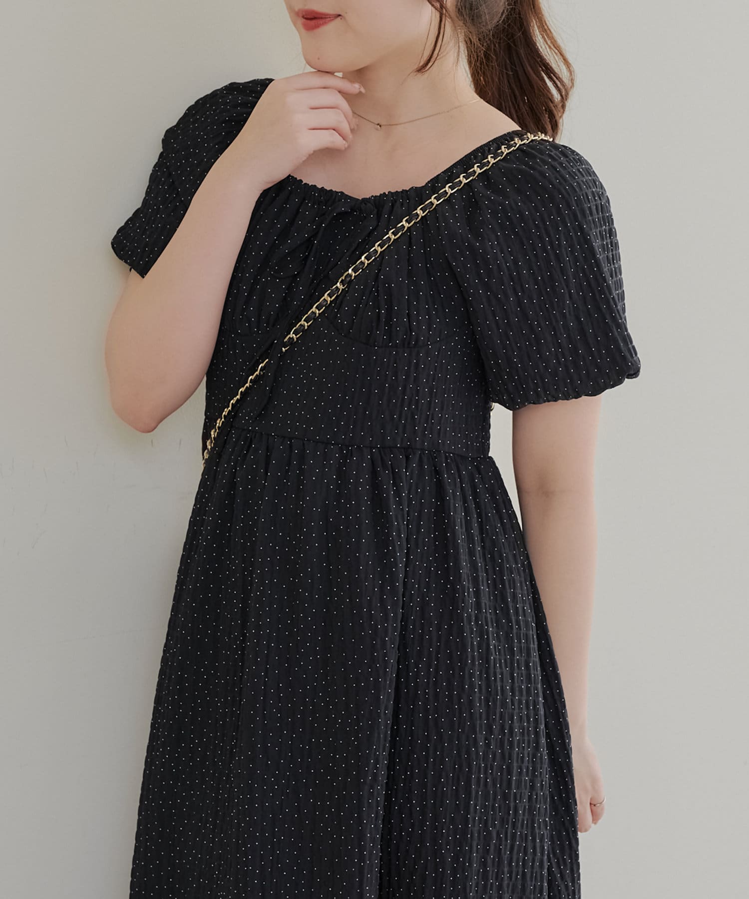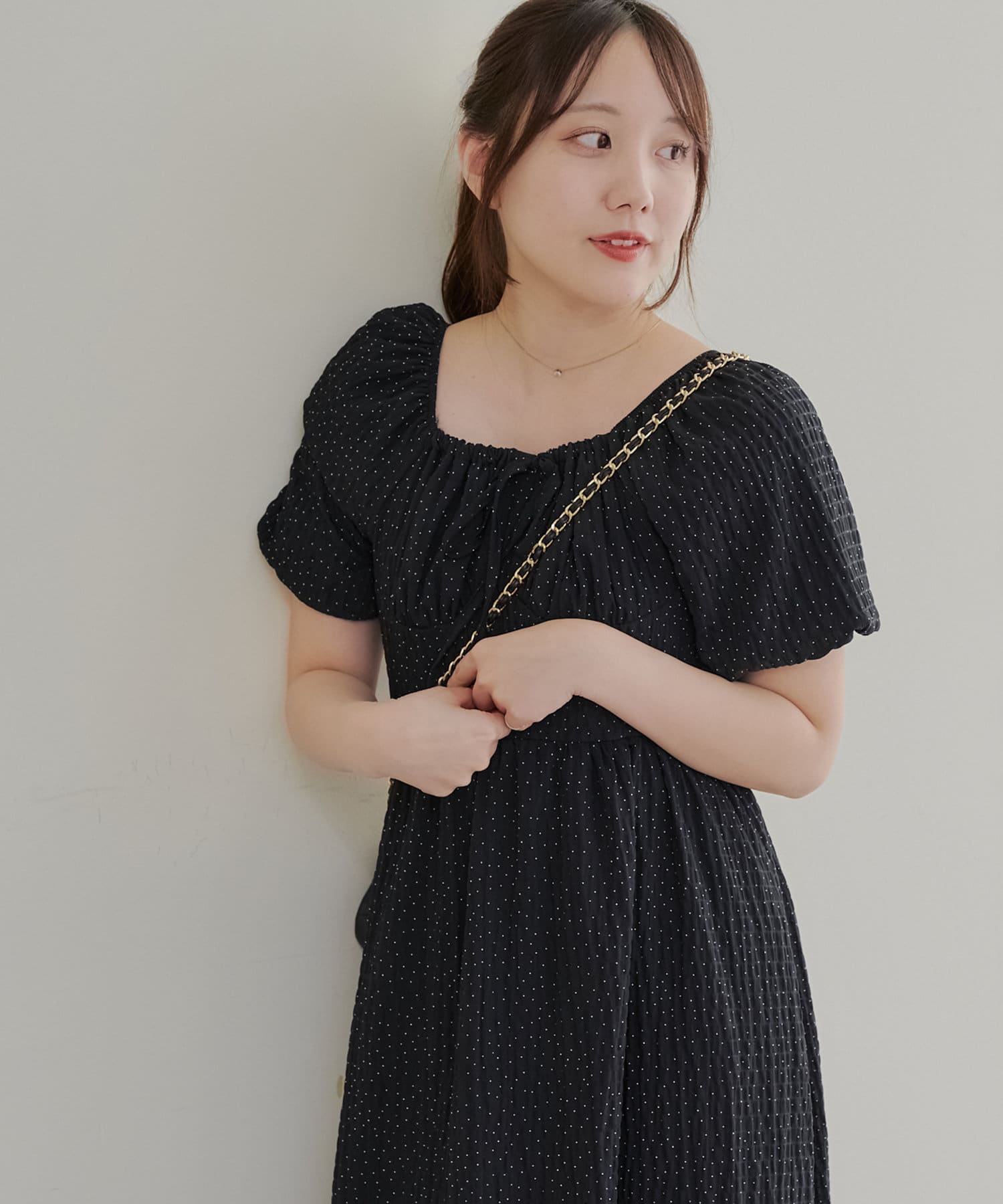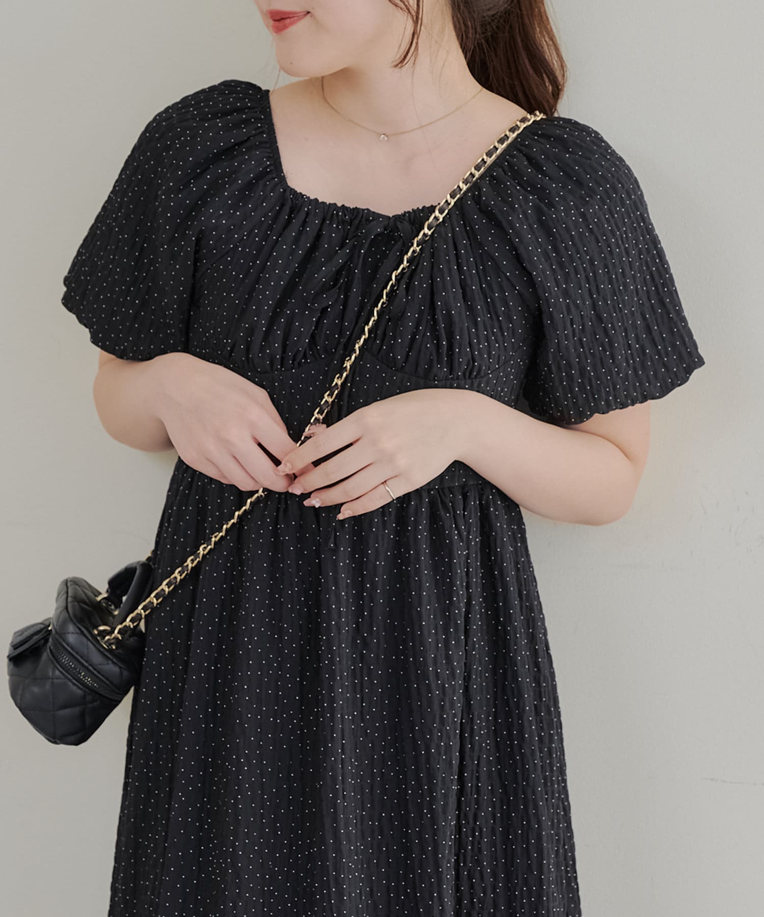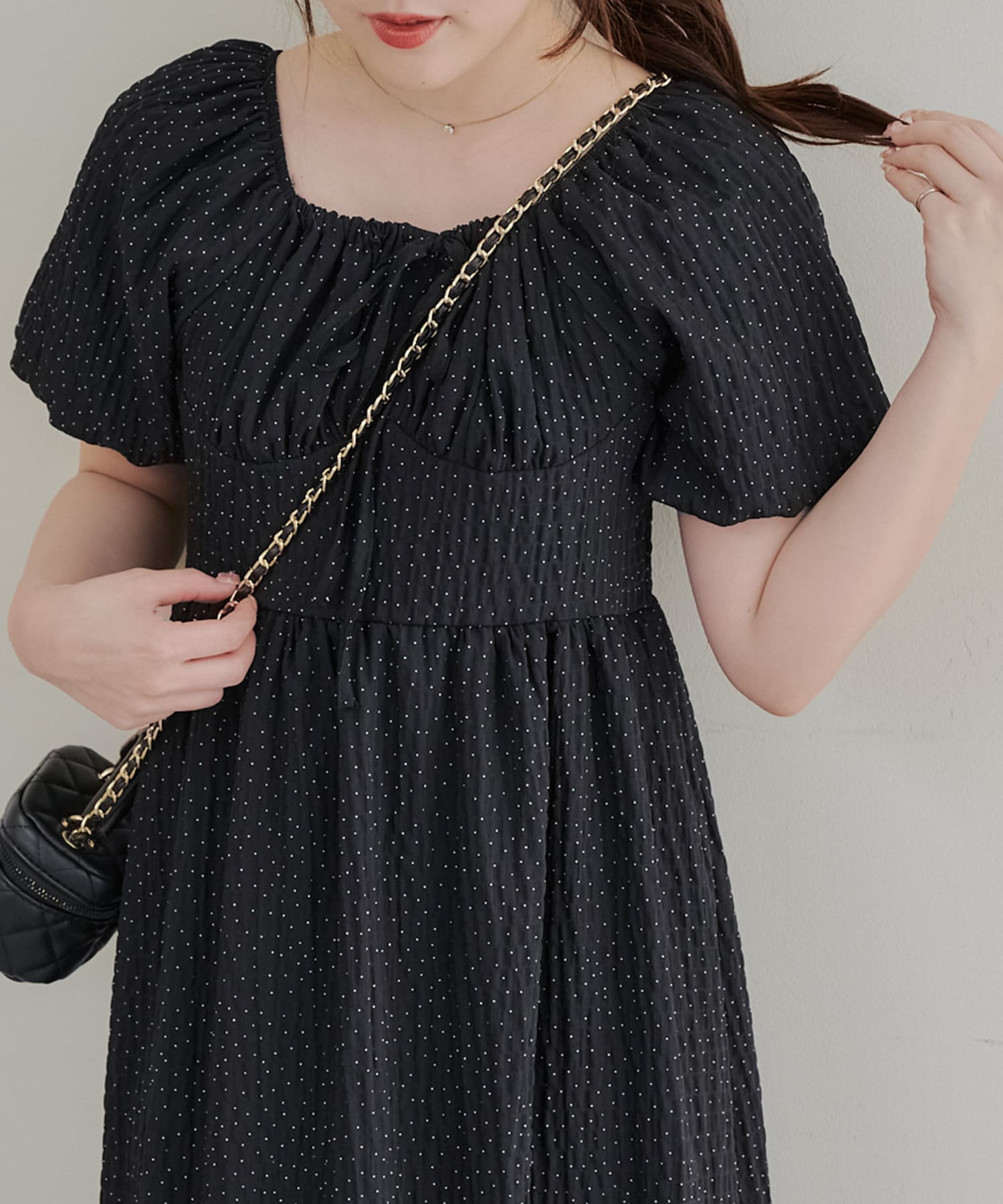 ・ドット柄がガーリーな印象のワンピース。