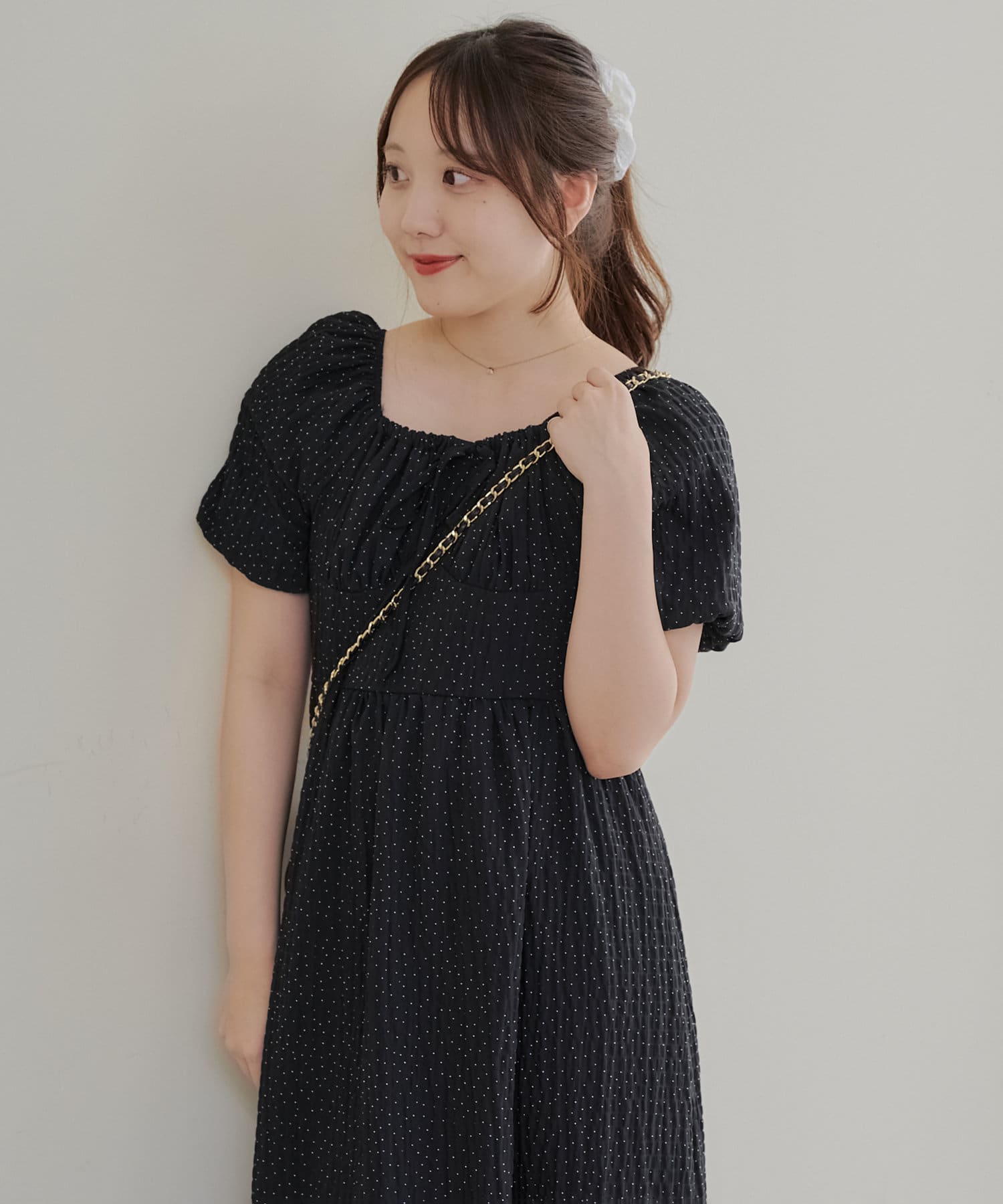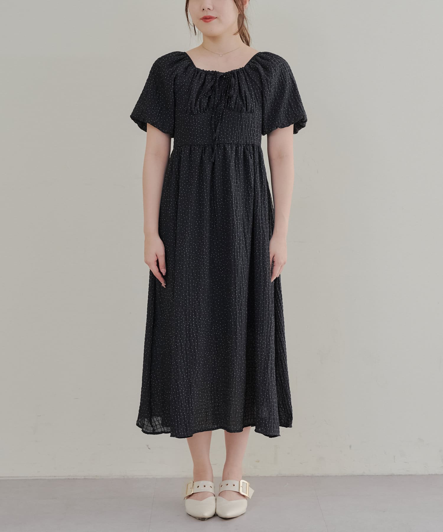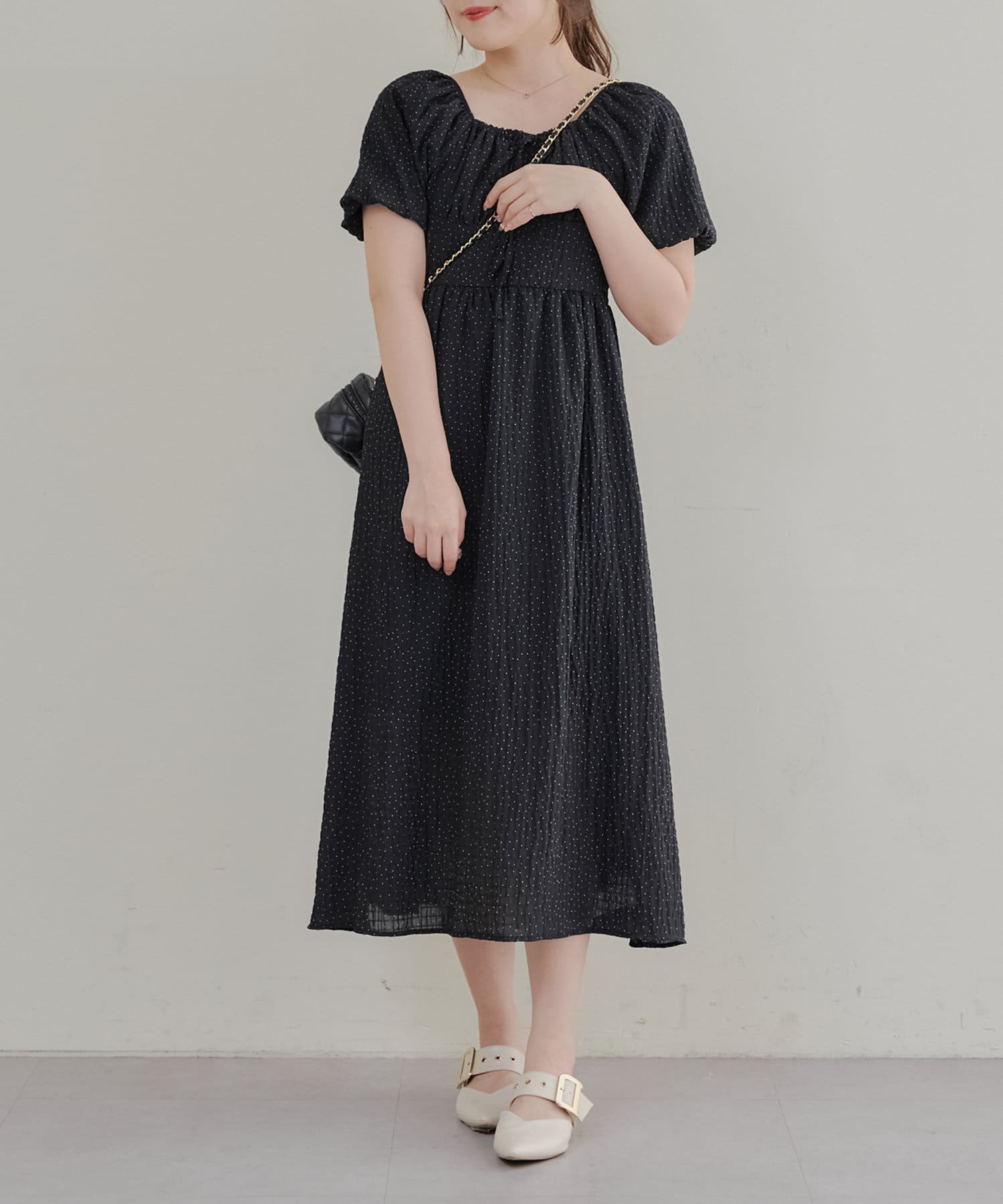 ・ドット柄がガーリーな印象のワンピース。