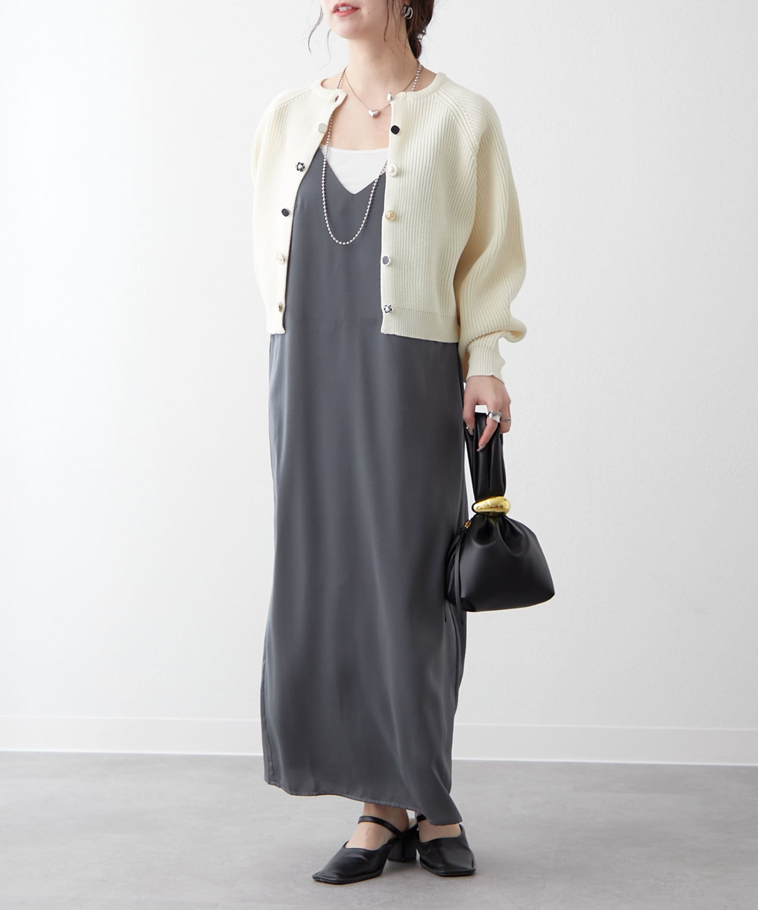 ・カジュアルコーデだけではなく、サテン素材のキャミワンピースやナロースカートを取り入れたレディライクな着こなしもおすすめ。