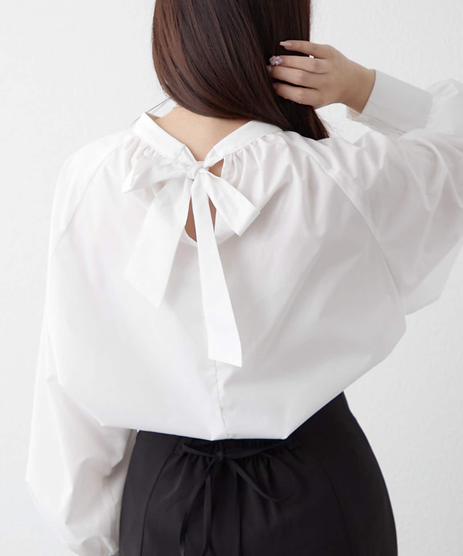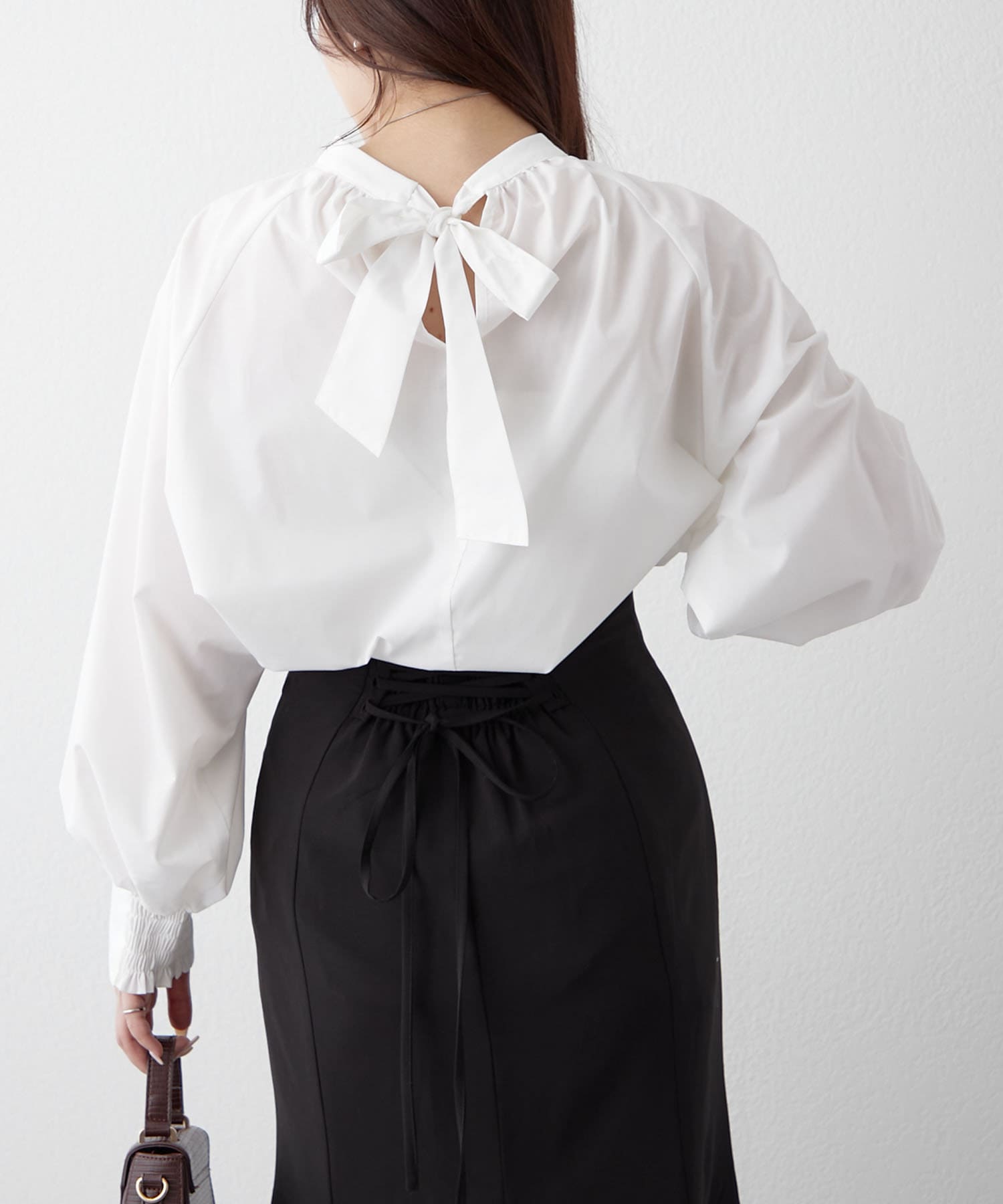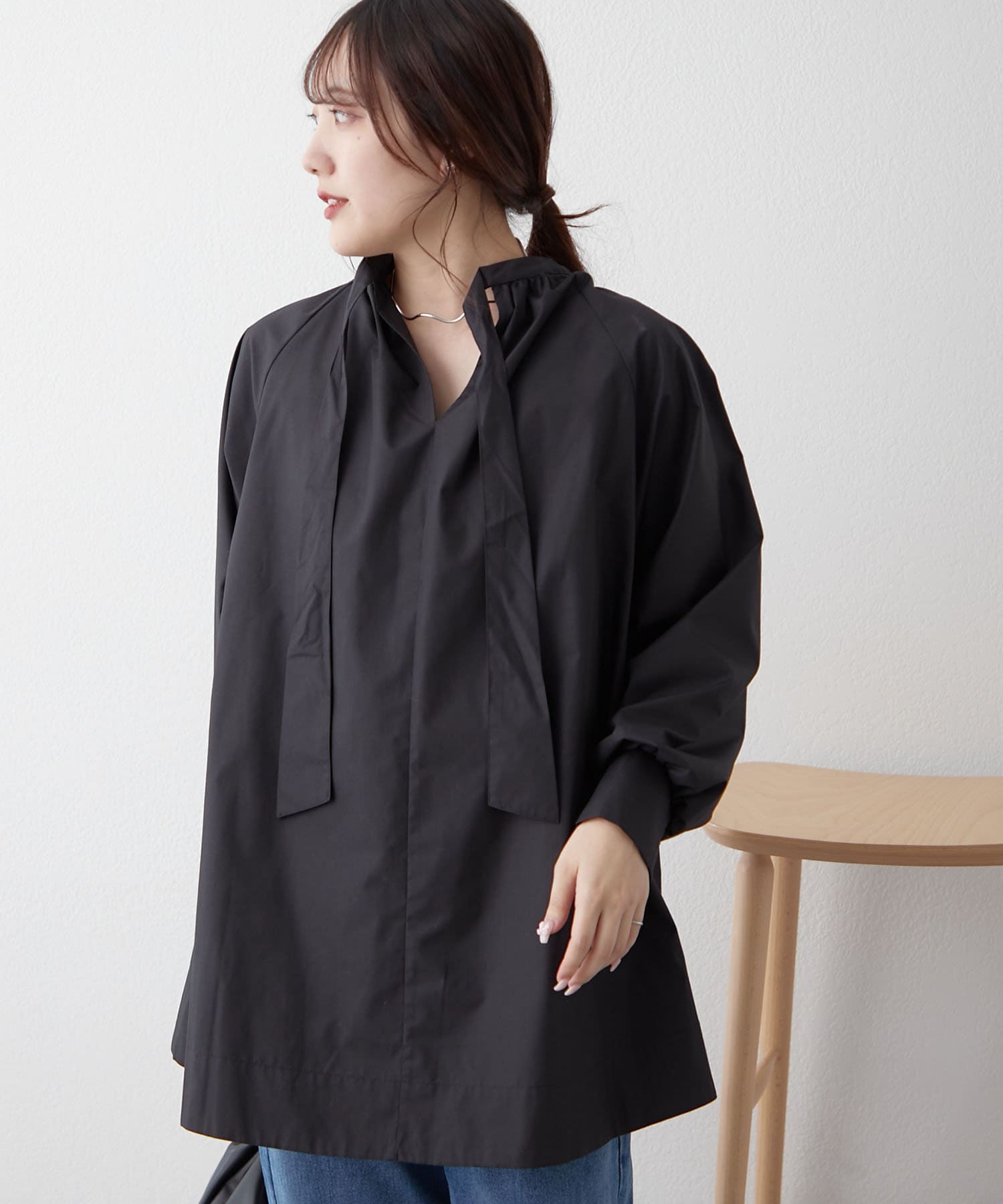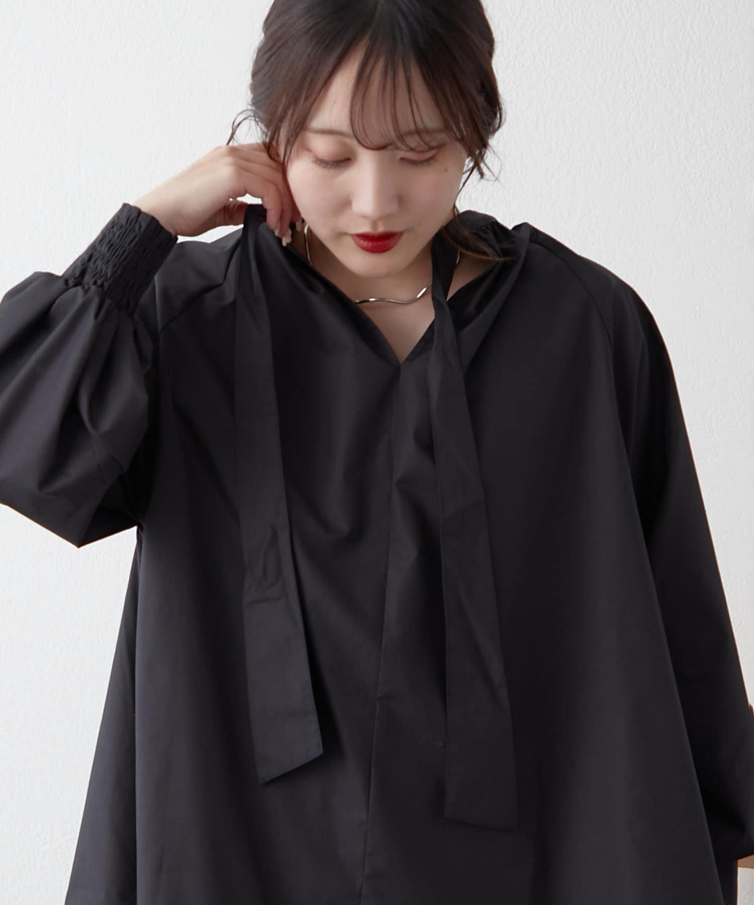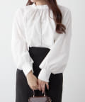 ・襟元からのボウタイ紐をアレンジすることで1枚でも存在感のあるブラウス。