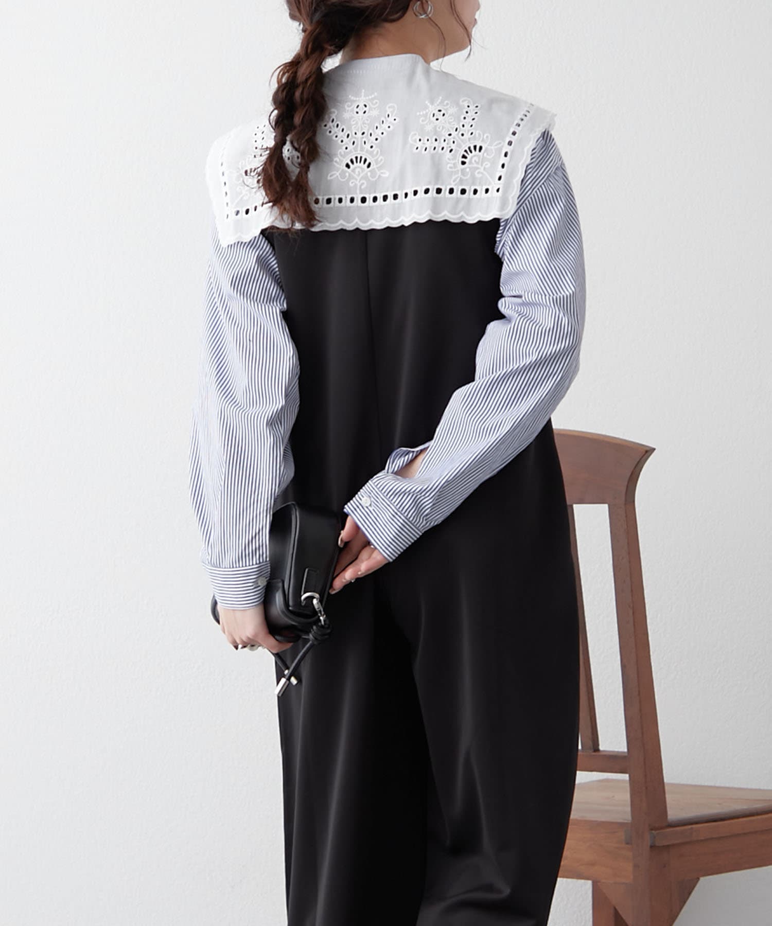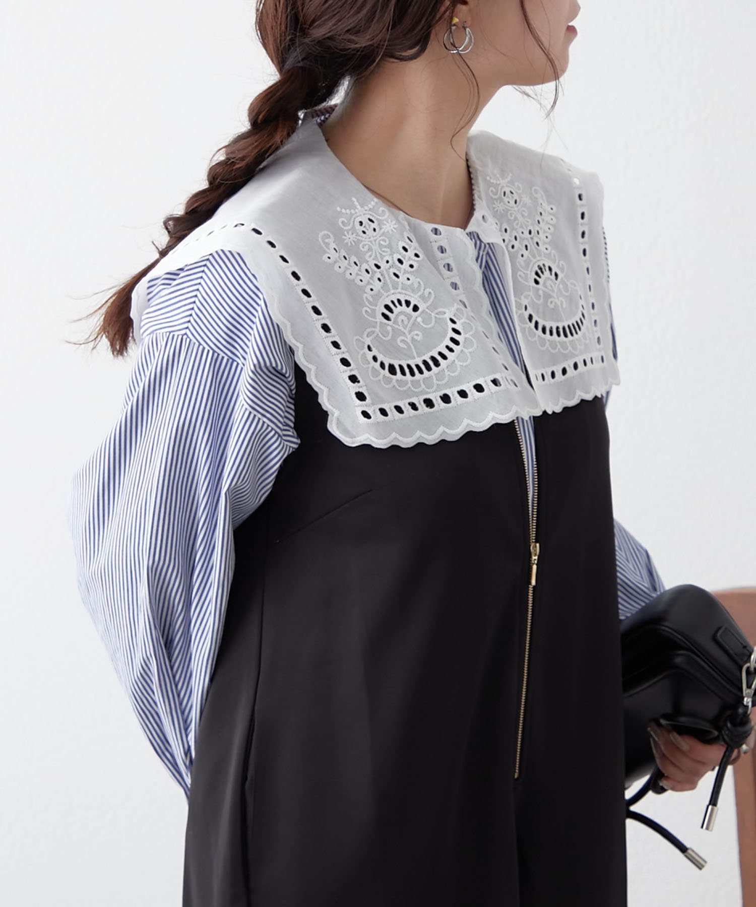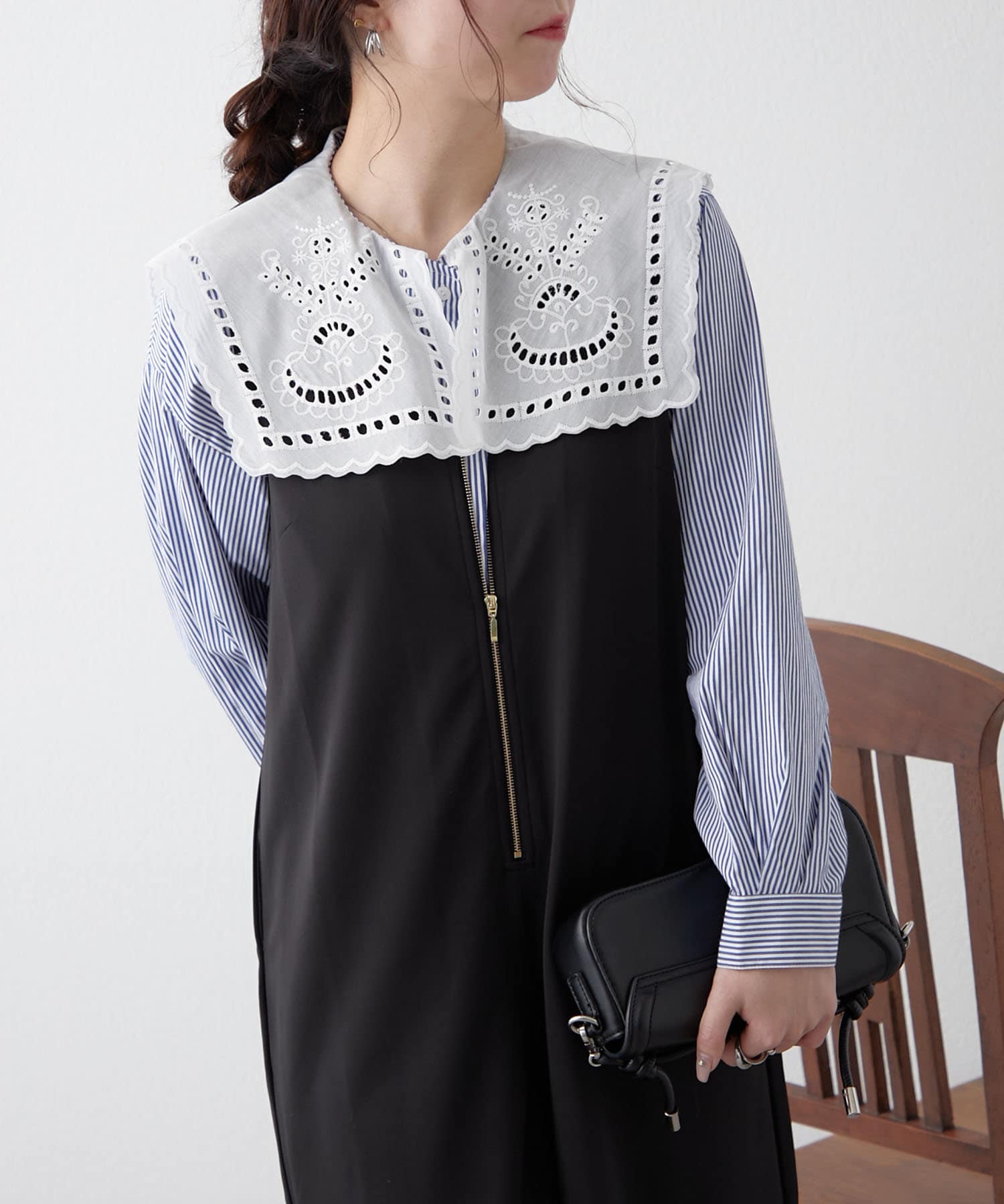 ・一枚着としてはもちろん、トップスやカーディガンとレイヤードして襟を主役にしたコーデがおすすめです。