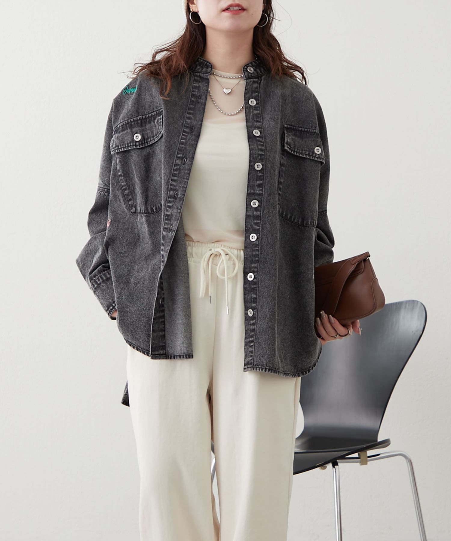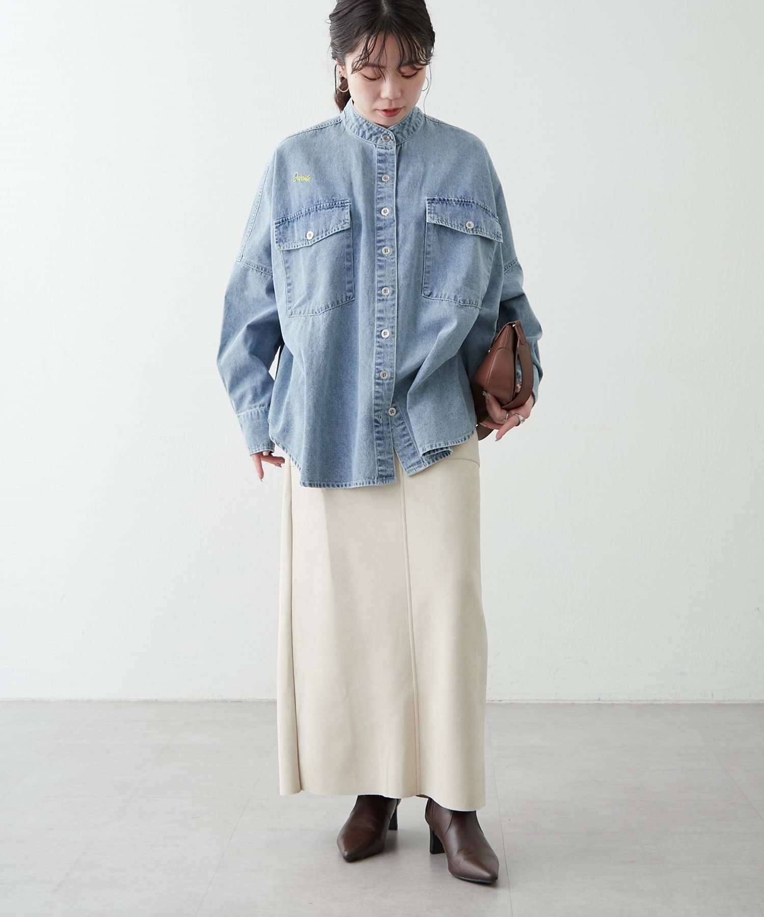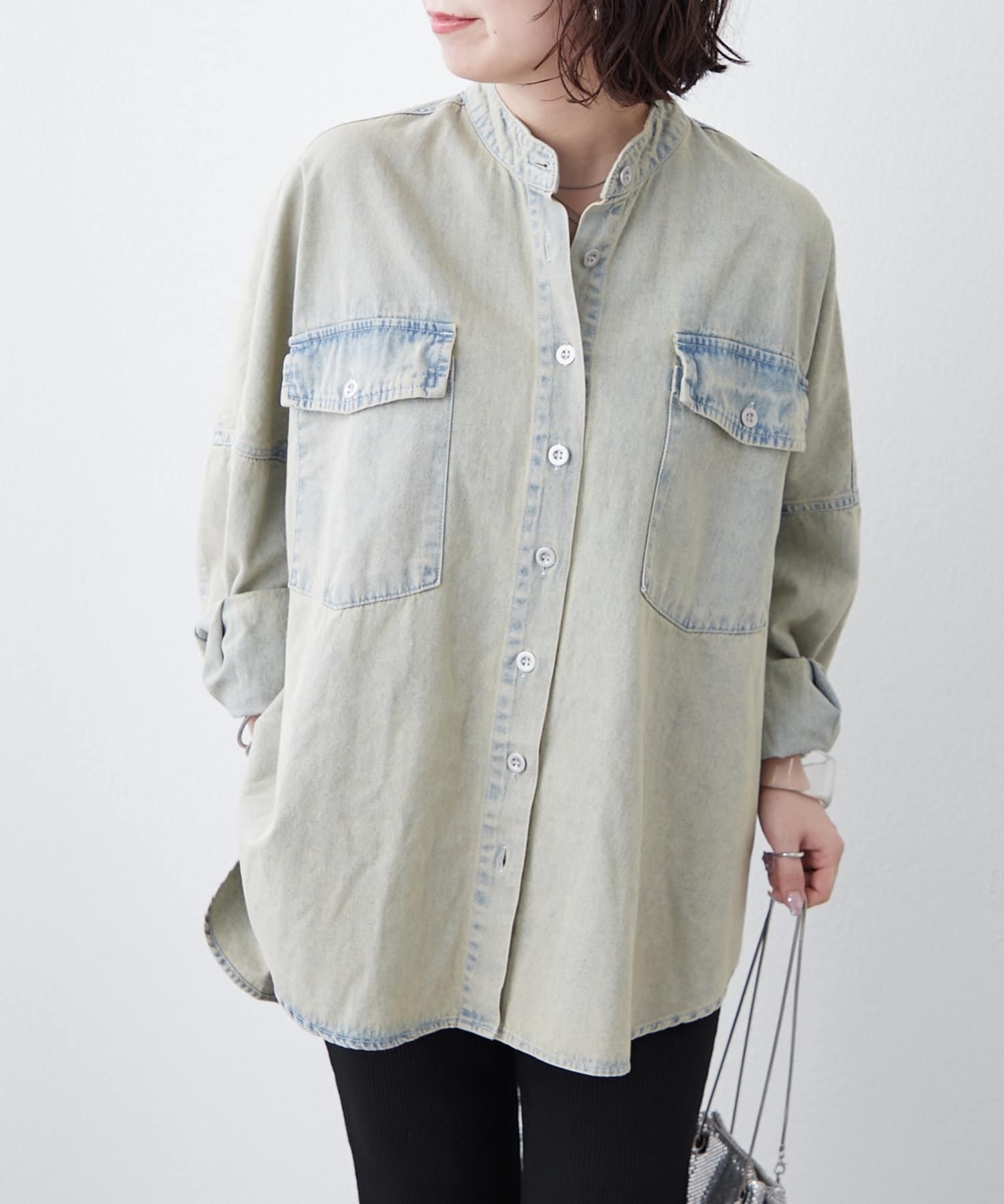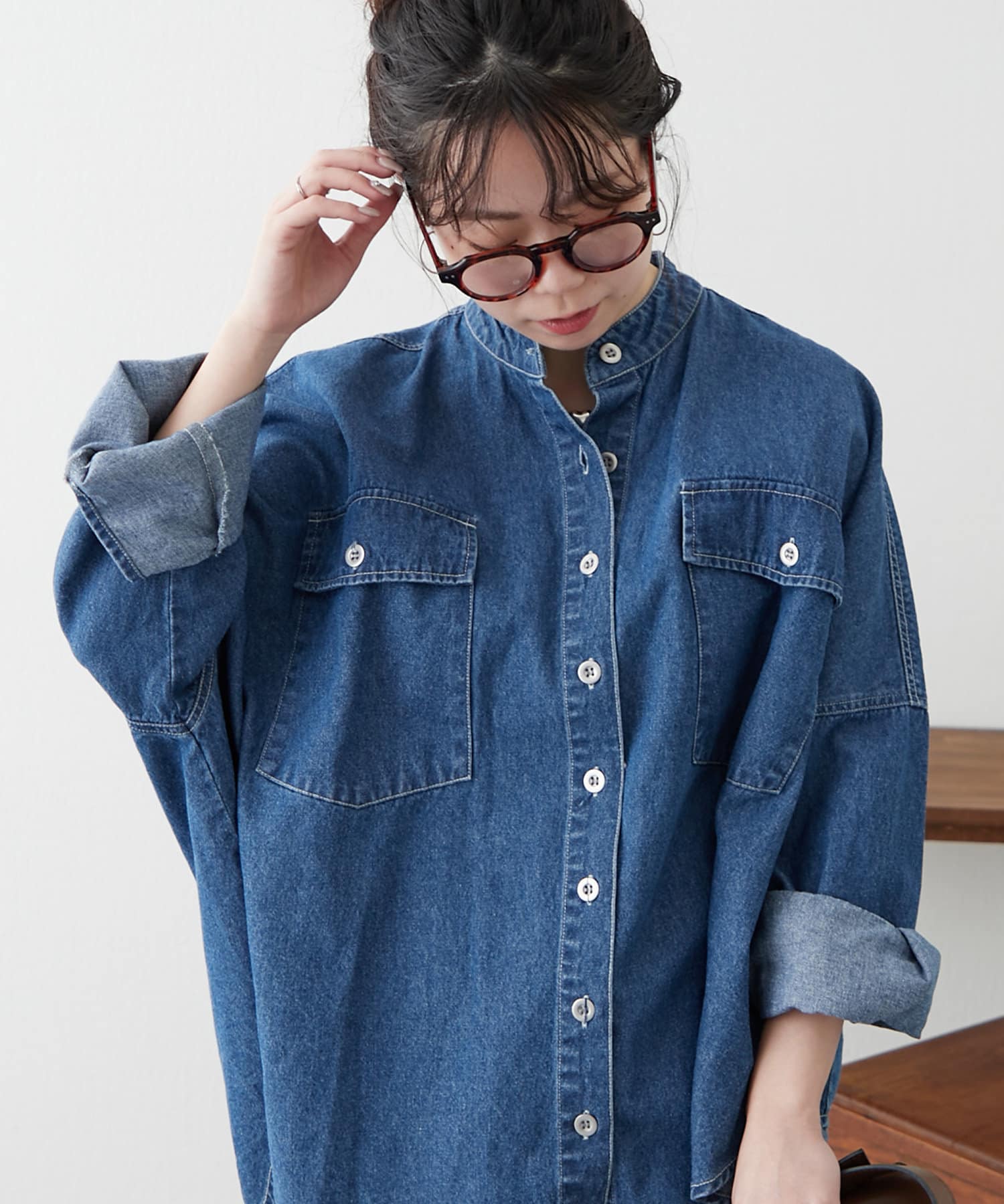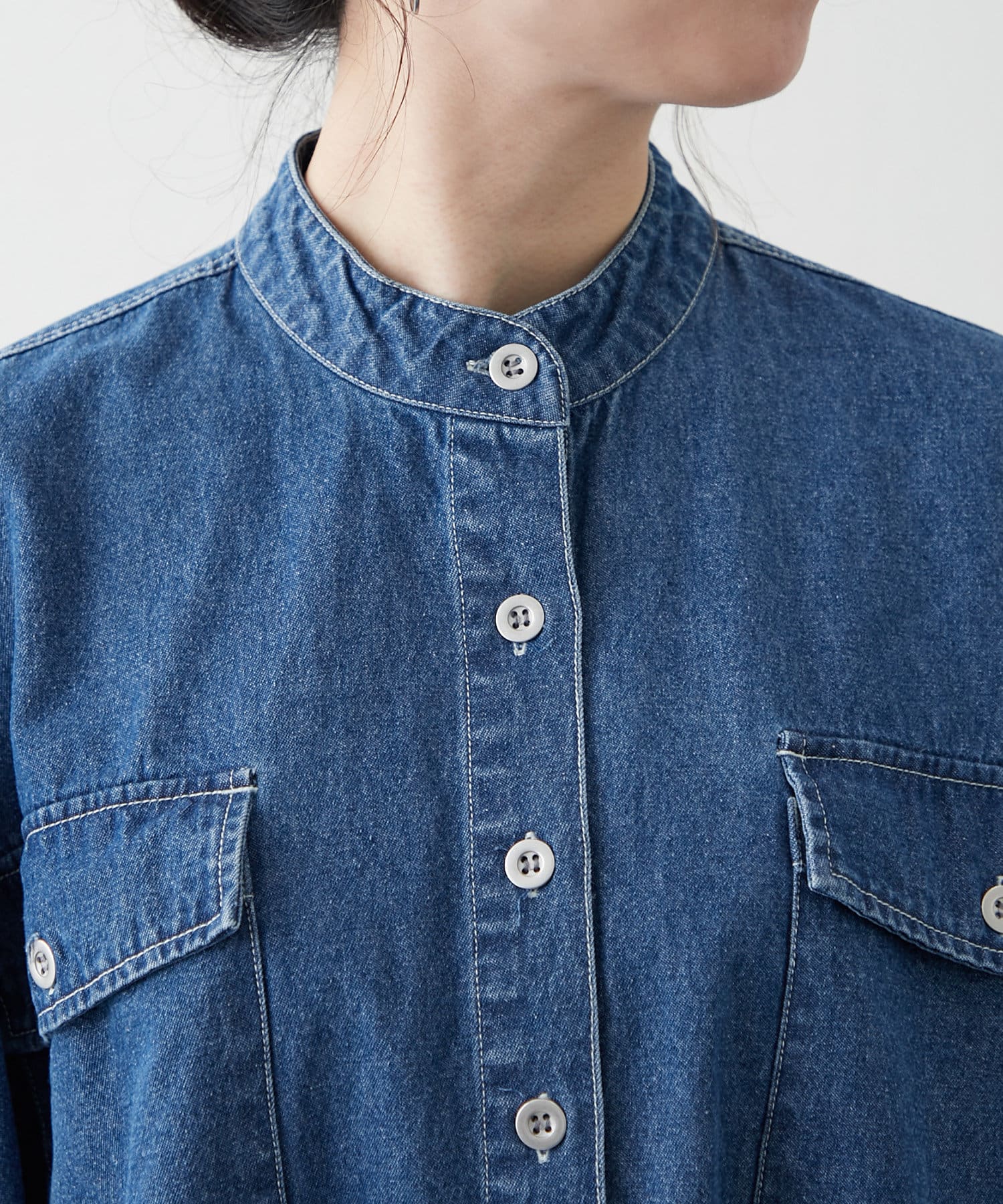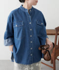 デニムシャツですが、襟なしでスッキリ見えそうなので購入しました。色味も好きで、刺繍も可愛いです。シャツよりも厚手の感じで今からの時期から長く着れそうで楽しみです。着回しコーデも参考にしたいです。