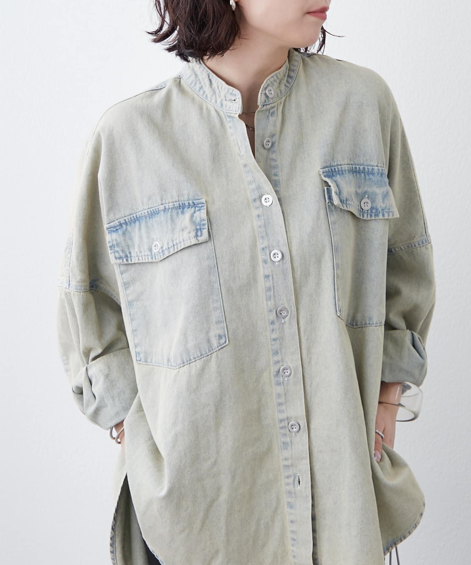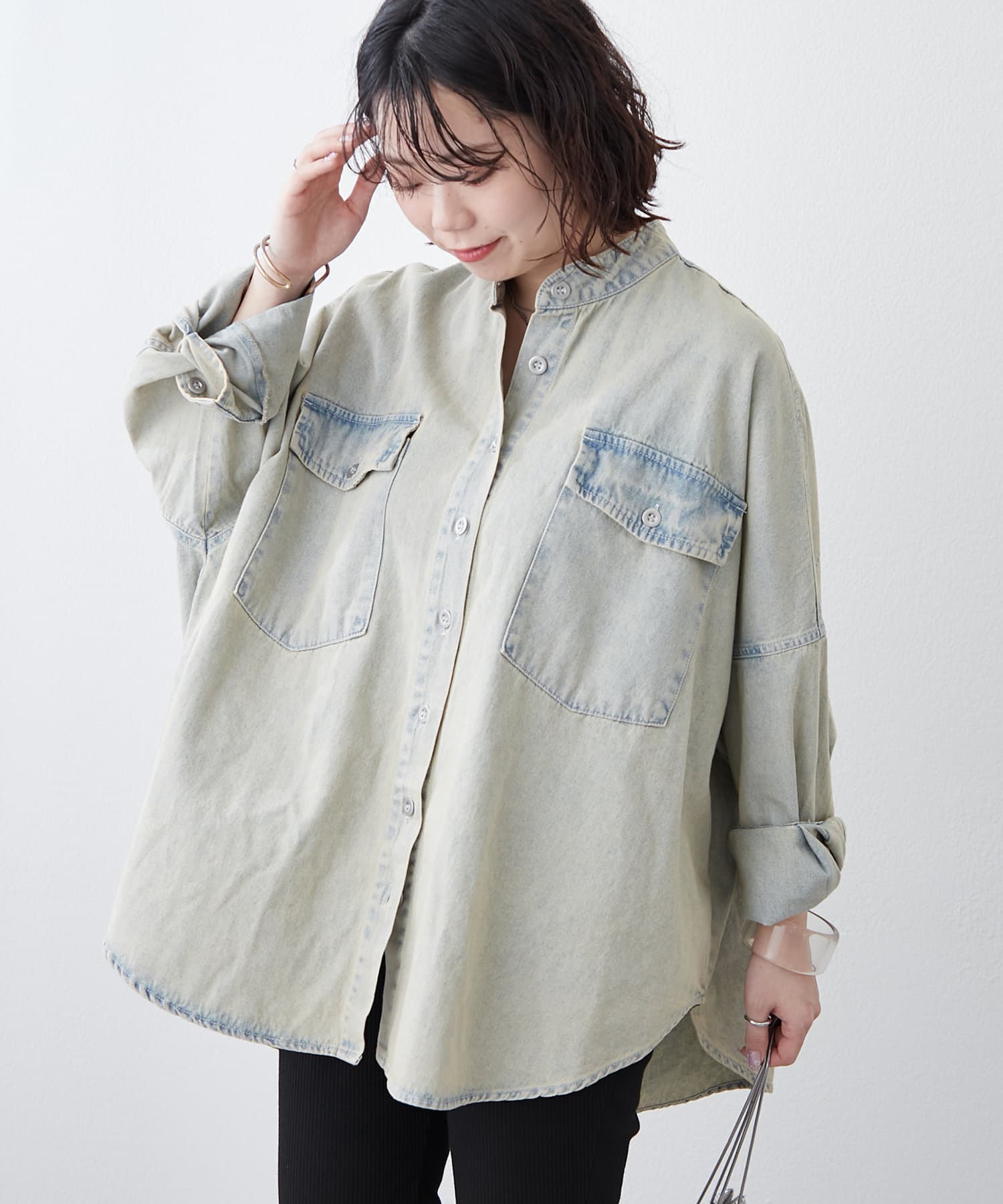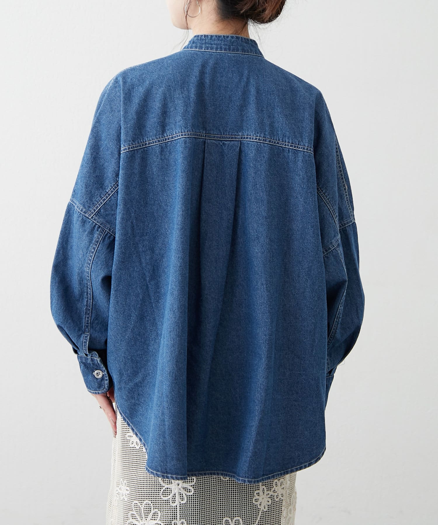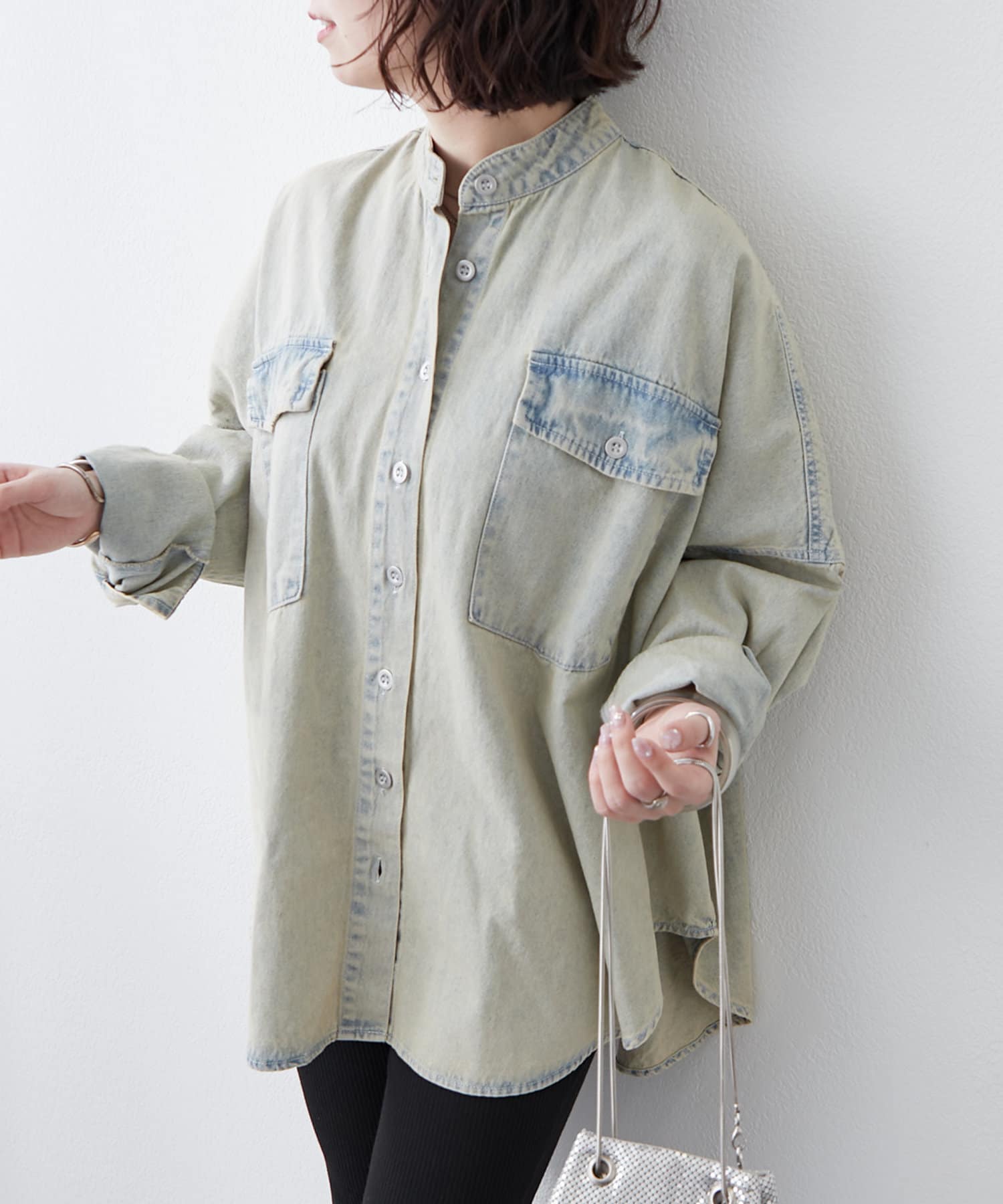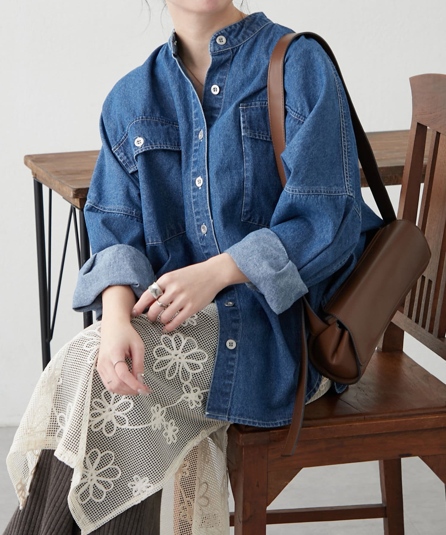 デニムシャツですが、襟なしでスッキリ見えそうなので購入しました。色味も好きで、刺繍も可愛いです。シャツよりも厚手の感じで今からの時期から長く着れそうで楽しみです。着回しコーデも参考にしたいです。
