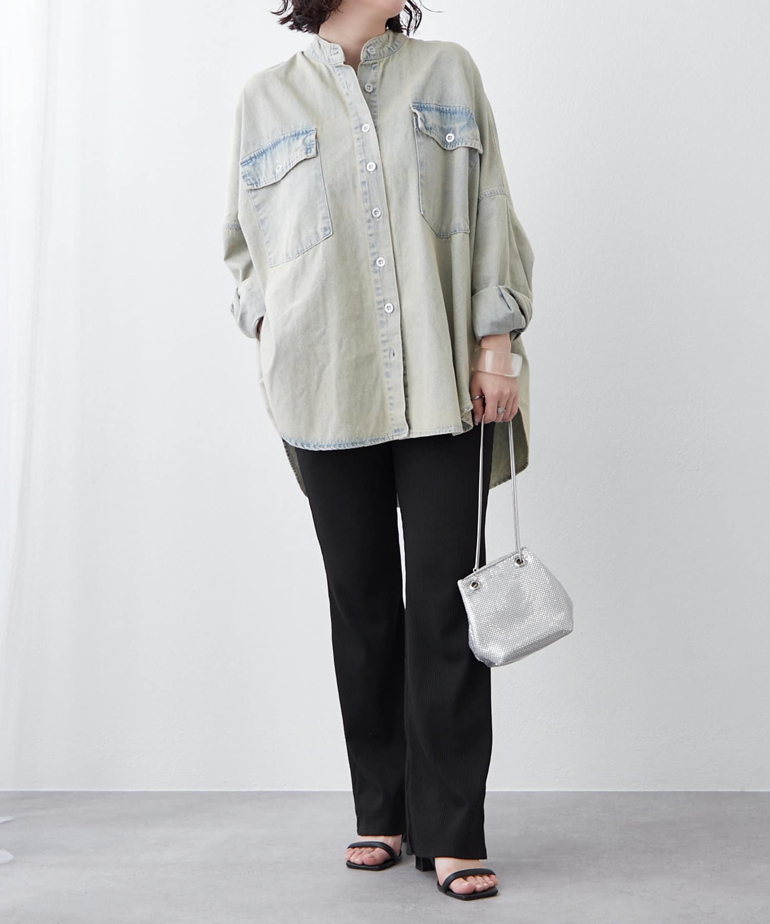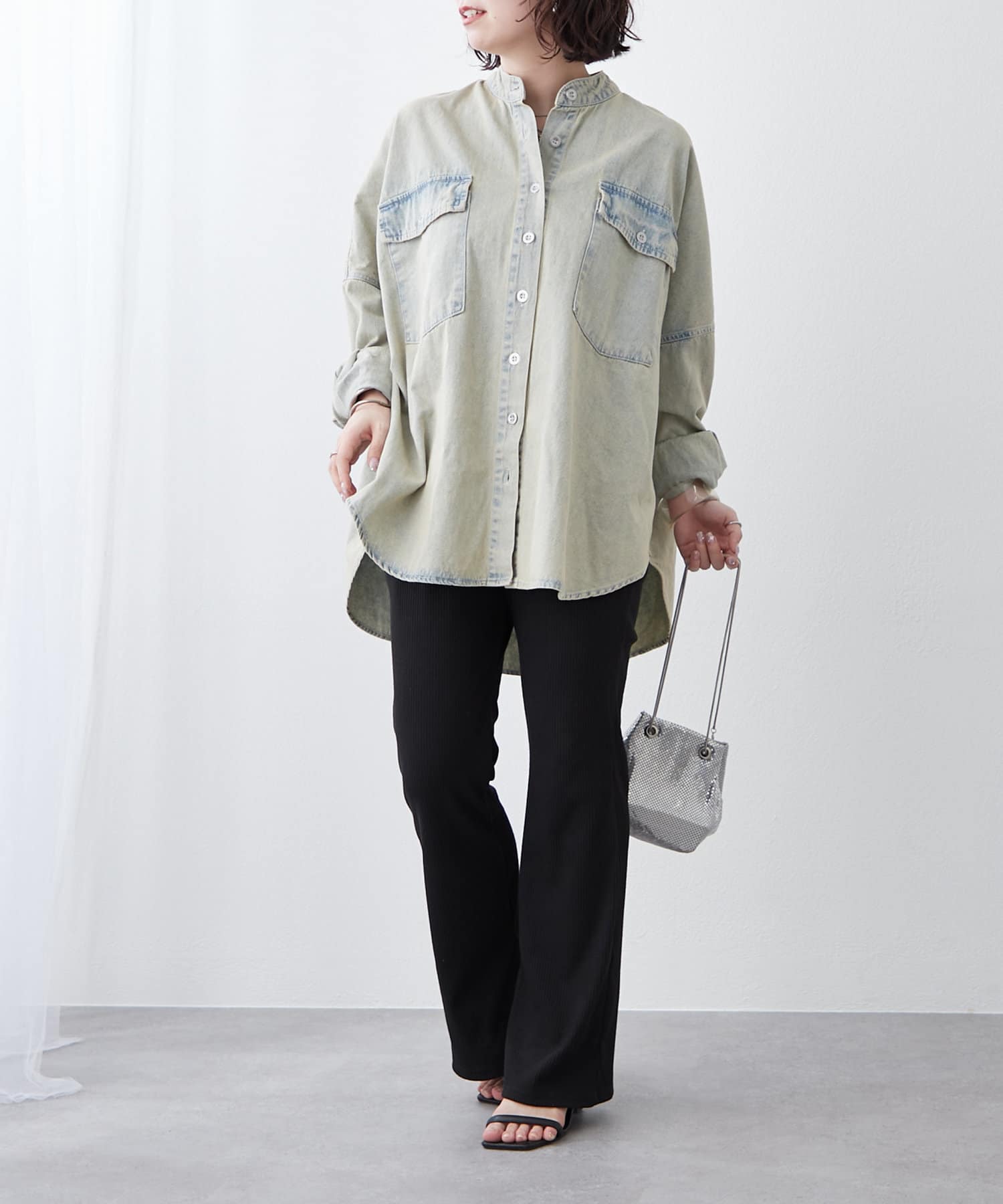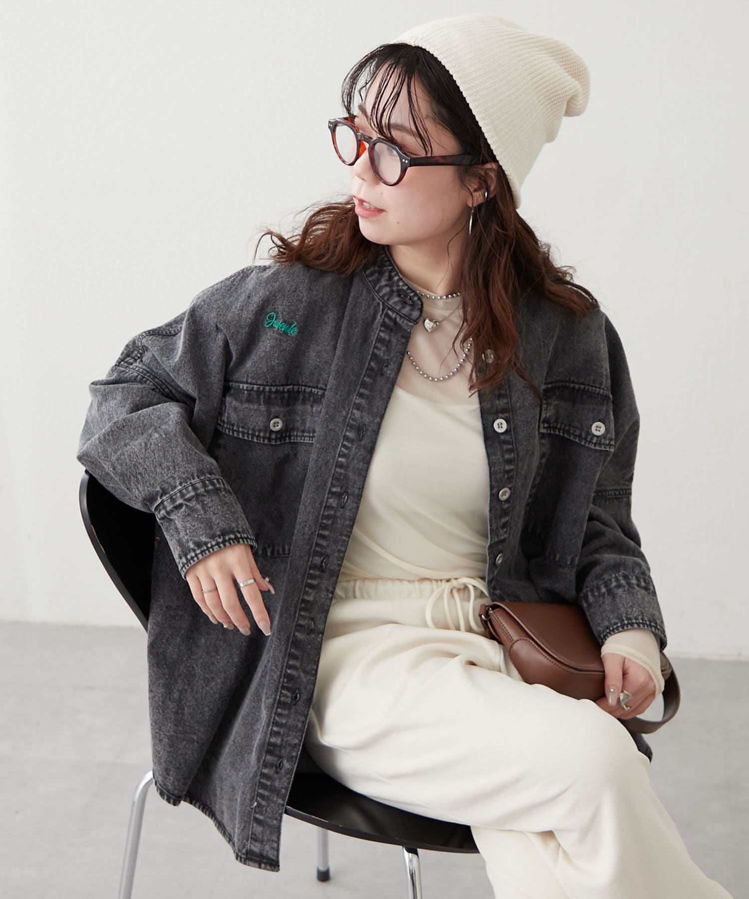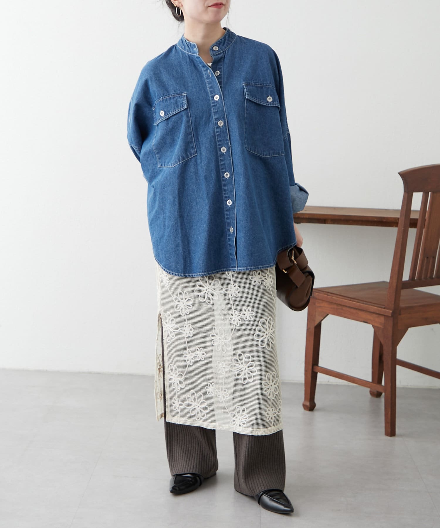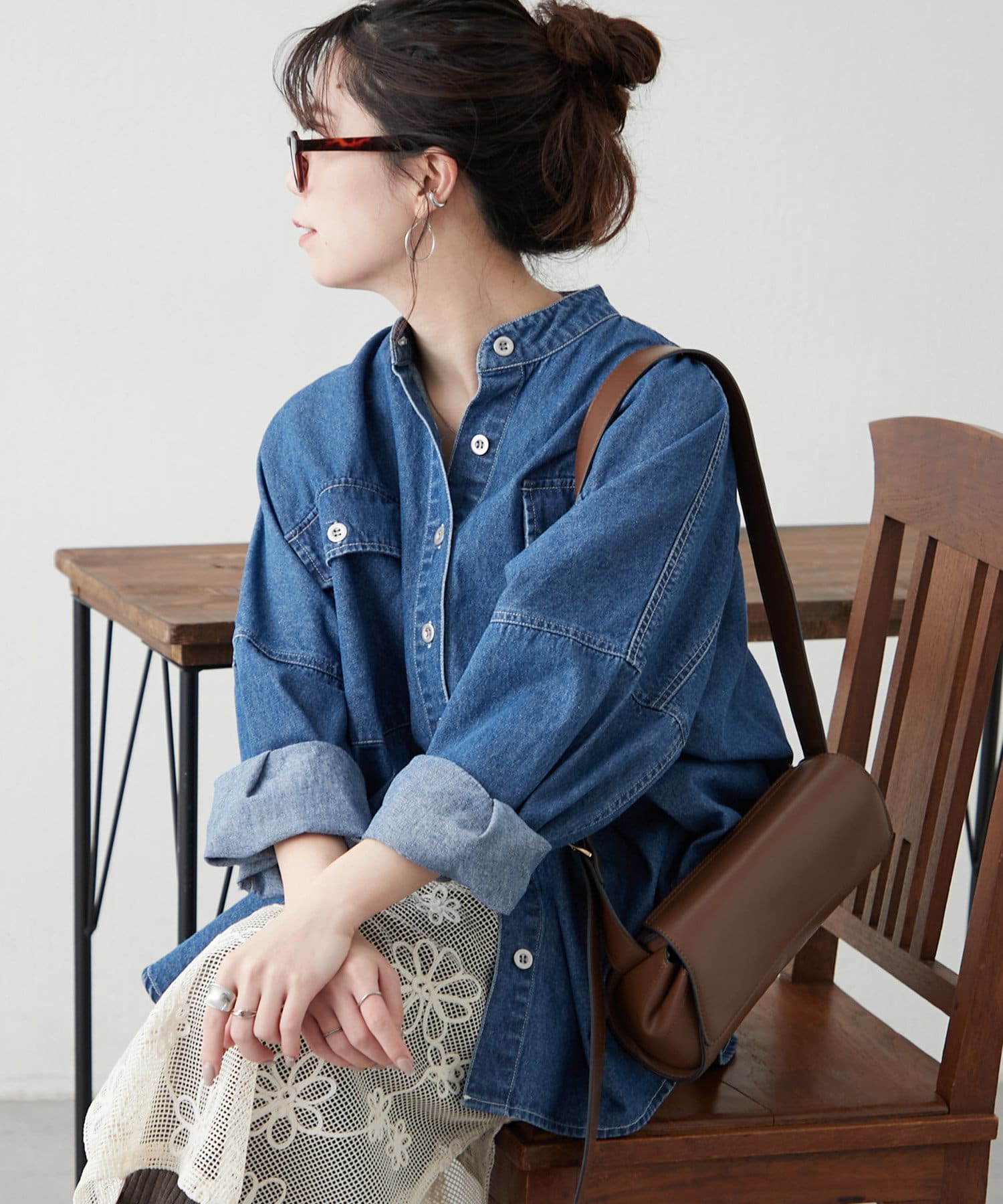 デニムシャツですが、襟なしでスッキリ見えそうなので購入しました。色味も好きで、刺繍も可愛いです。シャツよりも厚手の感じで今からの時期から長く着れそうで楽しみです。着回しコーデも参考にしたいです。