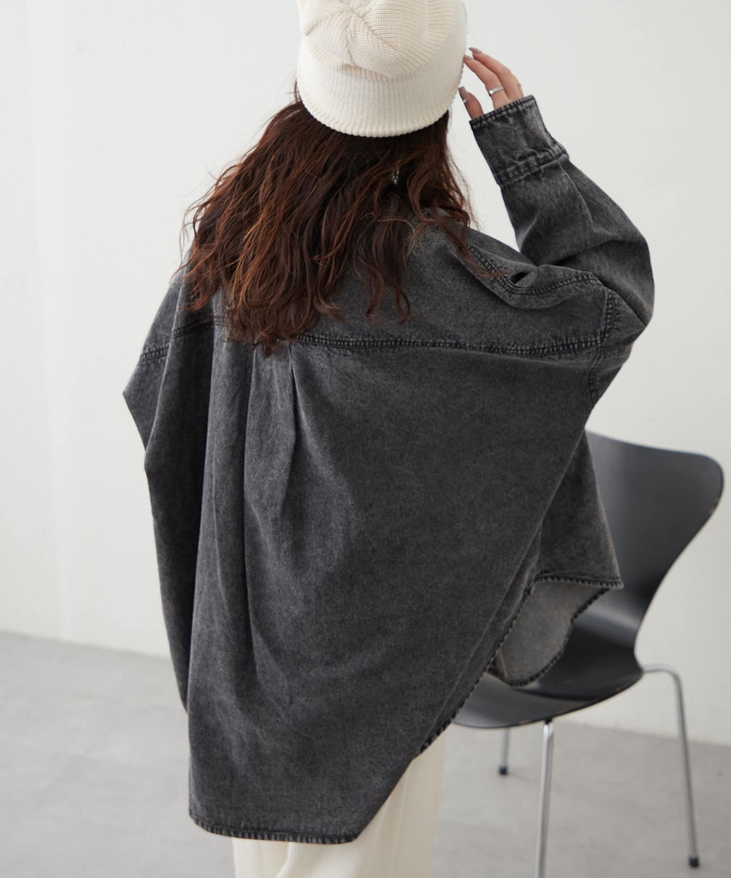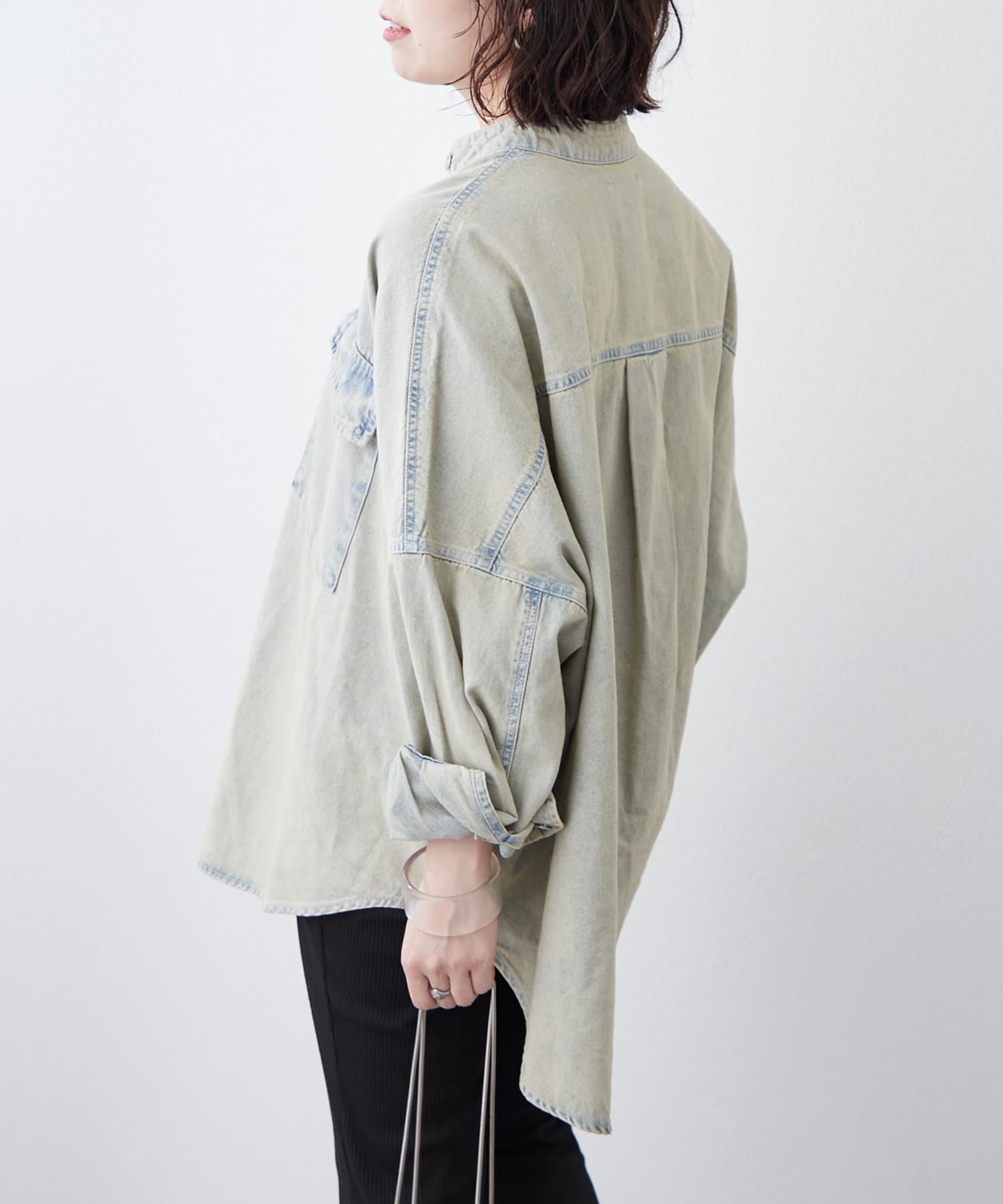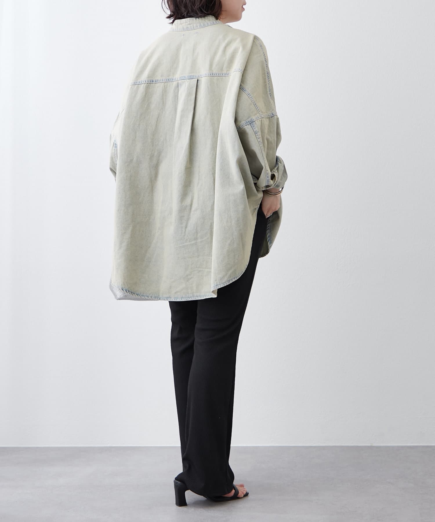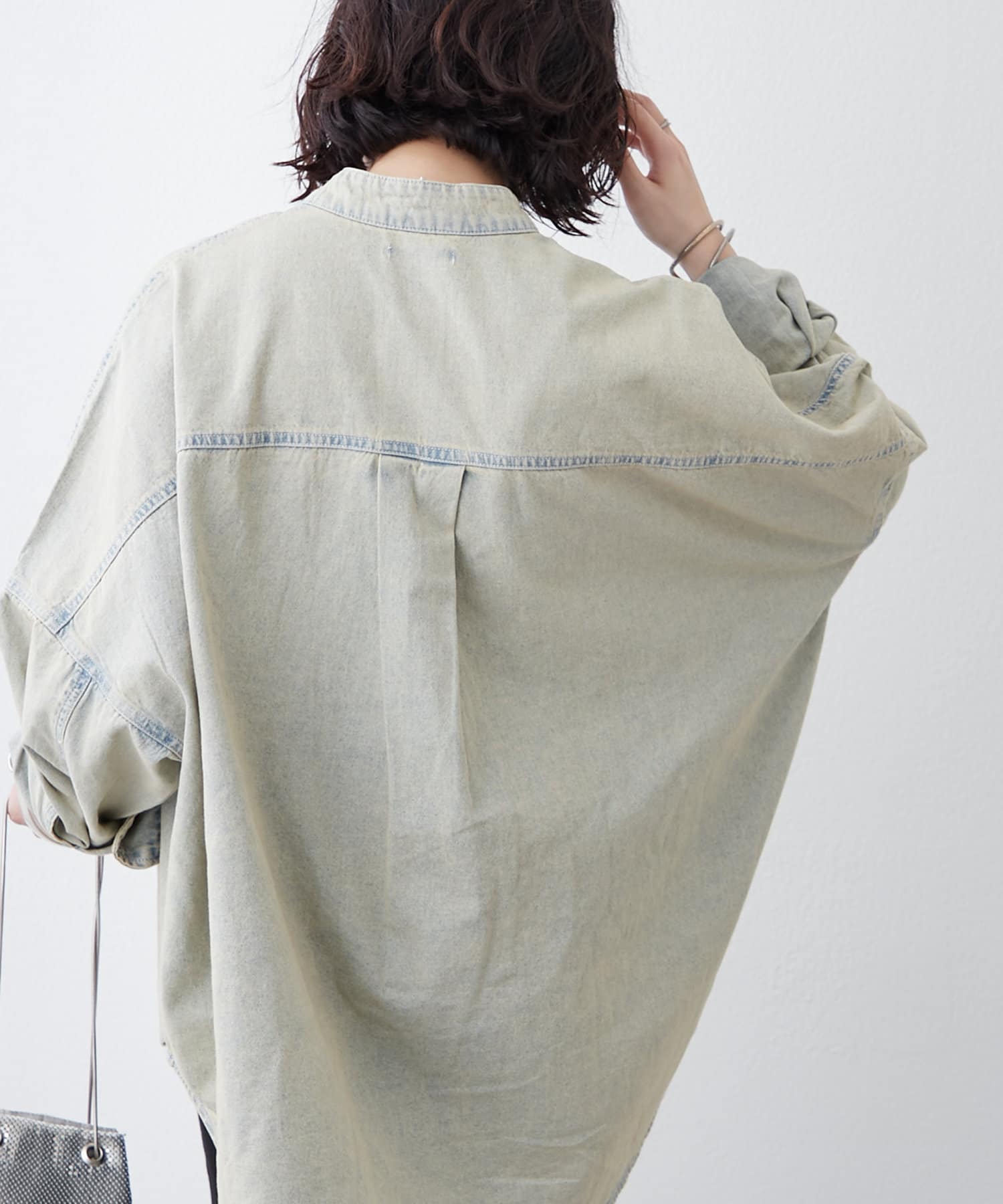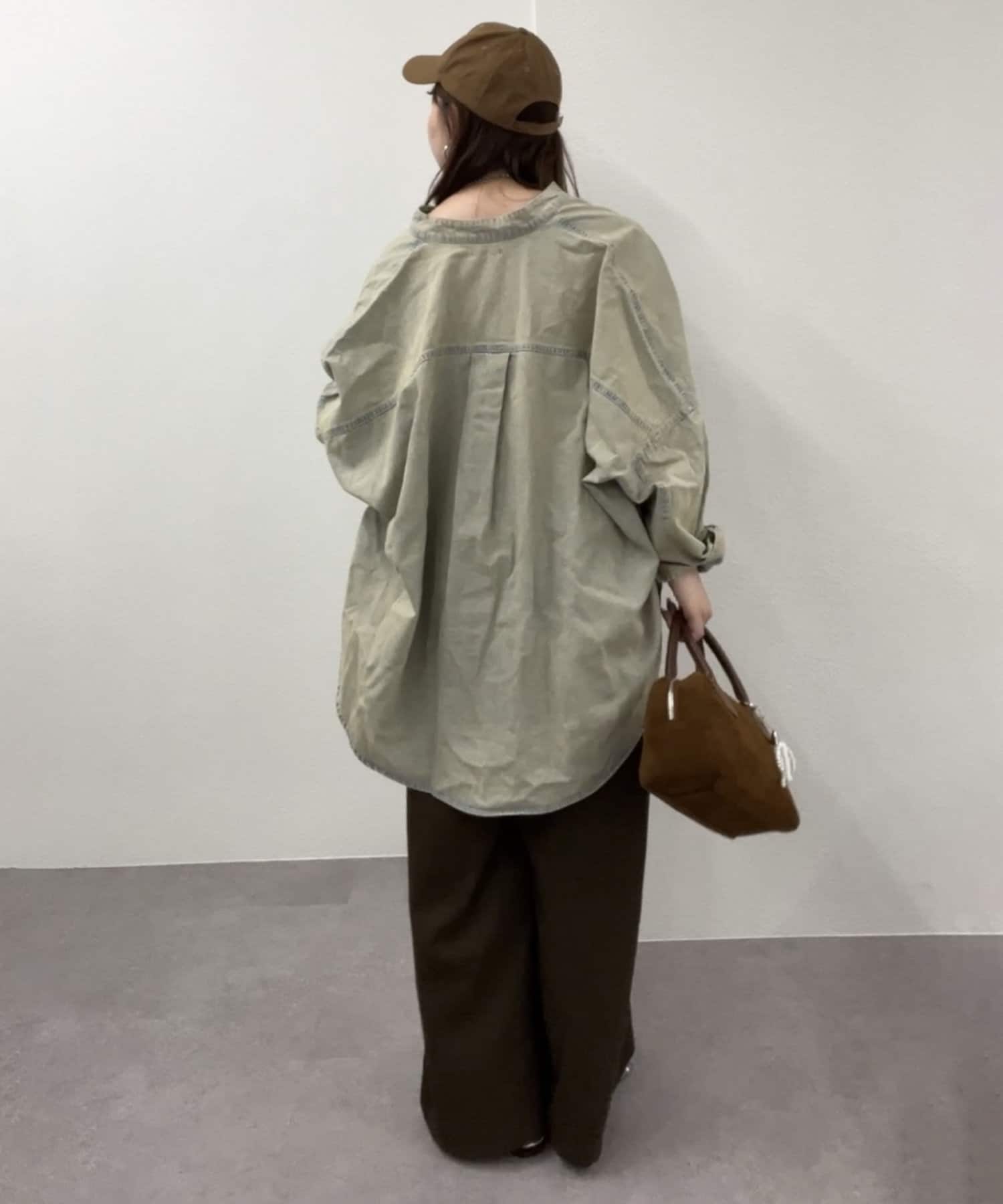 ・すっきり見えするバンドカラーデザインと身幅たっぷりなドルマンシルエットがポイント。