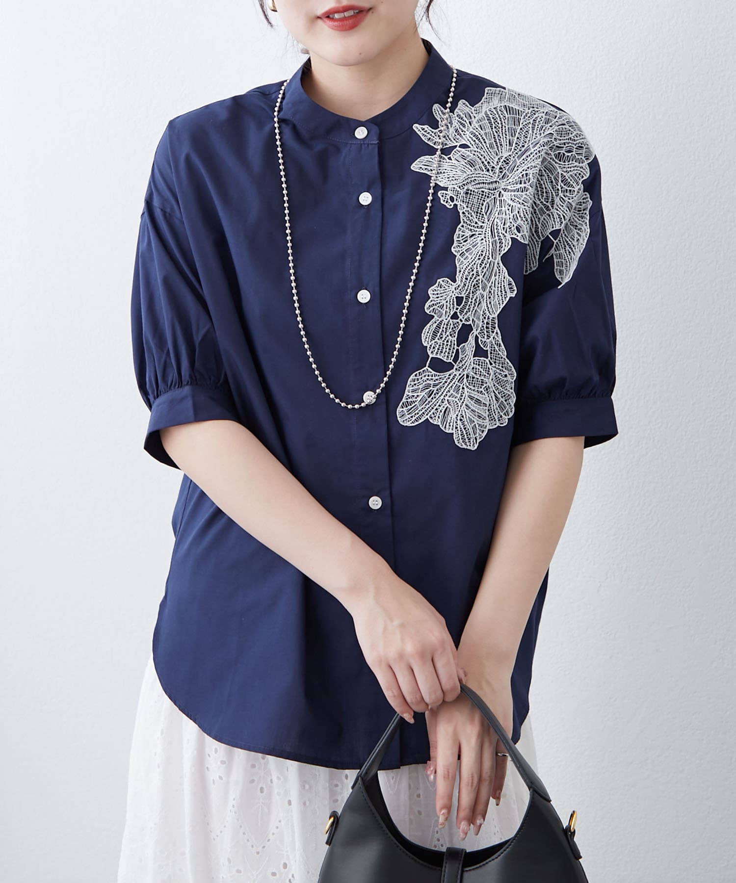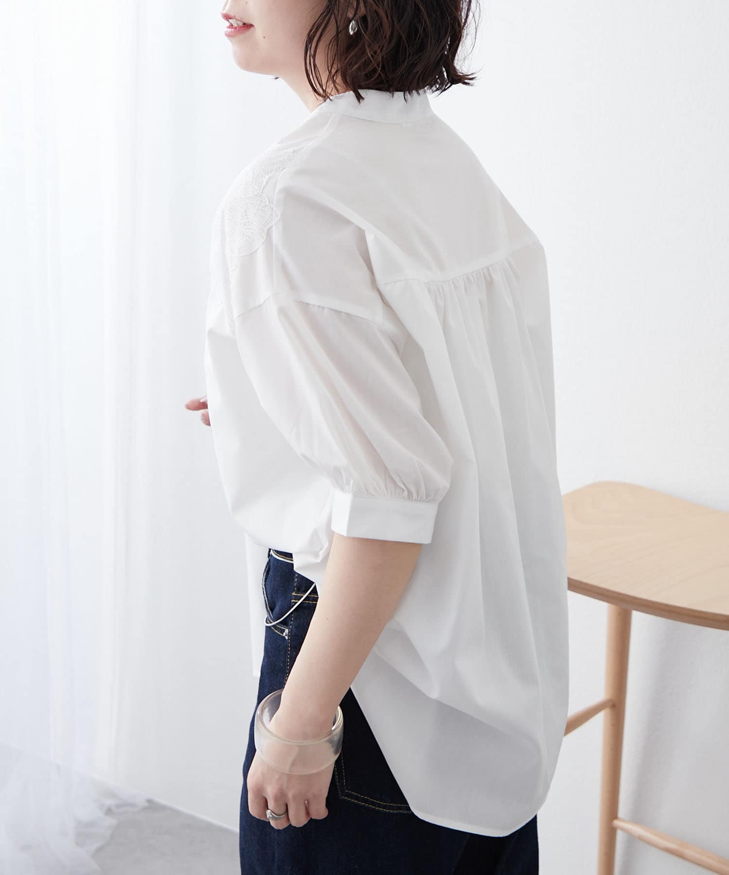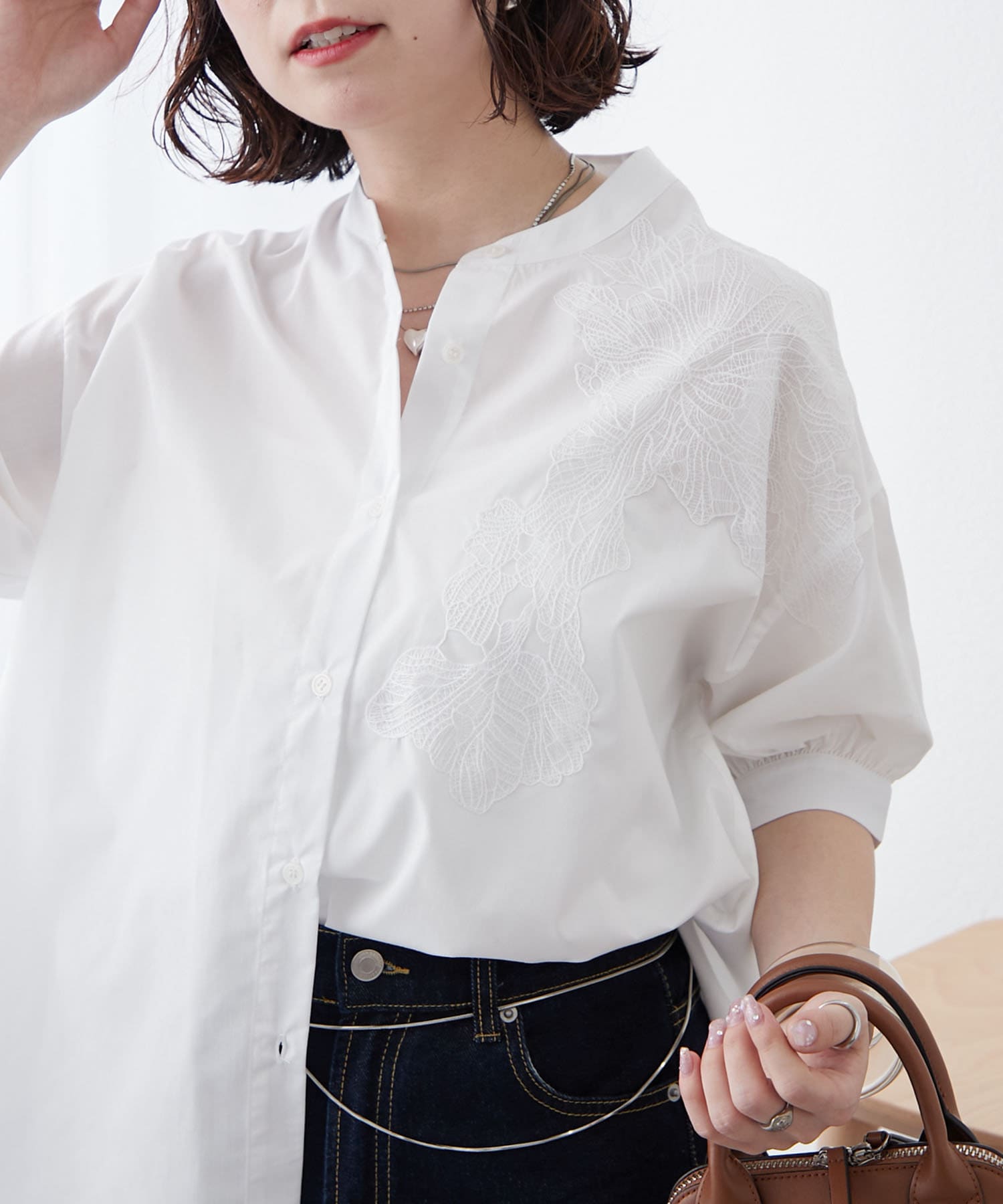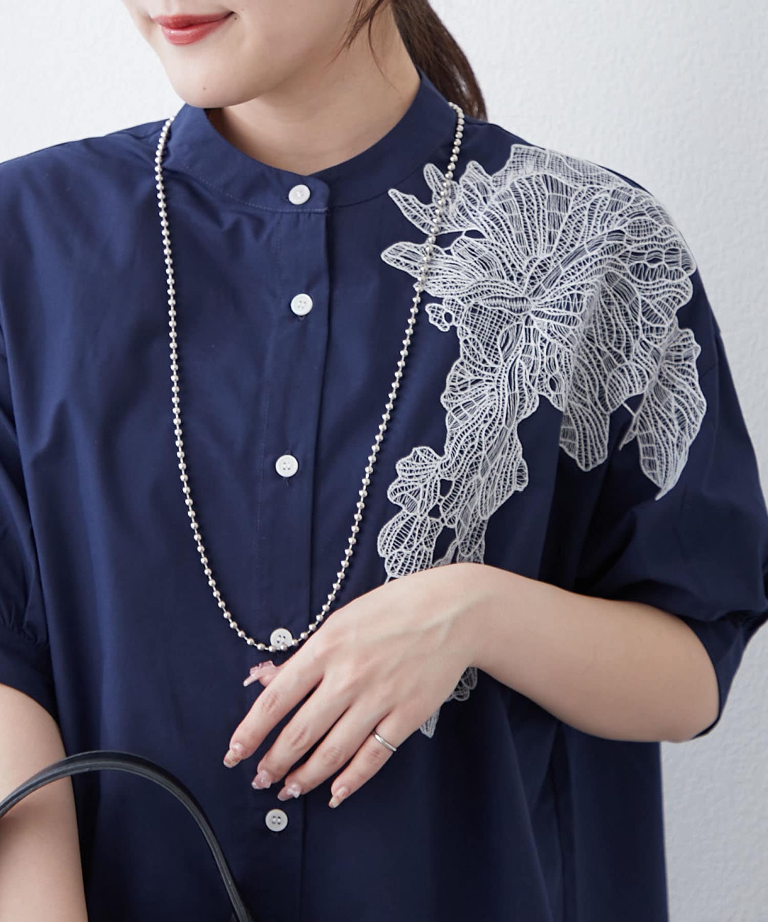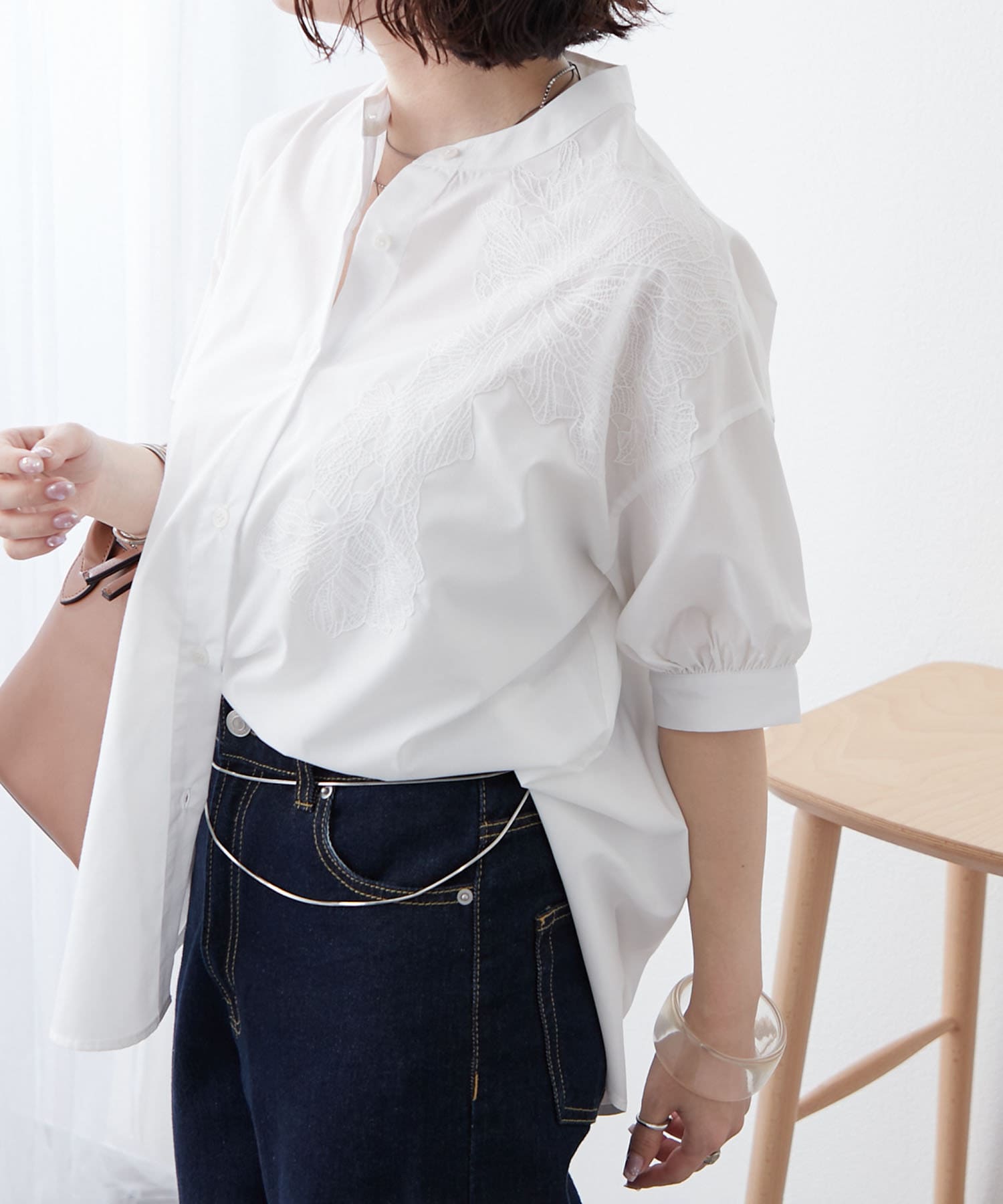 ・繊細なレースを肩にあしらったバンドカラーシャツブラウス