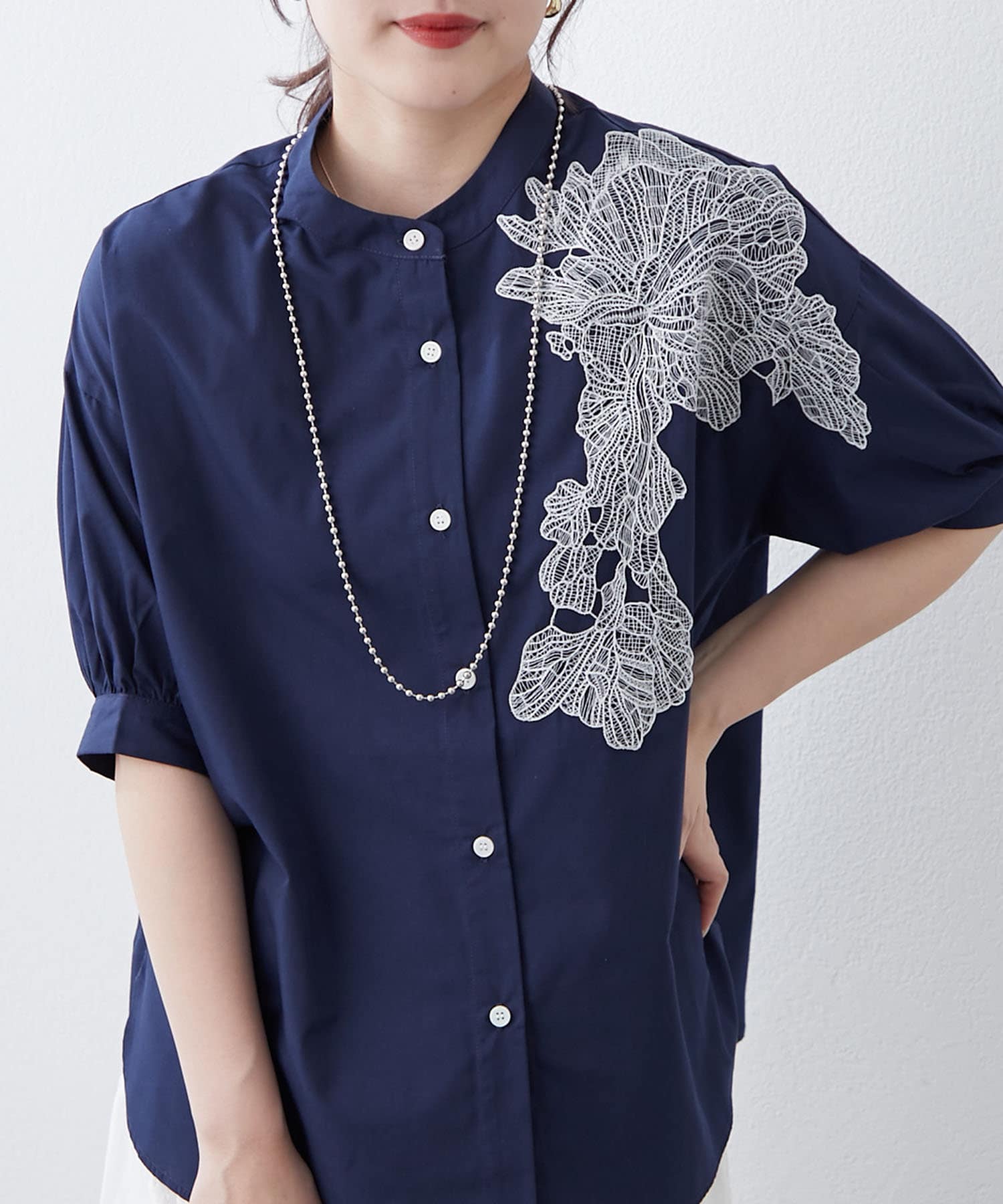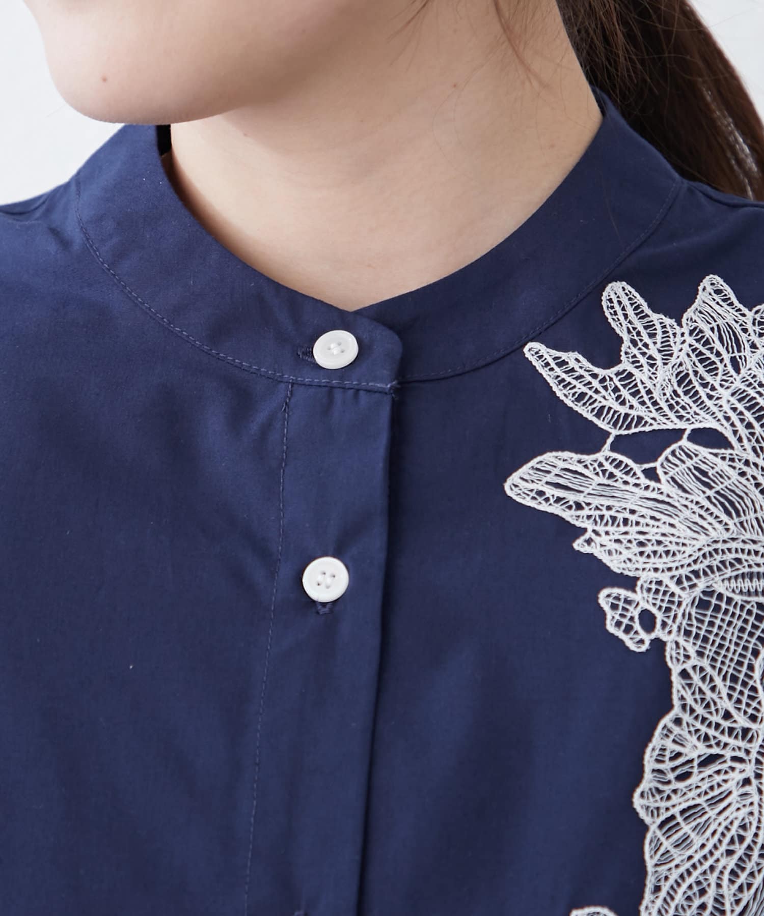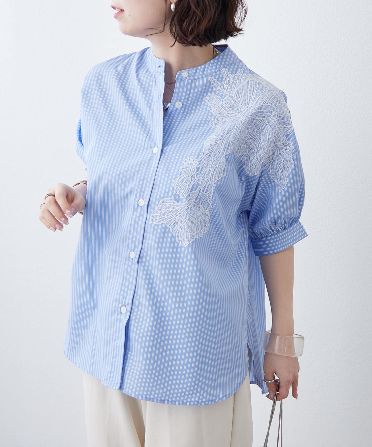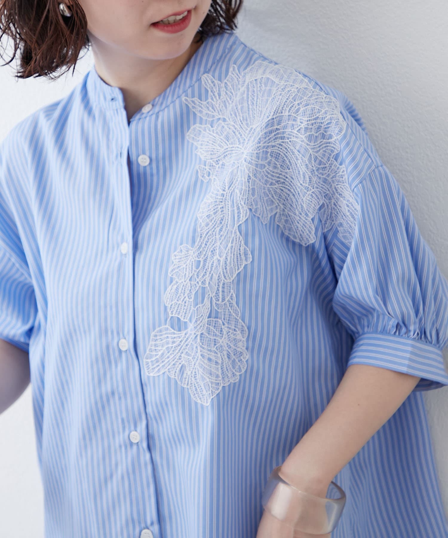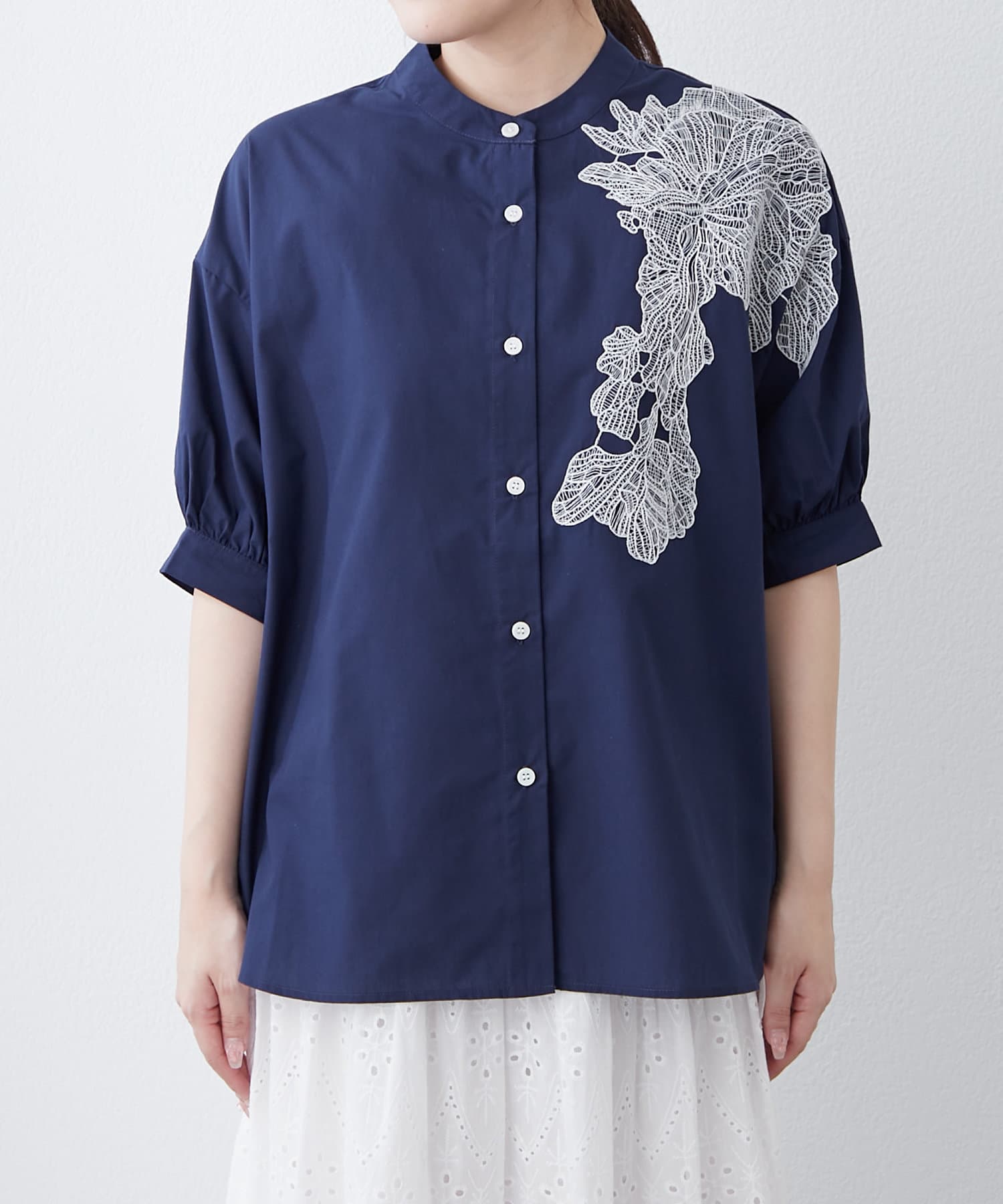 ・繊細なレースを肩にあしらったバンドカラーシャツブラウス