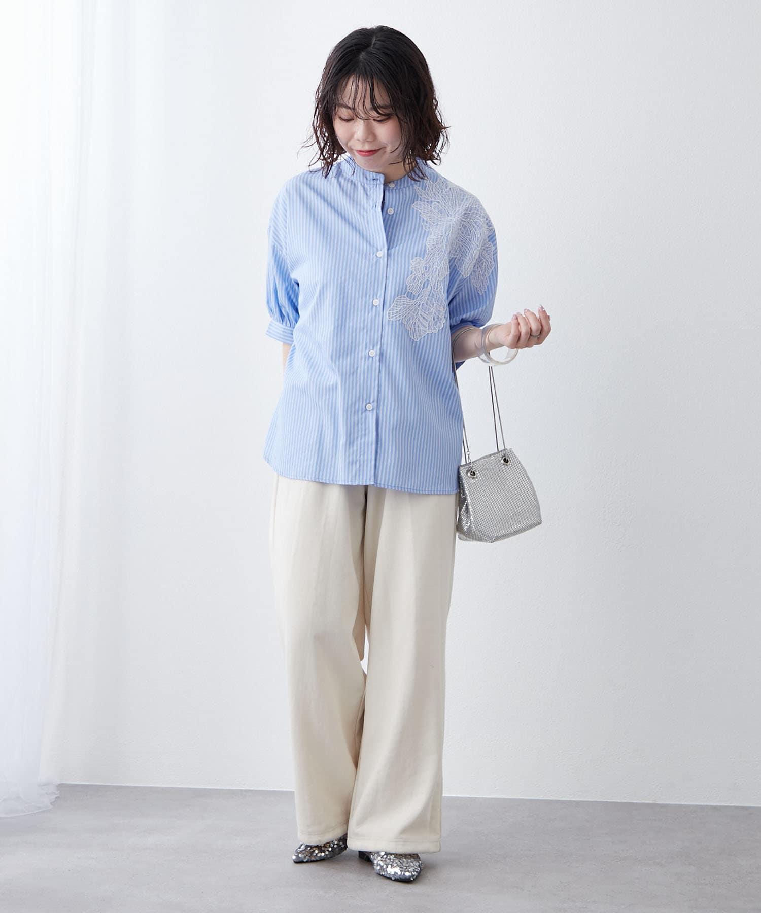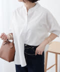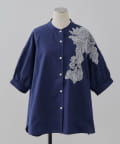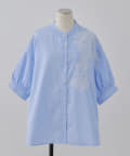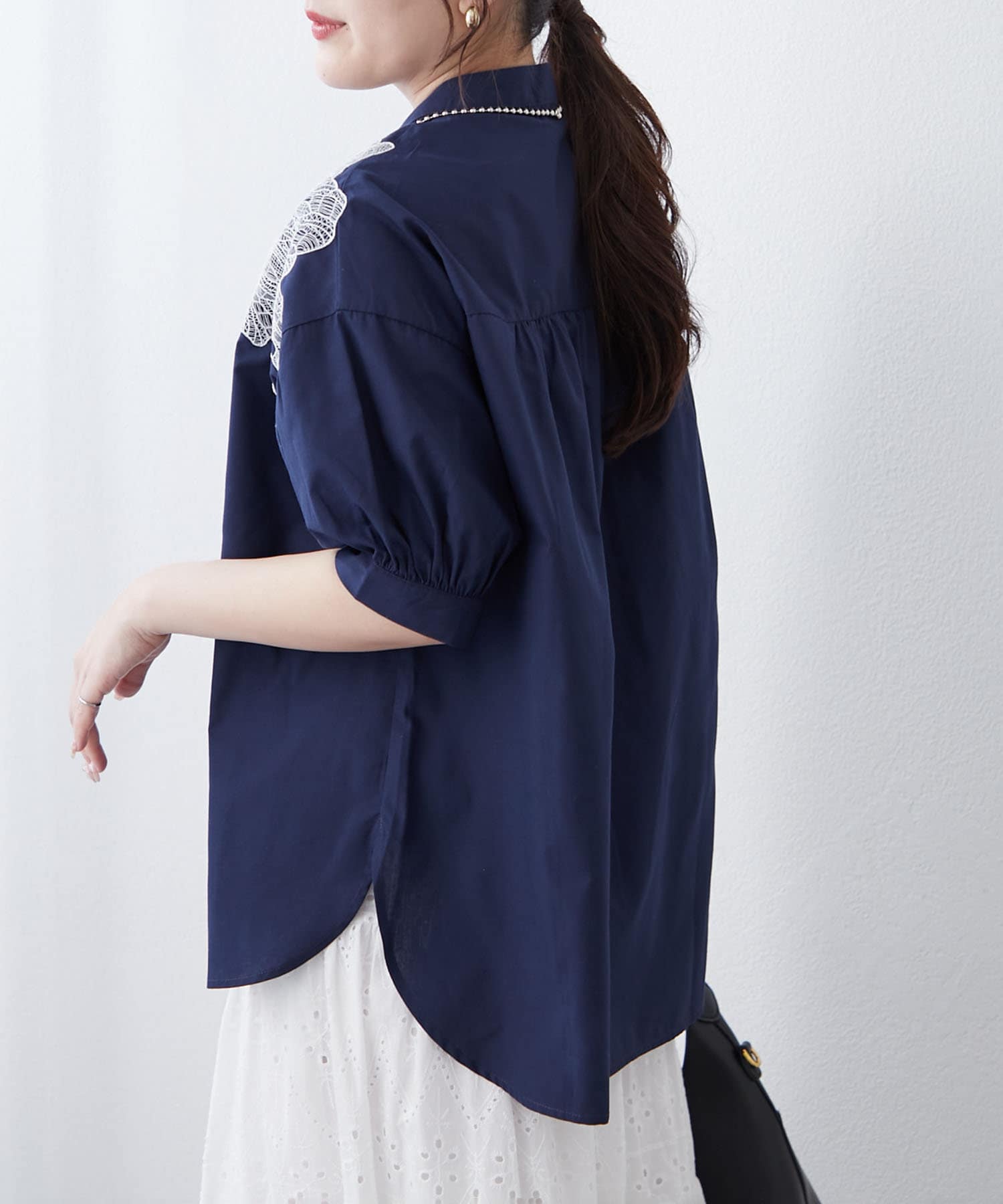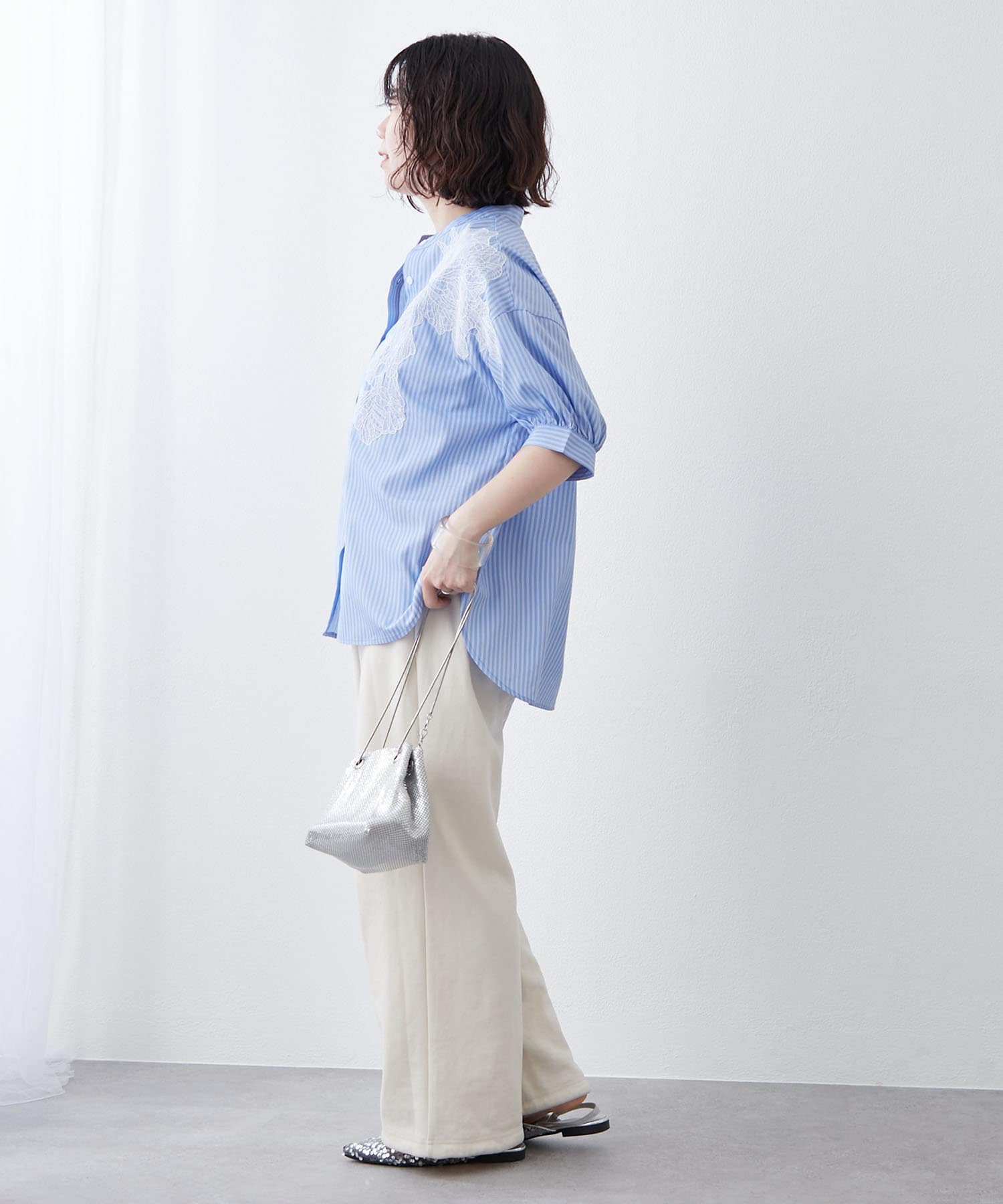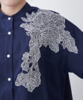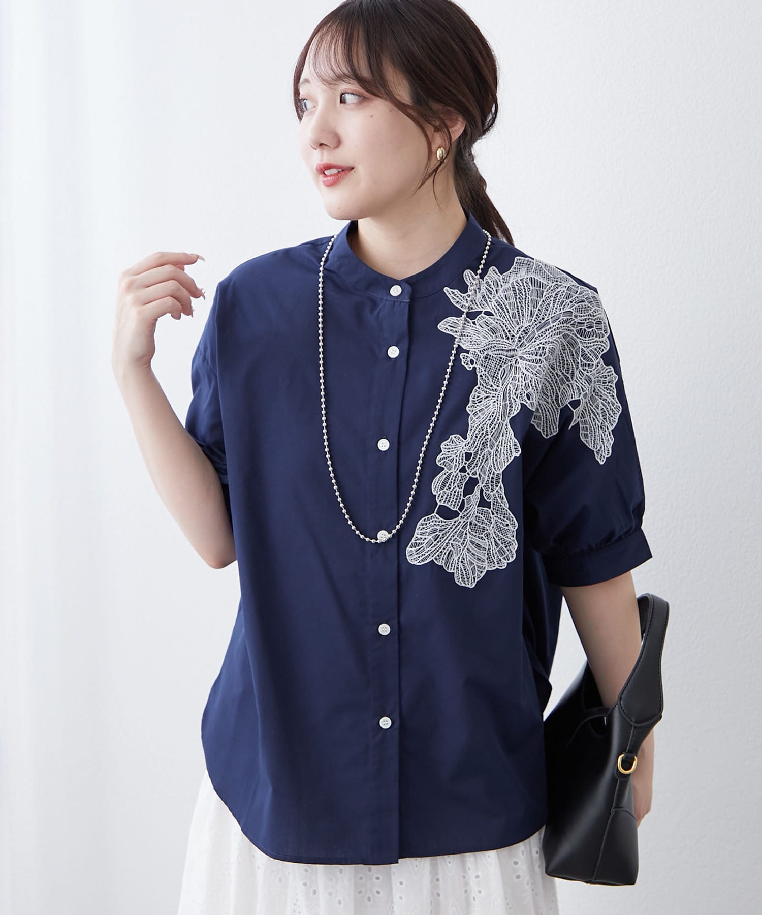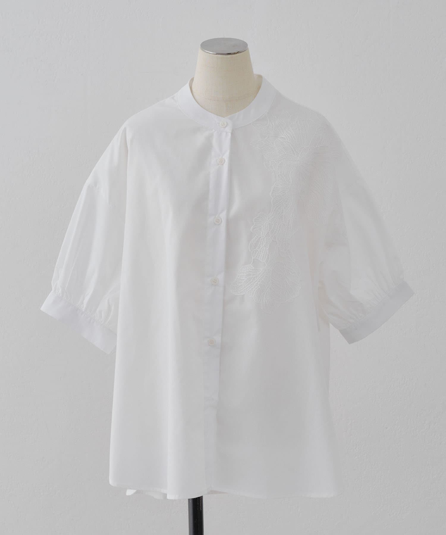 ・繊細なレースを肩にあしらったバンドカラーシャツブラウス