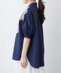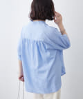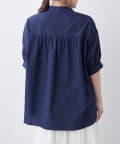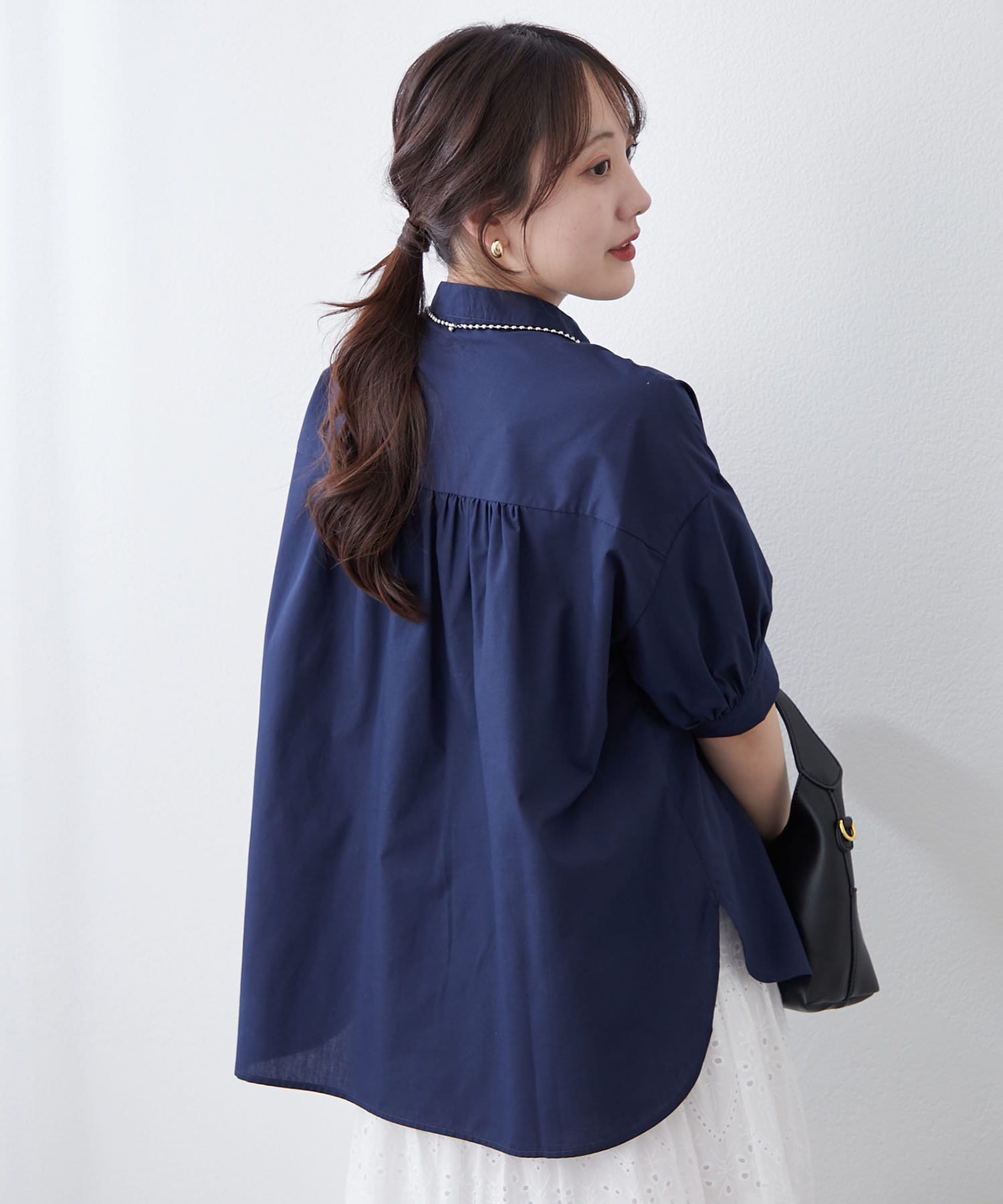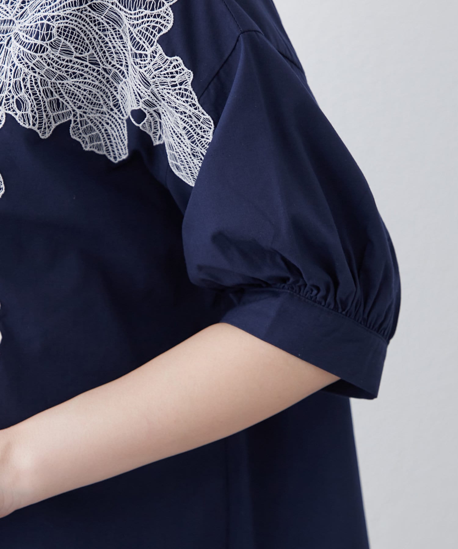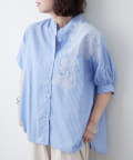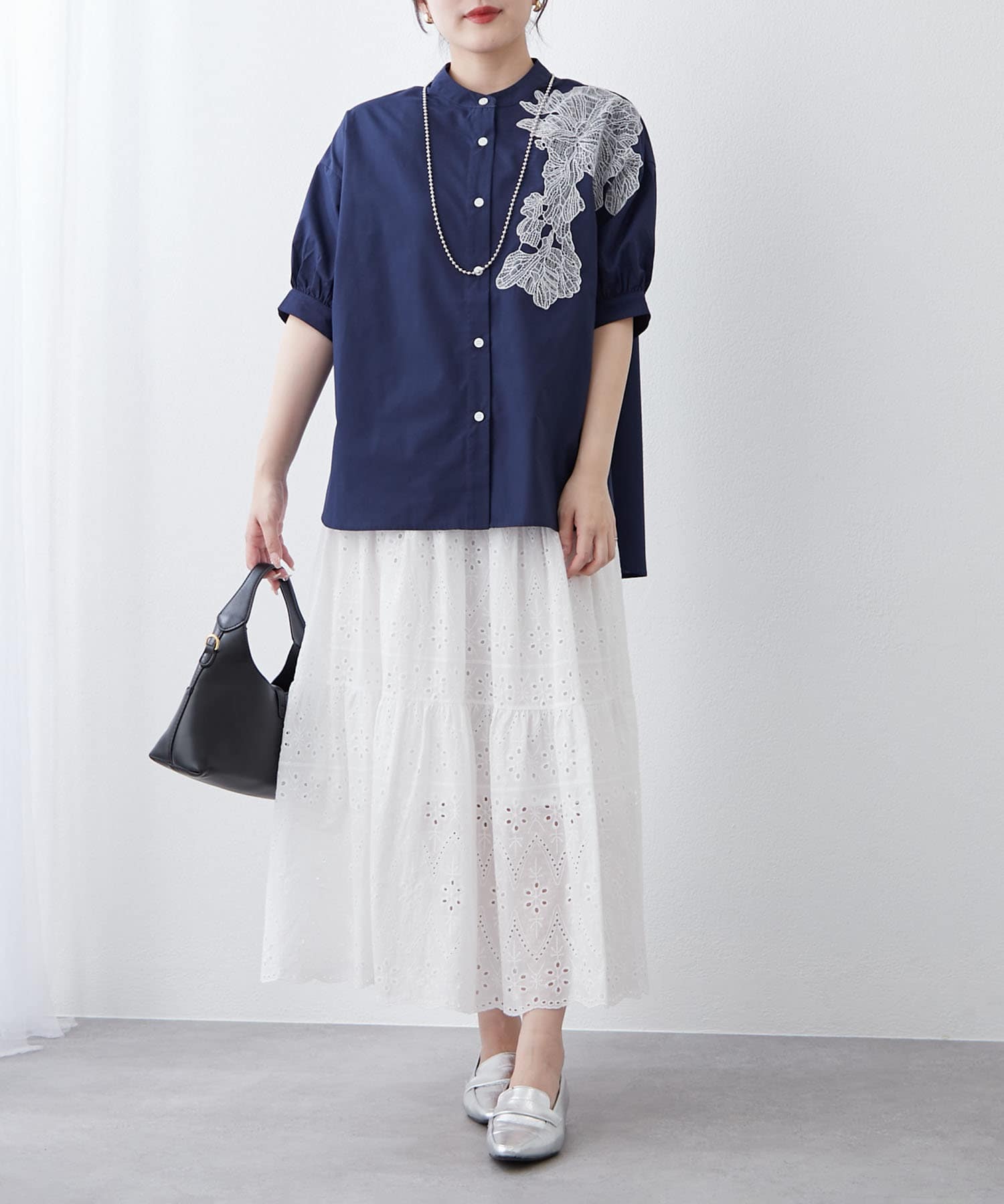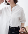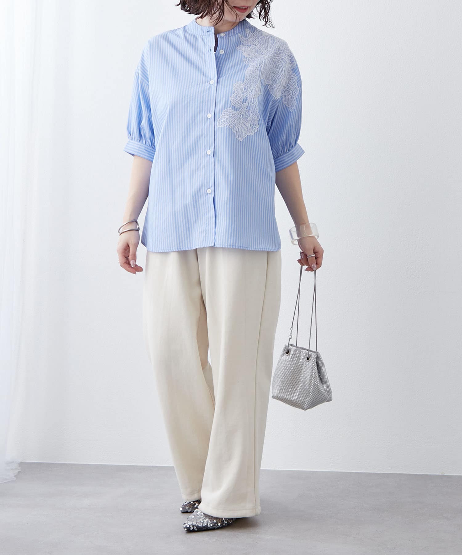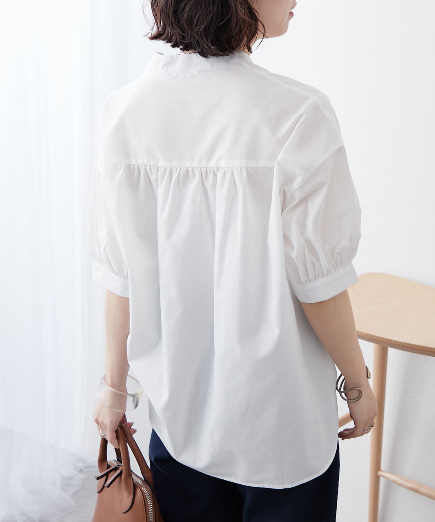 ・繊細なレースを肩にあしらったバンドカラーシャツブラウス