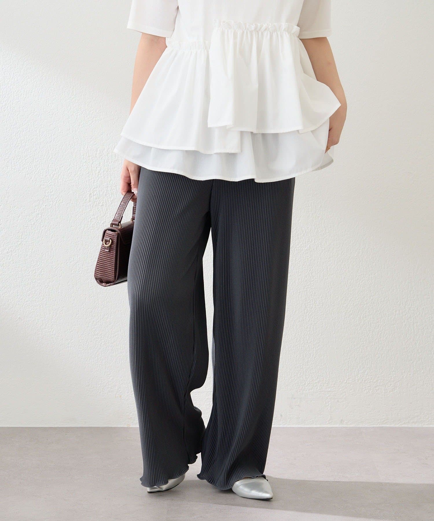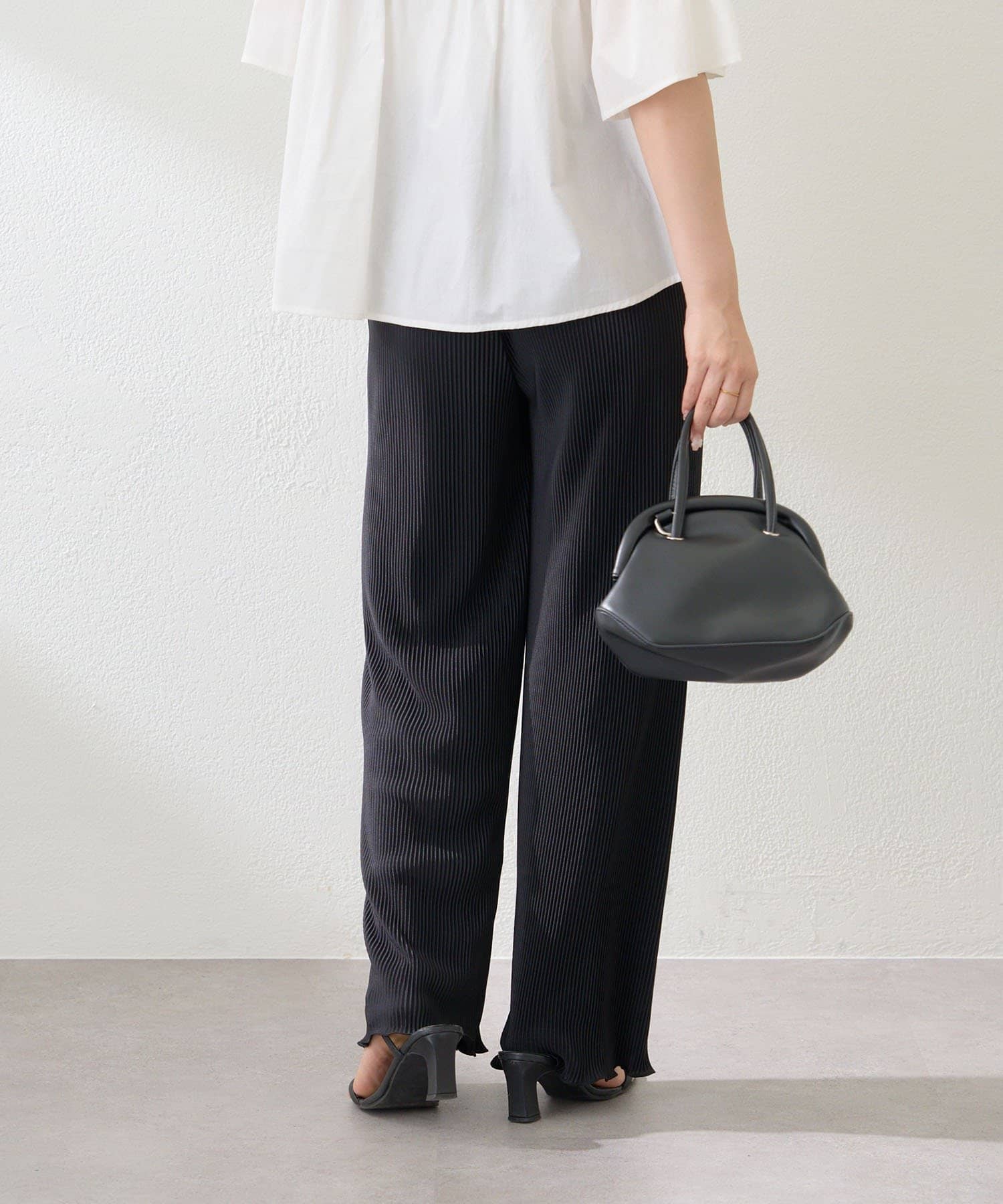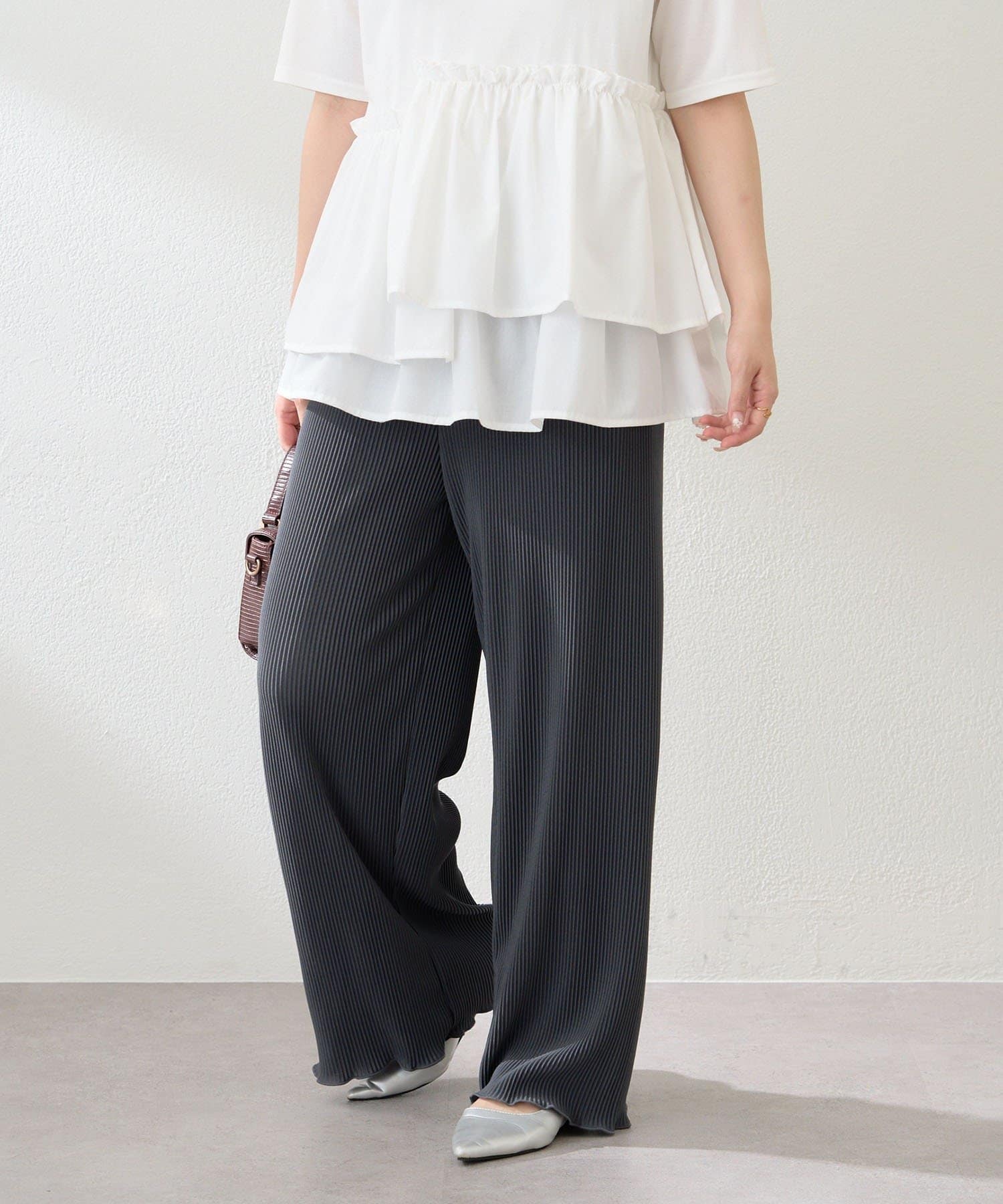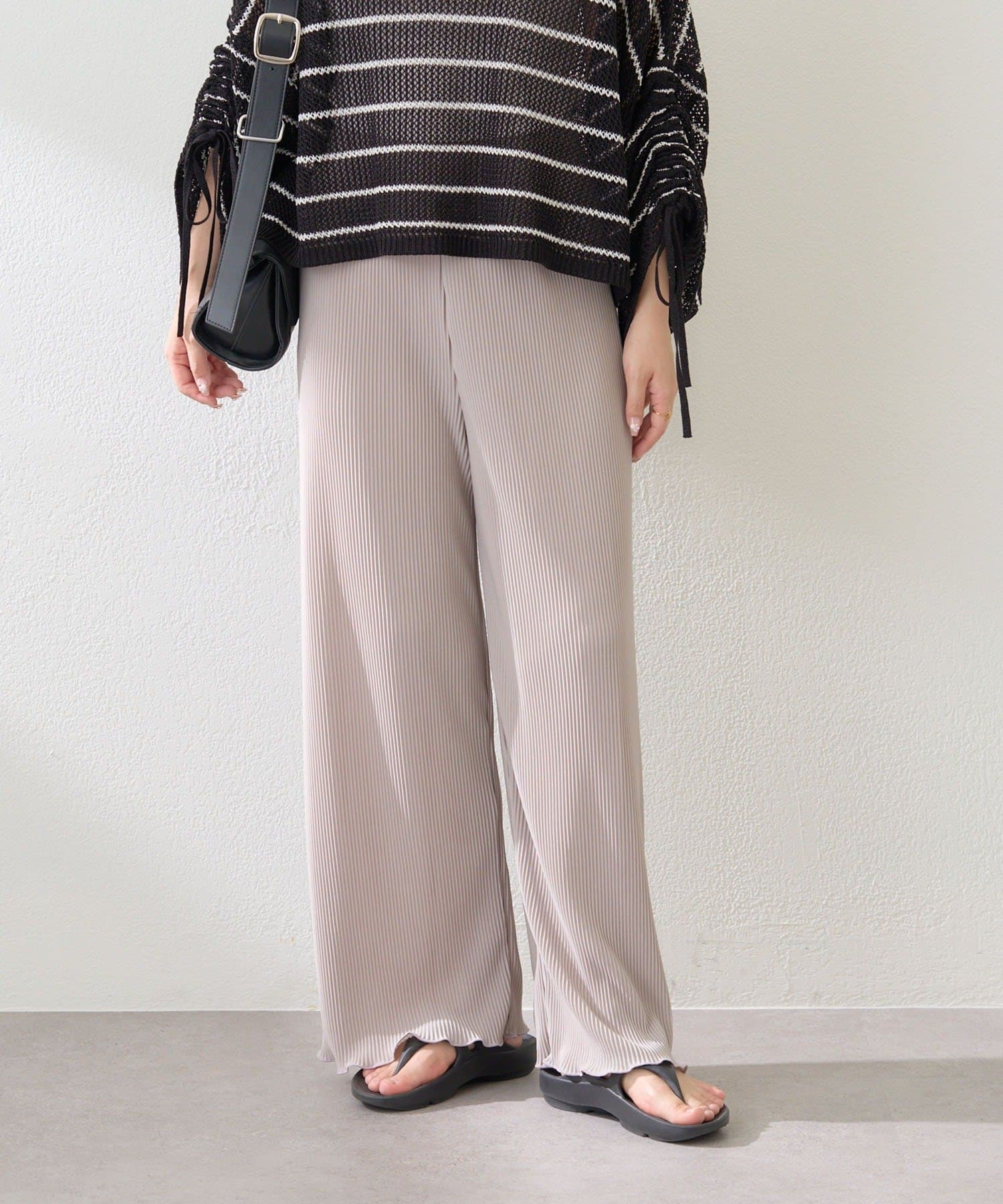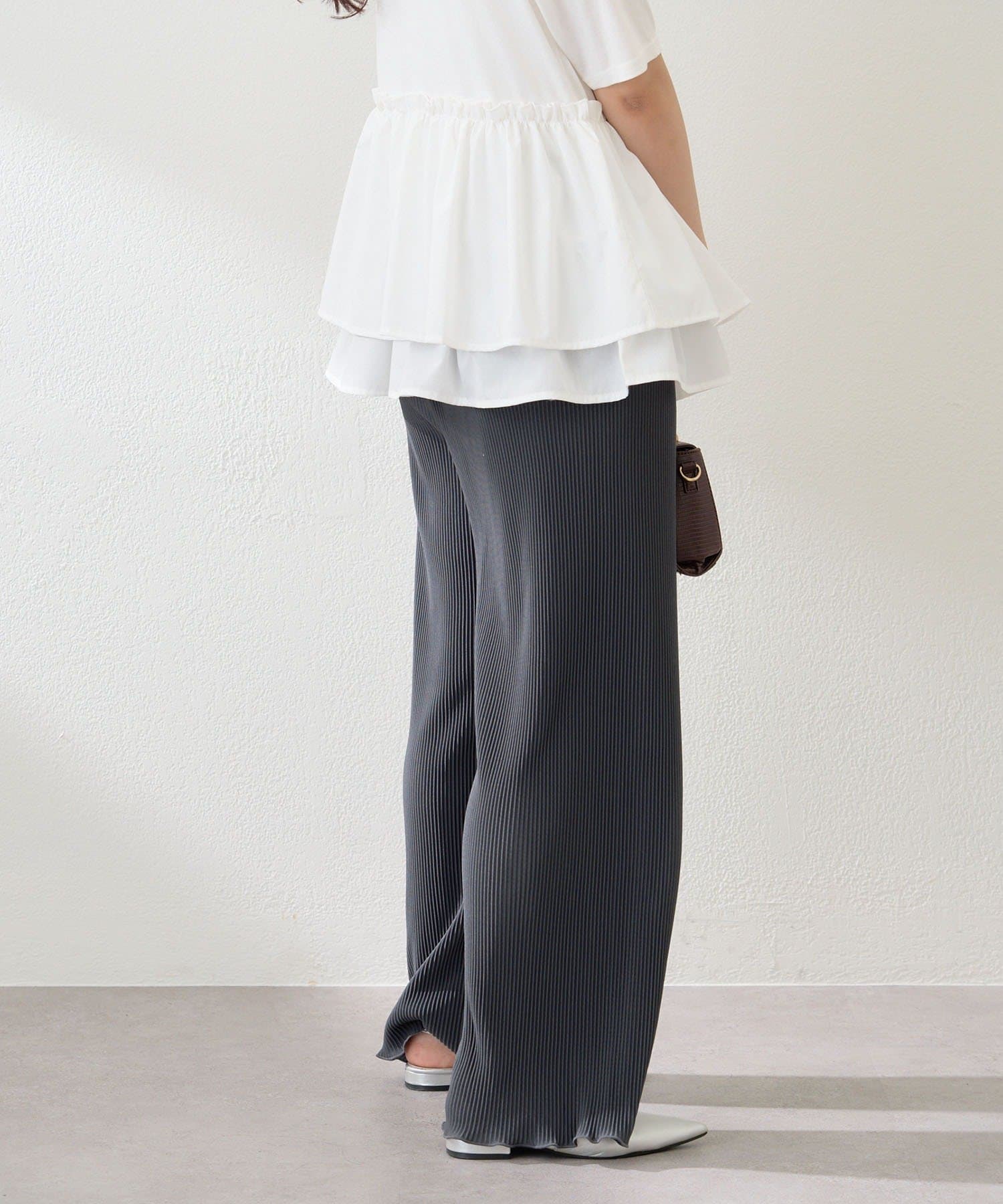 ・伸縮性のある生地感で締め付け感なく履けるプリーツパンツ