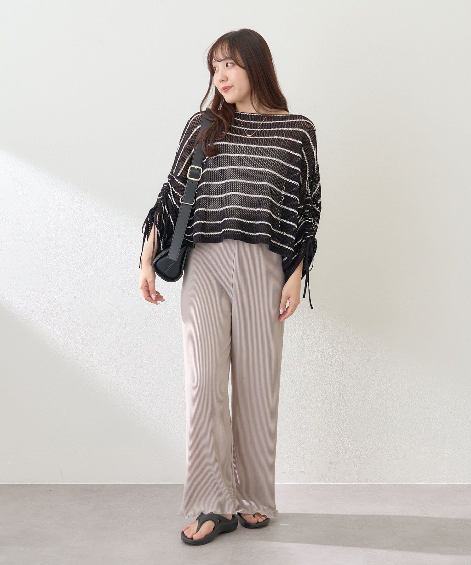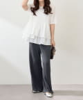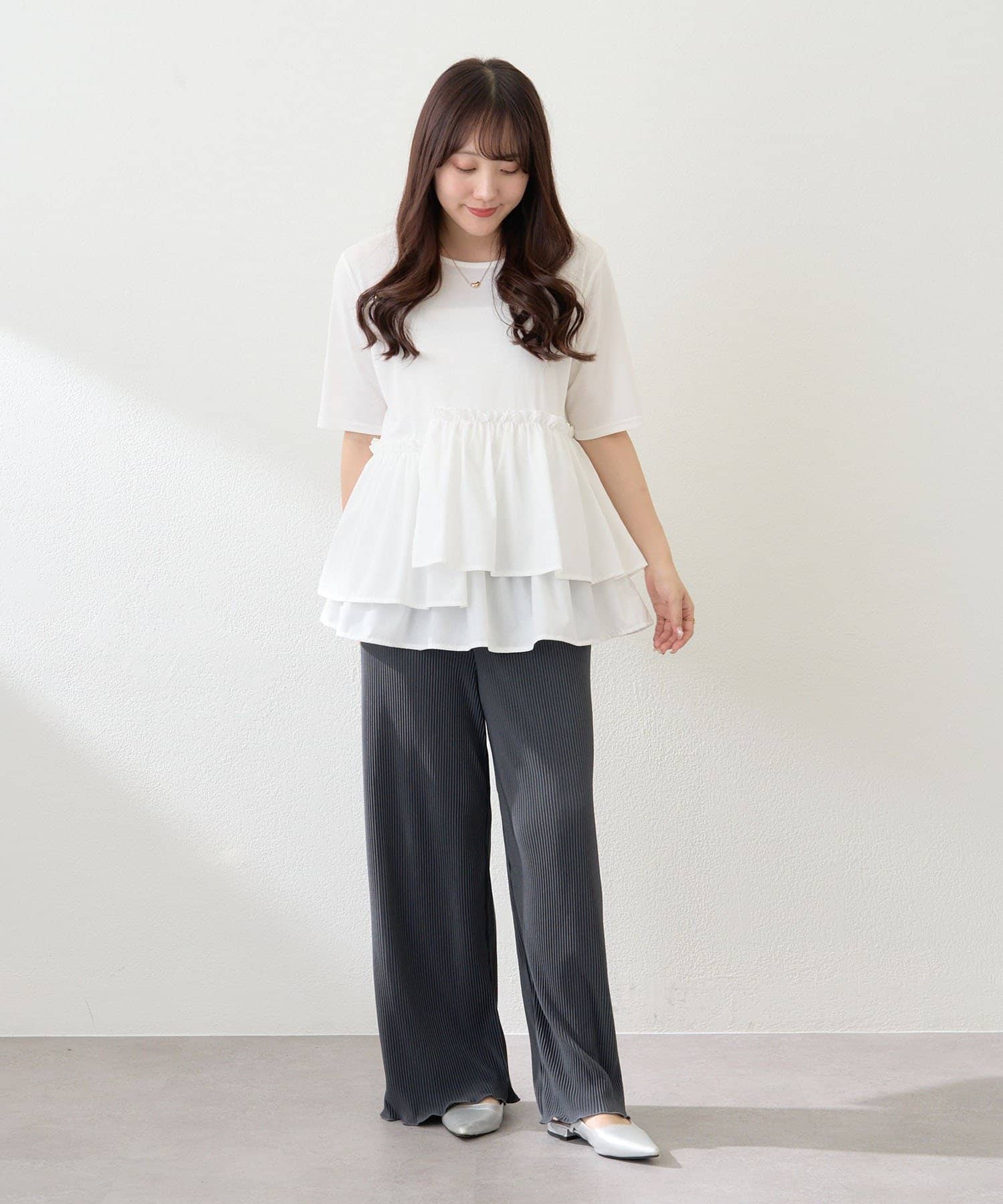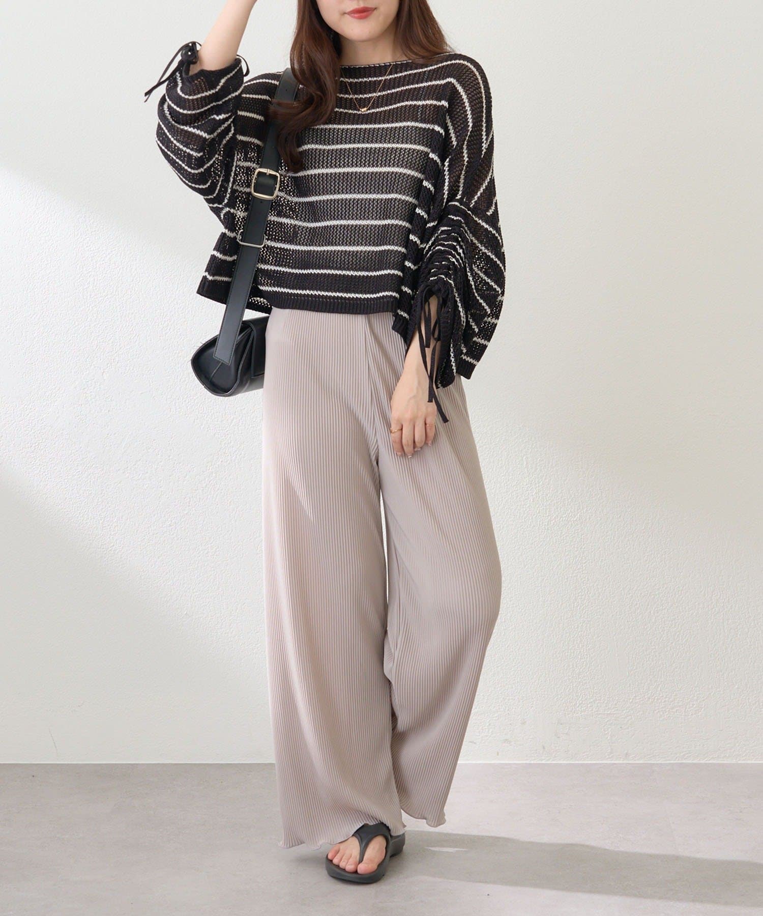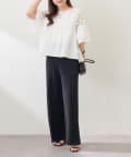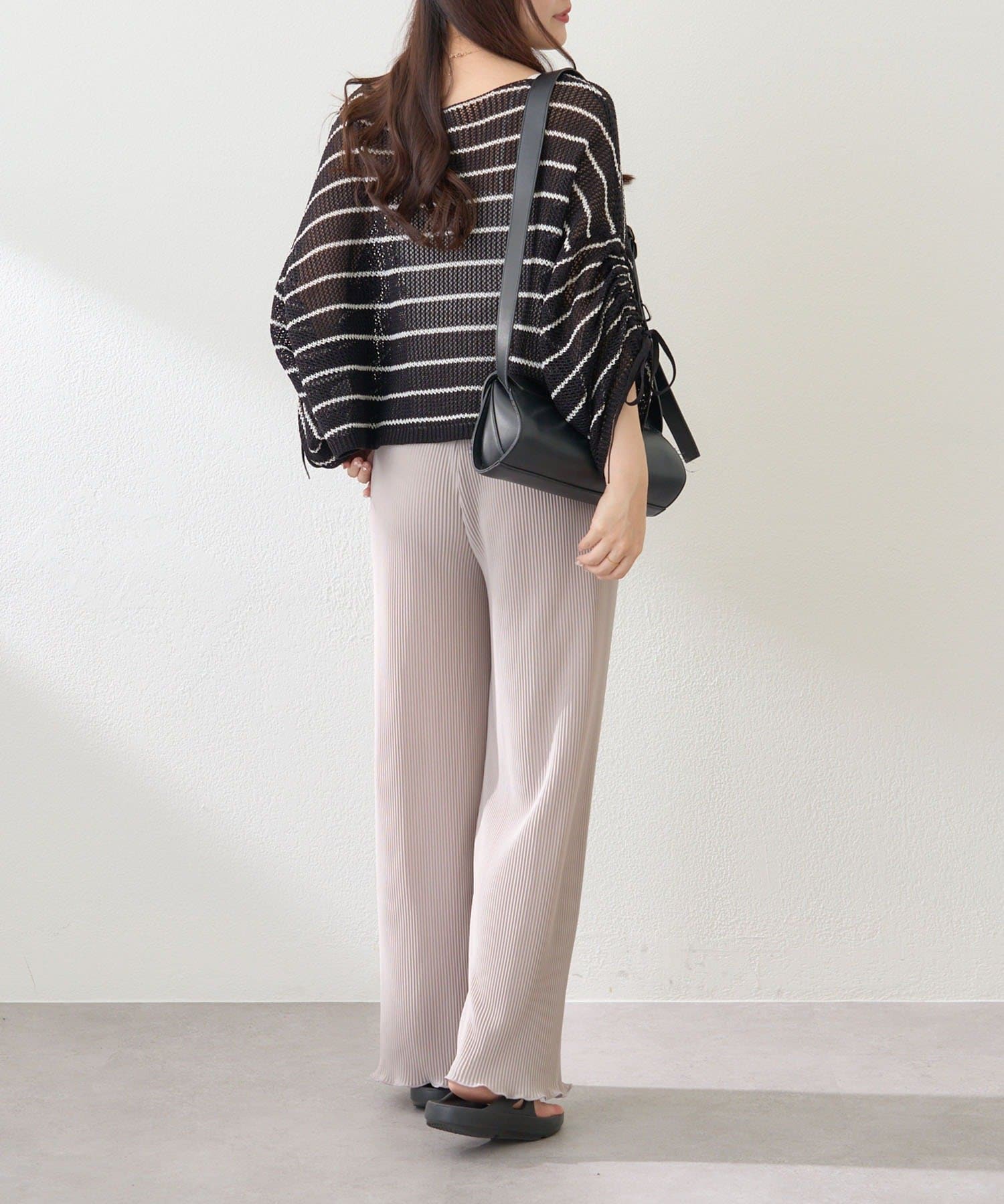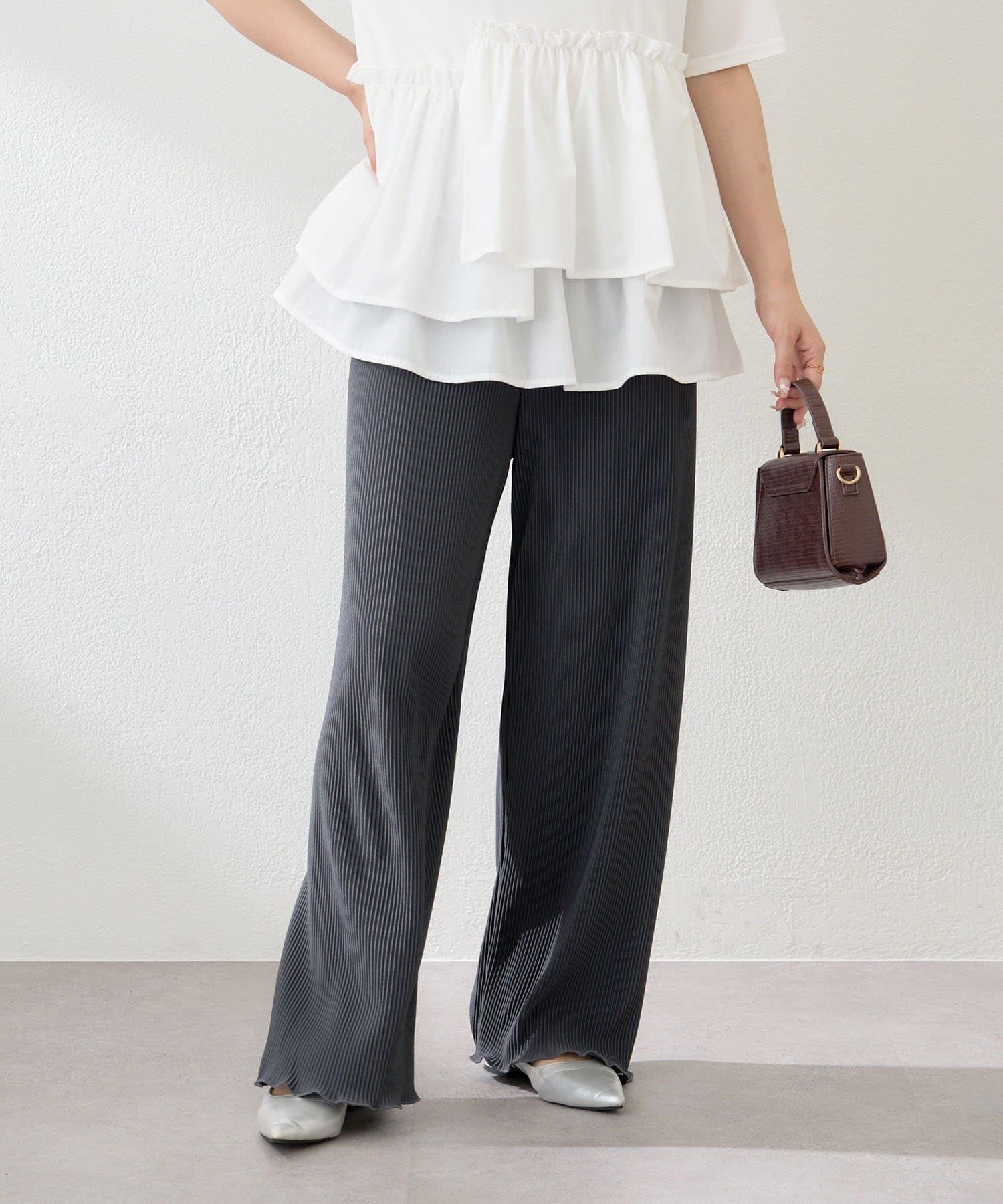 ・伸縮性のある生地感で締め付け感なく履けるプリーツパンツ