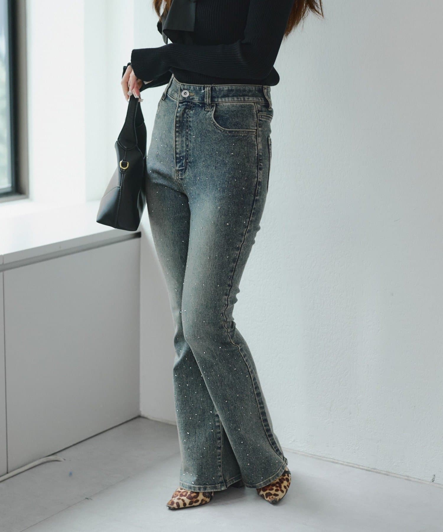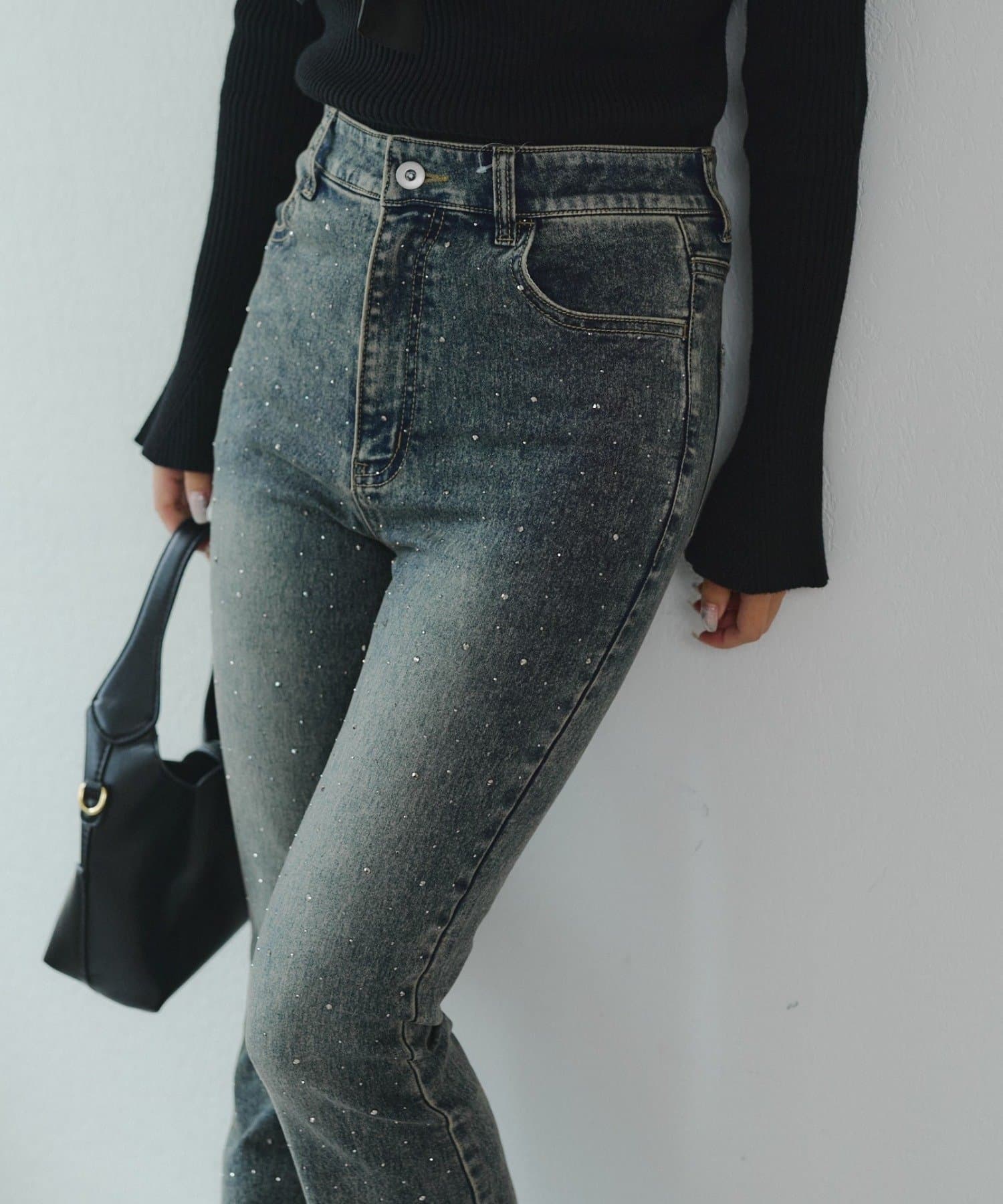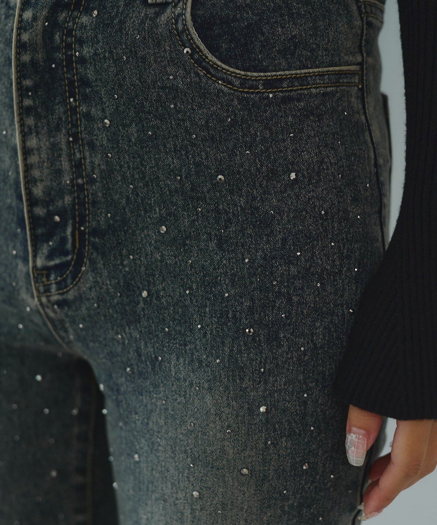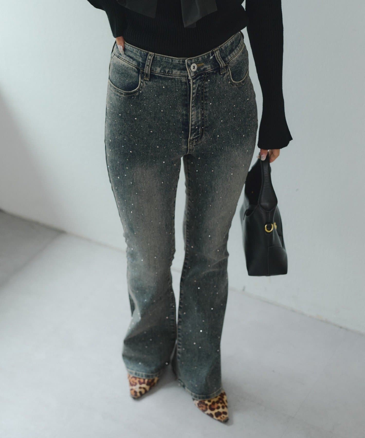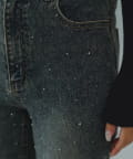 キラキラのビジューが散りばめられたトレンドのセミフレアデニム