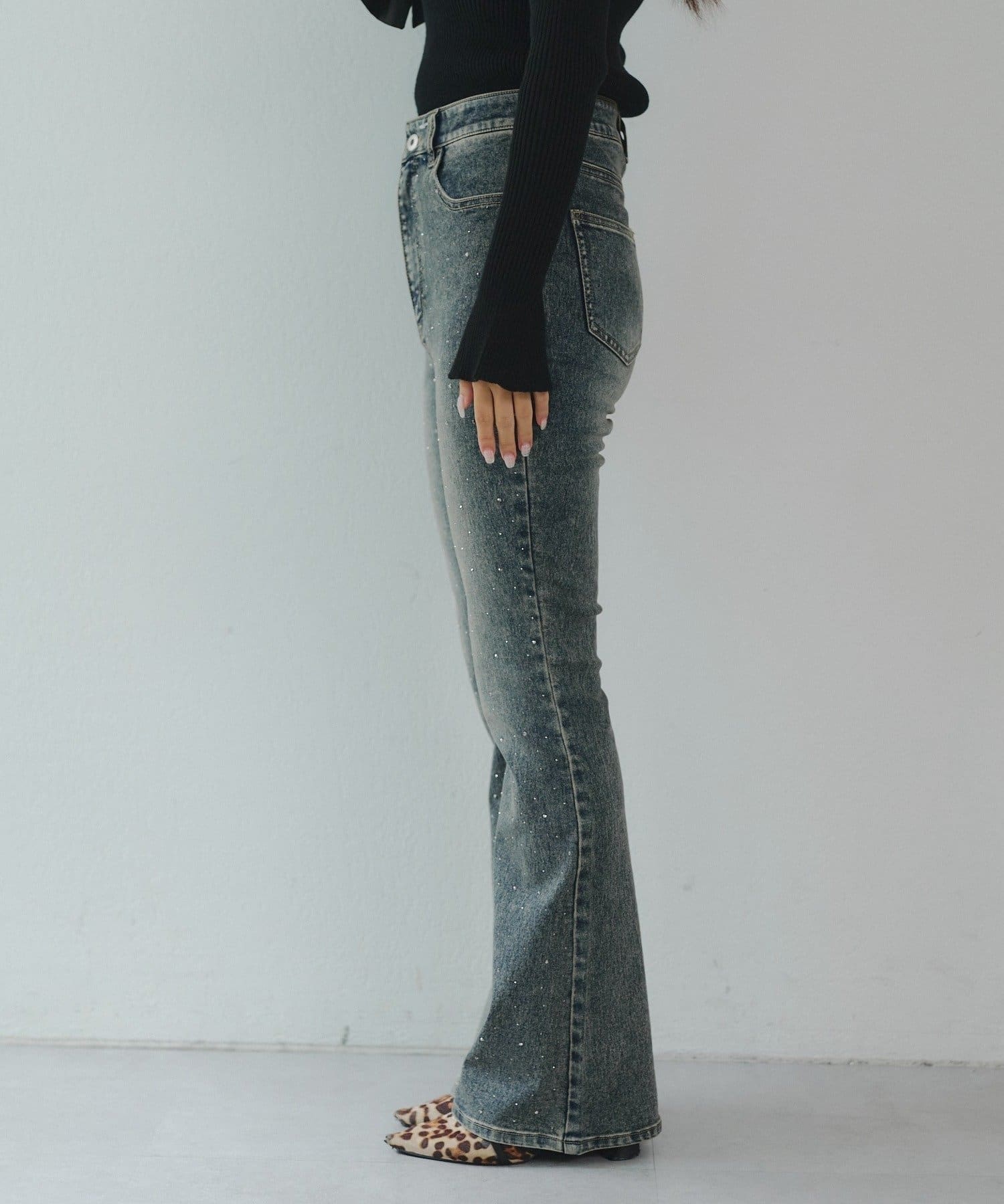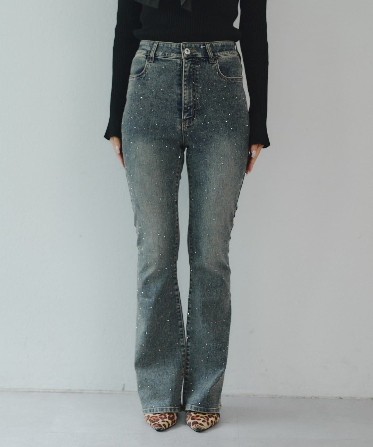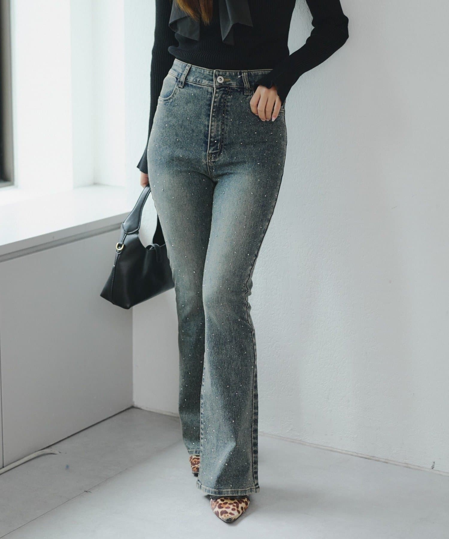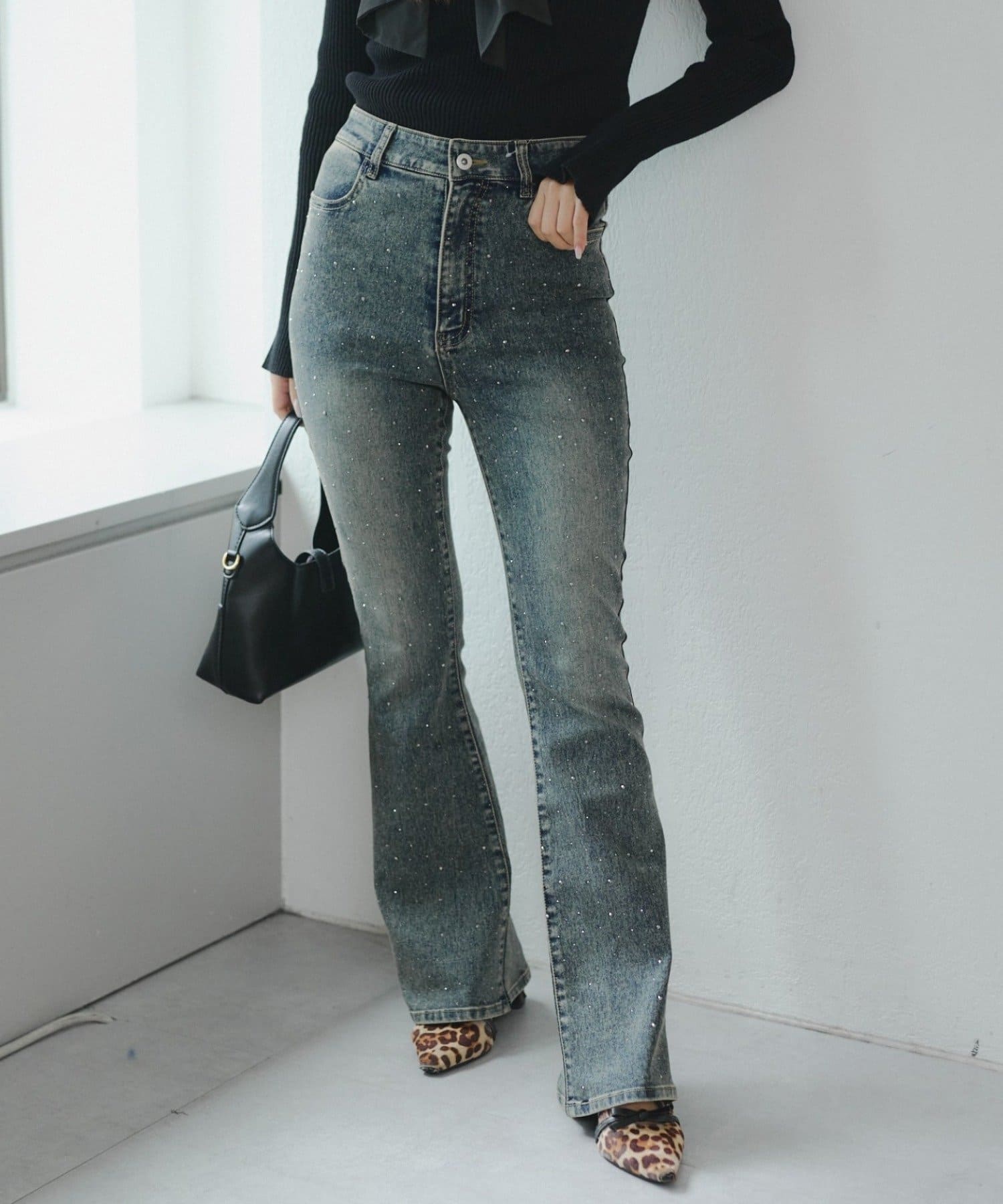 キラキラのビジューが散りばめられたトレンドのセミフレアデニム